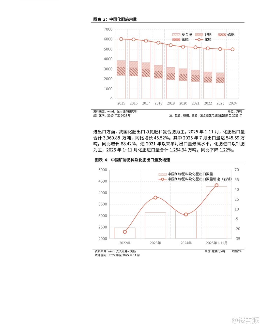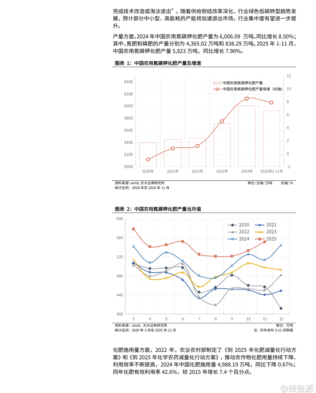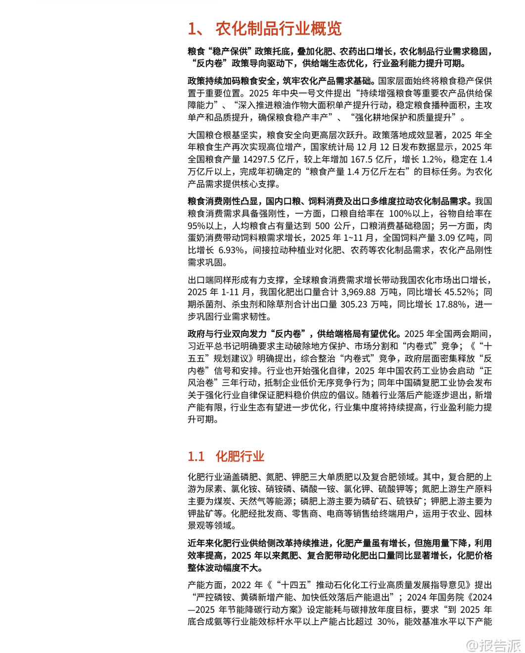 | 在当前全球粮食安全战略持续强化、国内“稳产保供”政策不断加码的背景下,农化制品行业正迎来结构性优化与景气度回升的关键窗口期。 根据光大证券发布的《2025年农化制品可转债梳理》报告,化肥与农药两大核心子行业在需求端稳固增长、供给端生态改善的双重驱动下,展现出盈利能力提升的积极趋势,而相关可转债市场也呈现出交易活跃、估值修复的特征。 从行业基本面来看,农化制品的需求基础坚实。 2025年全国粮食产量达1.42975万亿斤,连续多年稳定在1.4万亿斤以上,为化肥、农药等农化产品提供了刚性需求支撑。 同时,饲料产量同比增长6.93%,带动种植业对农化品的需求进一步释放。 出口方面表现尤为亮眼,2025年1-11月,我国化肥出口量同比增长45.52%,杀菌剂、杀虫剂和除草剂合计出口量同比增长17.88%,成为行业需求的重要增量来源。 供给端则在“反内卷”政策导向下加速优化。 政府层面明确要求整治地方保护和市场分割,行业自律行动也在持续推进。 例如,中国农药工业协会启动“正风治卷”三年行动,抵制低价无序竞争;磷复肥工业协会也发出稳价供应倡议。 这一系列举措有助于落后产能退出,提升行业集中度,从而改善整体盈利环境。 具体到细分领域,化肥行业受多重因素支撑。 一方面,新能源产业快速发展,磷酸铁锂产量同比大幅增长47.18%,显著拉动了对上游磷矿石的需求,使得磷矿资源约束日益凸显,供需趋于紧平衡。 另一方面,国家政策严控磷铵新增产能,导致2025年磷酸一铵和磷酸二铵产量同比分别下降6.92%和6.62%。 在供给收缩与成本支撑的共同作用下,磷酸一铵和磷酸二铵价格均实现上涨,分别较年初上涨20.84%和8.33%。 农药行业同样呈现回暖态势。 2025年以来,尽管原药产量增速有所放缓,但全球市场需求刚性,叠加我国农药出口量保持较快增长,行业整体需求回暖。 其中,草甘膦作为全球使用量最大的除草剂,其行业景气度尤为突出。 供给端,国家将草甘膦生产装置列为限制类项目,严禁新建,有效控制了产能扩张。 需求端,全球转基因作物种植面积持续增长,2024年已达2.10亿公顷,为草甘膦提供了广阔的应用空间。 此外,2025年以来草甘膦库存加速去化,处于历史相对低位,供需格局改善明显,推动其市场价格自年初至年末上涨近10%。 在此背景下,农化制品行业的可转债市场也受到投资者关注。 截至2025年12月26日,行业内存续的可转债未转股比例普遍高于90%,显示出市场对发行人长期发展的信心。 信用评级集中在AA-至AA+区间,主体资质整体良好。 从交易情况来看,和邦转债成交量居首,年初以来超240亿元,兴发转债、苏利转债、丰山转债年成交量均超150亿元,市场交投活跃。 估值方面,多数农化转债均为平衡型,转股溢价率在16%-22%之间,洋丰转债因溢价率超40%而显得相对较高。 值得注意的是,2025年以来,相关正股价格涨幅普遍强于转债,如丰山转债正股涨幅接近80%,兴发转债、苏利转债正股涨幅均超60%,表明市场对龙头企业基本面改善的认可度更高。 从业绩表现看,2025年前三季度,主要可转债发行人的盈利能力普遍修复。 兴发集团和新洋丰净利润规模大且同比增长,苏利股份净利润同比显著增长,丰山集团更是实现了同比扭亏为盈。 现金流状况也明显改善,多家企业经营性净现金流由负转正或持续净流入。 偿债能力方面,资产负债率整体可控,现金短债比普遍在2倍以上,财务结构稳健。 综上所述,2025年的农化制品行业在政策支持、需求稳固和供给优化的共振下,走出了景气周期。 龙头企业凭借资源、技术和一体化优势,在行业整合中受益,业绩与估值双升。 对于投资者而言,农化制品领域的优质可转债,兼具行业景气度上行带来的正股弹性与债券的安全垫,是值得重点关注的投资标的。 然而,报告也提示需警惕产品价格波动、下游需求变化以及发行人基本面超预期变动的风险。 本文由【报告派】研读,输出观点仅作为行业分析! 原文标题:2025-12-31-光大证券-光大证券-化工行业可转债专题研究系列之一:农化制品可转债梳理 发布时间:2025年 报告出品方:光大证券 文档页数:34页