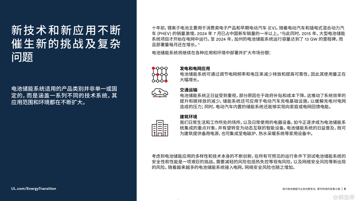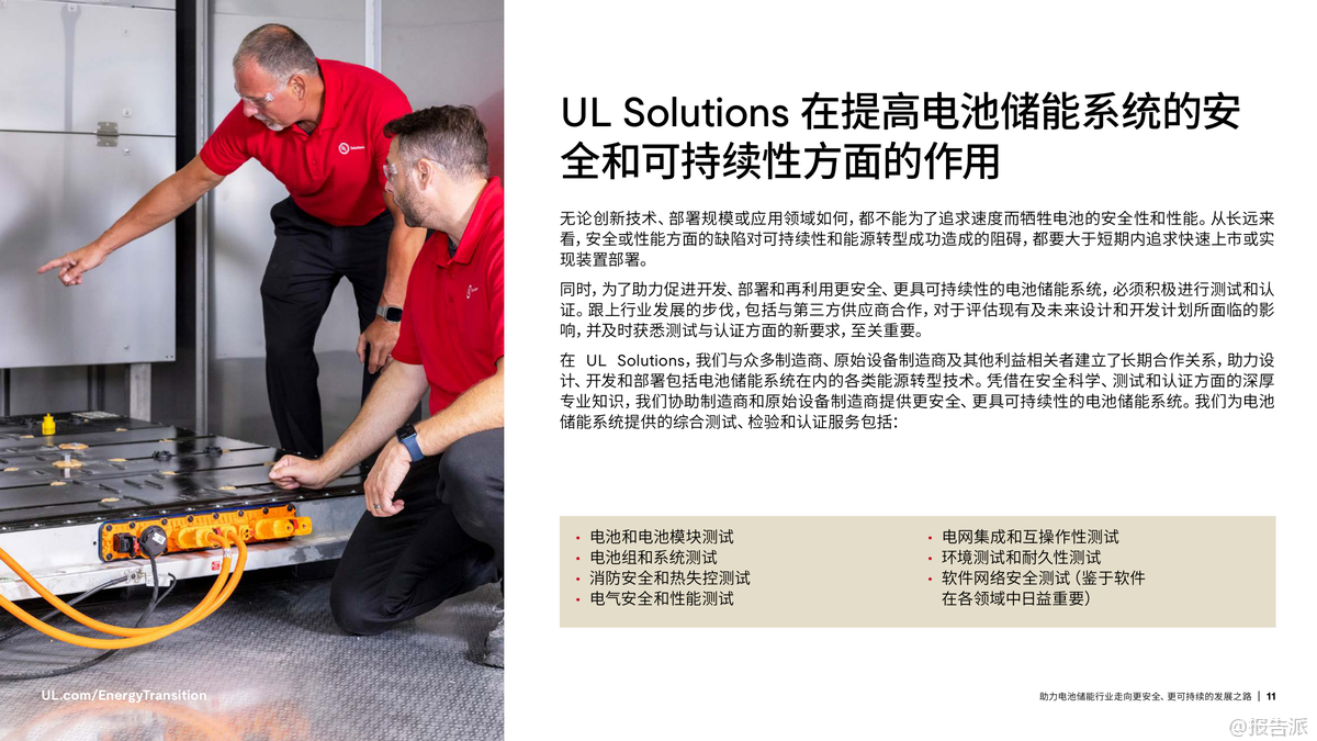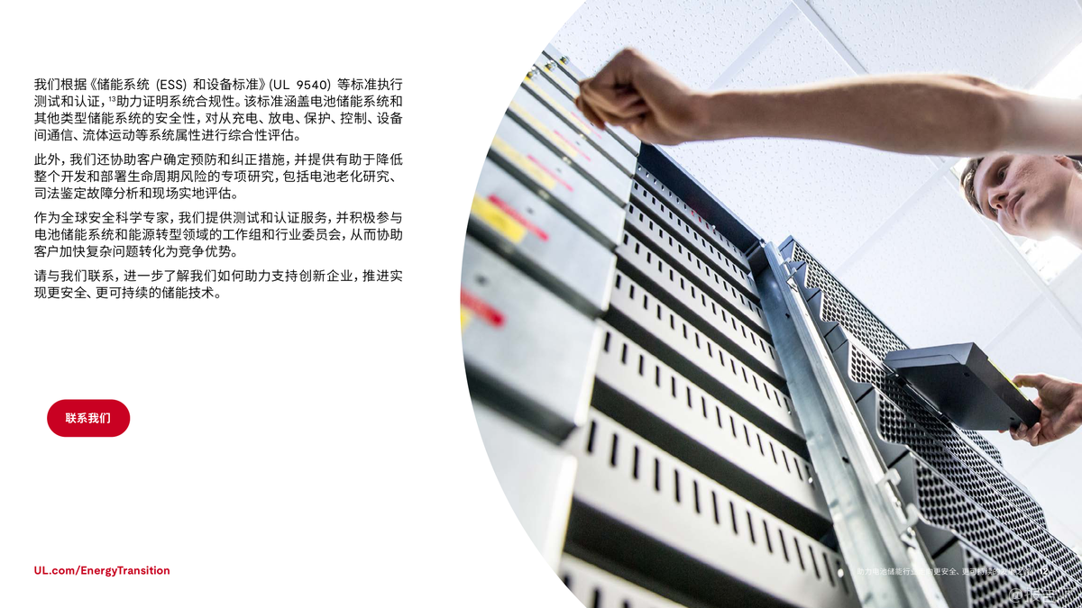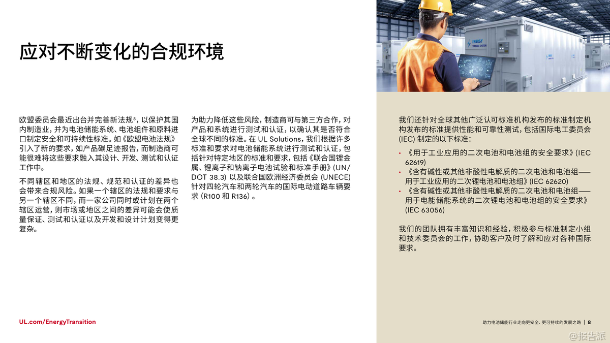 | 在全球加速迈向碳中和的背景下,电池储能系统(BESS)已成为能源转型的核心支柱。 根据国际能源署(IEA)预测,为实现2050年全球净零排放目标,全球电池储能装机容量需从2023年的不足200吉瓦(GW)增长至2030年的1太瓦(TW)以上,并在2050年达到5TW。 这一迅猛发展背后,安全与可持续性正成为行业不可忽视的关键议题。 近年来,电池安全事故频发,凸显了安全管理的紧迫性。 仅在纽约市,自2019年以来因锂离子电池引发的火灾已达733起,造成442人受伤、29人死亡。 尽管工业级储能系统的稳定性优于消费类设备,但热失控仍是主要风险——一旦触发,可能引发连锁反应,导致火灾或爆炸。 因此,确保电池系统的本质安全,不仅是技术问题,更是赢得公众信任和市场认可的前提。 与此同时,电池技术的应用场景正不断拓展。 从最初用于消费电子和电动车,如今已广泛应用于电网调峰、建筑供能、交通基础设施等领域。 中国新能源汽车销量占比已超50%,加州电网储能容量突破13GW,显示出强大的商业化势头。 然而,多样化应用也带来了复杂的测试挑战:不同化学体系(如三元锂、磷酸铁锂、钠离子)、不同使用环境、不同系统规模,都要求更加精细化的安全评估与性能验证。 在此背景下,标准化与合规性建设显得尤为重要。 UL Solutions指出,UL 1973、IEC 62619、IEC 63056等国际标准为电池系统的安全测试提供了框架,涵盖电气安全、热失控防护、消防设计等多个维度。 特别是随着欧盟《电池法规》实施,碳足迹披露、回收责任、供应链尽职调查等新要求对企业提出更高挑战。 跨区域运营的企业必须应对不同市场的法规差异,否则将面临合规风险和上市延迟。 环境可持续性同样是行业绕不开的话题。 钴等原材料的开采涉及严重的伦理与生态问题,尤其是刚果民主共和国的童工争议让多家企业承受巨大舆论压力。 为此,行业正加速转向无钴路线,磷酸铁锂(LFP)电池在轻型车市场的份额已从2019年的3%跃升至2023年的27%。 同时,钠离子电池因其低热失控风险和资源丰富性,正在中美两地进入规模化生产阶段。 更值得关注的是电池的全生命周期管理。 研究表明,退役电动汽车电池仍可保留高达80%的储能容量,具备“梯次利用”的巨大潜力。 2024年5月,美国德州已投运一座53MWh的电网级储能项目,全部采用再利用的电动车旧电池。 此类实践不仅延长资源价值,也推动循环经济落地。 UL Solutions已推出UL 1974标准,对再利用电池的分选、检测、评级流程进行认证,保障二次应用的安全可靠。 综上所述,电池储能行业的未来不仅取决于技术进步和部署速度,更依赖于系统性的安全设计、全球化的合规能力和负责任的环境策略。 正如UL Solutions所强调:不能为了短期增速牺牲长期可持续性。 唯有通过严谨的测试认证、前瞻的标准参与和闭环的资源管理,才能真正构建一个安全、绿色、可信的储能生态体系。 出品方:UL 发布时间:2025年