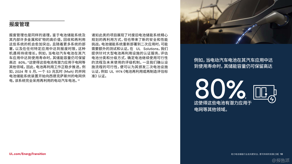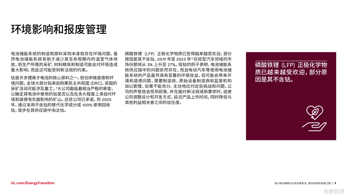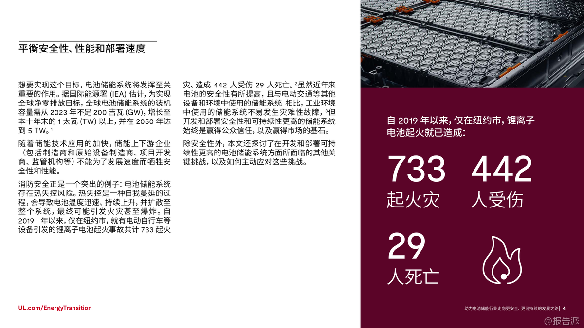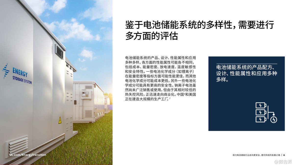 | 在全球加速迈向碳中和的背景下,电池储能系统(BESS)已成为能源转型的核心支柱。 根据国际能源署(IEA)预测,为实现2050年全球净零排放目标,全球电池储能装机容量需从2023年的不足200吉瓦(GW)增长至2030年的1太瓦(TW)以上,并在2050年达到5TW。 这一迅猛发展背后,安全与可持续性正成为行业不可忽视的关键议题。 近年来,电池安全事故频发,凸显了安全管理的紧迫性。 仅在纽约市,自2019年以来因锂离子电池引发的火灾已达733起,造成442人受伤、29人死亡。 尽管工业级储能系统的稳定性优于消费类设备,但热失控仍是主要风险——一旦触发,可能引发连锁反应,导致火灾或爆炸。 因此,确保电池系统的本质安全,不仅是技术问题,更是赢得公众信任和市场认可的前提。 与此同时,电池技术的应用场景正不断拓展。 从最初用于消费电子和电动车,如今已广泛应用于电网调峰、建筑供能、交通基础设施等领域。 中国新能源汽车销量占比已超50%,加州电网储能容量突破13GW,显示出强大的商业化势头。 然而,多样化应用也带来了复杂的测试挑战:不同化学体系(如三元锂、磷酸铁锂、钠离子)、不同使用环境、不同系统规模,都要求更加精细化的安全评估与性能验证。 在此背景下,标准化与合规性建设显得尤为重要。 UL Solutions指出,UL 1973、IEC 62619、IEC 63056等国际标准为电池系统的安全测试提供了框架,涵盖电气安全、热失控防护、消防设计等多个维度。 特别是随着欧盟《电池法规》实施,碳足迹披露、回收责任、供应链尽职调查等新要求对企业提出更高挑战。 跨区域运营的企业必须应对不同市场的法规差异,否则将面临合规风险和上市延迟。 环境可持续性同样是行业绕不开的话题。 钴等原材料的开采涉及严重的伦理与生态问题,尤其是刚果民主共和国的童工争议让多家企业承受巨大舆论压力。 为此,行业正加速转向无钴路线,磷酸铁锂(LFP)电池在轻型车市场的份额已从2019年的3%跃升至2023年的27%。 同时,钠离子电池因其低热失控风险和资源丰富性,正在中美两地进入规模化生产阶段。 更值得关注的是电池的全生命周期管理。 研究表明,退役电动汽车电池仍可保留高达80%的储能容量,具备“梯次利用”的巨大潜力。 2024年5月,美国德州已投运一座53MWh的电网级储能项目,全部采用再利用的电动车旧电池。 此类实践不仅延长资源价值,也推动循环经济落地。 UL Solutions已推出UL 1974标准,对再利用电池的分选、检测、评级流程进行认证,保障二次应用的安全可靠。 综上所述,电池储能行业的未来不仅取决于技术进步和部署速度,更依赖于系统性的安全设计、全球化的合规能力和负责任的环境策略。 正如UL Solutions所强调:不能为了短期增速牺牲长期可持续性。 唯有通过严谨的测试认证、前瞻的标准参与和闭环的资源管理,才能真正构建一个安全、绿色、可信的储能生态体系。 出品方:UL 发布时间:2025年