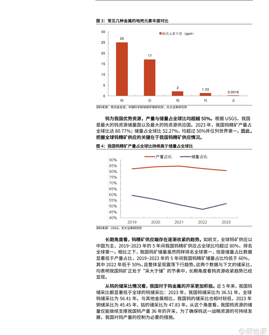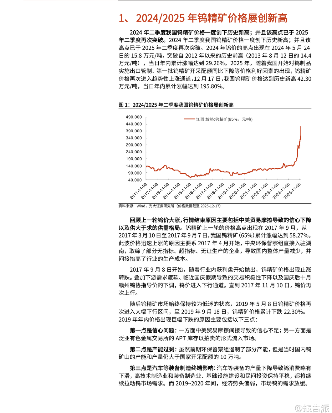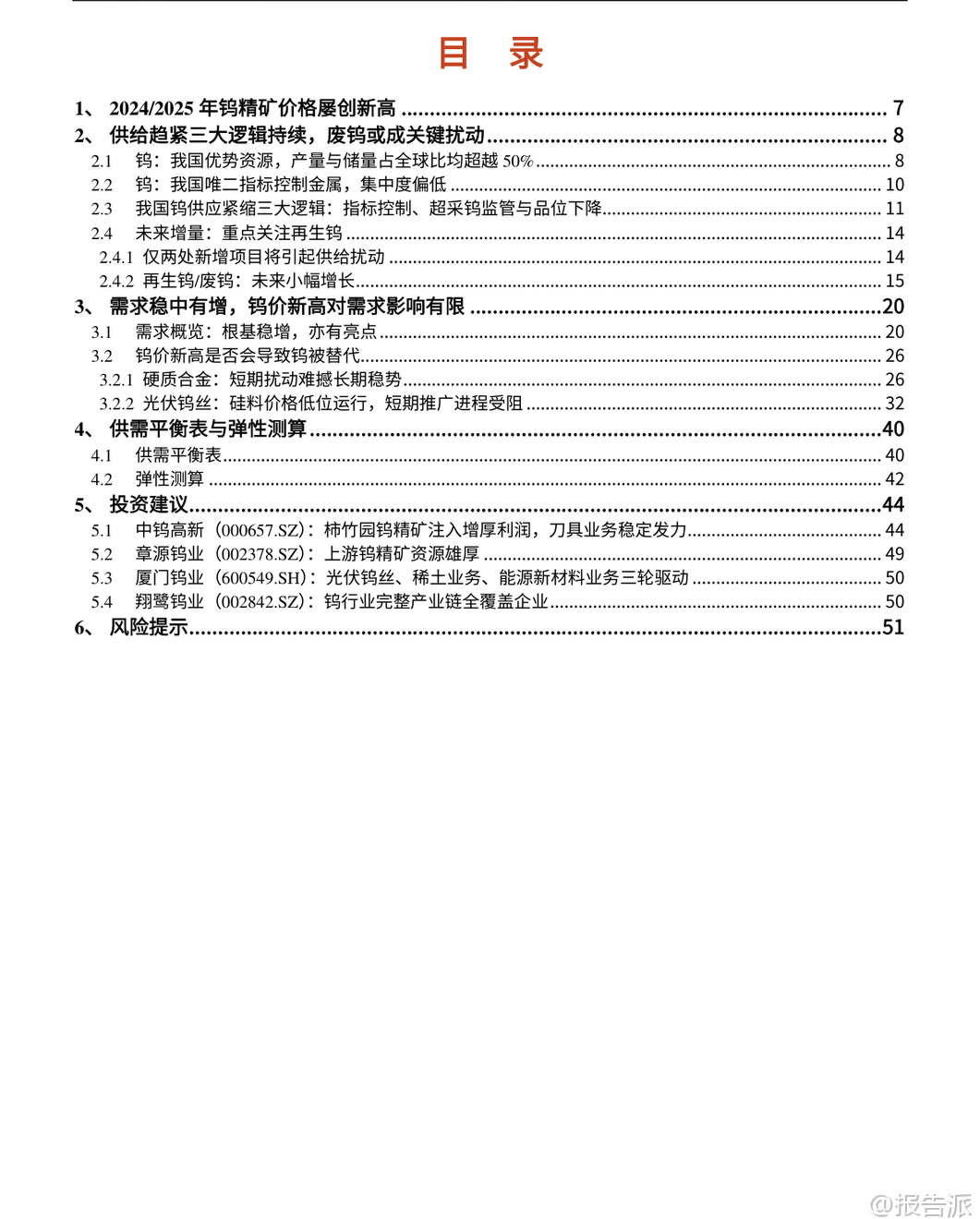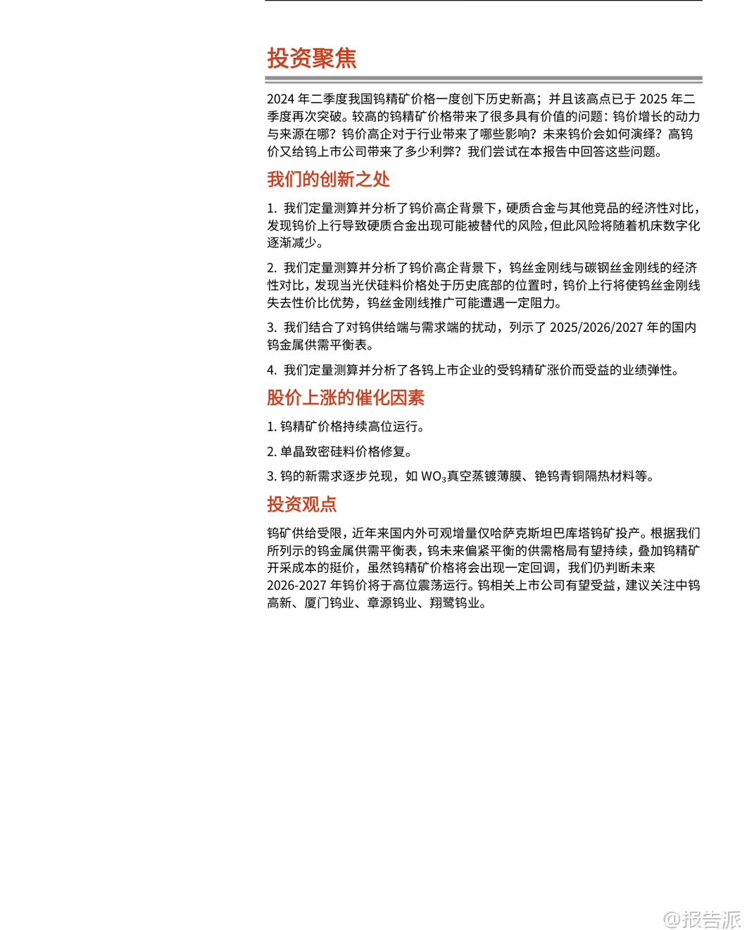 | 【36氪研报】钨,这个低调却关键的战略金属,正在迎来前所未有的高光时刻。 光大证券最新发布的《钨行业深度报告》揭示了一个核心逻辑:在供给持续收紧、需求稳中有增的双重驱动下,钨价有望长期高位运行,上游资源型企业将迎来显著红利期。 这份发布于2025年底的报告,为我们描绘了一幅清晰的产业图景。 首先,钨是我国绝对的优势资源,其地位堪比稀土。 2023年,我国钨精矿产量占全球比重高达80.77%,储量占比也达到52.27%,均位列世界第一。 然而,与高度集中的稀土行业不同,钨行业的集中度(CR4为43.94%)依然偏低,这意味着大量小矿企的存在,历史上曾导致严重的违规开采和超采问题。 但如今,情况正在发生根本性逆转。 报告指出,未来我国钨精矿供应将持续收紧,其背后有三大核心逻辑:第一是国家严格的指标控制制度。 2025年第一批钨矿开采总量控制指标同比下降6.45%,这是连续第二年缩紧,释放出强烈的政策信号——国家正在主动“控量保价”,以确保这一战略资源的可持续发展。 第二是超采现象被强力遏制。 过去十年,我国超采钨占总产量的比重从2015年的35.78%骤降至2024年的12.63%,这不仅规范了市场秩序,也直接减少了无效供给。 第三是资源品位的自然下降。 历经百余年开采,全国处理钨原矿的平均品位已从2004年的0.42%下滑至2016年的0.28%,这意味着要获得同等数量的钨精矿,需要消耗更多的原矿,成本自然水涨船高。 在供给端不断收缩的同时,需求端则展现出强大的韧性与增长潜力。 2024年国内钨需求结构中,硬质合金占比高达58.51%,是绝对的基石。 硬质合金广泛应用于刀具、矿山工具等领域,其需求与制造业景气度紧密相连。 随着我国机床更新周期的到来以及智能制造的推进,硬质合金的需求根基稳固。 此外,军工和光伏两大领域成为亮眼的增长点。 在全球地缘冲突频发、大国军费开支持续攀升的背景下,作为穿甲弹芯等关键材料的钨,其军工需求具有不可替代性和不可回收性,将迎来持续增长。 而光伏领域的“钨丝金刚线”则是另一大增量来源,凭借其更细的线径,能有效降低硅片切割损耗,提升出片率。 尽管当前渗透率尚在提升阶段,但其增速极快,是未来几年钨需求的重要驱动力。 那么,钨价暴涨是否会导致下游企业寻求替代品?报告对此进行了深入分析。 对于硬质合金,虽然价格上行会带来短期成本压力,但其优异的综合性能决定了其难以被高速钢或陶瓷等材料完全取代。 随着企业对刀具管理的数字化和精细化,硬质合金的成本劣势将被有效对冲。 对于光伏钨丝,其经济性则与硅料价格高度相关。 当硅料价格处于低位时,昂贵的钨丝金刚线性价比优势不明显;但一旦硅料价格回升至合理水平,钨丝带来的降本效益将远超其自身成本的上涨,从而推动其加速渗透。 基于供需两端的深刻变化,报告预测未来几年钨市场将维持偏紧平衡。 测算显示,2025年至2027年,我国及全球钨金属均存在供需缺口。 叠加环保等压力带来的采矿成本刚性上升,钨价具备在高位震荡运行的坚实基础。 因此,投资机会聚焦于上游拥有优质钨矿资源的企业。 报告建议关注中钨高新、章源钨业、厦门钨业和翔鹭钨业。 其中,中钨高新因成功注入全球最大的单体钨矿——柿竹园钨矿,资源自给率大幅提升,业绩弹性显著;章源钨业和厦门钨业则凭借雄厚的上游资源储备和完整的产业链布局,同样极具竞争力。 总而言之,这是一轮由供给端改革驱动的周期性机遇,掌握资源者,将赢得未来。 本文由【报告派】研读,输出观点仅作为行业分析! 原文标题:原文标题:2025-12-30-光大证券-光大证券-钨行业深度报告:钨,罕见供给收缩金属,上游矿企持续受益 发布时间:2025年 报告出品方:光大证券 文档页数:52页