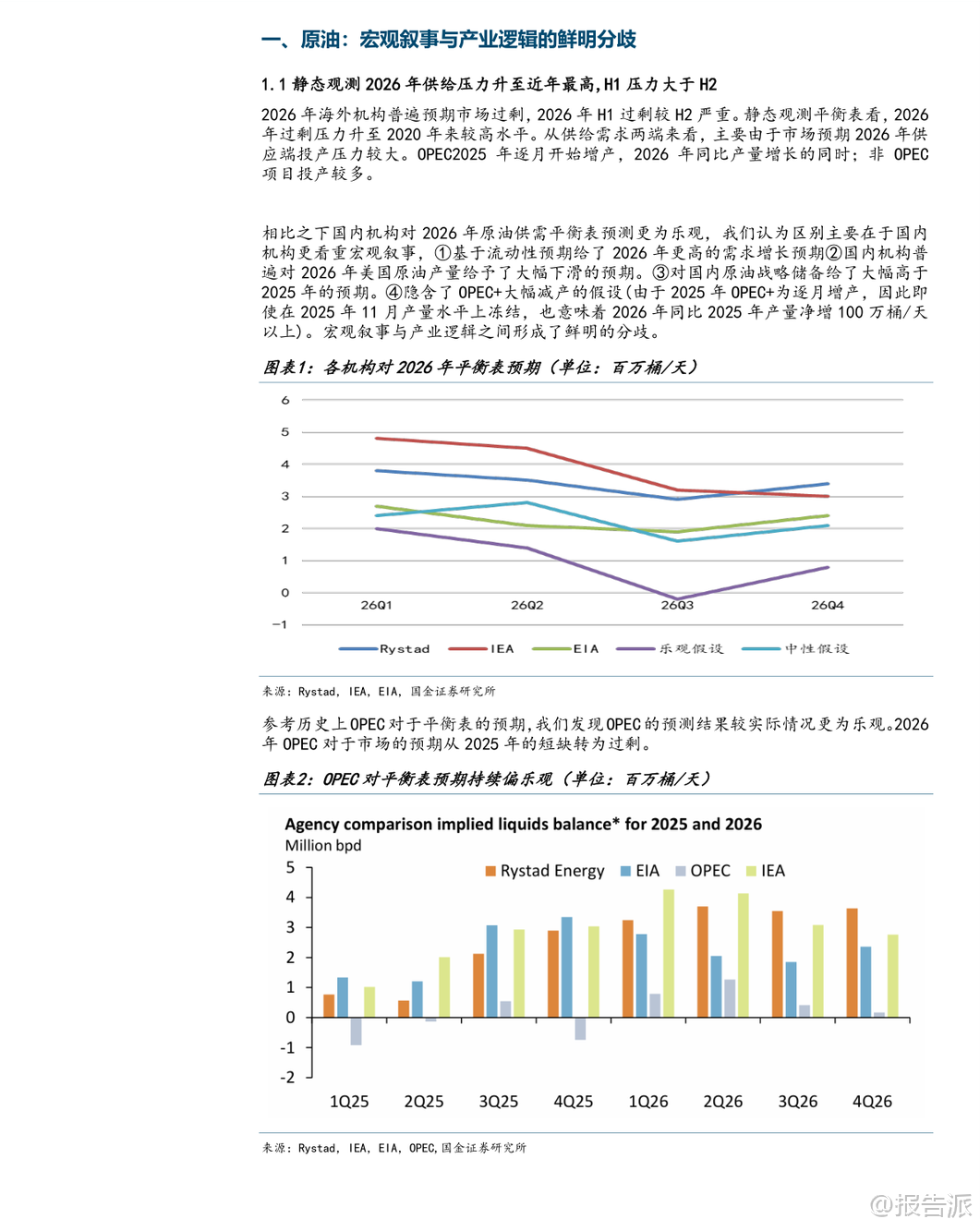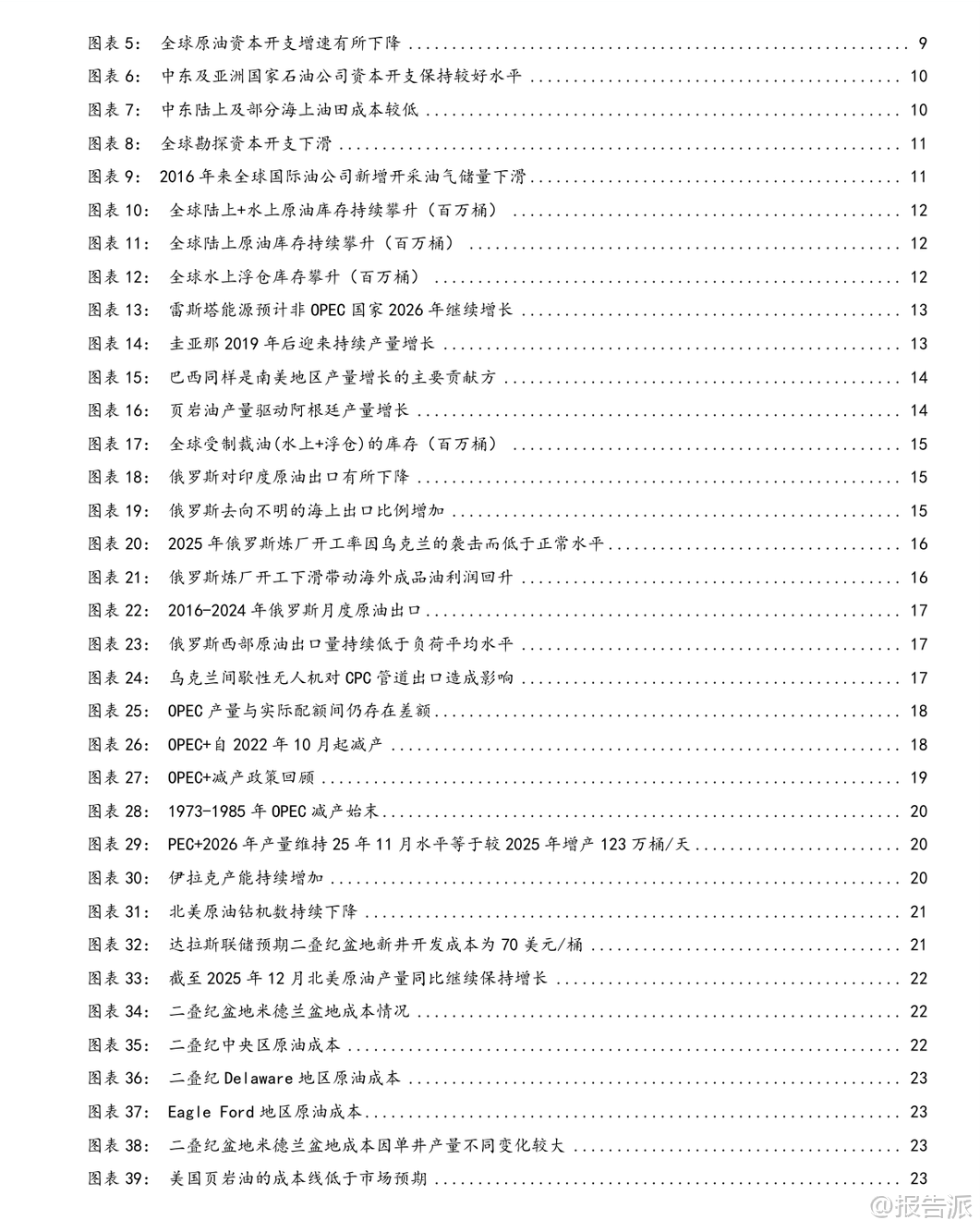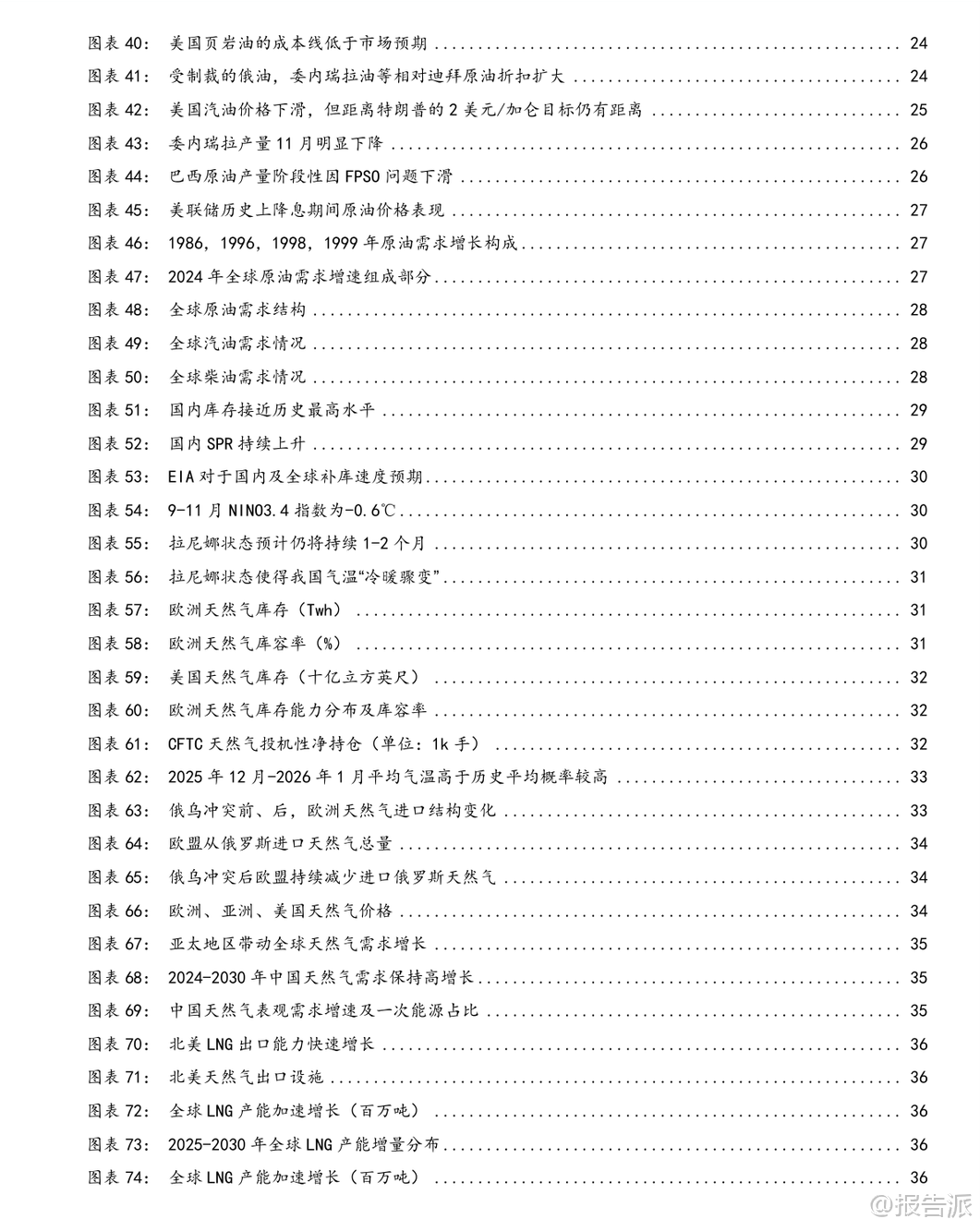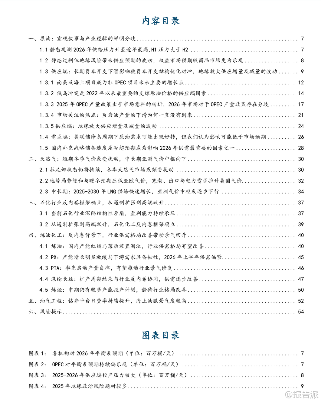 | 2025年底,国金证券发布《石化行业2026年度策略:宏观叙事与产业分歧》报告,全面剖析了全球能源市场在宏观与产业逻辑分化背景下的发展趋势。 报告指出,2026年石化行业已进入“遏制盲目扩张、聚焦高端跃升”的反内卷新阶段,在政策引导与行业自律的双重推动下,供给端加速出清,低效产能持续退出,竞争格局优化叠加结构性需求增长,炼化板块整体景气度有望稳步回升。 在原油方面,报告强调宏观叙事与产业逻辑存在鲜明分歧。 尽管美联储降息周期可能提振大宗商品需求预期,但原油作为商品属性强、金融属性弱的大宗商品,价格核心仍由供需主导。 2026年全球原油市场预计将面临供应过剩压力,中性假设下全年日均过剩超200万桶,布伦特原油价格中枢或低于60美元/桶,上半年可能出现价格低点。 影响平衡表的关键变量在于地缘政治风险与中国战略储备补库节奏。 俄乌冲突、中东局势及美国对委内瑞拉的制裁等因素将持续扰动供应预期,而中国若维持大规模补库,将成为支撑油价的重要力量。 值得注意的是,尽管美国页岩油钻机数下降,但由于成本结构优化和高产井位储备充足,产量下滑尚未兑现,短期对供应影响有限。 天然气市场呈现区域分化趋势。 短期受拉尼娜影响,气温“冷暖骤变”或扰动冬季气价,偏低库存下寒潮将加剧波动。 中长期看,美国LNG出口能力快速扩张,推动北美气价中枢上行;而亚洲与欧洲则因全球LNG新增供给集中释放,气价中枢趋于下行。 预计2025-2030年全球LNG产能年均复合增速达7%,亚洲JKM与欧洲TTF气价将逐步向更具竞争力的北美Henry Hub靠拢。 炼油化工领域,“反内卷”框架已确立并进入深化阶段。 国家通过《节能降碳行动方案》《老旧装置淘汰退出方案》等政策严控新增产能,明确全国炼油一次加工能力控制在10亿吨红线以内,并全面淘汰200万吨/年以下常减压装置。 叠加欧洲等地炼厂加速关停,全球炼油产能扩张趋缓,供需结构改善,炼油毛利有望修复。 其中,PX与PTA成为确定性最强的景气主线。 PX行业扩产基本停滞,而下游聚酯需求保持韧性,2026年供需趋紧态势明显,景气度有望领先修复。 PTA行业集中度高(CR6达75%),已率先启动产量自律,随着行业协同减产深化,此前低迷的加工费有望回升,带动盈利弹性释放。 涤纶长丝扩产周期结束,2026-2027年新增产能有限,行业开工率稳定,库存去化,产品毛利具备回暖基础。 烯烃行业中期仍面临较多产能投产压力,盈利承压,但远期随着老旧装置淘汰和产能控制,行业有望逐步走出低谷。 油气工程板块景气度维持高位。 全球海上资本开支持续增长,钻井平台日费率不断攀升,尤其是钻井船和自升式平台日费率已达近六年高点,海上油服高景气周期得以延续。 报告同时提示三大风险:一是国内外政策环境变化,如关税、产能控制等政策调整可能影响产业链布局;二是地缘政治扰动超预期,可能导致油价脉冲式上涨;三是海外经济若出现衰退,将导致需求恶化,引发大宗商品价格超预期下跌。 总体而言,2026年石化行业将在“反内卷”主线下实现结构性复苏,上游油企凭借高分红与业绩韧性具备长期配置价值,炼化板块则需把握PX、PTA等细分领域的景气修复机遇。 本文由【报告派】研读,输出观点仅作为行业分析! 原文标题:2025-12-30-国金证券-国金证券-石化行业2026年度策略:宏观叙事与产业分歧 发布时间:2025年 报告出品方:国金证券 文档页数:54页