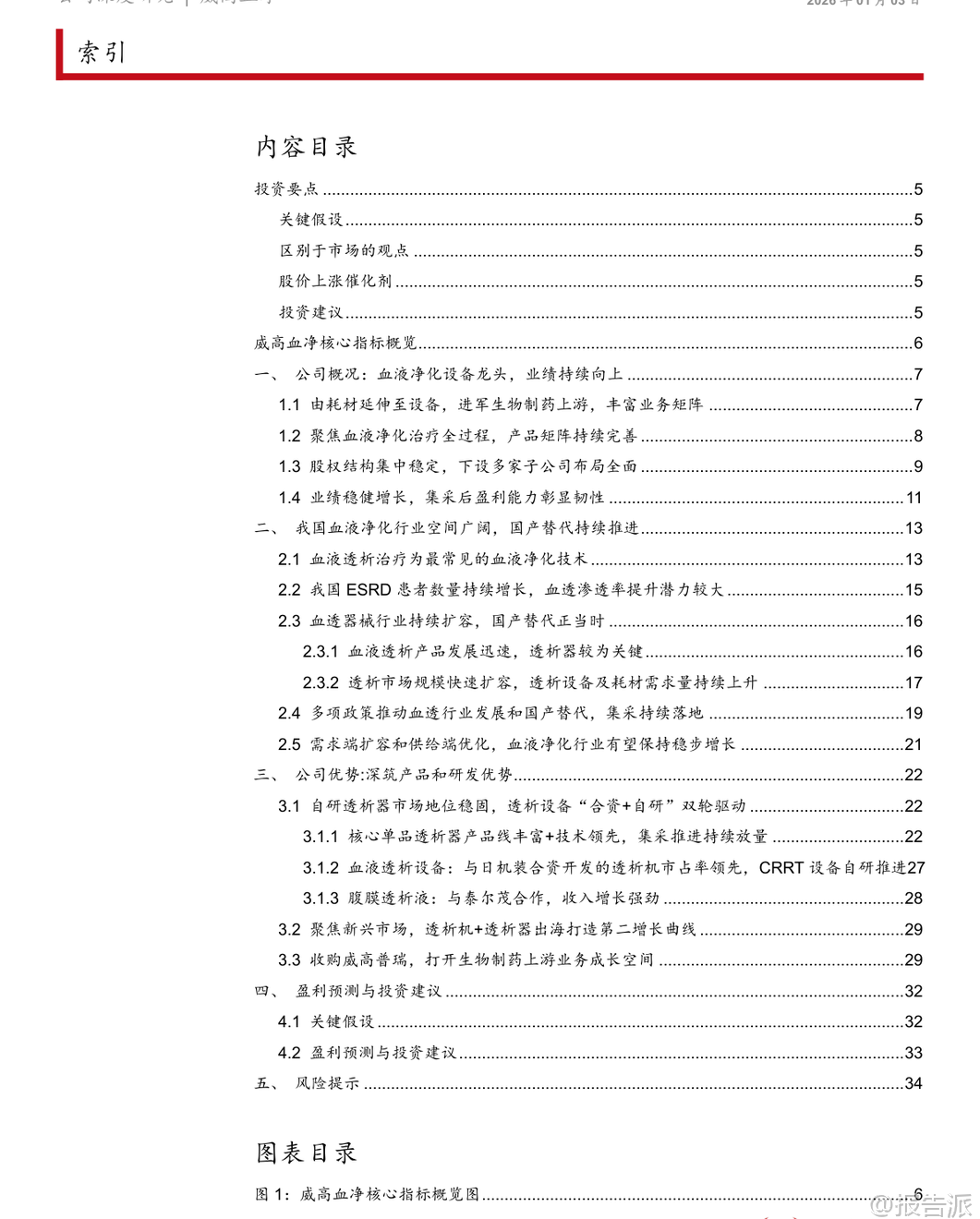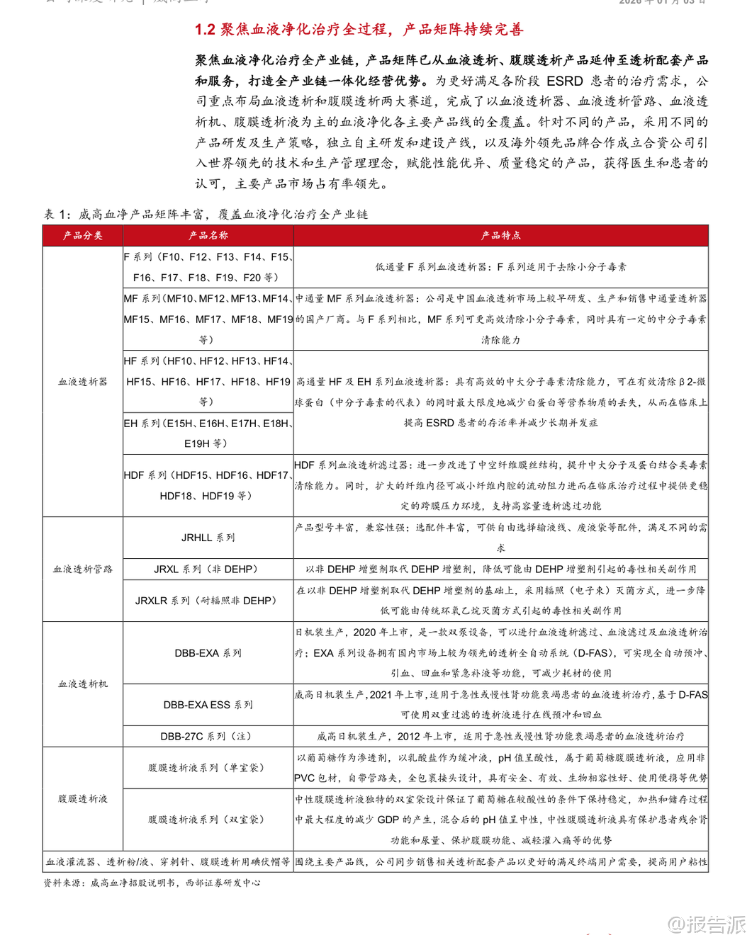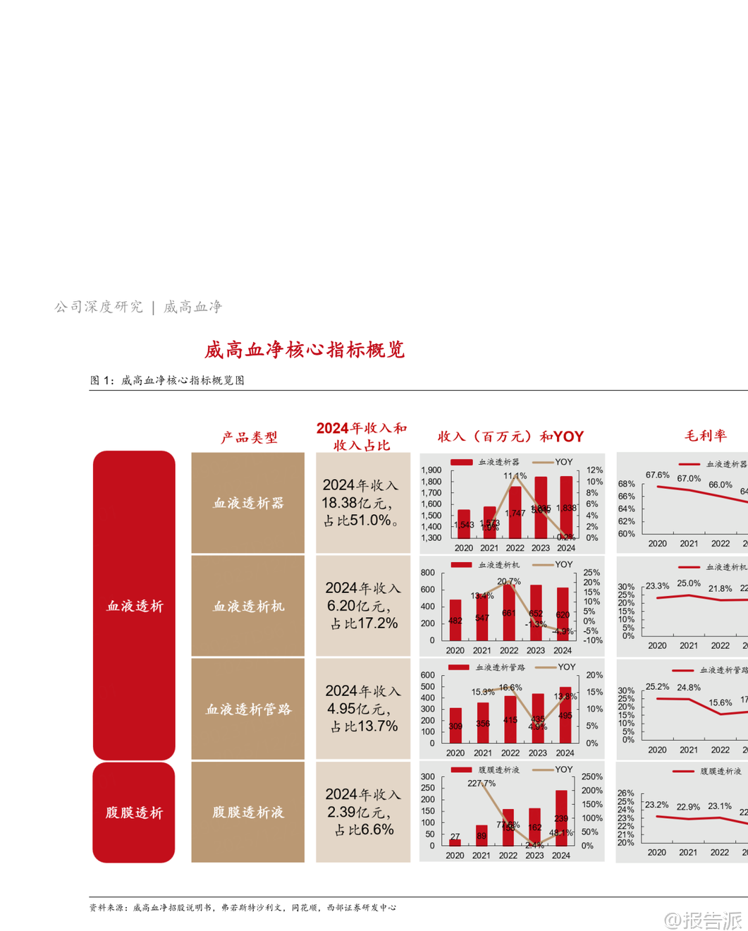 | 威高血净(603014.SH)是国内血液净化领域的领军企业,凭借全产品线布局和核心技术优势,在行业中占据领先地位。 公司自2004年成立以来,逐步构建起覆盖血液透析器、透析管路、透析机及腹膜透析液的完整产业链,并通过与日机装、泰尔茂等国际巨头合作,持续提升技术实力和市场竞争力。 2020年至2024年,公司营业收入和归母净利润复合增长率分别达到8.1%和10.9%,展现出稳健的成长性。 2025年前三季度,营收和净利润同比分别增长3.5%和7.9%,延续了良好的发展态势。 血液净化行业正处于供需两旺的快速发展阶段。 需求端,我国终末期肾病(ESRD)患者数量从2018年的67.4万人增长至2023年的107万人,其中接受血液透析的患者从57.9万增至91.7万,渗透率仍有巨大提升空间。 供给端,国产替代进程加速,政策推动下基层医疗机构透析服务能力不断提升。 据预测,中国血液透析医疗器械市场在2023至2027年的复合年均增长率将高达21.52%,行业整体扩容趋势明确。 威高血净的核心竞争力体现在产品与研发两大方面。 在产品端,公司已形成全产业链布局,核心单品血液透析器2024年收入占比达51.0%。 凭借自主掌握的中空纤维膜制膜技术和生产工艺,公司在关键耗材领域建立了深厚壁垒。 2023年,其血液透析器、透析管路在国内市占率分别为32.5%和31.8%,均位列第一;血液透析机市占率24.6%,排名第二,龙头地位稳固。 在研发端,公司持续推进产品迭代,多款新型透析器处于研发阶段,第四代产品预计2026年上市。 同时,便携式CRRT装置也已进入注册报批阶段,有望进一步丰富设备管线。 值得关注的是,公司正积极拓展新的增长曲线。 一方面,海外市场表现亮眼,2023年、2024年及2025年上半年海外收入分别同比增长97.5%、54.1%和64.0%,境外收入占比由2020年的1.4%提升至2025H1的8.4%。 公司已在香港、厄瓜多尔、印尼等地设立子公司,本地化运营不断深入。 另一方面,公司拟通过发行股份收购威高普瑞100%股权,切入生物制药上游领域。 威高普瑞是国内预灌封注射器行业的龙头企业,2024年净利率高达40.4%。 此次并购不仅将显著增厚公司利润,更可借助其客户资源和自身中空纤维膜技术,共同开拓以生物制药滤器为重点的新市场,打破原有业务天花板。 财务预测显示,公司未来三年业绩有望加速增长。 预计2025/2026/2027年营业收入分别为36.88亿、40.34亿和43.70亿元,同比增长2.3%、9.4%和8.3%;归母净利润为4.52亿、4.99亿和5.51亿元,同比增长0.7%、10.4%和10.3%。 尽管短期受集采影响,血液透析器收入出现下滑,但公司通过“以价换量”策略维持销量增长,且腹膜透析液受益于中性产品获批,2024年收入大增48.1%,成为重要增长极。 综合来看,威高血净作为国内血液净化平台型龙头,不仅在传统耗材和设备领域具备领先优势,更通过出海战略和外延并购打开了全新的成长空间。 在行业需求持续释放、国产替代深化以及公司自身创新驱动的多重背景下,公司长期发展前景值得期待。 西部证券首次覆盖,给予“买入”评级。 本文由【报告派】研读,输出观点仅作为行业分析! 原文标题:2026-01-03-西部证券-西部证券-威高血净(603014)首次覆盖深度报告:血液净化平台型龙头,外延突破成长天花板 发布时间:2026年 出品方:西部证券