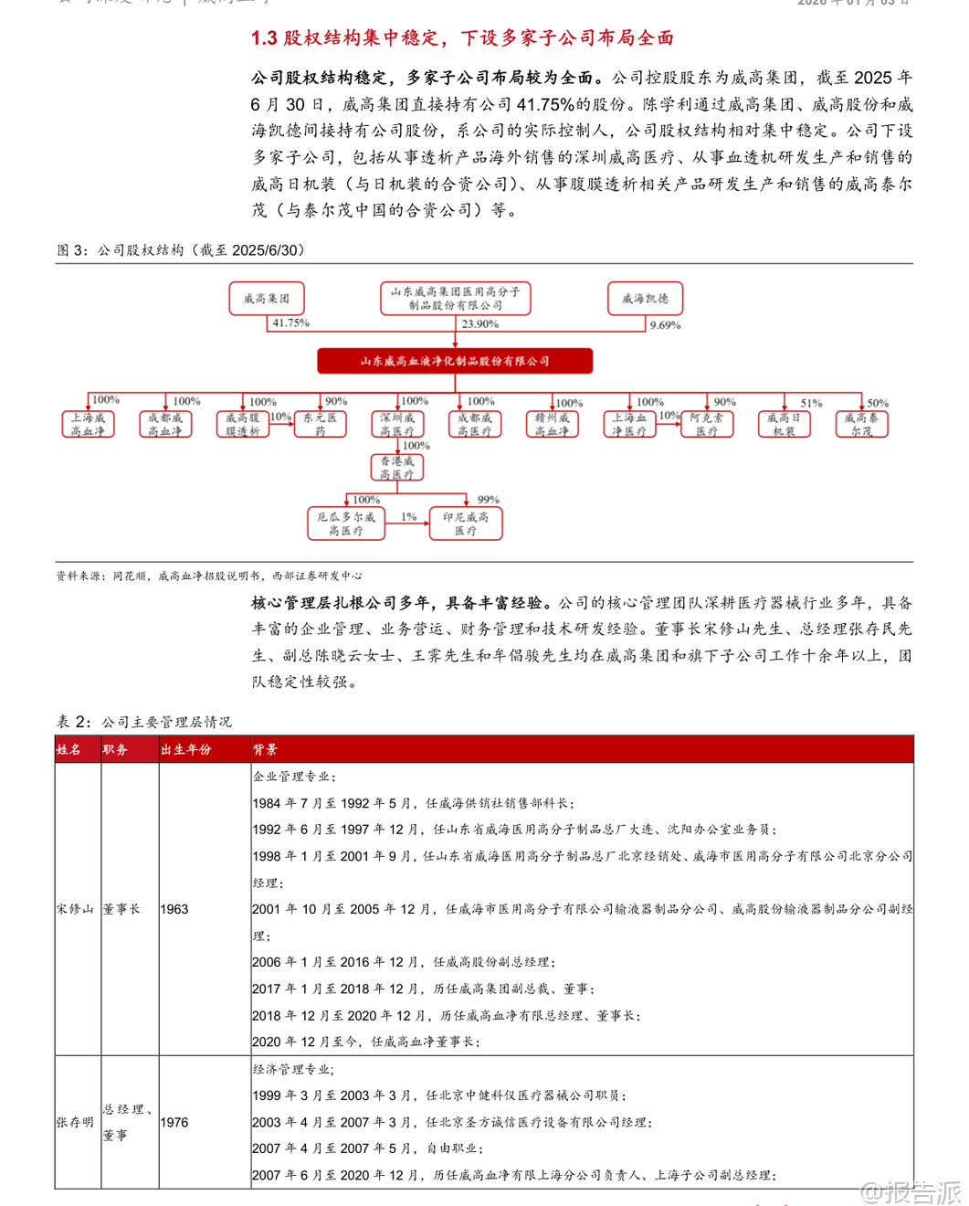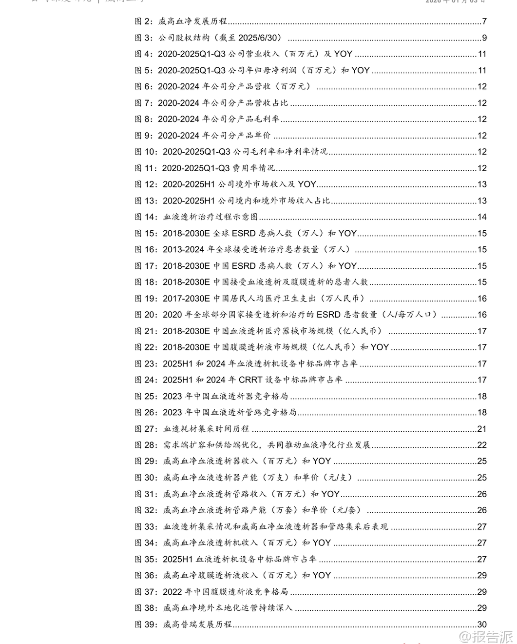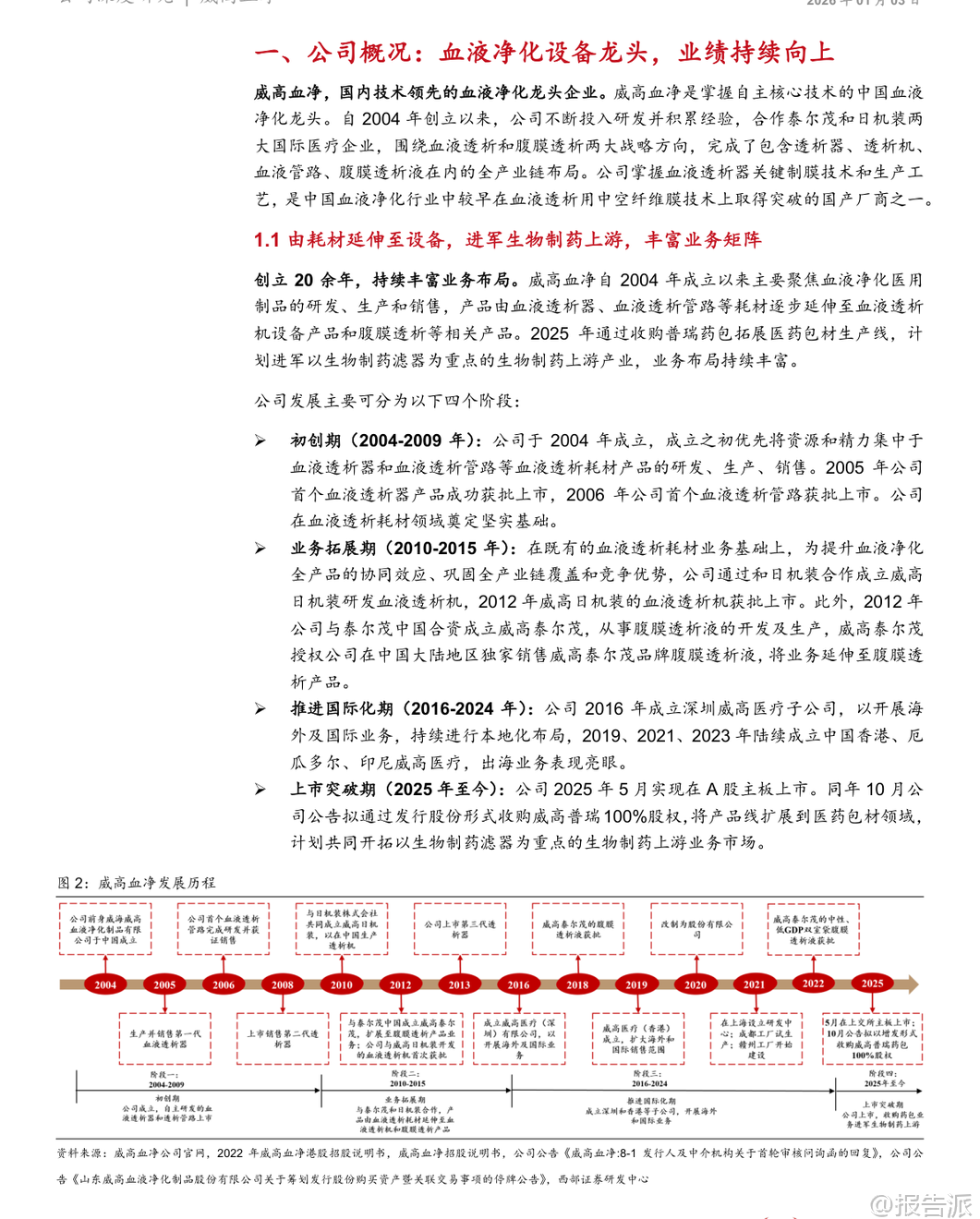 | 威高血净(603014.SH)是国内血液净化领域的领军企业,凭借全产品线布局和核心技术优势,在行业中占据领先地位。 公司自2004年成立以来,逐步构建起覆盖血液透析器、透析管路、透析机及腹膜透析液的完整产业链,并通过与日机装、泰尔茂等国际巨头合作,持续提升技术实力和市场竞争力。 2020年至2024年,公司营业收入和归母净利润复合增长率分别达到8.1%和10.9%,展现出稳健的成长性。 2025年前三季度,营收和净利润同比分别增长3.5%和7.9%,延续了良好的发展态势。 血液净化行业正处于供需两旺的快速发展阶段。 需求端,我国终末期肾病(ESRD)患者数量从2018年的67.4万人增长至2023年的107万人,其中接受血液透析的患者从57.9万增至91.7万,渗透率仍有巨大提升空间。 供给端,国产替代进程加速,政策推动下基层医疗机构透析服务能力不断提升。 据预测,中国血液透析医疗器械市场在2023至2027年的复合年均增长率将高达21.52%,行业整体扩容趋势明确。 威高血净的核心竞争力体现在产品与研发两大方面。 在产品端,公司已形成全产业链布局,核心单品血液透析器2024年收入占比达51.0%。 凭借自主掌握的中空纤维膜制膜技术和生产工艺,公司在关键耗材领域建立了深厚壁垒。 2023年,其血液透析器、透析管路在国内市占率分别为32.5%和31.8%,均位列第一;血液透析机市占率24.6%,排名第二,龙头地位稳固。 在研发端,公司持续推进产品迭代,多款新型透析器处于研发阶段,第四代产品预计2026年上市。 同时,便携式CRRT装置也已进入注册报批阶段,有望进一步丰富设备管线。 值得关注的是,公司正积极拓展新的增长曲线。 一方面,海外市场表现亮眼,2023年、2024年及2025年上半年海外收入分别同比增长97.5%、54.1%和64.0%,境外收入占比由2020年的1.4%提升至2025H1的8.4%。 公司已在香港、厄瓜多尔、印尼等地设立子公司,本地化运营不断深入。 另一方面,公司拟通过发行股份收购威高普瑞100%股权,切入生物制药上游领域。 威高普瑞是国内预灌封注射器行业的龙头企业,2024年净利率高达40.4%。 此次并购不仅将显著增厚公司利润,更可借助其客户资源和自身中空纤维膜技术,共同开拓以生物制药滤器为重点的新市场,打破原有业务天花板。 财务预测显示,公司未来三年业绩有望加速增长。 预计2025/2026/2027年营业收入分别为36.88亿、40.34亿和43.70亿元,同比增长2.3%、9.4%和8.3%;归母净利润为4.52亿、4.99亿和5.51亿元,同比增长0.7%、10.4%和10.3%。 尽管短期受集采影响,血液透析器收入出现下滑,但公司通过“以价换量”策略维持销量增长,且腹膜透析液受益于中性产品获批,2024年收入大增48.1%,成为重要增长极。 综合来看,威高血净作为国内血液净化平台型龙头,不仅在传统耗材和设备领域具备领先优势,更通过出海战略和外延并购打开了全新的成长空间。 在行业需求持续释放、国产替代深化以及公司自身创新驱动的多重背景下,公司长期发展前景值得期待。 西部证券首次覆盖,给予“买入”评级。 本文由【报告派】研读,输出观点仅作为行业分析! 原文标题:2026-01-03-西部证券-西部证券-威高血净(603014)首次覆盖深度报告:血液净化平台型龙头,外延突破成长天花板 发布时间:2026年 出品方:西部证券