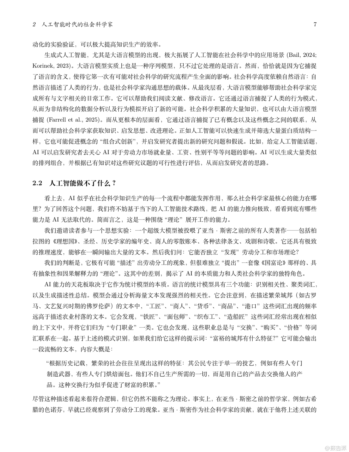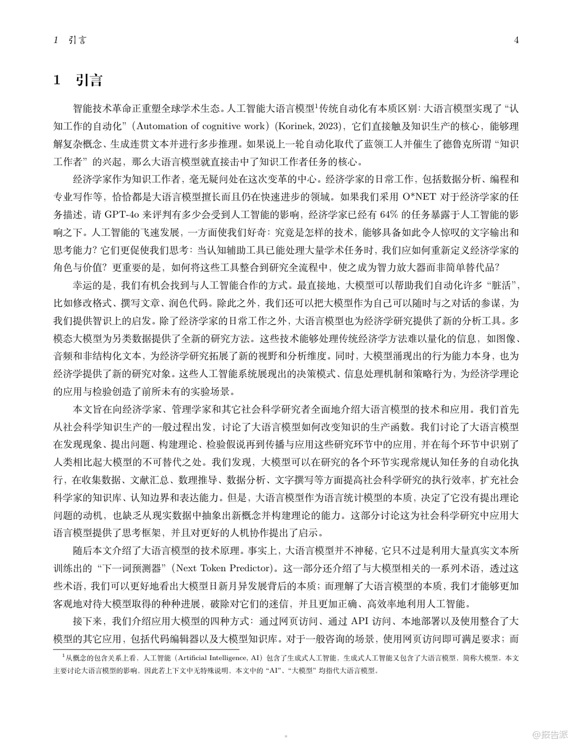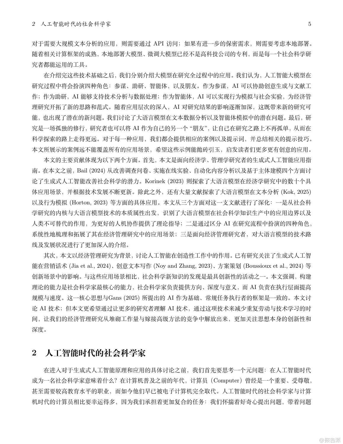 | 人工智能大语言模型(如ChatGPT、DeepSeek)正深刻重塑经济管理研究范式,推动学术工作迈入“人机协作”的新时代。 北京大学国家发展研究院胡诗云、易君健在《2025智能之光:人机协作的经济管理研究新时代报告》中系统阐述了这一变革。 报告指出,大模型的本质是“下一词预测器”,其核心能力在于实现认知工作的自动化,而非替代人类科学家。 研究者的核心价值在于围绕理论工作的能力——提出根本性问题、构建因果机制、创造抽象概念并赋予研究以意义和方向。 AI无法自发产生像亚当·斯密“看不见的手”那样的理论飞跃,也无法拥有源于价值判断的规范性目标。 报告提出,大模型将在研究全流程中扮演四大角色。 第一,作为“参谋”,AI是研究者的思想伙伴,能协助资料收集、深化文献理解、澄清概念并提供研究反馈。 例如,通过深度检索功能,AI可在几分钟内整合数十个信息源,生成关于衰退与收入分配的系统综述。 第二,作为“助研”,AI承担研究助理职能,自动化处理文献整理、参考文献格式转换、代码撰写、数据清洗等重复性任务,将研究者从“脏活累活”中解放。 第三,作为“智能体”,大模型本身成为研究对象与实验工具。 研究者可利用单智能体模拟个体行为(如测试AI在博弈中的风险偏好),或多智能体系统模拟复杂社会互动(如市场交易、政策影响),为经济学理论提供前所未有的实验场景。 第四,作为“朋友”,AI超越学术角色,提供职业发展建议、心理辅导和人际交往策略,为研究者提供全方位支持。 报告强调,有效利用AI的关键在于“提示工程”(Prompt Engineering),即通过精心设计的提示词引导AI。 研究者需具备“AI素养”,懂得如何提出高质量问题。 同时,报告警示了潜在风险:一是“前视偏差”,即大模型因知晓历史数据而高估预测能力,需通过实时预测或对比知识截止日前后表现来规避;二是结果的敏感性,模型输出可能随提示词或模型版本变化,需建立人工标注的基准进行校准。 此外,多智能体模拟的因果推断效力也需谨慎解读,其结果本质仍是条件期望,未必反映真实因果。 总而言之,大模型并非研究者的替代品,而是强大的“智力放大器”。 它通过自动化执行常规任务,极大地提升了研究效率,更通过人机深度协作,扩展了人类思维的广度与深度。 未来,研究者的核心竞争力将从数据处理转向创造性思考、批判性分析和理论构建。 该报告为经济管理学者如何拥抱AI时代提供了兼具技术深度与哲学高度的全景式指南,预示着一个以人机协同为核心特征的智能研究新时代的到来。 出品方:北大国发院 发布时间:2025年 文档页数:57页