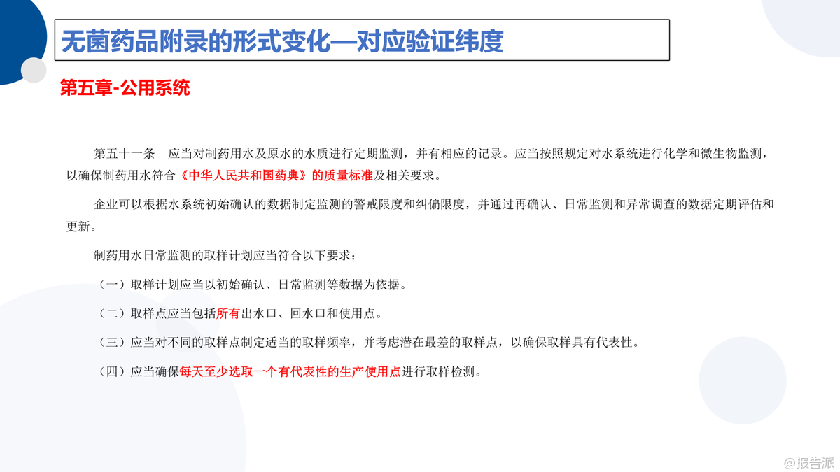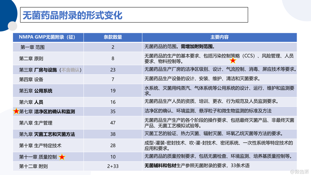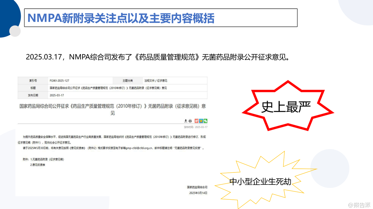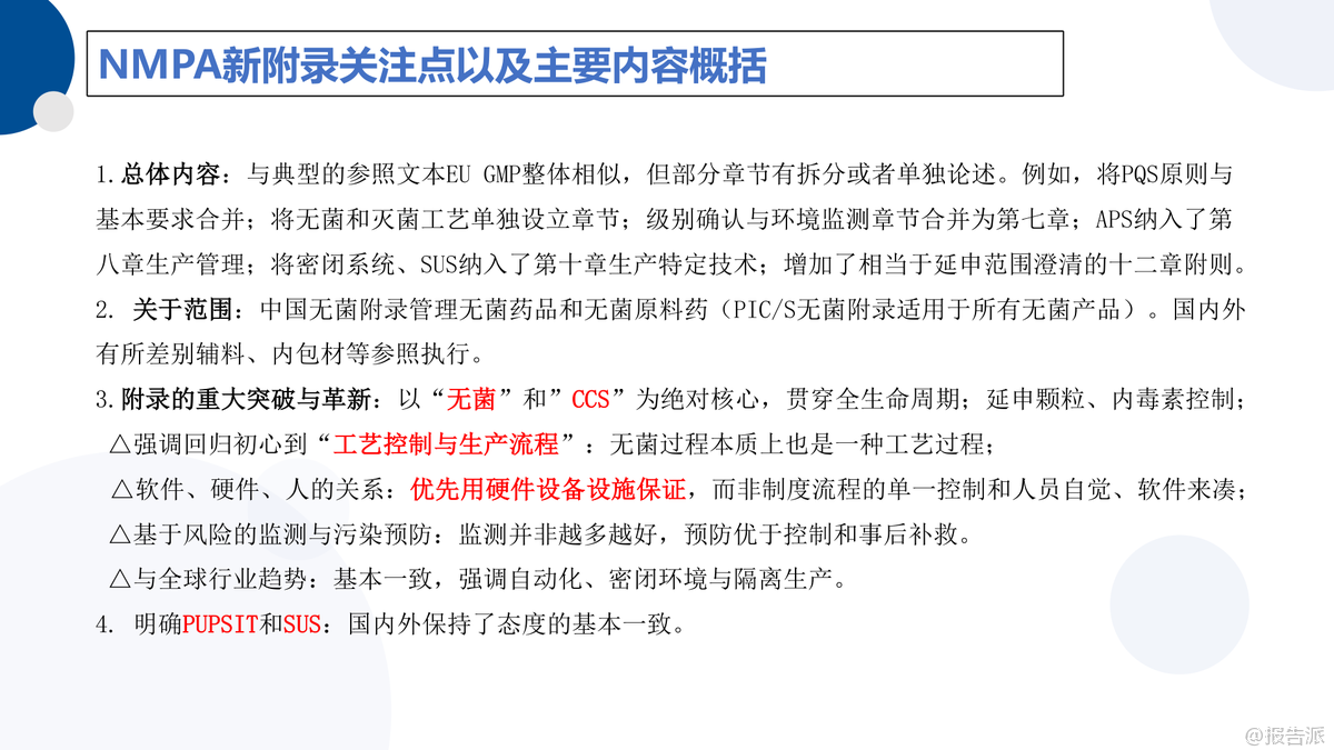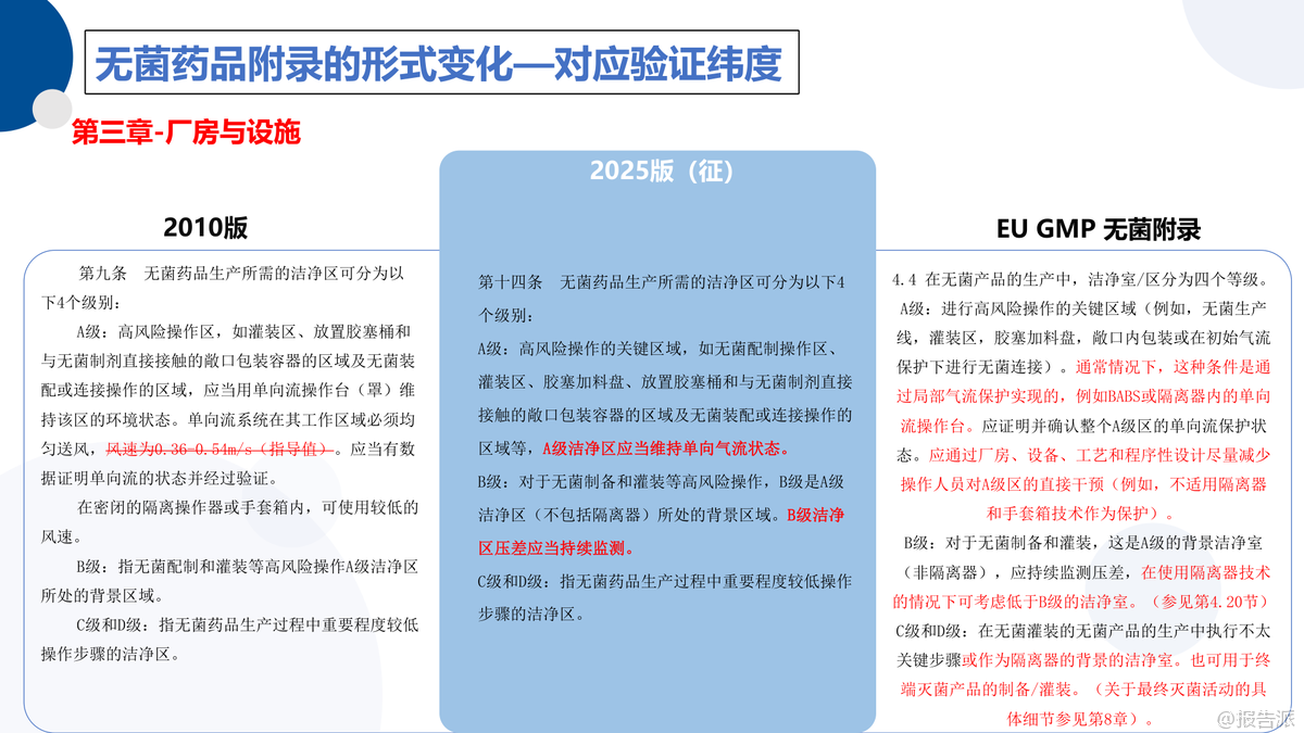 | 近日,国家药品监督管理局(NMPA)综合司发布《药品生产质量管理规范》无菌药品附录(征求意见稿),标志着我国无菌制药监管即将迎来史上最严变革。 此次修订被业内称为‘中小型企业生死劫’,不仅在结构上进行了系统性重构,更在理念上实现了从‘合规驱动’向‘风险防控与工艺本质安全’的深刻转变。 新版附录共15章、80条条款,相较2010版的12章、235条大幅精简,但内容更为聚焦与深化。 其核心变化在于确立了“无菌保障”和“污染控制策略(CCS)”为贯穿药品全生命周期的核心主线。 这意味着企业不能再依赖末端检测或人为补救,而必须从前端设计、硬件配置、工艺流程和人员行为等多维度构建系统性防护体系。 值得关注的是,新附录明确提出优先通过硬件设施保障无菌环境,而非过度依赖制度流程和人员自觉。 这预示着未来无菌制药将加速向自动化、密闭化、隔离化方向发展,RABS(限制进出屏障系统)、隔离器、一次性使用系统(SUS)等先进技术的应用将成为标配。 同时,对A/B级洁净区的风速、气流流型、自净时间等关键参数提出了更严格的验证要求,并强调气流可视化研究需覆盖动态模拟操作场景,确保实际生产中的污染风险可控。 在验证维度上,新版附录强化了洁净区确认与环境监测的区分。 洁净区级别确认需基于ISO 14644标准,涵盖静态与动态两种状态下的悬浮粒子和微生物测试,且A/B级区域再确认周期不得超过6个月。 特别指出的是,D级区动态粒子限度不再统一规定,企业需基于风险评估自行制定标准,体现了监管的科学性与灵活性。 此外,新附录首次将密闭系统、一次性系统(SUS)、吹灌封(CFS)等新兴技术纳入正式条款,并明确PUPSIT(培养基模拟灌装试验)的技术要求。 对于水系统、除菌过滤、灭菌工艺等关键环节,也进一步细化了完整性测试、使用后检测、冗余过滤判定等操作规范,尤其强调除菌过滤单元的完整性测试必须在使用后立即执行。 总体来看,2025版无菌药品附录不仅是技术标准的升级,更是监管理念的跃迁。 它推动企业从被动应对转向主动预防,从经验管理迈向数据驱动。 对于制药企业而言,这既是挑战也是机遇——唯有尽早布局CCS体系建设,强化硬件投入与验证能力,才能在这场行业洗牌中立于不败之地。 出品方:中电二 发布时间:2025年