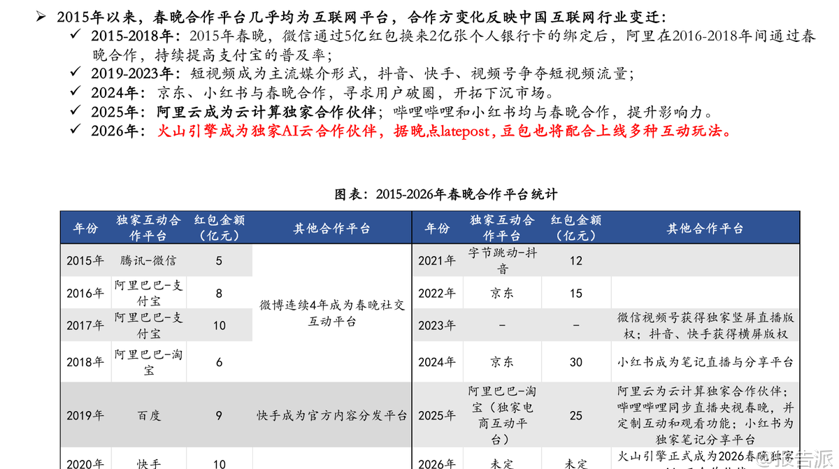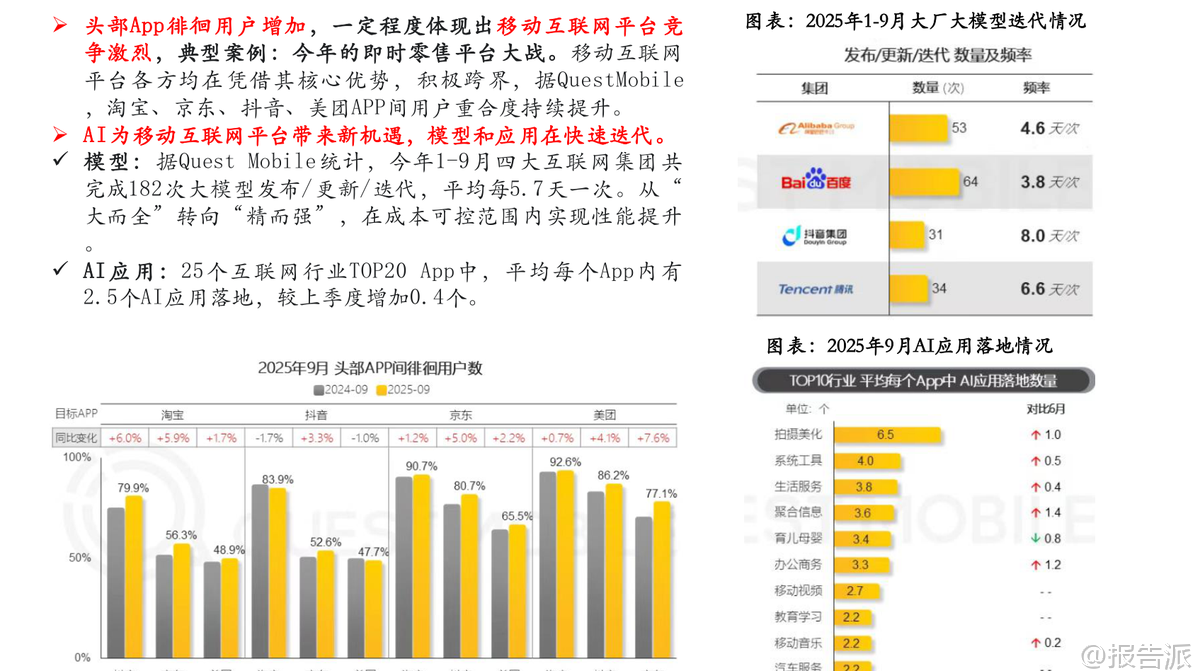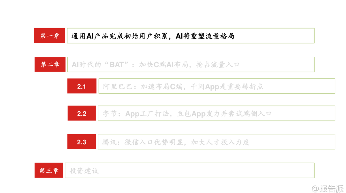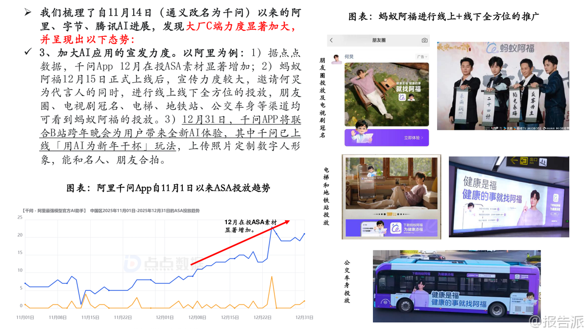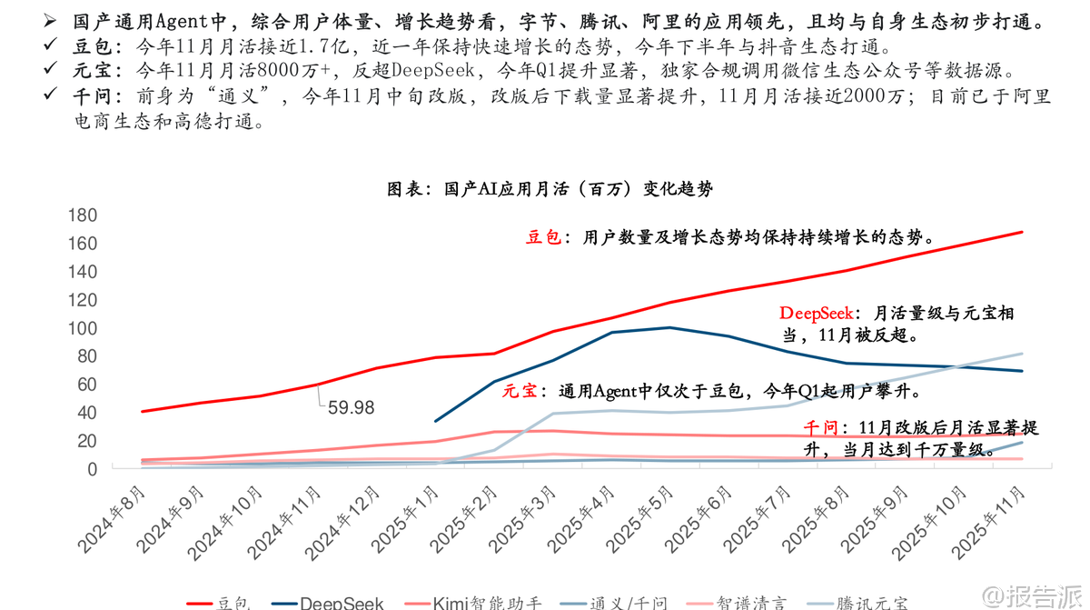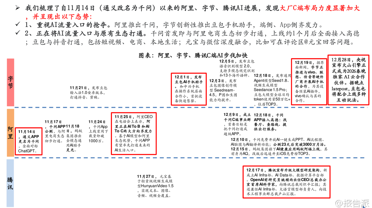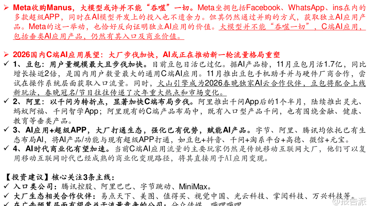 | 2026年,AI应用正加速重塑中国互联网流量格局,字节跳动、阿里巴巴、腾讯等头部大厂在C端AI布局上明显提速,推动新一轮用户入口争夺战。 中信建投发布的《传媒行业2026年AI应用深度展望》指出,尽管大模型技术快速发展,但独立AI应用依然具备重要商业价值和入口意义。 Meta收购Manus的案例表明,即便拥有Facebook、WhatsApp等超级APP,仍需通过并购获取优质AI产品,印证了垂类及通用AI应用不可替代的地位。 当前国内C端AI竞争格局中,字节跳动旗下的豆包表现最为突出。 截至2025年11月,豆包月活已达1.7亿,日活跃用户过亿,成为国内用户规模最大的通用AI应用。 其成功得益于三大核心策略:一是持续优化产品力,推出22个智能体提升用户体验;二是依托抖音生态进行大规模流量扶持;三是不断迭代模型能力,如上线视频通话、多模态生成等功能。 更关键的是,豆包已与抖音实现深度打通,在短视频推荐、电商导购、本地生活服务等场景中提供无缝衔接的AI体验。 此外,豆包还积极探索端侧入口,联合中兴推出AI手机助手,并计划在2026年央视春晚期间配合火山引擎上线互动玩法,进一步扩大影响力。 阿里巴巴则以“千问”App为战略转折点,全面加速C端布局。 自2025年11月通义App更名为千问并公测以来,下载量迅速破千万,月活突破2000万。 阿里采取“超级APP+垂类应用+硬件探索”的组合拳:千问作为主入口,已接入淘宝、高德地图、支付宝等生态,支持商品比价、出行规划等复杂任务;同时推出蚂蚁阿福(健康)、千问智学(教育)等垂直AI应用,并借助何炅代言和全渠道投放快速抢占用户心智。 值得注意的是,千问团队明确将打造“AI生活入口”作为目标,显示出阿里从B端云服务向C端消费者市场转型的决心。 腾讯凭借微信这一国民级应用构建独特优势。 其AI助手“元宝”不仅独立运营,更深度融入微信生态,可在聊天对话、公众号评论区直接调用,具备天然的社交传播属性。 元宝的一大核心竞争力在于独家接入微信公众号内容库——这是目前唯一对非腾讯系AI开放的高质量中文语料源。 随着视频号内容快速增长,未来元宝有望进一步整合视频理解能力,形成更强的信息检索壁垒。 长期来看,微信Agent被视为最具潜力的AI超级入口形态,有望基于用户的聊天记录、支付行为、小程序使用习惯等数据,提供高度个性化的任务执行服务,真正实现“在微信内完成一切”。 报告强调,AI时代流量格局正在重构,可能出现三种类型的超级入口:一是“超级App+AI”,如豆包+抖音、千问+淘宝;二是“操作系统+硬件”,如豆包AI手机助手;三是“原生大模型平台”,如ChatGPT。 每种形态最终可能仅剩1-2家主导者。 相较于移动互联网时代长达十年的商业化周期,AI应用变现速度显著加快。 OpenAI推出不到两年即实现百亿美元ARR,其中C端订阅收入占比达75%。 国内大厂可复用成熟的广告、会员、交易抽佣等模式,推动AI产品快速盈利。 投资层面,报告建议关注三条主线:一是入口类公司,包括腾讯控股、阿里巴巴、字节跳动及MiniMax;二是大厂生态合作伙伴,如易点天下、美图、值得买、视觉中国、光云科技、掌阅科技、万兴科技等;三是受益于流量竞争加剧的广告媒介平台,如分众传媒、哔哩哔哩。 风险提示包括AI投入不及预期、行业竞争恶化、商业化进展缓慢以及政策监管不确定性。 总体来看,2026年中国AI应用进入规模化落地关键期,大厂依托庞大用户基础和成熟生态,正在构建集搜索、创作、购物、健康、教育于一体的综合性AI服务平台。 这场由技术驱动的流量再分配,或将催生新一代平台型巨头,彻底改变数字生活的底层逻辑。 本文由【报告派】研读,输出观点仅作为行业分析! 原文标题:原文标题:2026-01-03-中信建投-传媒行业2026年AI应用深度展望:AI应用重塑流量格局,字节阿里腾讯C端布局加快 发布时间:2026年 报告出品方:中信建投