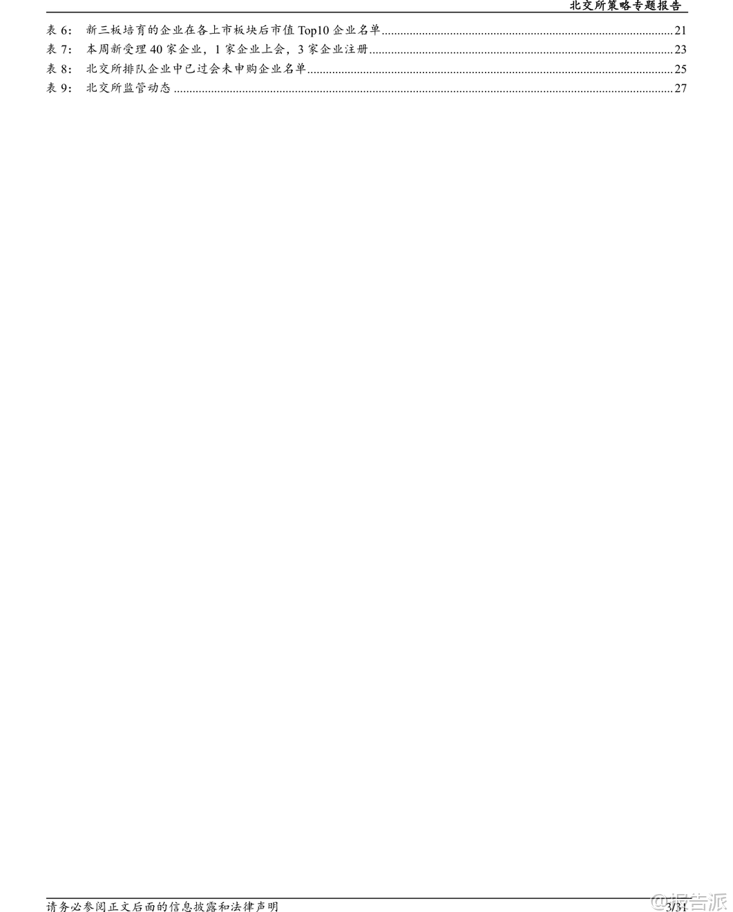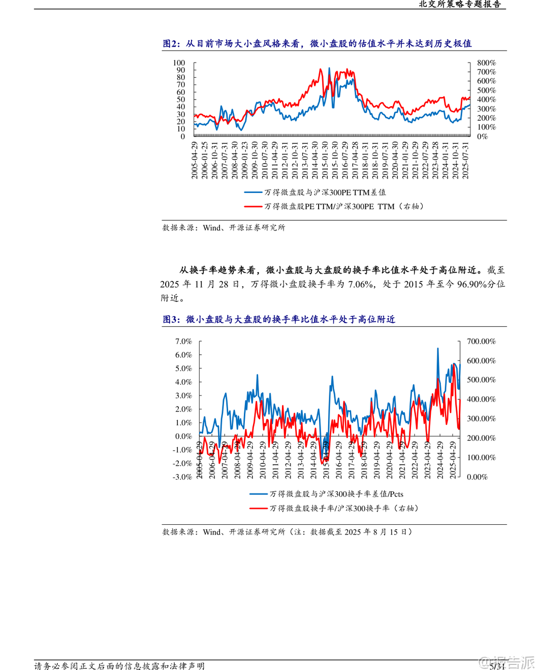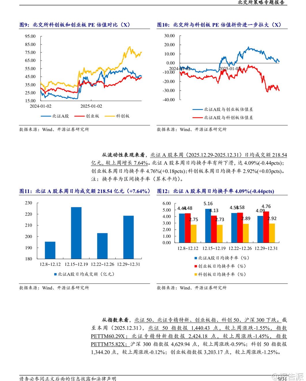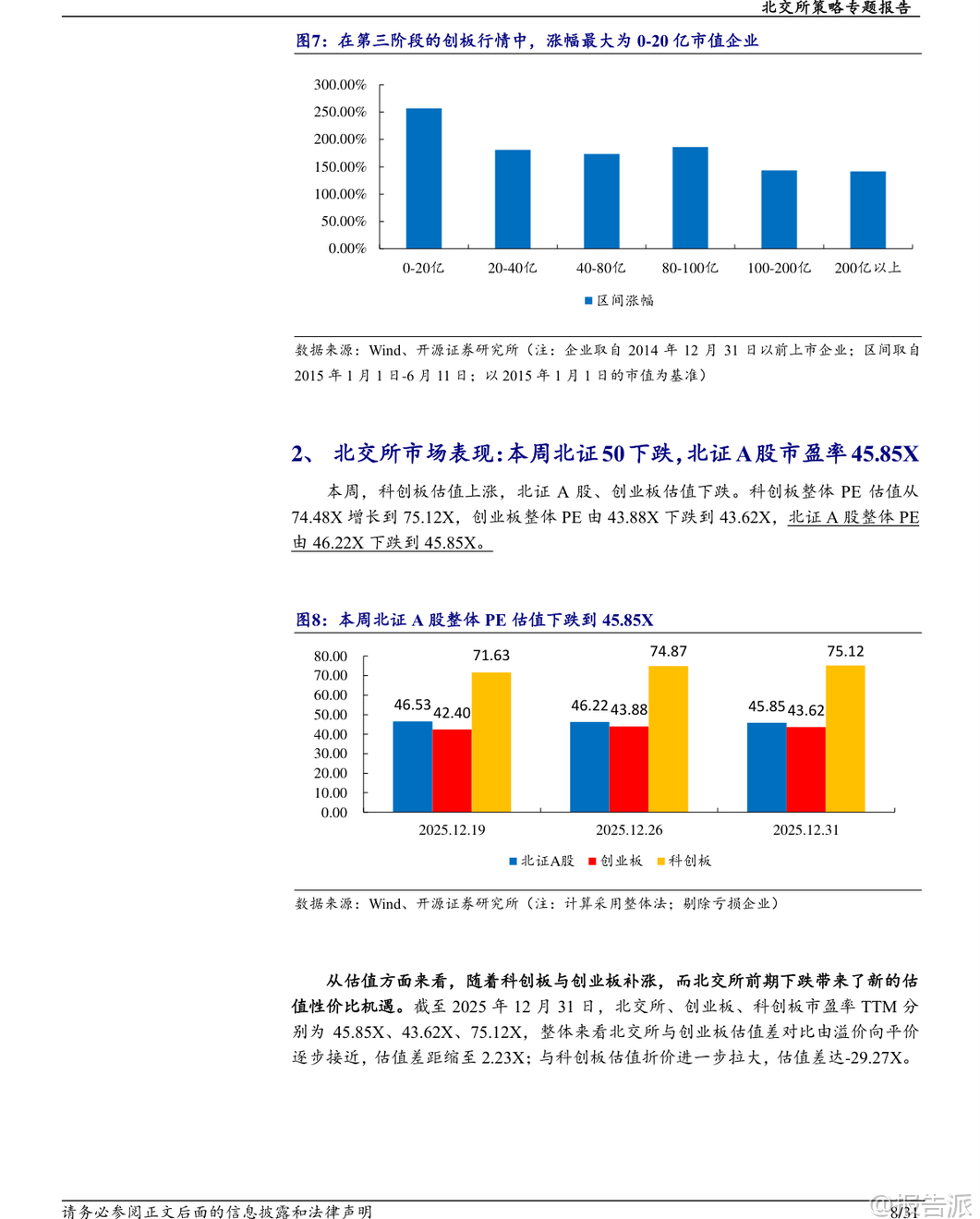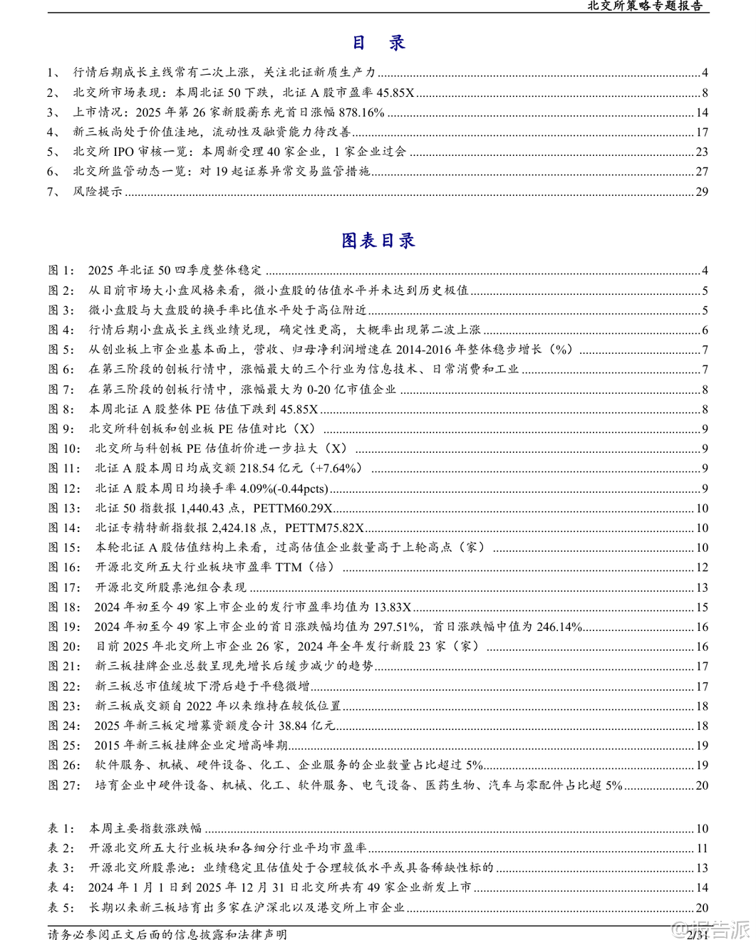 | 2026年开年之际,开源证券发布《北交所策略专题报告》,围绕“布局2026春季行情,关注新质生产力和中小盘成长股机会”展开深入分析。 报告指出,自2024年以来,北交所经历了“924”行情及2025年一季度至三季度的上涨周期,进入四季度后整体表现趋于稳定。 当前市场正处于一个关键转折期,复盘2013-2015年创业板行情可发现,成长主线在经历初期爆发与中期调整后,往往会在后期迎来业绩兑现驱动的第二波上涨,且涨幅空间更大、速度更快。 本轮北交所行情具备典型的“0-1”产业趋势背景,AI、算力、人形机器人、商业航天、核聚变等“新质生产力”成为核心叙事逻辑。 政策层面持续支持并购重组,为科技型中小企业提供了技术迭代与产业链外延拓展的双重机遇。 北交所聚集了大量具备创新能力的科技型中小企业,在这一轮科技浪潮中更易获得成长性溢价和估值提升。 从风格切换角度看,微小盘股与大盘股的估值比值尚未达到历史极值水平,而换手率比值已处于高位附近,显示市场对中小盘的成长偏好依然强劲。 结合创业板历史经验,第三阶段(2015年1月-6月)在业绩兑现背景下,创业板指数涨幅高达162.42%,远超沪深300的50.17%。 其中,信息技术、日常消费和工业三大行业领涨,市值在0-20亿的小盘股平均涨幅达256.66%,展现出显著的弹性优势。 截至2025年底,北证50指数收于1,440.43点,市盈率(PETTM)为60.29倍;北证专精特新指数收于2,424.18点,市盈率为75.82倍。 分行业看,信息技术板块估值最高,达87.10倍,医药生物最低为36.12倍。 尽管前期有所回调,但北交所整体估值性价比逐步显现,尤其与科创板相比折价进一步拉大,形成结构性机会。 报告建议重点关注“北证50绩优成分股+科技成长次新股”双主线。 推荐标的覆盖四大产业链:信息技术领域关注万源通;化工新材料领域包括贝特瑞、安达科技、禾昌聚合、无锡晶海、中裕科技、民士达;高端装备领域涵盖同力股份、开特股份、长虹能源、五新隧装、林泰新材、捷众科技、世昌股份、海希通讯;医药生物领域推荐锦波生物、诺思兰德、德源药业、海昇药业、梓橦宫。 IPO方面,2025年北交所共上市26家企业,首日平均涨幅达368.13%,其中蘅东光首日暴涨878.16%,显示出市场对优质标的的高度认可。 截至年末,已有30家过会待上市企业,审核节奏加快,后续将有更多具备“新质生产力”属性的新股登陆,为市场注入新鲜血液。 新三板作为北交所的“后备军”,目前挂牌企业5995家,总市值约2.4万亿元,仍处价值洼地。 尽管流动性与融资能力有待改善,但其在软件服务、机械、硬件设备、化工等领域的企业分布广泛,长期培育出大量登陆沪深北及港交所的成功案例,如贝特瑞、锦波生物、指南针、安克创新等,验证了其孵化优质企业的能力。 监管层面,北交所持续加强对异常交易行为的监控,2025年末对“广道退”“*ST云创”等风险股票实施重点监控,并对19起异常交易采取自律监管措施,体现了从严监管、维护市场秩序的决心。 综上所述,开源证券认为,2026年春季行情值得期待,北交所作为承载“新质生产力”的重要平台,有望在政策支持、产业趋势和业绩兑现三重驱动下,迎来中小盘成长股的第二波上涨。 投资者应聚焦具备核心技术、高成长性和稀缺性的专精特新企业,把握新一轮科技周期下的结构性机遇。 本文由【报告派】研读,输出观点仅作为行业分析! 原文标题:2026-01-04-开源证券-北交所策略专题报告:布局2026春季行情,关注新质生产力和中小盘成长股机会 发布时间:2026年 出品方:开源证券