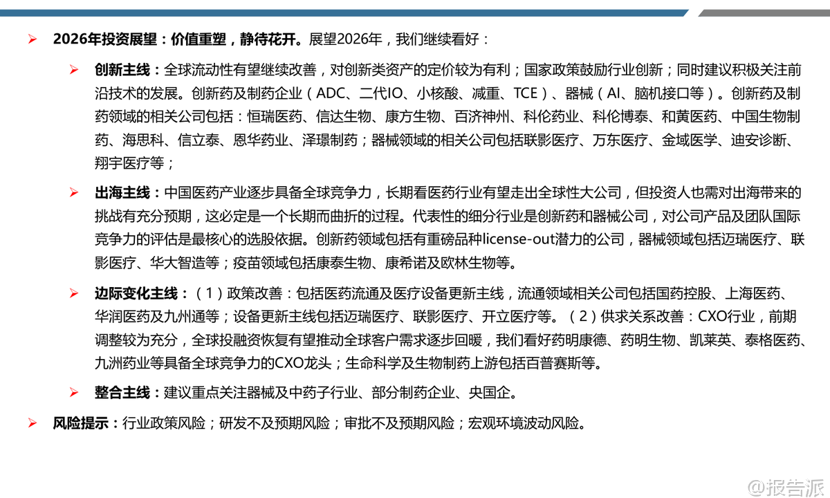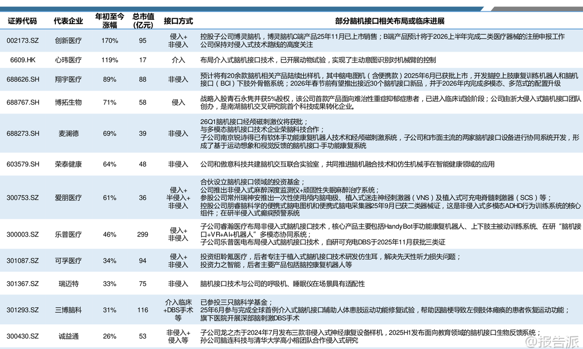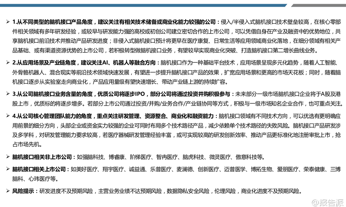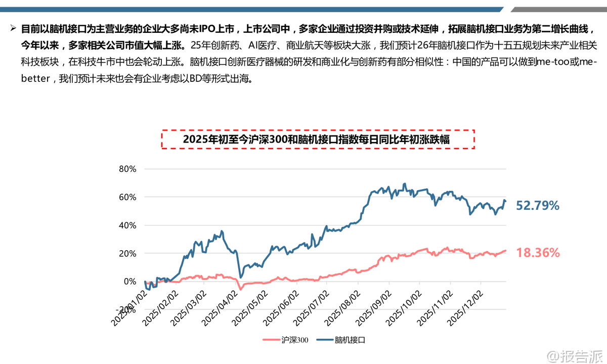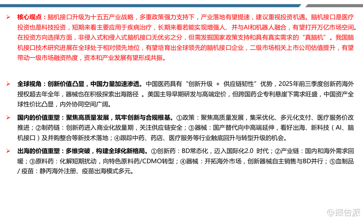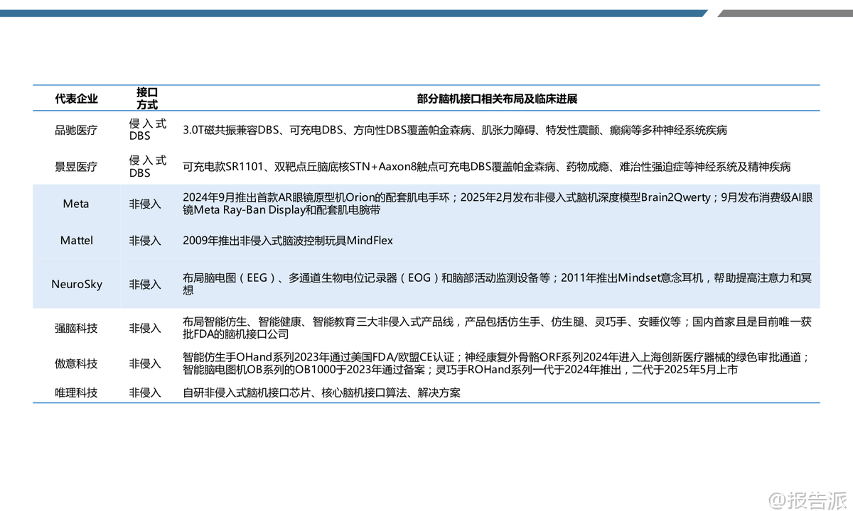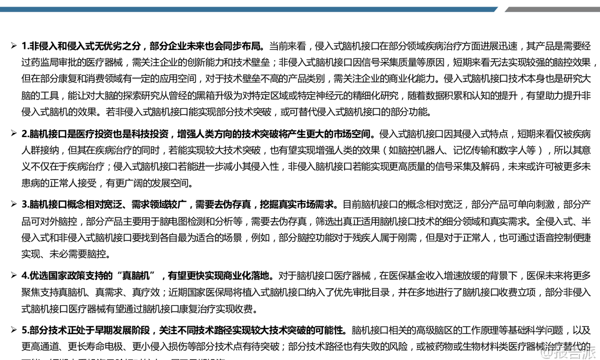 | 脑机接口作为连接大脑与外部设备的前沿技术,正迎来前所未有的发展机遇。 根据中信建投发布的《脑机接口行业系列研究之二》报告,该技术已被正式纳入“十五五”产业战略,多重政策支持下,产业落地有望加速推进,未来不仅在医疗领域具有广阔应用前景,更可能通过与AI、机器人融合实现人类能力的增强,打开万亿级市场空间。 当前脑机接口主要分为侵入式和非侵入式两大路径。 侵入式脑机接口通过手术将电极植入大脑皮层,能够采集高质量神经信号,在运动功能丧失、失语症、视觉障碍及帕金森病、癫痫等神经系统疾病治疗中进展迅速。 典型案例如Neuralink已完成全球首例无线侵入式脑机接口人体试验,患者仅凭意念即可控制电脑光标。 国内方面,阶梯医疗联合中科院、复旦大学附属华山医院,以及北京芯智达与北京脑科学研究所合作研发的“北脑二号”项目也已取得重要突破。 然而,侵入式技术仍面临胶质瘢痕形成、免疫排斥等长期稳定性挑战。 非侵入式则无需开颅,安全性高,适用于康复训练、注意力监测和消费级场景,但信号质量较弱,短期内难以实现精准脑控。 报告指出,两类技术并无优劣之分,关键在于匹配真实临床需求和技术壁垒。 政策层面,2025年以来国家及地方密集出台多项扶持政策,推动脑机接口进入发展快车道。 国家医保局已设立“侵入式脑机接口置入费”“非侵入式脑机接口适配费”等收费项目,并将相关产品纳入优先审批目录。 北京、上海、四川、浙江、江苏等地相继发布专项规划,明确发展目标:北京市提出到2030年培育3-5家全球影响力科技领军企业;上海市计划推动核心芯片和传感器达到国际领先水平;四川省目标到2030年开展3000例/年侵入式手术并引育10家链主企业。 这些政策不仅涵盖技术研发、临床转化,还包括价格立项、医保支付等商业化闭环支持,为产业发展提供全方位保障。 从市场规模看,麦肯锡预测脑机接口未来可达万亿元级别。 中信建投测算显示,2030年全球市场规模有望达1470亿美元,2040年攀升至3043亿美元。 主要应用场景包括医疗健康(运动、语言、视觉功能重建)和消费教育(注意力监测、交互控制)。 以帕金森病为例,我国现有约362万患者,DBS手术渗透率仅为1%,远低于美国的8%,提升空间巨大。 此外,军事领域也是重要应用场景,美国DARPA已实现脑控无人机、无声神经通信等技术验证,进一步凸显脑机接口的战略价值。 投资维度上,报告强调脑机接口既是医疗投资也是科技投资。 短期聚焦疾病治疗,长期则指向“增强人类”,如脑控机器人、记忆传输、数字人等。 建议关注具备真实需求、技术壁垒高且获政策支持的“真脑机”企业。 我国在脑机接口研究上处于全球领先地位,有望培育出世界级龙头企业,带动二级市场估值提升与一级市场融资热度共振。 重点推荐方向包括联影医疗、万东医疗等器械公司,以及在AI、柔性电极、神经解码算法等领域有布局的企业。 总体来看,脑机接口正处于从“修复大脑”向“增强人类”演进的关键阶段。 随着基础科学研究深入、关键技术持续突破、政策体系不断完善,叠加资本助力,中国有望在全球脑机接口竞争中占据领先地位,开启一个融合医疗、科技与智能的新纪元。 本文由【报告派】研读,输出观点仅作为行业分析! 原文标题:原文标题:2026-01-04-中信建投-脑机接口行业系列研究之二:从修复大脑到增强人类,十五五政策赋能万亿市场崛起 发布时间:2026年 报告出品方:中信建投