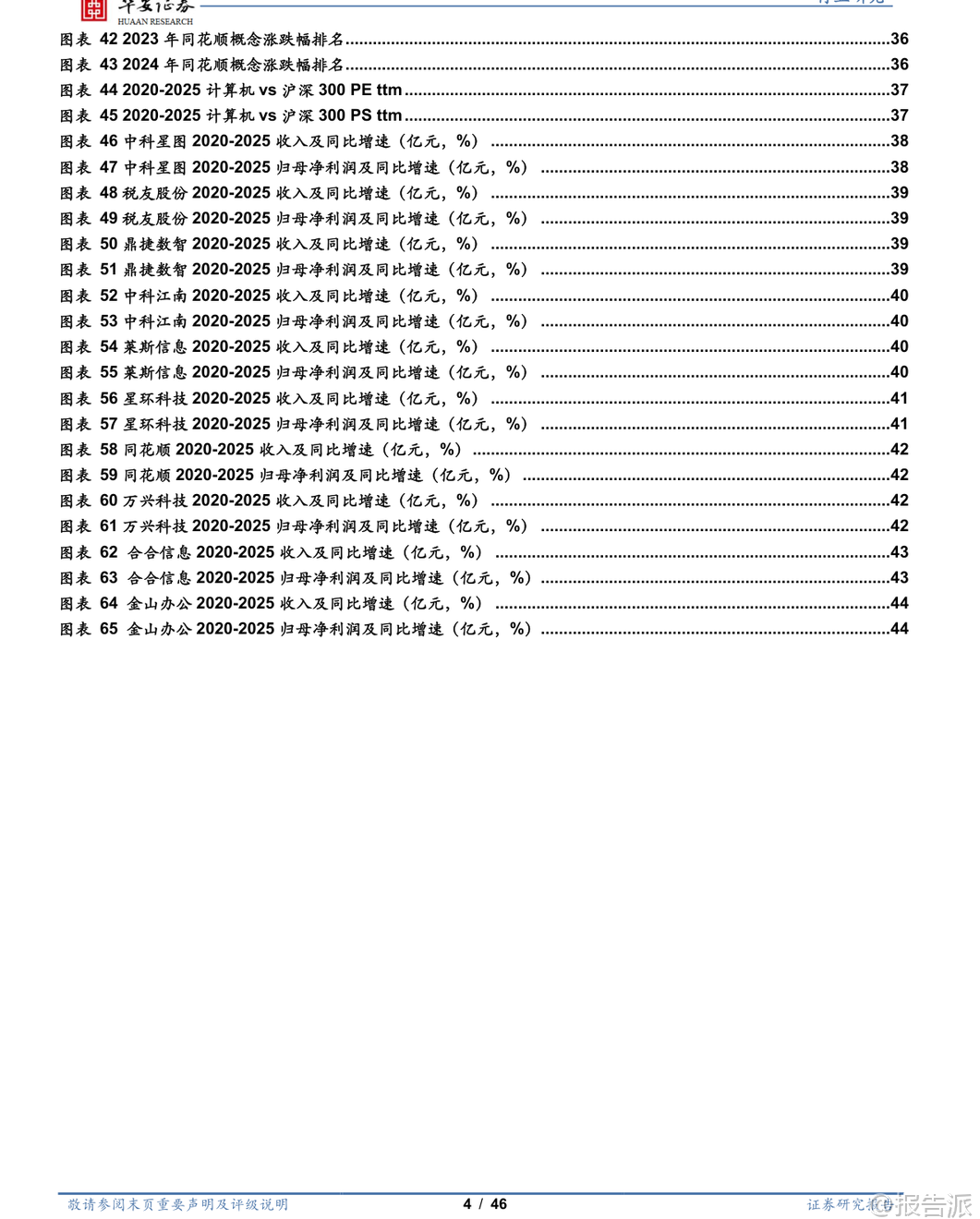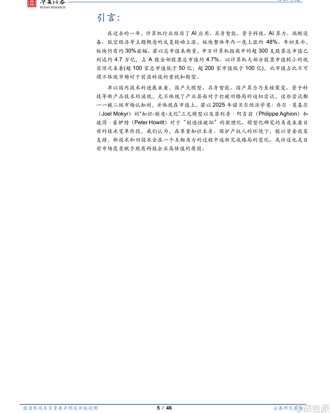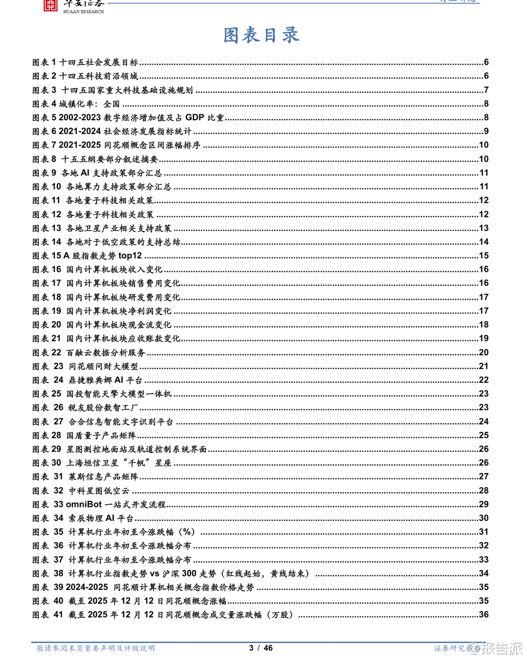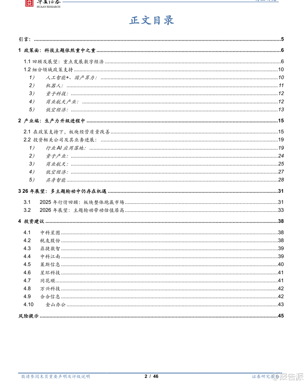 | 在科技变革与政策驱动的双重背景下,华安证券发布了《2026年计算机行业策略:回归热点轮动》深度研究报告。 该报告系统梳理了“十四五”期间我国在人工智能、量子科技、集成电路、脑机接口、商业航天等前沿领域的战略部署与实施成效,并对“十五五”时期的产业方向做出前瞻预判。 整体来看,计算机行业正逐步走出调整期,基本面呈现企稳回升态势,叠加高关注度带来的估值支撑,主题轮动行情有望持续演绎。 从政策维度看,“十四五”规划提出的城镇化率、数字经济占GDP比重、发明专利拥有量等多项量化目标均已超额完成。 其中,数字经济增加值占比突破42%,远超预期。 这背后是国家对AI、算力、工业软件、低空经济等核心技术的强力支持。 进入“十五五”,政策焦点进一步聚焦于工业制造升级、航天航空、低空经济、量子信息、具身智能和算力基础设施等领域,为计算机行业提供了长期发展动能。 地方政府也纷纷出台配套政策,在人工智能应用示范、算力补贴、机器人产业园建设、量子科研孵化、卫星星座布局及低空飞行管理等方面形成合力,推动技术从实验室走向规模化落地。 产业端的表现同样可圈可点。 2025年前三季度,计算机板块实现营业收入同比增长10%,显著高于A股平均水平;净利润增速高达37%,显示出企业盈利能力正在修复。 尽管现金流同比下降58%,但考虑到行业toG/toB属性导致回款集中在年底或次年初,这一现象并不构成实质性风险。 研发费用同比增长4%,表明企业在技术创新上仍保持投入定力。 更重要的是,行业主动优化订单结构,追求高质量收入,应收账款增速低于营收增速,经营质量持续改善。 具体到细分领域,多个赛道已出现标志性进展。 AI应用方面,同花顺、鼎捷数智、税友股份、合合信息等企业已在金融、制造、财税、办公场景中实现AI Agent成功落地。 例如,税友股份推出的数智会计产品效率提升10倍,成本降低60%;鼎捷数智AI业务收入同比增长超125%。 量子科技领域,国盾量子已构建起完整的商用产品矩阵,并受益于安徽“千家场景”行动计划,未来发展空间广阔。 商业航天方面,中科星图与星图测控推进“星眼”太空感知星座计划,计划发射156颗卫星提供轨道监测服务,同时布局天地一体化算力网络。 低空经济领域,莱斯信息空管系统国产化率达100%,并在南京等地实现无人机交通调度实际部署。 资本市场表现上,2025年计算机行业涨幅17%,在申万31个行业中排名第15,虽未领跑但保持活跃。 更值得关注的是其估值水平——全年PE一度高达292倍,PS维持在接近4的高位,远超沪深300的12-14倍PE和1.2-1.8倍PS。 这种高估值的背后,是市场对技术变革潜力的高度认可。 从同花顺概念指数观察,AI眼镜、人形机器人、液冷服务器、脑机接口、商业航天等主题交替领涨,呈现出典型的“热点轮动”特征。 即便部分技术尚处早期,二级市场仍愿意为其未来前景支付溢价。 展望2026年,华安证券认为,在行业基本面企稳、政策支持力度不减、科技创新持续推进的三大支撑下,计算机板块仍将维持高关注度。 虽然宏观经济、财政政策、供应链稳定性及汇率波动构成潜在风险,但主题轮动的投资逻辑依然成立。 投资者应重点关注那些在AI落地、量子产业化、商业航天基础设施、低空管控系统及具身智能平台等领域具备真实业绩转化能力的优质企业。 报告最后推荐了十家重点公司:中科星图(空天信息与低空监管)、税友股份(AI财税自动化)、鼎捷数智(工业软件智能化)、中科江南(智慧财政)、莱斯信息(空管系统龙头)、星环科技(大数据与AI基础软件)、同花顺(金融AI大模型)、万兴科技(创意类AI工具)、合合信息(智能文字识别与商业数据)、金山办公(WPS AI办公生态)。 这些企业在各自细分领域均展现出较强的技术壁垒与商业化潜力,有望在新一轮科技周期中脱颖而出。 本文由【报告派】研读,输出观点仅作为行业分析! 原文标题:2025-12-30-华安证券-华安证券-2026年计算机行业策略:回归热点轮动 发布时间:2025年 出品方:华安证券 文档页数:46页
