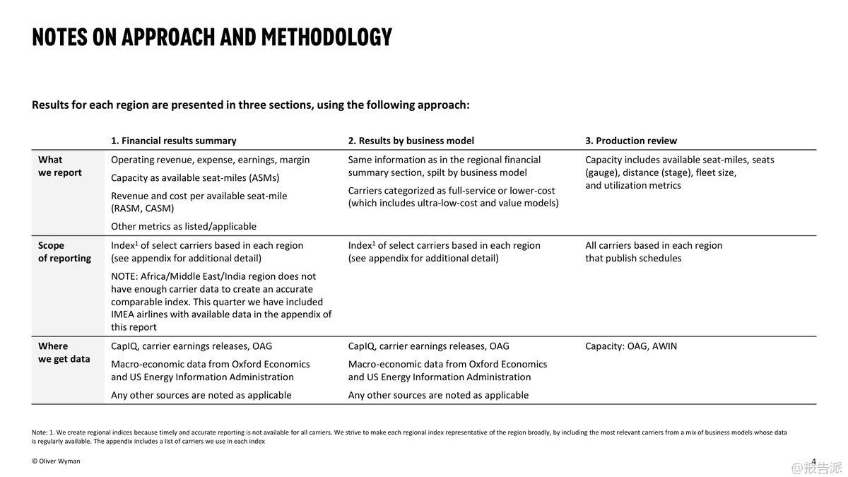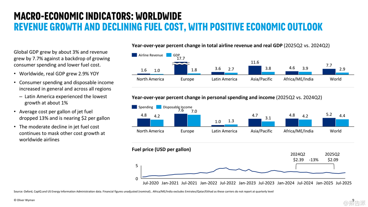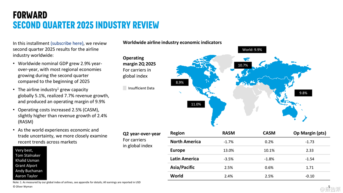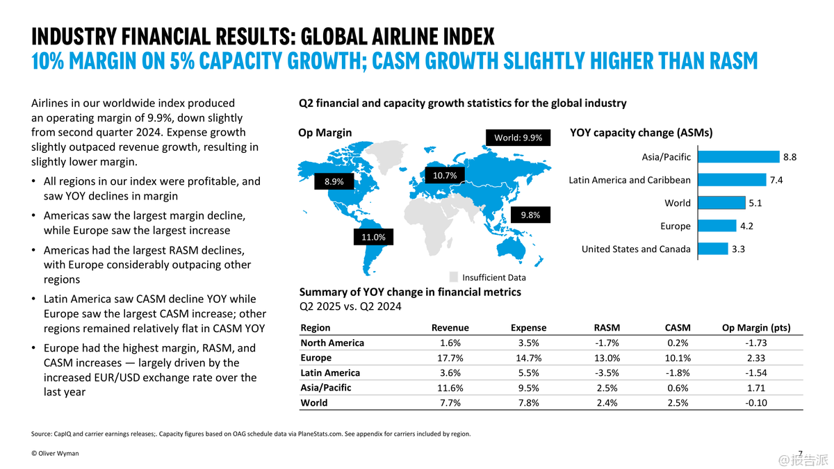 | 2025年第二季度,全球航空业整体保持盈利态势,但增长动力分化明显。 根据奥纬咨询发布的《2025年第二季度航空业利润保持稳定》报告,全球航空公司实现9.9%的运营利润率,较2024年同期略有下降,主要受成本增速略高于收入影响。 全球航空收入同比增长7.7%,运力(可用座位英里,ASM)增长5.1%,单位收入(RASM)增长2.4%,而单位成本(CASM)增长2.5%,导致利润空间小幅收窄。 区域表现差异显著。 欧洲市场成为最大亮点,受益于欧元兑美元汇率上升约9%,推动以美元计价的收入和成本同步大幅上涨,RASM增长13.0%,CASM增长10.1%,最终运营利润率提升2.3个百分点至10.7%,位居全球首位。 相比之下,北美市场面临压力,尽管运力增长3.3%,但需求未能跟上,导致RASM下降1.7%,而CASM微增0.2%,最终运营利润同比下降近15%。 全服务航司(如达美、美联航)表现优于低成本航司,前者利润降幅较小且维持了更高的利润率。 拉丁美洲市场在高运力增长(7.4%)背景下,RASM下降3.5%,但得益于CASM下降1.8%,仍保持11%的较高利润率。 值得注意的是,全服务航司(如LATAM)利润大幅提升,而低成本航司(如Volaris)则出现大幅亏损。 亚太地区表现稳健,运力增长8.8%,RASM增长2.5%,推动利润率提升1.7个百分点至9.8%。 中东、印度及非洲(IMEA)地区整体利润率微降至12.0%,但低成本航司(如IndiGo)凭借11.1%的运力扩张和5.0%的RASM增长,实现了14.3%的利润率,表现亮眼。 报告还特别分析了美国市场的长期趋势。 2024年全年,全服务航司持续引领盈利能力,其国际货运收入强劲增长。 然而,低成本和超低成本航司的传统成本优势正在被侵蚀,尤其是劳动力成本上涨,使得其单位劳动力成本仅比全服务航司低5%,远低于2022年的12%。 同时,燃油价格自2022年峰值回落25.4%,有效抵消了非油成本的普遍上涨。 展望未来,全球经济温和增长(全球名义GDP增长2.9%)和消费支出增加为航空业提供了有利环境,但各区域和不同商业模式间的竞争格局正经历深刻变化,精细化运营和成本管控能力将成为决定航司成败的关键因素。 出品方:奥纬咨询 发布时间:2025年 文档页数:56页