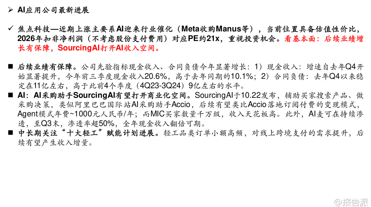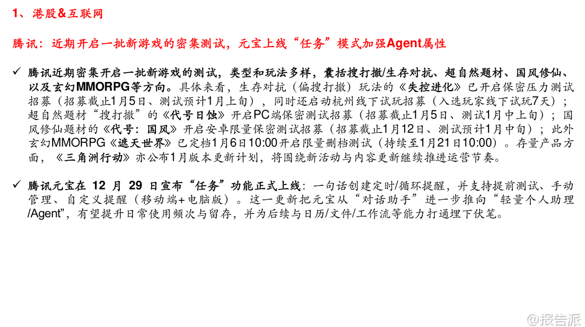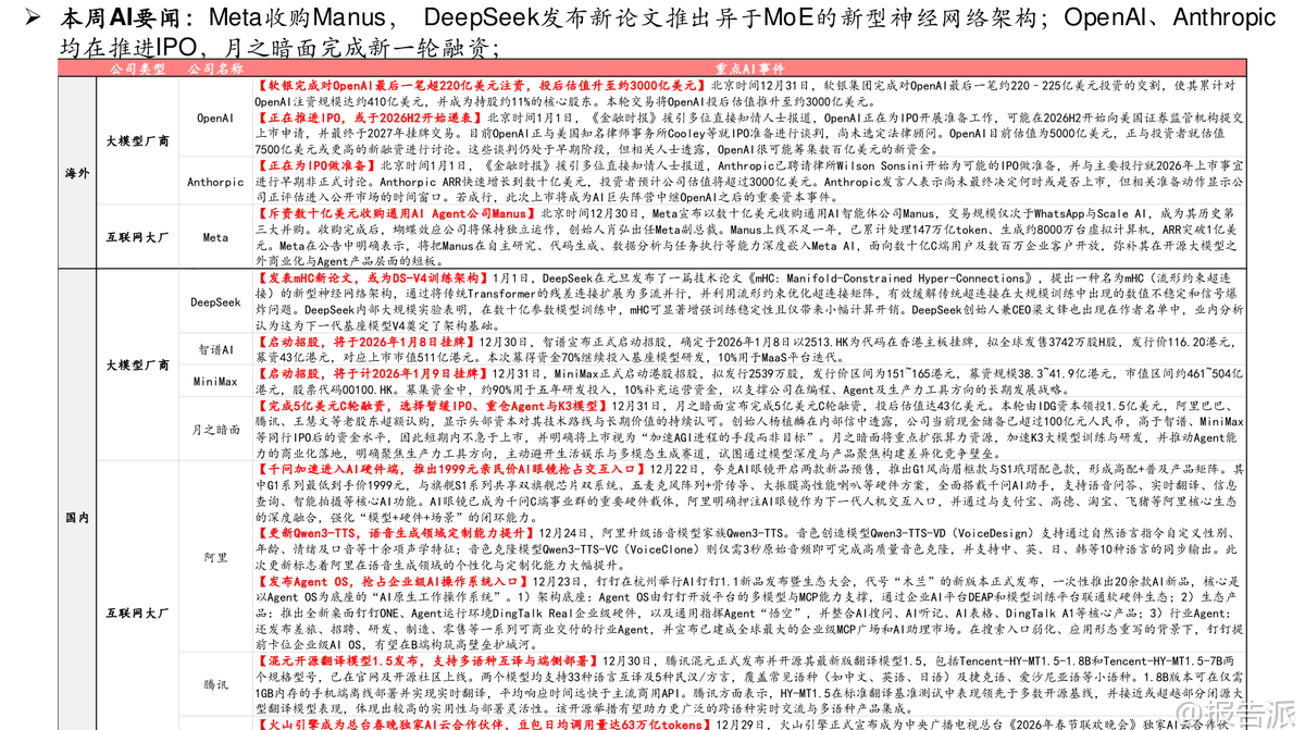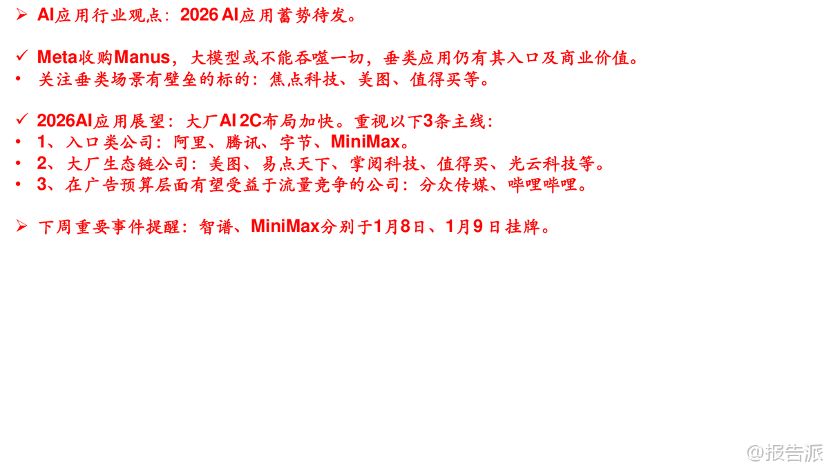 : 本文由【报告派】研读,输出观点仅作为行业分析!原文标题:原文标题:2026-01-04-中信建投-传媒行业周观点:Meta收购Manus,大模型不能“吞噬”一切,重视垂类AI应用价值发布时间:2026年出品方:中信建投 以上截 ...