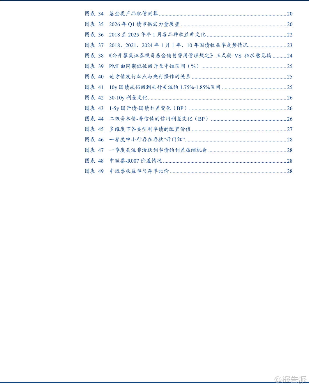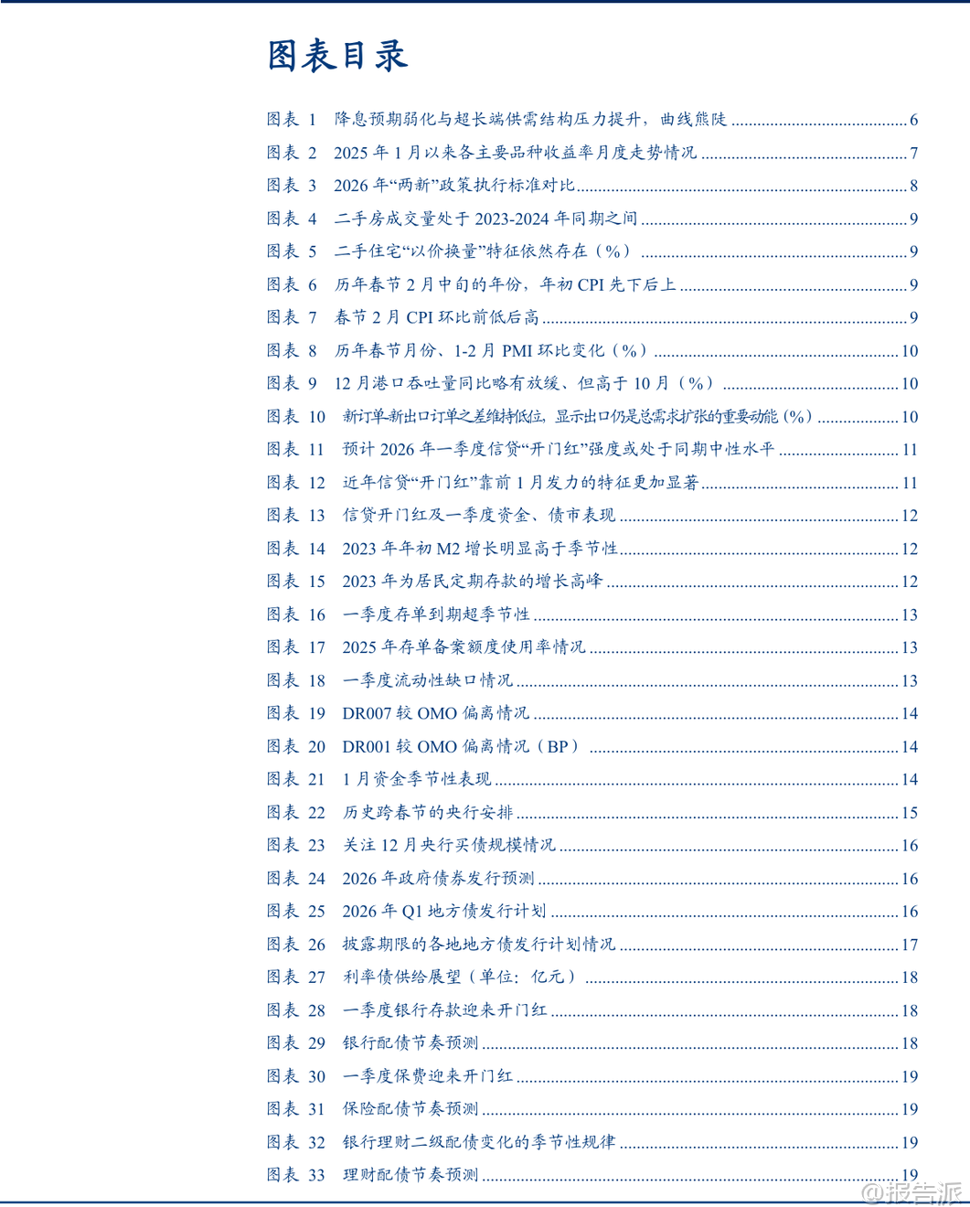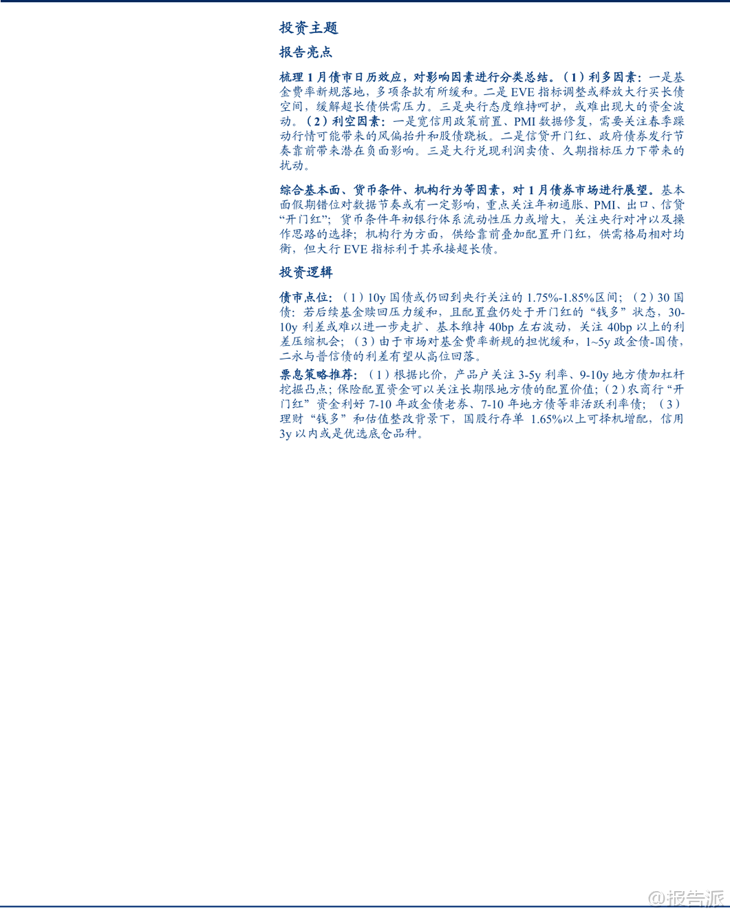 | 2026年开年,华创证券发布《1月:重视全年票息布局——债券月度策略思考》深度报告,全面剖析当前债市运行环境与未来投资方向。 报告指出,在政策靠前发力、货币条件扰动增多、机构行为趋于均衡的背景下,票息策略仍为当前阶段的核心配置逻辑。 基本面方面,2026年“两新”政策(大规模设备更新和消费品以旧换新)落地时点早于去年约一周,但首批资金规模为625亿元,低于2025年同期的810亿元。 若按四批等额下达推算,全年总规模或在2500亿元左右,较2025年有所减弱。 政策更强调资金使用效率,结构上侧重民生领域如老旧小区加装电梯、养老、消防设施等。 地产方面,个人销售住房增值税率由5%下调至3%,叠加中央媒体发文稳定预期,政策着力点在于推动存量房流转,稳定房地产市场。 由于2026年春节在2月中旬,假期错位影响数据节奏,1月将成为经济“开门红”的重点发力窗口,需重点关注年初通胀、PMI、出口及信贷数据。 货币条件层面,年初银行体系流动性压力可能增大。 资产端,受“开门红”驱动,1月信贷投放或更加靠前发力;负债端,2023年高息存款到期可能引发部分资金向非银转移,同时一季度存单到期规模超7万亿元,显著高于往年同期,续发压力值得关注。 央行态度偏“克制”,虽未急于降息,但数量操作积极,年末资金定价宽松,呵护意图明显。 当前流动性平稳,不具备大幅回收基础,且春节时点靠后,1月取现备付压力较小,资金波动预计可控。 历史上春节在2月中旬的年份,央行多通过降准、逆回购等方式对冲流动性缺口,工具丰富,跨春节资金面有望保持稳定。 机构行为显示供需格局相对均衡。 供给端,预计一季度政府债净融资约3.6万亿元,1月和3月为发行高峰。 需求端,配置盘存在“开门红”效应:银行受益于存款利率未行政性调降,保险受益于分红险支撑,配债需求预计好于2025年一季度。 理财在“钱多”和估值整改背景下,配债节奏略好于季节性。 总体看,尽管置换债为主的超长债供给较多,但大行EVE(经济价值变动)指标放松,有利于其承接超长债,供需矛盾弱于2025年同期。 从日历效应看,历年1月债市收益率下行概率较大,呈现“开门红”特征。 当春节在2月中旬时,资金面是主导因素,短端利率波动通常大于长端。 回顾2018、2021、2024年,三年中有两年10年国债收益率小幅上行5BP以内,仅2024年因极度宽松预期而表现强劲。 跨年后资金季节性转松,但需警惕1月中下旬税期及节前资金缺口加大的风险。 债市策略上,费率新规落地缓和了市场情绪,票息策略依然占优。 2025年12月31日发布的《公开募集证券投资基金销售费用管理规定》正式稿较征求意见稿更为温和,特别是对债券型基金赎回费的放宽,缓解了此前市场担忧的赎回压力。 叠加大行EVE考核指标优化、央行呵护资金面等因素,利好债市情绪。 但扰动因素亦存,包括宽信用政策前置、PMI修复带来的春季躁动行情可能引发股债跷板、信贷“开门红”及政府债供给压力、以及大行兑现利润卖债等机构行为。 报告给出明确的行情区间判断:10年期国债收益率或回归央行关注的1.75%-1.85%区间;30-10年国债利差在基金赎回压力缓和、配置盘“钱多”的背景下,难以进一步走扩,预计维持在40bp左右波动,可关注40bp以上时的利差压缩机会。 此外,随着市场对费率新规担忧消退,1~5年政金债-国债、二级资本债与普通信用债的利差有望从高位回落。 具体票息策略推荐如下:产品户可关注3-5年利率债、9-10年地方债加杠杆挖掘凸点;保险资金可关注长期限地方债的配置价值;农商行“开门红”资金利好7-10年政金债老券、7-10年地方债等非活跃利率债;理财在“钱多”和估值整改背景下,国股行存单收益率1.65%以上可择机增配,信用债优选3年以内作为底仓品种。 主要风险提示为:年初资金宽松不及预期,以及宽信用政策扰动超预期。 本文由【报告派】研读,输出观点仅作为行业分析! 原文标题:2026-01-05-华创证券-华创证券-【债券深度报告】1月:重视全年票息布局——债券月度策略思考 发布时间:2026年 出品方:华创证券