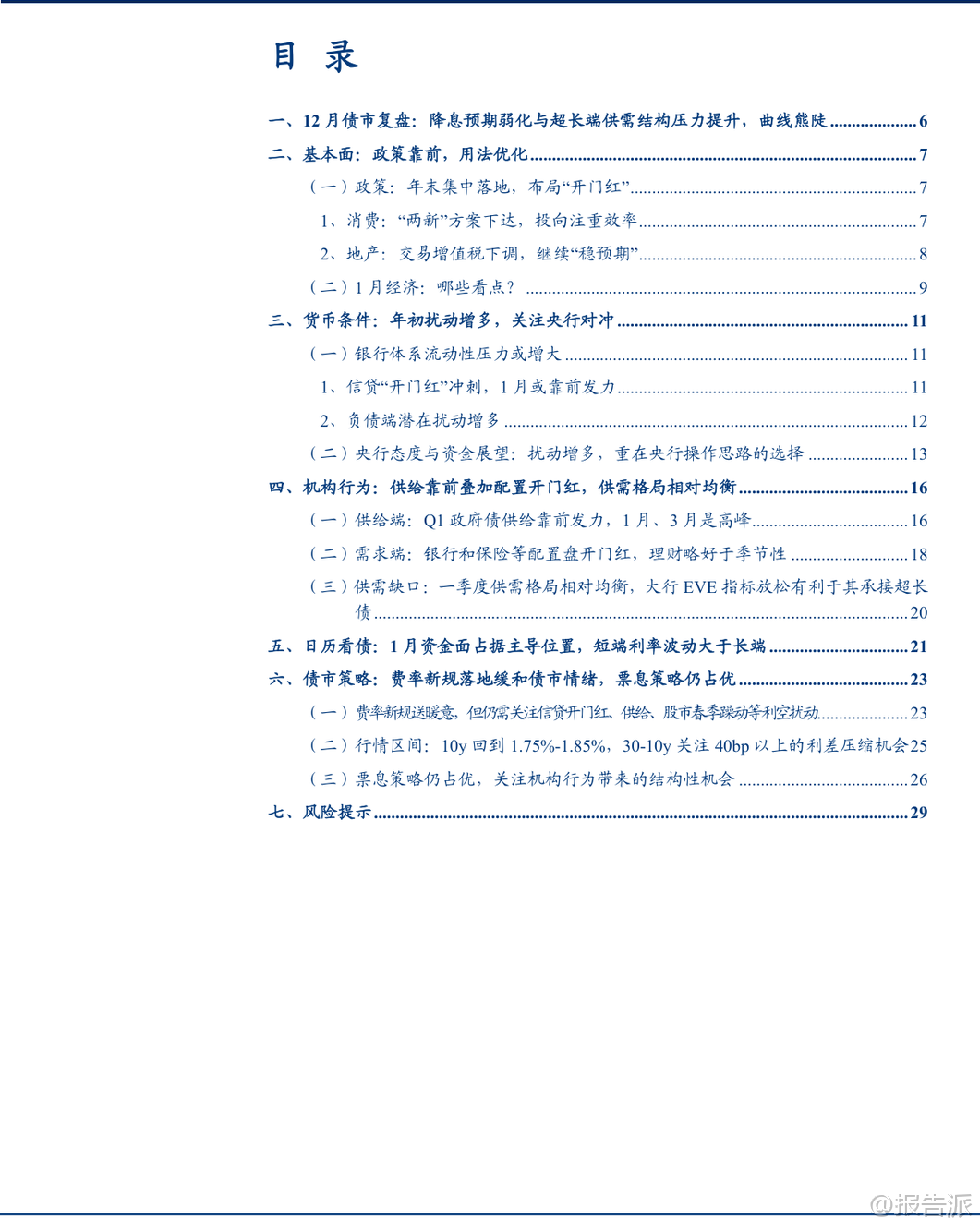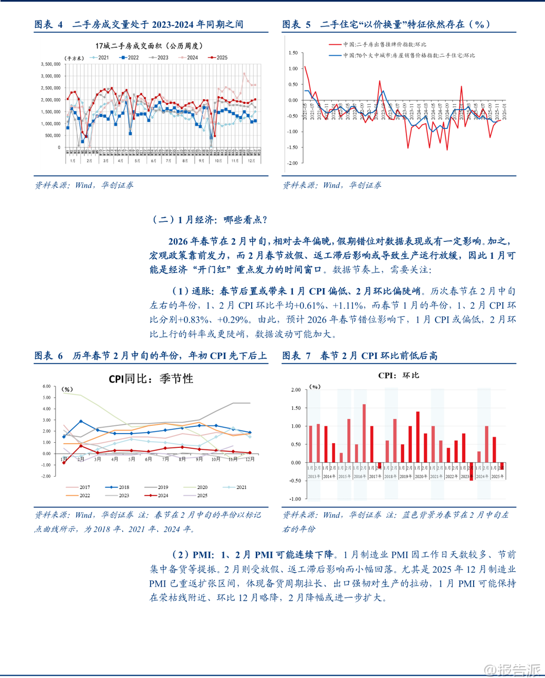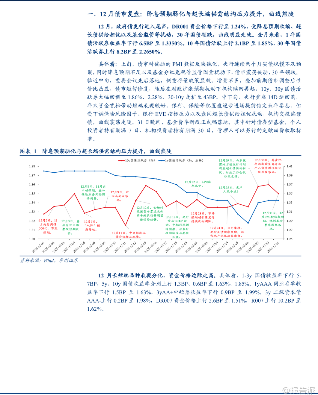 | 2026年开年,华创证券发布《1月:重视全年票息布局——债券月度策略思考》深度报告,全面剖析当前债市运行环境与未来投资方向。 报告指出,在政策靠前发力、货币条件扰动增多、机构行为趋于均衡的背景下,票息策略仍为当前阶段的核心配置逻辑。 基本面方面,2026年“两新”政策(大规模设备更新和消费品以旧换新)落地时点早于去年约一周,但首批资金规模为625亿元,低于2025年同期的810亿元。 若按四批等额下达推算,全年总规模或在2500亿元左右,较2025年有所减弱。 政策更强调资金使用效率,结构上侧重民生领域如老旧小区加装电梯、养老、消防设施等。 地产方面,个人销售住房增值税率由5%下调至3%,叠加中央媒体发文稳定预期,政策着力点在于推动存量房流转,稳定房地产市场。 由于2026年春节在2月中旬,假期错位影响数据节奏,1月将成为经济“开门红”的重点发力窗口,需重点关注年初通胀、PMI、出口及信贷数据。 货币条件层面,年初银行体系流动性压力可能增大。 资产端,受“开门红”驱动,1月信贷投放或更加靠前发力;负债端,2023年高息存款到期可能引发部分资金向非银转移,同时一季度存单到期规模超7万亿元,显著高于往年同期,续发压力值得关注。 央行态度偏“克制”,虽未急于降息,但数量操作积极,年末资金定价宽松,呵护意图明显。 当前流动性平稳,不具备大幅回收基础,且春节时点靠后,1月取现备付压力较小,资金波动预计可控。 历史上春节在2月中旬的年份,央行多通过降准、逆回购等方式对冲流动性缺口,工具丰富,跨春节资金面有望保持稳定。 机构行为显示供需格局相对均衡。 供给端,预计一季度政府债净融资约3.6万亿元,1月和3月为发行高峰。 需求端,配置盘存在“开门红”效应:银行受益于存款利率未行政性调降,保险受益于分红险支撑,配债需求预计好于2025年一季度。 理财在“钱多”和估值整改背景下,配债节奏略好于季节性。 总体看,尽管置换债为主的超长债供给较多,但大行EVE(经济价值变动)指标放松,有利于其承接超长债,供需矛盾弱于2025年同期。 从日历效应看,历年1月债市收益率下行概率较大,呈现“开门红”特征。 当春节在2月中旬时,资金面是主导因素,短端利率波动通常大于长端。 回顾2018、2021、2024年,三年中有两年10年国债收益率小幅上行5BP以内,仅2024年因极度宽松预期而表现强劲。 跨年后资金季节性转松,但需警惕1月中下旬税期及节前资金缺口加大的风险。 债市策略上,费率新规落地缓和了市场情绪,票息策略依然占优。 2025年12月31日发布的《公开募集证券投资基金销售费用管理规定》正式稿较征求意见稿更为温和,特别是对债券型基金赎回费的放宽,缓解了此前市场担忧的赎回压力。 叠加大行EVE考核指标优化、央行呵护资金面等因素,利好债市情绪。 但扰动因素亦存,包括宽信用政策前置、PMI修复带来的春季躁动行情可能引发股债跷板、信贷“开门红”及政府债供给压力、以及大行兑现利润卖债等机构行为。 报告给出明确的行情区间判断:10年期国债收益率或回归央行关注的1.75%-1.85%区间;30-10年国债利差在基金赎回压力缓和、配置盘“钱多”的背景下,难以进一步走扩,预计维持在40bp左右波动,可关注40bp以上时的利差压缩机会。 此外,随着市场对费率新规担忧消退,1~5年政金债-国债、二级资本债与普通信用债的利差有望从高位回落。 具体票息策略推荐如下:产品户可关注3-5年利率债、9-10年地方债加杠杆挖掘凸点;保险资金可关注长期限地方债的配置价值;农商行“开门红”资金利好7-10年政金债老券、7-10年地方债等非活跃利率债;理财在“钱多”和估值整改背景下,国股行存单收益率1.65%以上可择机增配,信用债优选3年以内作为底仓品种。 主要风险提示为:年初资金宽松不及预期,以及宽信用政策扰动超预期。 本文由【报告派】研读,输出观点仅作为行业分析! 原文标题:2026-01-05-华创证券-华创证券-【债券深度报告】1月:重视全年票息布局——债券月度策略思考 发布时间:2026年 出品方:华创证券