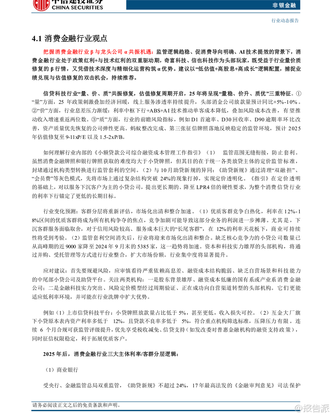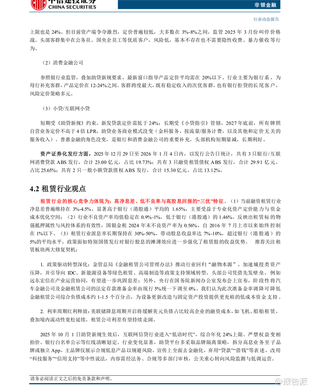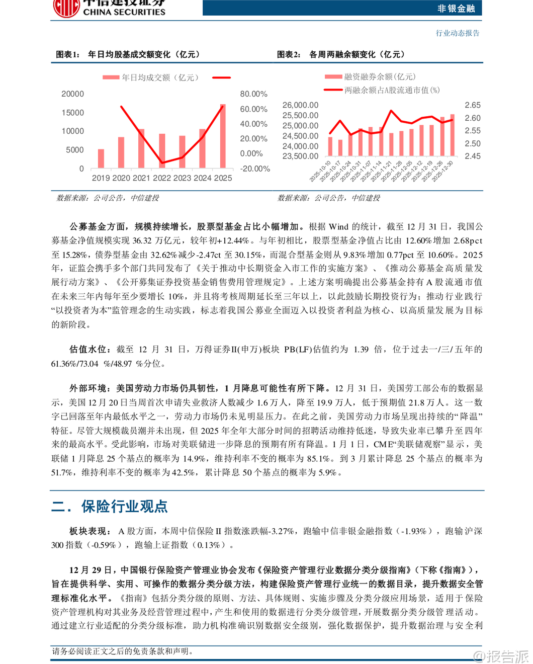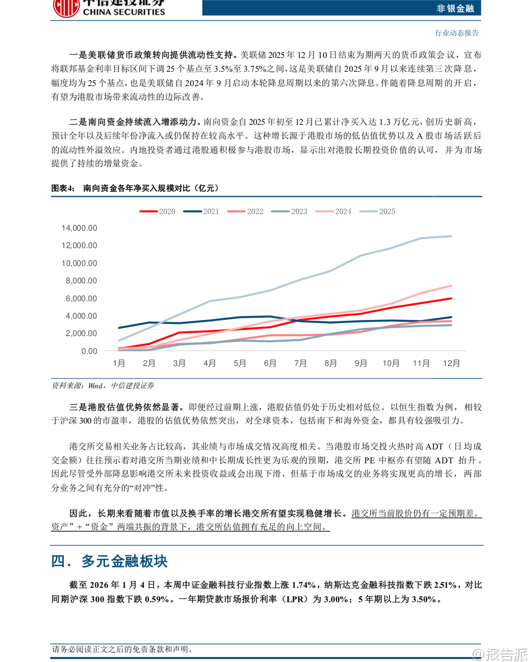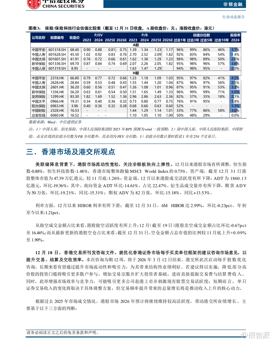 | 2026年初,中信建投发布《非银金融行业:非银开年迎新气象》研究报告,全面展望证券、保险、香港市场及多元金融板块的发展趋势与投资机会。 报告指出,在政策红利、技术进步和市场情绪回暖的多重驱动下,非银金融行业有望迎来估值修复与业绩增长的“戴维斯双击”。 在证券行业方面,2025年全年股票日均成交额达1.73万亿元,同比增长62.69%,市场交投活跃度显著提升。 两融余额突破2.5万亿元,创十年新高,反映出投资者风险偏好回升。 IPO融资规模同比增长97.4%,再融资同比大增260.61%,资本市场服务实体经济能力持续增强。 尽管基本面改善明显,但券商板块估值仍处于历史低位,截至2025年末PB仅为1.39倍,显著低于ROE水平对应的合理区间,存在较大修复空间。 展望2026年,“服务新质生产力”、“中长期资金入市”和“券商国际化”三大逻辑将逐步兑现,推动行业重新定价。 重点推荐中金公司(国际业务领先、并购整合预期强)和东方证券(大资管复苏、受益上海金融中心建设)。 保险板块的核心逻辑在于利率企稳带来的估值修复。 2025年底10年期国债收益率回升至1.85%左右,缓解了此前因长端利率下行对险企投资收益预期的压制。 当前上市险企2026年P/EV普遍处于历史低位,平安、太保等龙头估值修复潜力较大。 负债端方面,2026年“开门红”有望超预期,主要得益于储蓄险相对吸引力提升、分红险接受度改善以及“报行合一”政策下银保渠道价值率优化。 财险领域,非车险“报行合一”推进有望带动承保利润较快增长。 整体看,保险板块兼具业绩支撑与估值弹性,推荐中国平安、中国太保、中国人寿、新华保险及中国财险。 港股及港交所方面,美联储开启降息周期为港股提供流动性支持,南向资金2025年净买入达1.3万亿港元,创下历史新高。 尽管12月市场有所调整,但港股整体估值仍具优势,恒生指数市盈率相较A股具备明显折价。 港交所作为核心受益标的,其交易、结算收入与市场活跃度高度相关。 随着每手股数优化等制度改革推进,长期有望提升市场效率与吸引力,带动交易量和衍生品业务增长。 在“资产+资金”两端共振背景下,港交所估值具备向上空间。 多元金融板块呈现结构性机遇。 消费金融行业进入“政策红利+技术红利”双轮驱动期,监管环境趋稳,AI技术提升风控与运营效率。 信贷科技行业正经历“量稳、价升、质优”的修复周期,头部平台凭借数据与模型优势构筑护城河。 小贷行业面临整合出清,优质持牌机构将受益于行业集中度提升。 租赁行业则展现出“高息差、低不良、高股息”的三优特征,净息差普遍维持在3%-4.5%,不良率低于1%,股息率可达7%-10%。 政策推动金融租赁回归“融物本源”,向绿色能源、高端制造转型,叠加美元降息降低外币负债成本,行业盈利韧性凸显。 推荐国银金租、远东宏信、江苏金租等优质标的。 报告同时提示了三大风险:一是市场价格波动的不确定性;二是企业盈利预测存在偏差;三是技术更新迭代带来的投入压力。 总体而言,中信建投维持非银金融行业“强于大市”评级,认为在宏观环境改善、政策持续发力和技术赋能的背景下,非银板块有望在2026年迎来新一轮景气周期,建议重点关注具备核心竞争力与估值弹性的龙头企业。 本文由【报告派】研读,输出观点仅作为行业分析! 原文标题:原文标题:2026-01-05-中信建投-非银金融行业:非银开年迎新气象 发布时间:2026年 报告出品方:中信建投 文档页数:29页