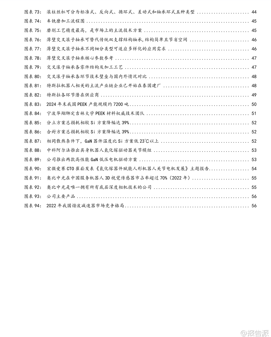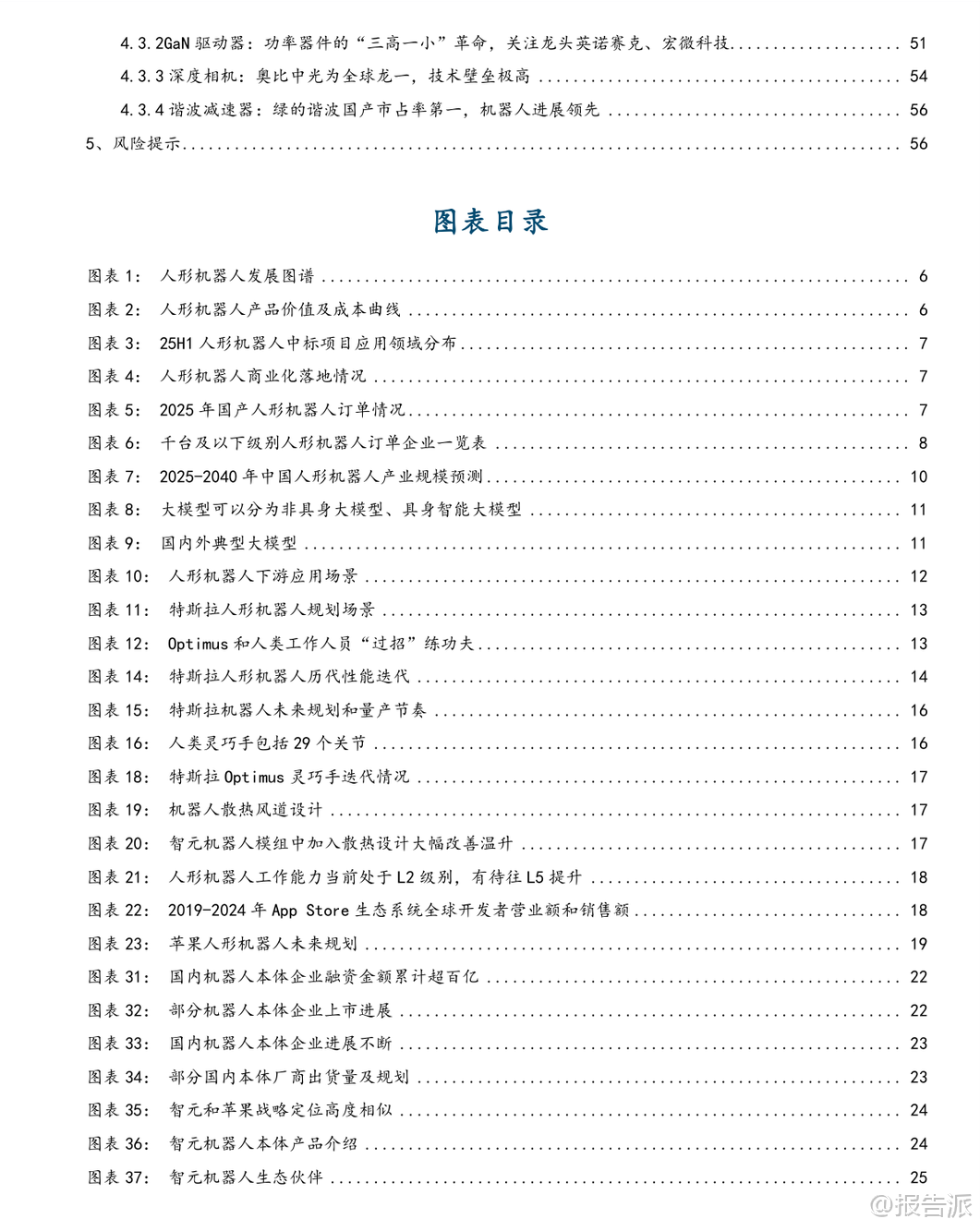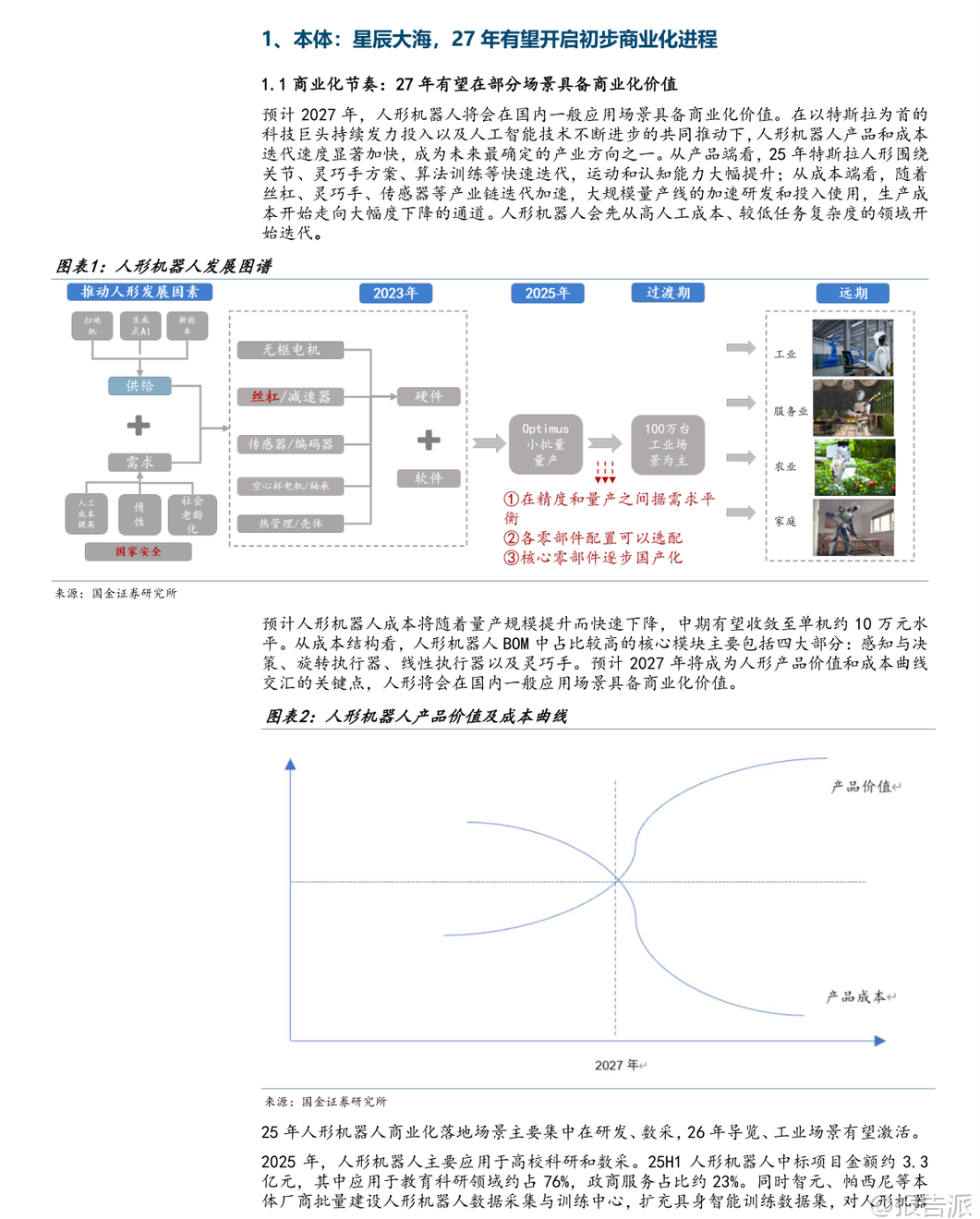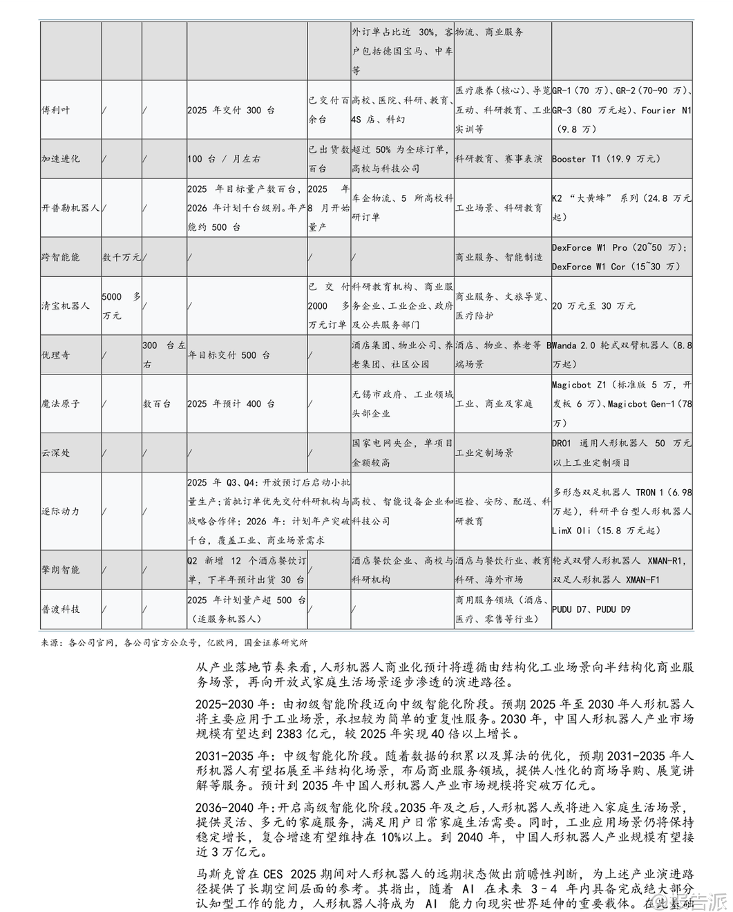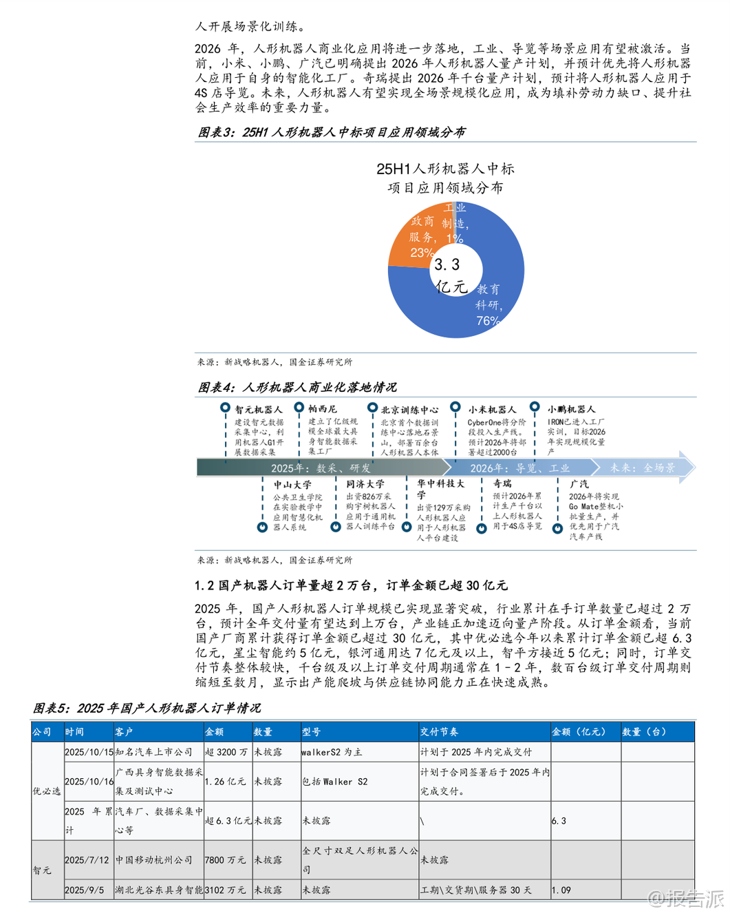 | 2026年被视为人形机器人产业从“0到1”迈向商业化落地的关键节点。 根据国金证券发布的《机器人行业2026年度策略》报告,全球人形机器人正处在技术突破与量产加速的交汇期,特斯拉引领海外进展,国内企业则在商业化与技术迭代并行推进中迎来上市潮和规模化放量前夜。 本体方面,特斯拉Optimus已进入量产倒计时,预计2026年Q1发布第一代产品,H2开启大规模量产。 其硬件方案趋于收敛,核心挑战转向“机器人大脑”的算法智能化升级。 与此同时,国产厂商如优必选、智元、宇树等头部企业出货量有望从数千台跃升至数万台,应用场景逐步从科研、导览向工业制造拓展。 特别是上肢灵巧手能力的成熟,将成为推动渗透率提升的重要驱动力。 技术路径上,当前人形机器人的“肢体”硬件发展领先于软件算法,尤其是运动控制能力已有显著进步,但认知决策层面仍依赖大模型训练架构的持续优化。 2026年,随着具身智能大模型(如谷歌RT-2、英伟达GROOT、阿里通义)的演进,机器人的任务级交互、环境感知与自主规划能力有望实现突破,真正激活大规模产业化。 海外市场以特斯拉为绝对领跑者,其软硬件协同迭代节奏清晰,已具备跨入商业化的先发优势。 一旦第三代机器人表现超预期,苹果、OpenAI、英伟达等科技巨头或将加速下场布局。 其中,苹果可能复刻App Store生态逻辑,打造开放平台;英伟达聚焦算力与基础模型赋能,推出GR00T系列通用机器人大脑;而OpenAI虽尚未自研整机,但已通过投资Figure、1X等方式深度绑定本体企业,未来具备直接切入硬件的可能性。 国内市场呈现百花齐放格局。 投融资活跃,截至2025年累计融资超百亿,智元、宇树、银河通用等企业快速成长。 量产节奏明确:优必选规划2026年交付数千台,智元目标数万台。 更值得关注的是,宇树、乐聚、优必选等头部本体企业陆续启动IPO进程,预示着新一轮产业化浪潮即将开启。 供应链是支撑行业跨越的核心支柱。 目前特斯拉链已迭代四年,硬件供应链趋于收敛,进入SOP(中试)向MP(量产)切换的关键拐点。 投资机会主要集中在五大方向:一是特斯拉产业链确定性标的,如拓普集团、三花智控、蓝思科技等;二是新技术迭代领域,包括新型电驱动(谐波磁场电机、GaN控制器)、电子手套、丝杠新工艺(冷锻、以车代磨)、高端轴承(薄壁交叉滚子)及外壳材料(PEEK、电子皮肤);三是北美其他巨头供应链机会,关注兆威机电、银轮股份等;四是国内本体及垂类应用链,如亿嘉和、翔楼新材等;五是长期格局优质的环节,如奥比中光(深度相机)、宁波华翔(PEEK材料)等。 具体来看,电驱动系统正经历“三高一小”革命——高频、高效、高功率密度与小型化,GaN器件因其低损耗、快响应特性成为下一代关节驱动的核心方向,单台机器人GaN用量可达数百颗。 灵巧手方面,特斯拉展示GEN2.5电子手套,由指尖传感升级为全手覆盖,自由度增至22个,并采用仿生腱绳驱动减轻手部重量。 丝杠与轴承作为线性执行器关键部件,正通过新材料(陶瓷)、新结构(行星滚柱)与新工艺(冷锻)提升性能与降本空间。 而PEEK等轻量化材料的应用,则推动“以塑代钢”趋势加速。 长远看,人形机器人将遵循“工业→商业→家庭”的演进路径。 2027年有望在国内一般场景具备商业化价值,成本收敛至约10万元水平。 马斯克预测远期人形机器人与人类数量比达3:1~5:1,对应全球保有量200~300亿台,市场空间极为广阔。 尽管面临竞争加剧、技术迭代不及预期、量产进度延迟等风险,但在全球“军备竞赛”背景下,2026年将是验证产业成色的关键一年,坚守核心供应链、把握技术收敛与格局优化的投资主线尤为重要。 本文由【报告派】研读,输出观点仅作为行业分析! 原文标题:原文标题:2026-01-04-国金证券-国金证券-机器人行业2026年度策略:行业跨越0-1,坚守核心供应链 发布时间:2026年 报告出品方:国金证券 文档页数:57页