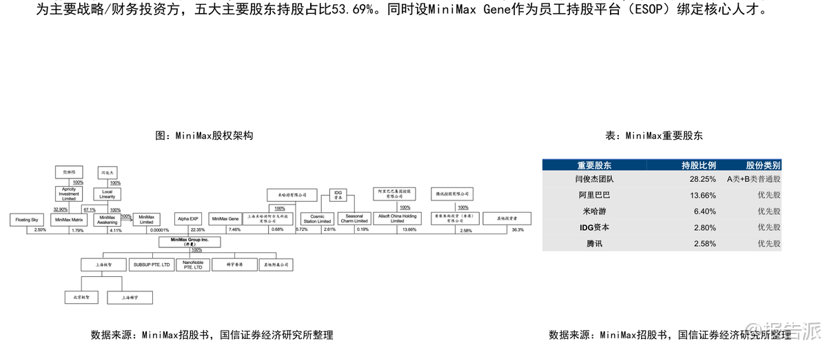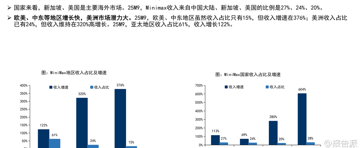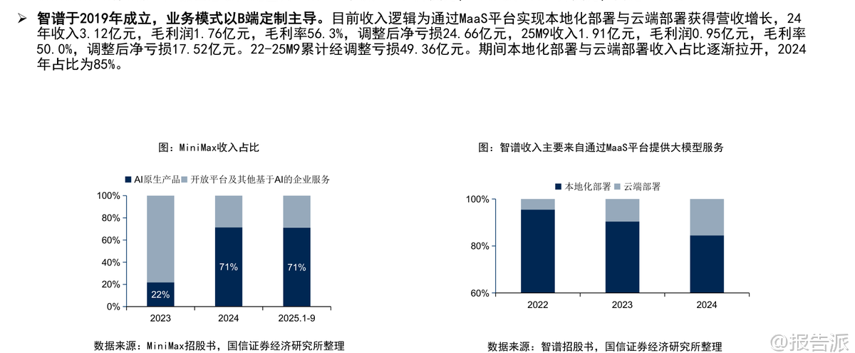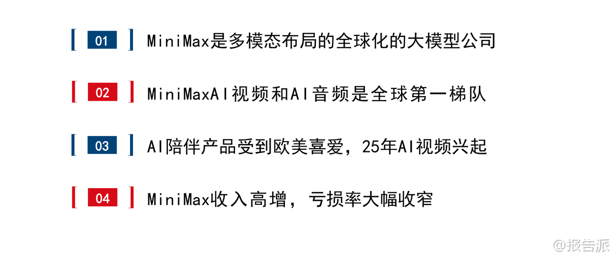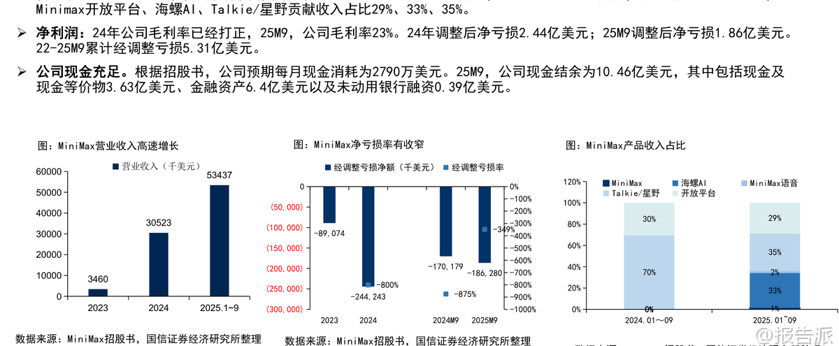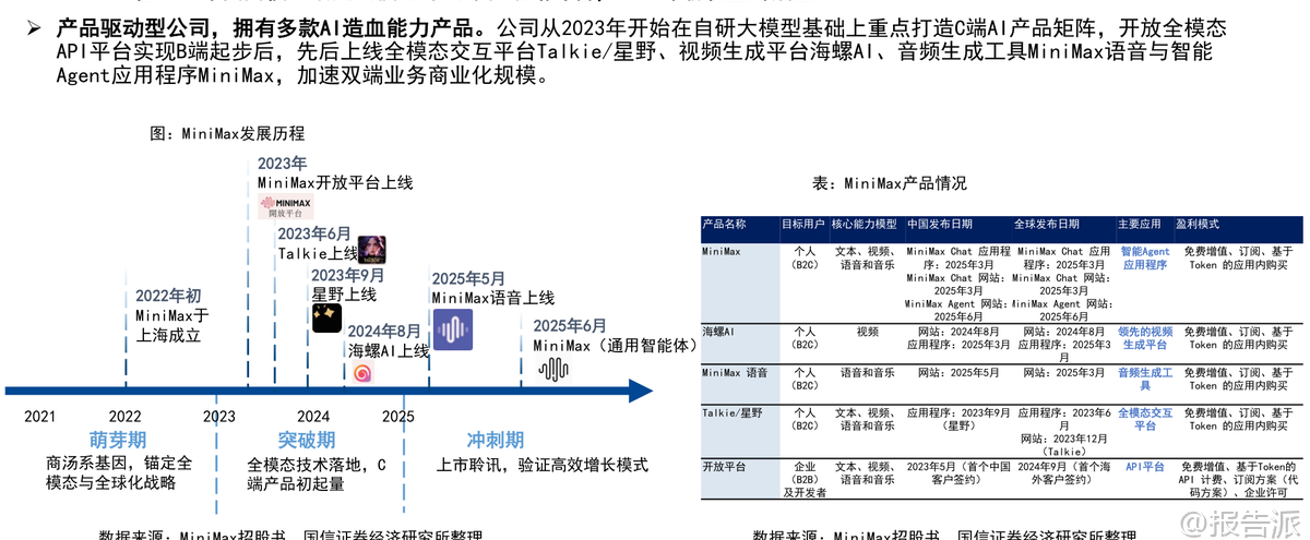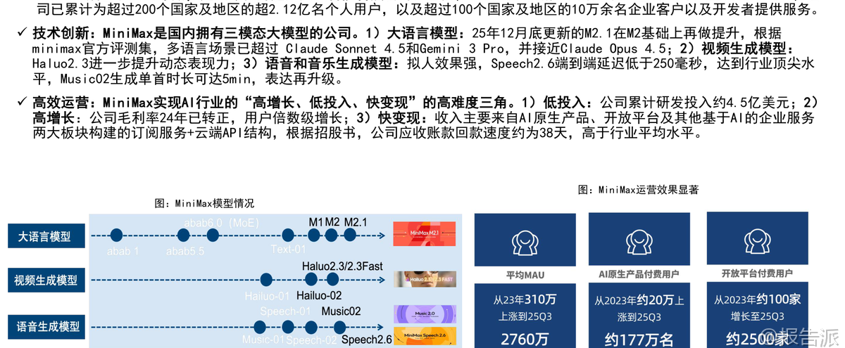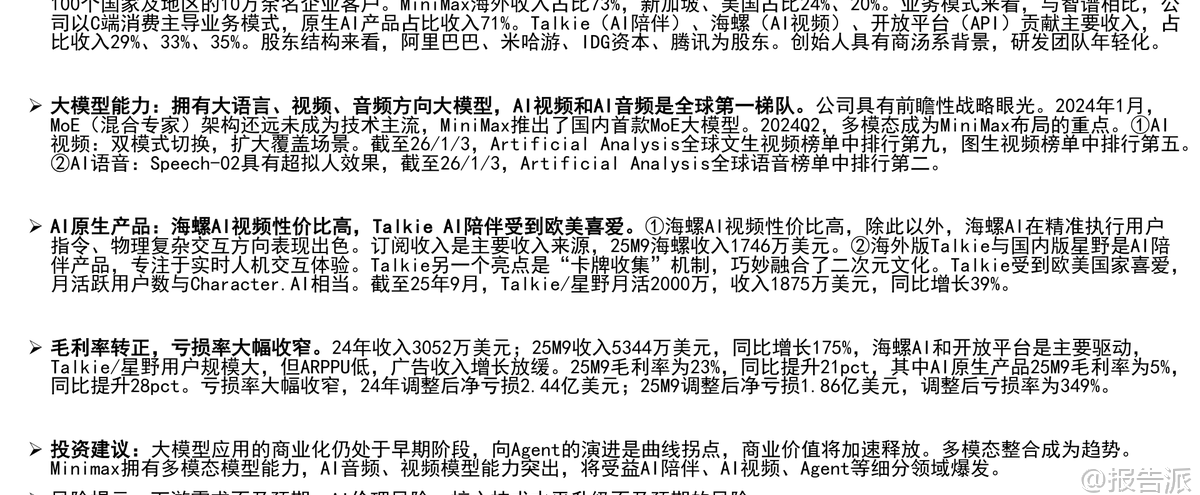 | Minimax是一家成立于2021年底的全球化通用人工智能科技公司,凭借技术创新、高效运营与全球化布局三大核心优势,迅速成长为全球领先的多模态大模型企业。 截至2026年初,公司已服务超过200个国家和地区的超2.12亿个人用户,以及100多个国家和地区的10万余家企业客户与开发者,海外收入占比高达73%,其中新加坡和美国分别占24%和20%,展现出强劲的国际化能力。 在技术层面,Minimax是国内少数同时具备大语言、视频、音频三大模态大模型能力的公司,且在AI视频与AI语音领域处于全球第一梯队。 早在2024年1月,当MoE(混合专家)架构尚未成为主流时,Minimax便推出国内首款MoE大模型abab 6,展现了其前瞻性战略眼光。 其最新发布的M2.1大语言模型,在多语言场景下性能已接近Claude Opus 4.5,并登上OpenRouter LLM Leaderboard全球前二。 视频生成模型“海螺AI”Ha luo 2.3支持768P/1080P高清输出,首创双模式切换——标准版追求极致画质,Fast版则提速3倍、成本降低60%,适配电商广告、短视频等高频批量场景。 截至2026年1月3日,在Artificial Analysis榜单中,海螺AI位列全球文生视频第九、图生视频第五。 语音模型Speech-02端到端延迟低至250毫秒,拟人效果极强,支持30秒音色复刻和40余种语言无缝切换,在全球语音榜单中排名第二。 Minimax以C端消费主导业务模式,AI原生产品贡献总收入的71%。 主要产品包括AI陪伴平台Talkie/星野、AI视频平台海螺AI、AI语音工具MiniMax语音及开放平台API服务。 其中,海螺AI与开放平台是增长核心驱动力。 2025年前9个月,公司营收达5.34亿美元,同比增长175%;毛利率转正至23%,同比提升21个百分点,亏损率大幅收窄。 Talkie/星野作为主打实时人机交互的AI陪伴产品,凭借深度角色设定、情绪记忆和“卡牌收集”机制,在欧美市场广受欢迎,月活跃用户达2000万,与Character.AI相当。 2025年9月,该产品收入达1875万美元,同比增长39%。 海螺AI则以高性价比著称,每秒生成成本仅0.1元人民币,远低于竞品,2025年9月收入达1746万美元,付费率达5.5%。 开放平台面向企业客户,提供全模态API服务,2025年9月收入1542万美元,同比增长160%,单客户收入显著提升。 公司采用“极简高效”的组织架构,CEO之下最多三层管理,研发团队平均年龄不足30岁,累计研发投入约4.5亿美元,却实现高增长、快变现。 应收账款回款周期仅38天,远高于行业平均水平。 股东结构方面,创始人闫俊杰团队持股28.25%,阿里巴巴为第一大外部机构股东,米哈游、IDG资本、腾讯亦为重要战略投资者。 公司现金储备充足,2025年9月现金结余达10.46亿美元。 从行业趋势看,全球大模型市场正处于从L3(Agent阶段)向更高层级演进的关键期,预计2024年至2029年市场规模将从107亿美元扩张至2065亿美元,复合增长率达84%。 多模态整合已成为主流趋势,GPT-4o的图像生成能力升级即引发订阅激增。 在此背景下,Minimax凭借全栈多模态能力和Agent专项优化,有望持续受益于AI陪伴、AI视频、智能体等细分领域的爆发式增长。 风险方面需关注下游需求不及预期、AI伦理问题及技术迭代速度等挑战。 总体来看,Minimax作为中国唯一跻身全球前十的pure play大模型公司,已在商业化路径上走出独特而高效的模式,未来成长空间广阔。 本文由【报告派】研读,输出观点仅作为行业分析! 原文标题:原文标题:2026-01-05-国信证券-国信证券-互联网行业垂类AI应用专题:Minimax是全球化大模型公司,拥有大语言、视频、音频大模型 发布时间:2026年 出品方:国信证券 文档页数:32页