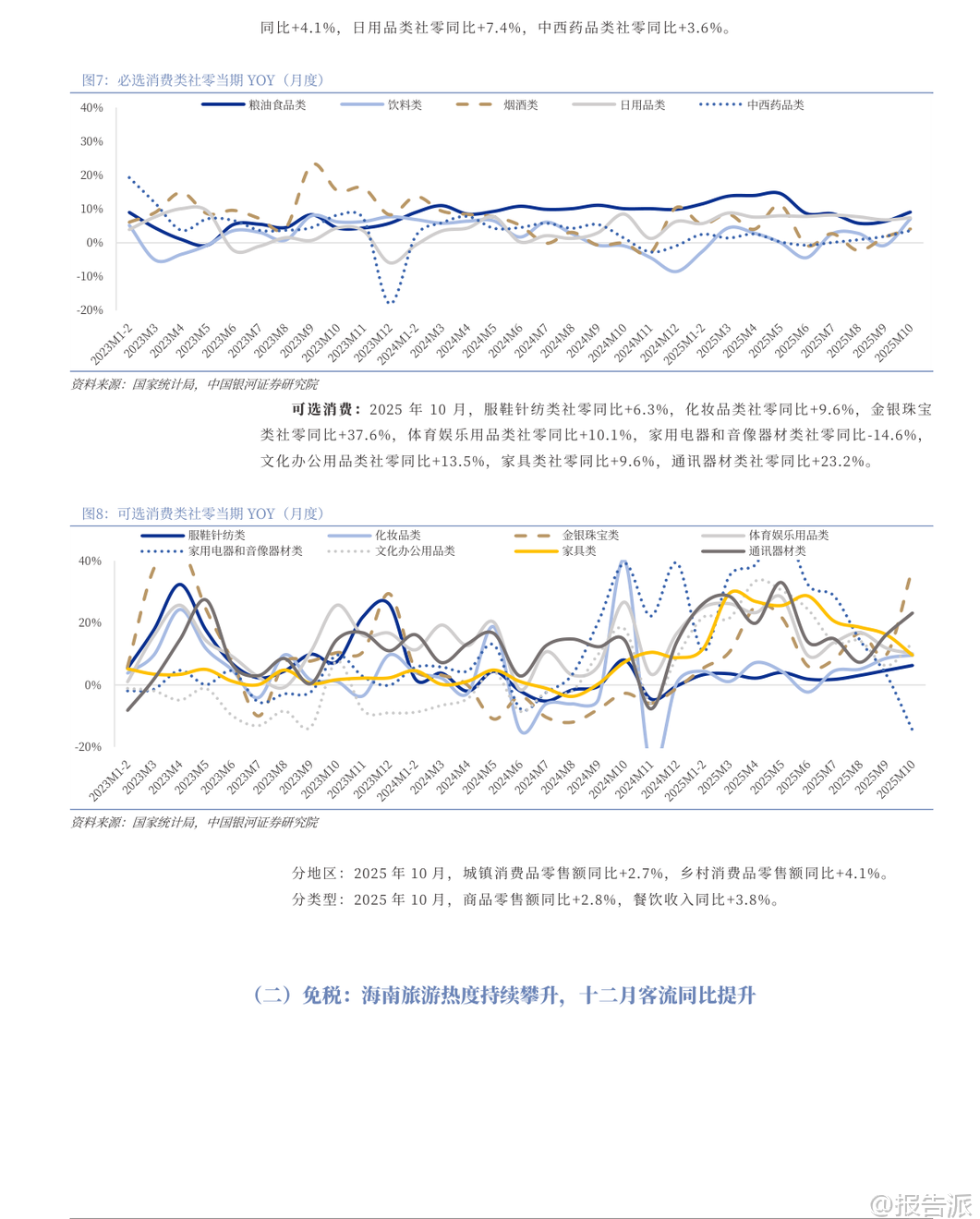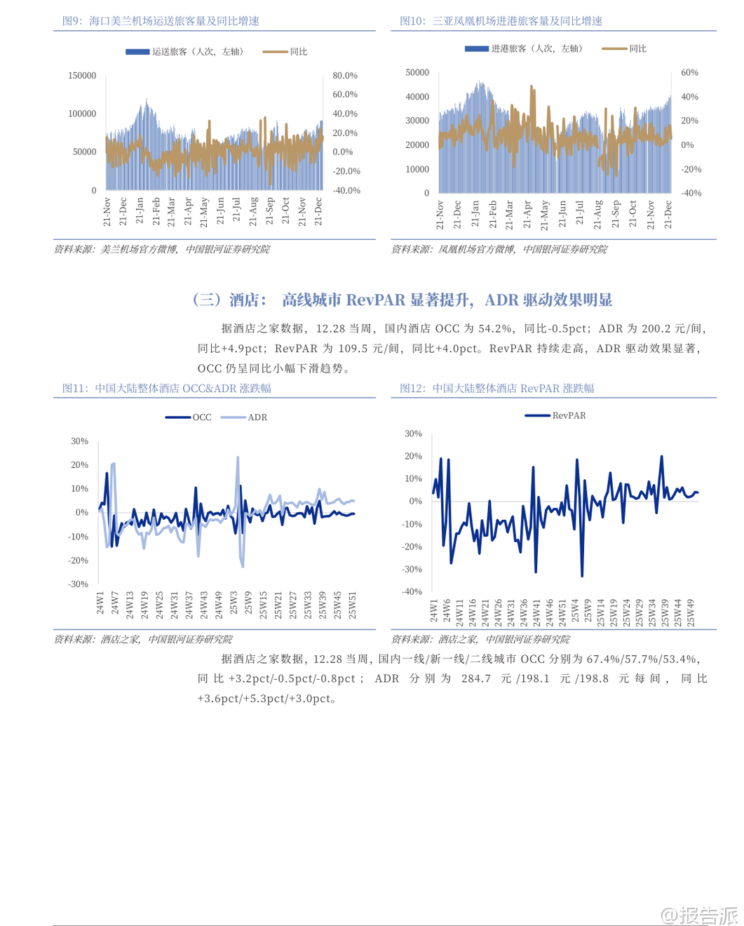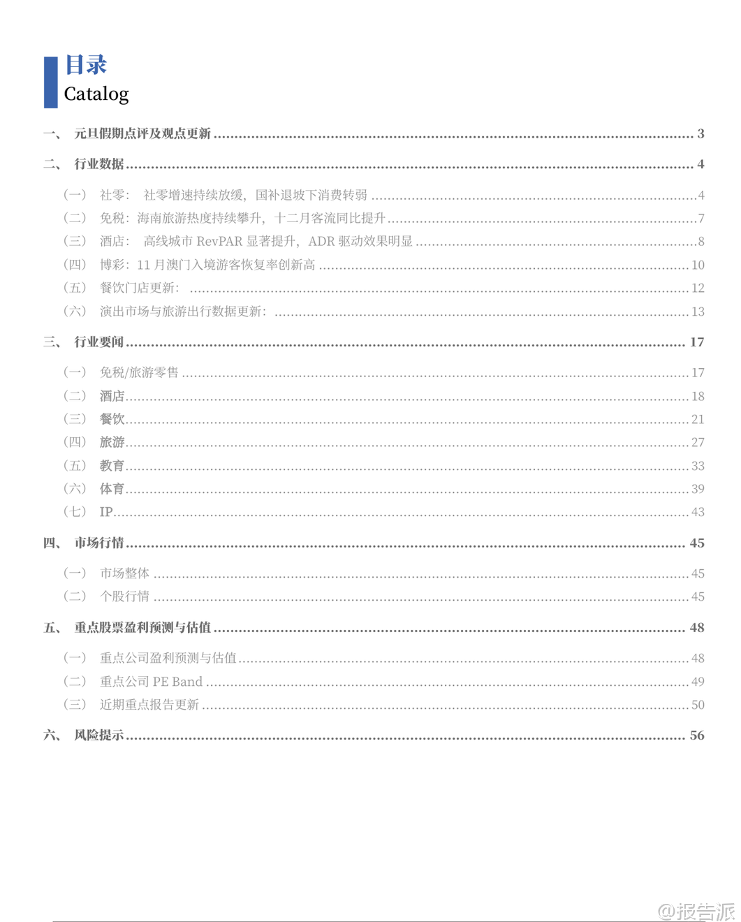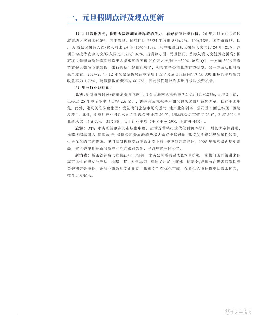 | 2026年初,银河证券发布《社会服务行业1月投资前瞻》报告,围绕元旦假期消费数据、细分板块动态及市场趋势,全面剖析了当前社会服务行业的运行态势与未来投资机会。 整体来看,尽管12月社服行业指数微跌0.57%,但酒店餐饮板块逆势上涨1.62%,显示出结构性复苏的积极信号。 核心观点认为,随着春节假期天数创历史新高,叠加出行需求释放,社会服务行业有望迎来“旺季更旺”的行情。 从元旦假期数据看,消费活力显著释放。 2026年元旦期间,全社会跨区域流动人次同比增长20%,其中铁路和民航分别增长53%和10%,显示居民出行意愿强劲。 国内旅游方面,四川A级景区接待人次和收入同比分别增长16%和10%,深圳日均旅游人次和收入增幅达32%和36%。 出境游同样火爆,澳门、香港入境人次创历史新高,国家移民管理局预计假期日均出入境旅客突破210万人次,同比增长22%。 这些数据不仅印证了短期消费需求的强劲反弹,也为春节黄金周的业绩表现提供了有力支撑。 在细分行业中,免税板块成为最大亮点。 海南离岛免税销售持续升温,元旦前三天销售额达7.1亿元,同比增长129%,日均销售额接近2025年春节水平。 中国中免连续中标上海、北京机场免税项目,进一步巩固其在国内免税市场的龙头地位。 此外,珠免集团因剥离地产业务实现基本面反转,估值具备吸引力,也被列为关注标的。 报告指出,海南自贸港封关运作后政策红利持续释放,高端消费景气上行,为免税行业提供长期增长动力。 旅游板块则呈现分化格局。 OTA平台受益于行业集中度提升和运营效率优化,携程集团-S和同程旅行被重点推荐。 景区类企业受消费模式迁移影响较大,建议关注具备银发经济属性和供给优化潜力的三峡旅游。 澳门博彩业受益于非博彩元素增强和高端客群回流,2025年游客量创新高,银河娱乐、金沙中国等拥有新增产能的企业更具成长空间。 新消费领域同样值得关注。 新茶饮与居民出行高度相关,古茗、蜜雪集团凭借密集门店网络和场景扩张能力被推荐,沪上阿姨作为潜在标的受到关注。 演唱会和音乐节市场在假期延长背景下供需两旺,叠加“限韩令”可能松动带来的优质内容供给增加,大麦娱乐成为重点推荐标的。 数据显示,2025年12月演出票房同比增长94.9%,观演人次增长74.2%,虽环比略有回落,但仍保持强劲韧性。 从业绩层面看,部分龙头企业已显现出复苏迹象。 酒店行业RevPAR(每间可出租客房收入)持续走高,尤其一线和新一线城市ADR(平均每日房价)驱动明显,反映出高线城市商务和旅游需求回暖。 12月最后一周,全国酒店整体RevPAR同比增长4.0%,其中豪华型酒店ADR同比提升。 华住、锦江等头部连锁品牌加速扩张,锦江国际拟发行酒店类公募REITs,标志着行业资产证券化迈出关键一步,有助于盘活存量资产、提升资本效率。 风险方面,报告提示需关注行业竞争加剧、宏观经济下行以及政策不确定性带来的影响。 特别是教育板块受政策调控影响明显,12月下跌2.39%,拖累社服整体表现。 但从历史规律看,过去12年中有8年春节后15个交易日内旅游板块跑赢沪深300指数,平均相对收益率达1.72%,表明节后存在较强的主题性投资机会。 综合来看,银河证券维持对社会服务行业的“推荐”评级,强调应聚焦高景气出行链标的。 短期看,春节超长假期将极大刺激出行消费;中期看,消费升级趋势未变,免税、OTA、演艺等赛道龙头公司具备较强盈利修复弹性;长期看,随着文旅融合深化、IP衍生拓展以及国际化布局推进,社会服务行业有望走出疫情阴霾,进入新一轮增长周期。 投资者可重点关注中国中免、携程集团-S、古茗、大麦娱乐等具备竞争优势和成长潜力的核心资产。 本文由【报告派】研读,输出观点仅作为行业分析! 原文标题:原文标题:银河证券-社会服务行业1月投资前瞻:旺季更旺,1月布局高景气出行链标的 发布时间:2026年 报告出品方:银河证券 文档页数:49页