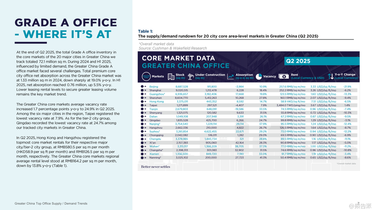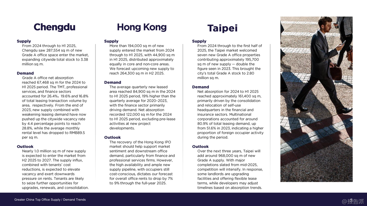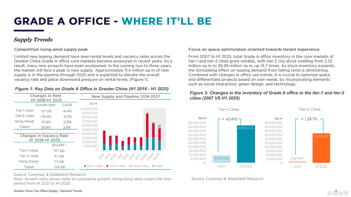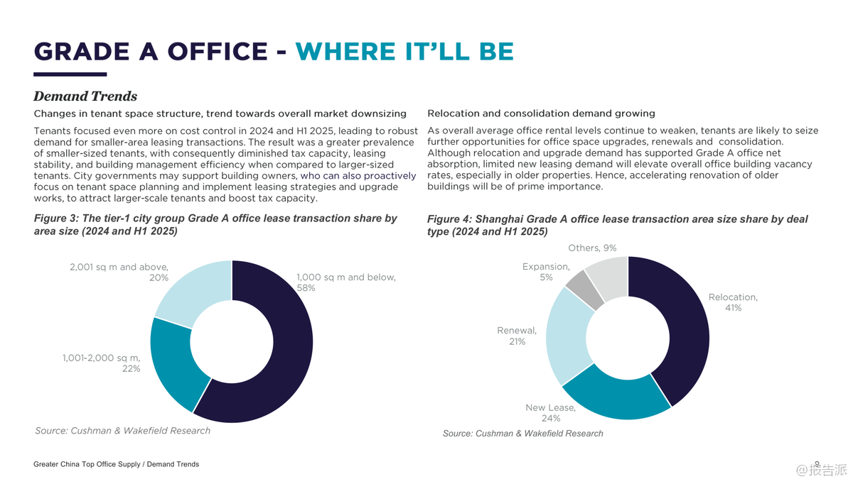 | 近期,仲量联行发布了《2025年大中华区零售物业供应需求核心趋势报告》,尽管标题提及“零售物业”,但实际内容聚焦于大中华区甲级办公楼市场的供需格局演变。 该报告通过详实的数据分析,揭示了当前办公楼市场在供应压力加剧、需求结构转型背景下的区域分化与行业轮动特征。 从整体供应端来看,大中华区主要城市,尤其是一线城市,仍面临较大的新增供应压力。 数据显示,截至2025年上半年,多个核心城市的甲级办公楼库存持续攀升,部分区域已出现供过于求的局面。 这种供应过剩的压力,叠加宏观经济环境的影响,导致空置率维持在较高水平,对租金形成持续压制。 报告特别指出,过去一年半以来,市场新增供应集中释放,而需求复苏相对缓慢,供需错配成为当前市场的主要矛盾。 在需求侧,企业租赁行为呈现出显著的结构性变化。 传统金融、专业服务等行业的租赁需求依然稳健,但在科技、媒体和通信(TMT)领域,扩张步伐有所放缓。 与此同时,企业更加注重成本控制和空间利用效率,灵活办公、降本搬迁等策略被广泛采用。 报告中的交易数据显示,2024年至2025年上半年,一线城市甲级办公楼租赁交易中,扩租占比下降,而续租和搬迁占比上升,反映出企业在不确定环境下更倾向于优化现有布局而非盲目扩张。 从城市维度看,上海作为核心枢纽,其办公楼市场表现具有代表性。 报告通过细分租赁交易类型发现,企业选址正从传统的中央商务区向非核心区或次级商圈转移,以寻求更具性价比的空间解决方案。 例如,“边缘静安”等新兴商务板块吸引了大量企业入驻,显示出市场热点正在发生位移。 这种趋势不仅缓解了核心区域的去化压力,也推动了城市商业格局的多中心化发展。 此外,报告还强调了区域市场的差异化表现。 深圳等高成长性城市,虽然面临短期供应高峰,但凭借其强大的产业基础和创新活力,长期需求韧性较强。 相比之下,部分二线城市则因缺乏足够的产业支撑,办公楼市场承压更为明显。 这种分化预示着未来投资和开发将更加聚焦于经济基本面扎实、人口流入稳定的核心城市。 总体而言,2025年大中华区办公楼市场正处于深度调整期。 供应端的惯性增长与需求端的结构性重塑共同作用,迫使业主提升资产管理能力,增强楼宇智能化、绿色化水平以吸引优质租户。 对于企业而言,这既是降低运营成本的窗口期,也是重新规划办公战略、提升员工体验的契机。 未来,随着经济复苏节奏的加快和新兴产业的持续壮大,办公楼市场有望逐步回归平衡,但短期内仍将延续分化与调整的主旋律。 出品方:仲量联行 发布时间:2025年