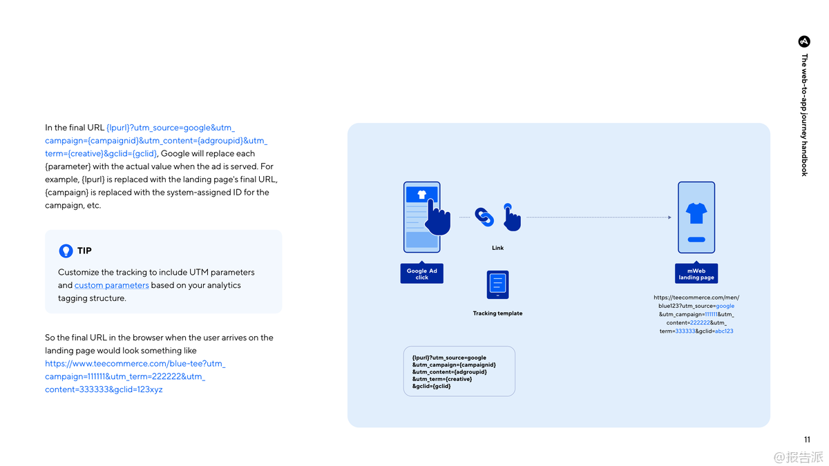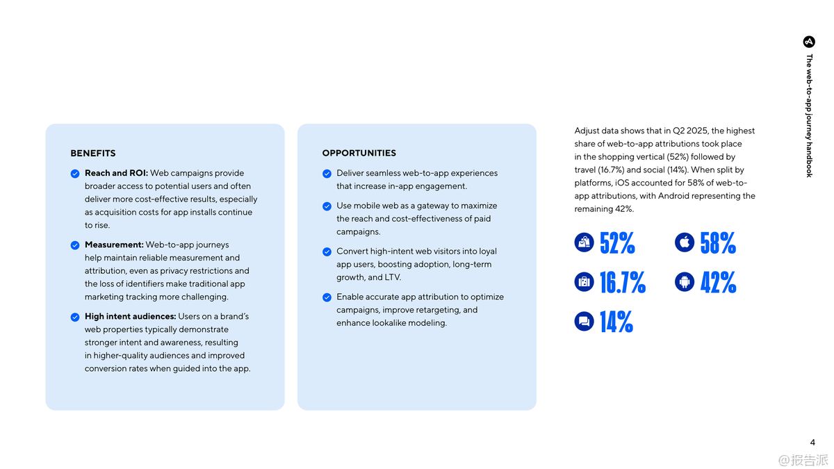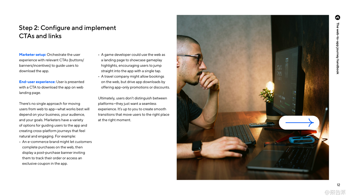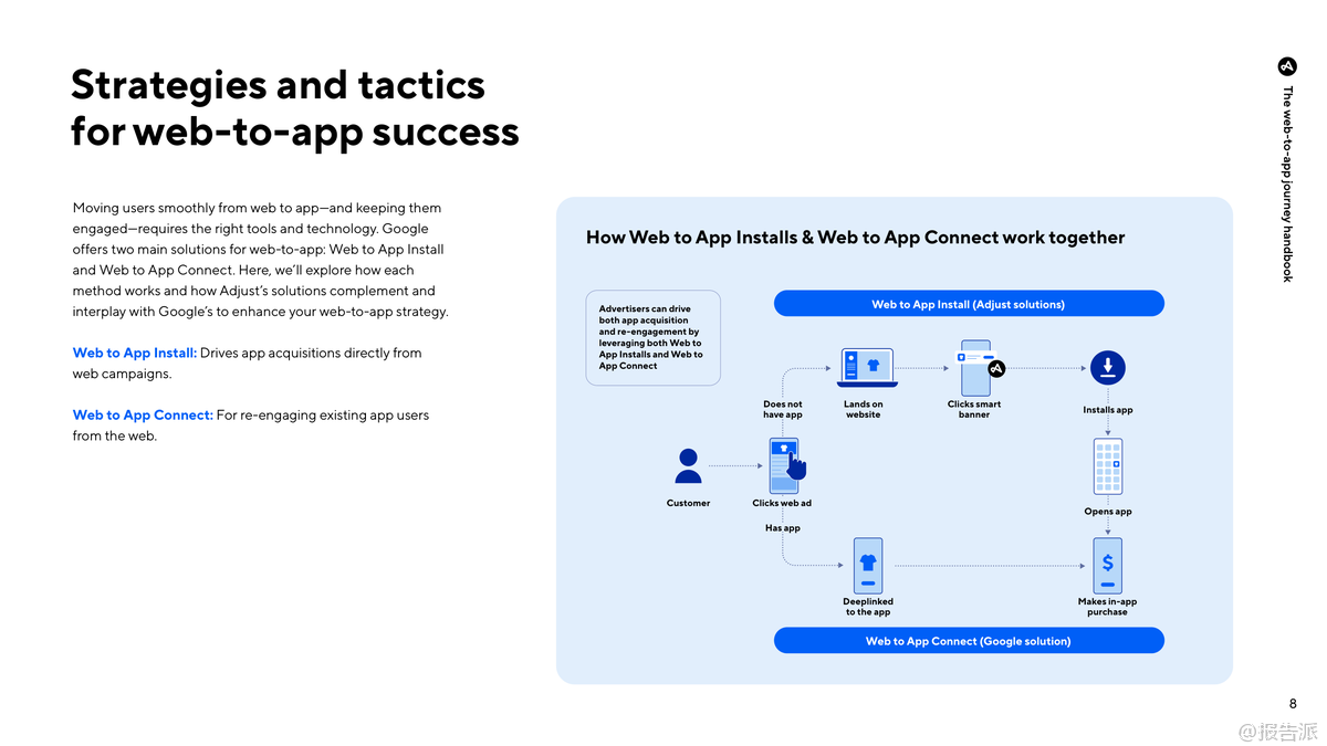 | 随着移动互联网生态的不断演进,用户行为日益跨平台化,品牌如何高效引导用户从网页端顺利转化为应用内用户,成为当下数字营销的核心课题。 这份由Google Ads与Adjust联合发布的《2025年网页到应用转化路径研究:移动广告主必备指南》,系统性地解析了“Web-to-App”策略的关键逻辑、技术实现与实战案例,为移动广告主提供了可落地的增长蓝图。 所谓Web-to-App,是指将访问品牌移动端网页(mWeb)的用户,通过精准引导,促使其下载或打开品牌App的过程。 这一路径的价值在于,App通常能提供比网页更流畅的性能、更个性化的体验以及更高的转化率。 据Criteo数据显示,用户在App中浏览的商品数量是网页端的4.2倍,转化率高出3倍,部分零售类App甚至实现高达94%的转化提升。 与此同时,超过一半的线下购物者会在店内通过零售商App完成线上行为,凸显了打通线上线下、连接网页与App的重要性。 报告指出,Web-to-App策略具备三大核心优势:一是借助网页广告更广泛的触达能力,降低获客成本,提升ROI;二是面对日益严格的隐私政策和标识符限制,该路径有助于构建更稳定、可持续的归因测量体系;三是网页访客往往具备更高购买意图,属于高质量流量池,更容易转化为高价值App用户。 为应对跨平台旅程中的测量割裂、工具分散、团队协作壁垒等挑战,报告提出两大核心方法论。 其一是“Web to App Install”,主要面向新用户获取。 通过Google Ads投放网页广告,用户点击后进入移动端落地页,再通过Adjust的Smart Banners智能横幅或Smart Scripts脚本技术,实现无缝跳转至App Store或直接唤醒App,并确保来源信息完整传递,实现精准归因。 其二是“Web to App Connect”,聚焦已有App用户的再激活。 当老用户通过网页广告回流时,系统可直接将其深度链接(Deep Link)至App内的具体页面,避免重复跳转,大幅提升转化效率。 数据显示,采用该方案的广告点击转化率平均提升2.8倍。 技术实施上,报告强调UTM参数映射、Adjust链接配置、归因回调设置等关键步骤,并建议启用Google的自动标记功能,确保数据链路闭环。 同时,Adjust的TrueLink深度链接技术可保障用户在不同场景下都能抵达目标页面,无论是已安装App的直接唤醒,还是未安装用户的延迟深度链接。 真实案例验证了该策略的有效性。 德国零售巨头OTTO通过优化Web-to-App流程,实现了增量ROAS提升16倍;荷兰时尚品牌G-Star Raw在Performance Max广告中结合App转化数据,效果提升405%。 日本健康科技公司Ubie则借助Adjust的TrueLink,成功将网页用户平滑迁移至App,解决了疫情后服务转型的核心痛点。 综上所述,Web-to-App已不再是辅助手段,而是构建全渠道用户增长引擎的战略支点。 对于移动广告主而言,整合Google Ads的投放能力与Adjust的测量与深度链接技术,打造无缝、可衡量、高转化的跨平台体验,将是赢得未来竞争的关键所在。 出品方:Google Ads 发布时间:2025年 文档页数:29页