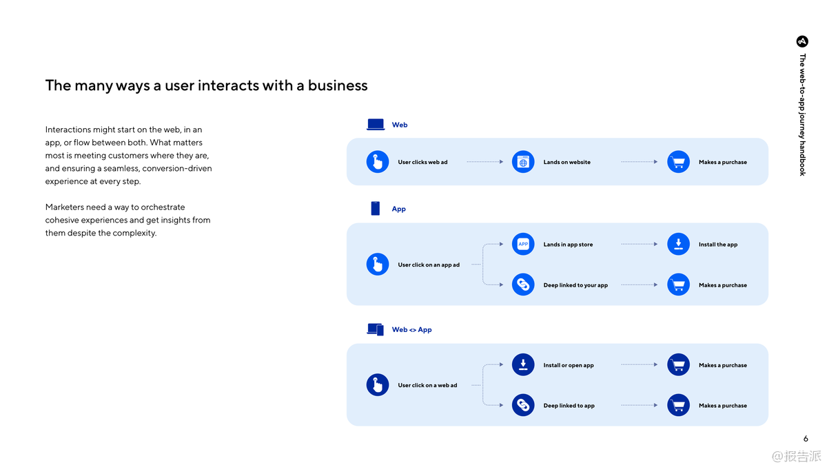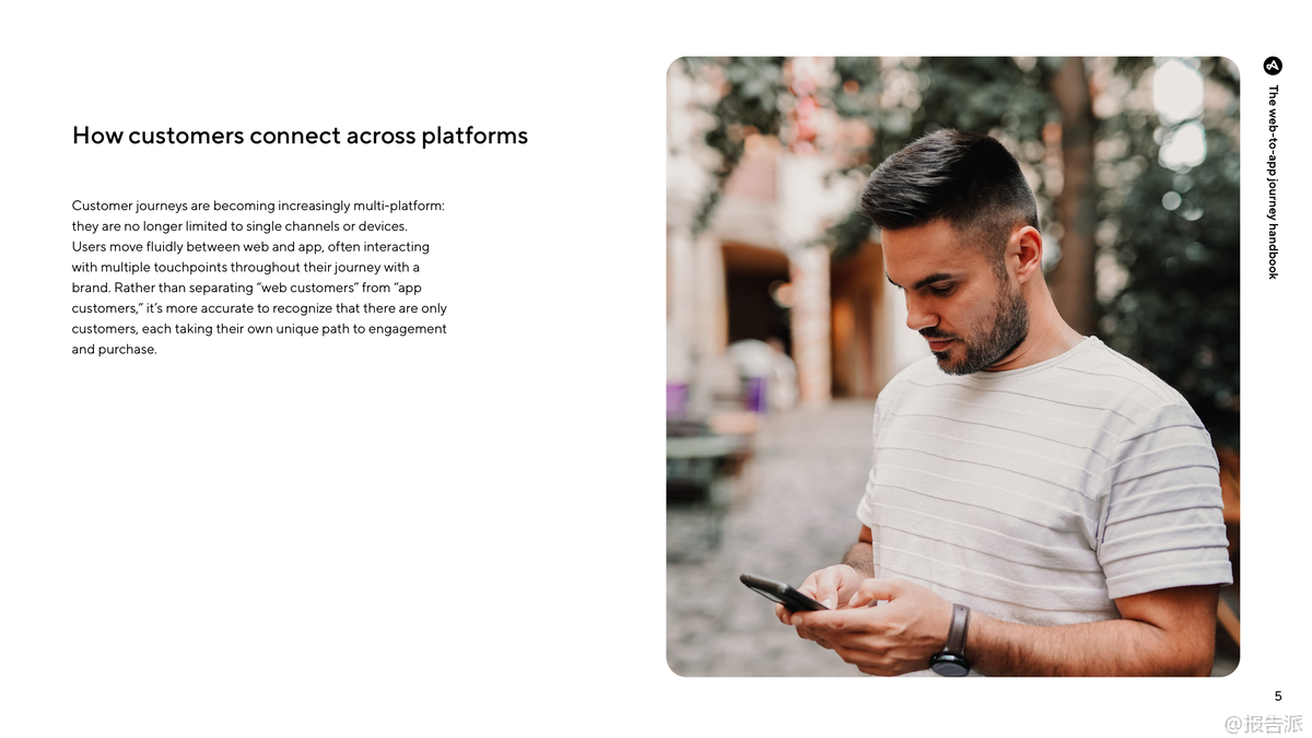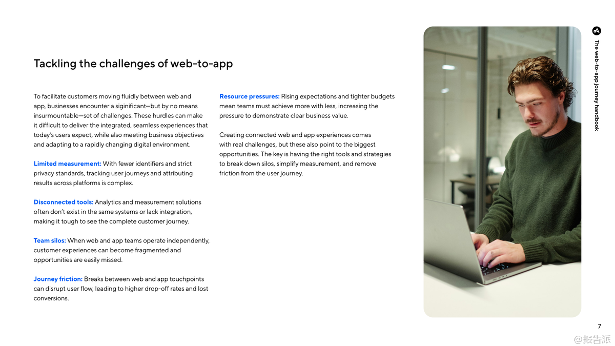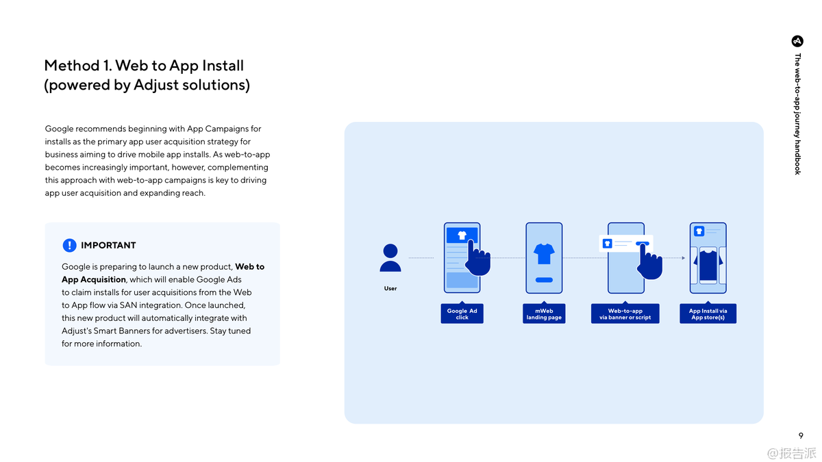 | 随着移动互联网生态的不断演进,用户行为日益跨平台化,品牌如何高效引导用户从网页端顺利转化为应用内用户,成为当下数字营销的核心课题。 这份由Google Ads与Adjust联合发布的《2025年网页到应用转化路径研究:移动广告主必备指南》,系统性地解析了“Web-to-App”策略的关键逻辑、技术实现与实战案例,为移动广告主提供了可落地的增长蓝图。 所谓Web-to-App,是指将访问品牌移动端网页(mWeb)的用户,通过精准引导,促使其下载或打开品牌App的过程。 这一路径的价值在于,App通常能提供比网页更流畅的性能、更个性化的体验以及更高的转化率。 据Criteo数据显示,用户在App中浏览的商品数量是网页端的4.2倍,转化率高出3倍,部分零售类App甚至实现高达94%的转化提升。 与此同时,超过一半的线下购物者会在店内通过零售商App完成线上行为,凸显了打通线上线下、连接网页与App的重要性。 报告指出,Web-to-App策略具备三大核心优势:一是借助网页广告更广泛的触达能力,降低获客成本,提升ROI;二是面对日益严格的隐私政策和标识符限制,该路径有助于构建更稳定、可持续的归因测量体系;三是网页访客往往具备更高购买意图,属于高质量流量池,更容易转化为高价值App用户。 为应对跨平台旅程中的测量割裂、工具分散、团队协作壁垒等挑战,报告提出两大核心方法论。 其一是“Web to App Install”,主要面向新用户获取。 通过Google Ads投放网页广告,用户点击后进入移动端落地页,再通过Adjust的Smart Banners智能横幅或Smart Scripts脚本技术,实现无缝跳转至App Store或直接唤醒App,并确保来源信息完整传递,实现精准归因。 其二是“Web to App Connect”,聚焦已有App用户的再激活。 当老用户通过网页广告回流时,系统可直接将其深度链接(Deep Link)至App内的具体页面,避免重复跳转,大幅提升转化效率。 数据显示,采用该方案的广告点击转化率平均提升2.8倍。 技术实施上,报告强调UTM参数映射、Adjust链接配置、归因回调设置等关键步骤,并建议启用Google的自动标记功能,确保数据链路闭环。 同时,Adjust的TrueLink深度链接技术可保障用户在不同场景下都能抵达目标页面,无论是已安装App的直接唤醒,还是未安装用户的延迟深度链接。 真实案例验证了该策略的有效性。 德国零售巨头OTTO通过优化Web-to-App流程,实现了增量ROAS提升16倍;荷兰时尚品牌G-Star Raw在Performance Max广告中结合App转化数据,效果提升405%。 日本健康科技公司Ubie则借助Adjust的TrueLink,成功将网页用户平滑迁移至App,解决了疫情后服务转型的核心痛点。 综上所述,Web-to-App已不再是辅助手段,而是构建全渠道用户增长引擎的战略支点。 对于移动广告主而言,整合Google Ads的投放能力与Adjust的测量与深度链接技术,打造无缝、可衡量、高转化的跨平台体验,将是赢得未来竞争的关键所在。 出品方:Google Ads 发布时间:2025年 文档页数:29页