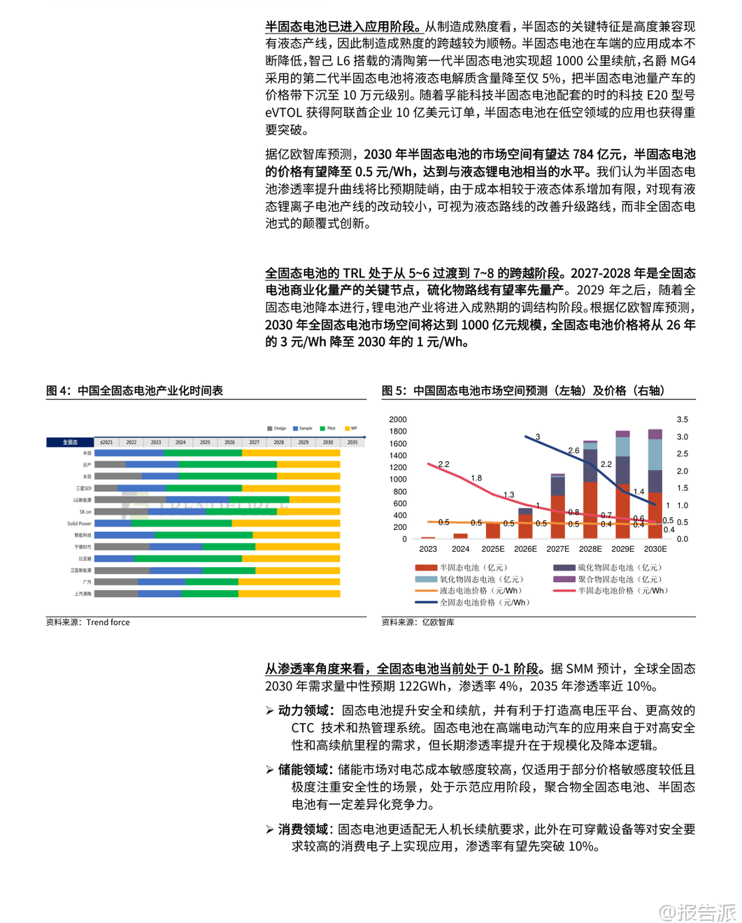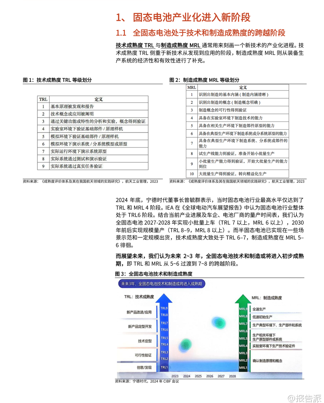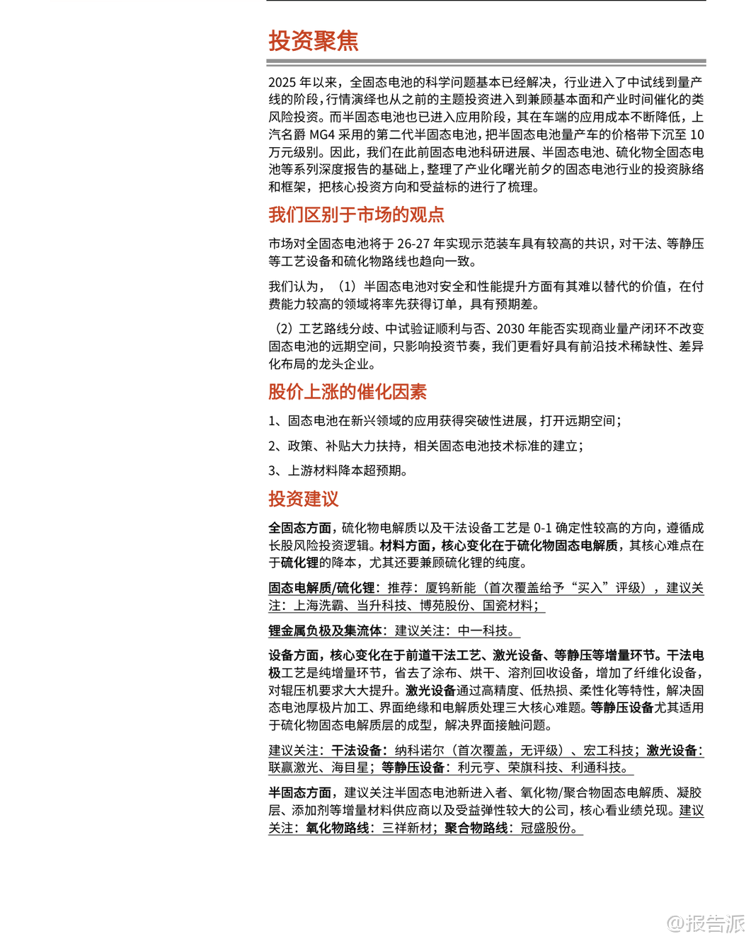| 固态电池正站在从实验室走向量产的关键拐点,2026-2027年将成为产业化的关键窗口期。 根据光大证券发布的《固态电池产业化进入新阶段》报告,全固态电池的技术成熟度(TRL)和制造成熟度(MRL)正从5~6级向7~8级跨越,标志着行业已从“0→1”的技术验证迈入“1→N”的中试到量产阶段。 这一转变不仅意味着科学问题基本解决,更预示着工程化能力、良率优化与成本控制将成为下一阶段的核心竞争壁垒。 市场共识已形成:2026年将迎来车规级装车试验,2027年实现小规模量产。 宁德时代、比亚迪、丰田、三星SDI等头部企业均将2027年作为量产节点。 与此同时,半固态电池已率先落地应用——上汽智己L6搭载清陶能源的半固态电池实现超1000公里续航,而名爵MG4则将半固态电池车型价格拉低至10万元级别,极大加速了商业化进程。 此外,孚能科技的半固态电池已配套eVTOL获得阿联酋70亿元订单,显示其在低空经济领域的巨大潜力。 从技术路线看,硫化物电解质被视为全固态电池的主流方向。 其离子电导率可媲美液态电解液,具备高能量密度和快充性能优势,尤其适合高端动力与飞行汽车场景。 然而,核心瓶颈在于“硫化锂”材料的成本与纯度控制。 目前硫化锂占硫化物电解质成本高达77%~80%,市场价格达300万-400万元/吨。 降本路径主要依赖规模化生产与工艺创新,如碳热还原法、硫化氢中和法、水合肼还原法等。 其中,上海洗霸采用与丰田合作的硫化氢中和法,厦钨新能则开发出新型气相法,在降本与提纯方面具备先发优势。 设备端迎来结构性变革,干法电极、激光加工与等静压设备成为增量核心。 干法工艺省去涂布、烘干、溶剂回收环节,适用于硫化物体系并兼容未来锂金属负极,对辊压机压力要求大幅提升(可达3500吨)。 纳科诺尔、宏工科技等企业在干法混料与辊压设备领域已实现头部客户交付。 激光设备用于厚极片切割、界面处理与电解质成型,联赢激光、海目星已获中试线订单。 等静压技术则解决固态电解质层致密化与界面接触难题,利元亨、荣旗科技、利通科技正加快验证测试。 长期来看,固态电池市场空间广阔。 亿欧智库预计2030年全固态电池市场规模将达千亿元,SMM预测全球需求量达122GWh,渗透率4%;2035年渗透率有望接近10%。 应用场景将从高端电动车扩展至低空飞行器、人形机器人、消费电子等领域。 随着锂金属负极的导入,能量密度有望突破500Wh/kg,推动电动航空与智能终端的革命性升级。 投资策略上,建议聚焦两条主线:一是全固态确定性方向,重点布局硫化物电解质与干法设备,推荐厦钨新能(硫化锂)、纳科诺尔(干法辊压)、联赢激光(激光设备);二是半固态业绩兑现链,关注氧化物/聚合物电解质、凝胶层、添加剂等材料供应商,如三祥新材、冠盛股份。 风险方面需警惕技术迭代不及预期、工艺路线变更及产业化节奏延迟。 综上,固态电池正处于“政策+技术+资本”多重催化共振的前夜。 2026-2027年将是验证装车、产线招标、补贴验收的关键时期,具备核心技术壁垒与产业链卡位优势的企业有望在新一轮技术浪潮中脱颖而出,开启千亿级市场的成长新篇章。 本文由【报告派】研读,输出观点仅作为行业分析! 原文标题:原文标题:2026-01-09-光大证券-光大证券-电力设备新能源行业锂电新技术展望系列报告十一:固态电池产业化进入新阶段 发布时间:2026年 报告出品方:光大证券