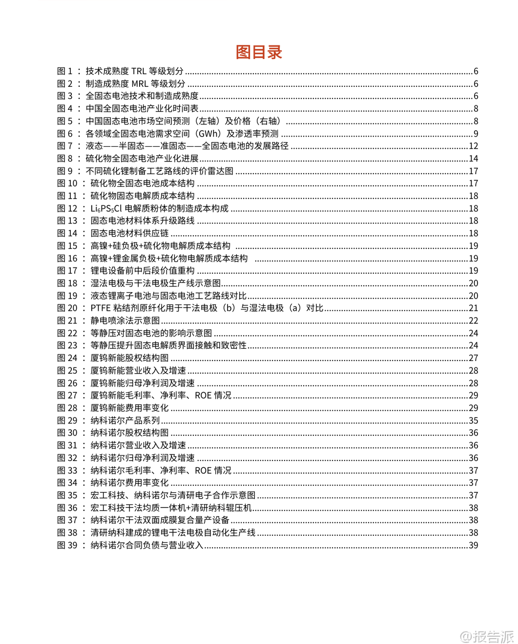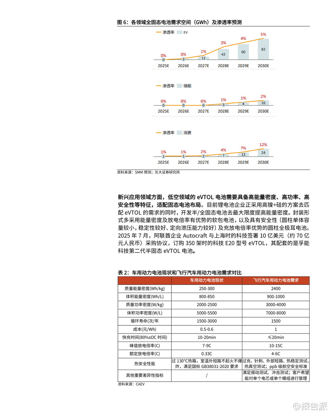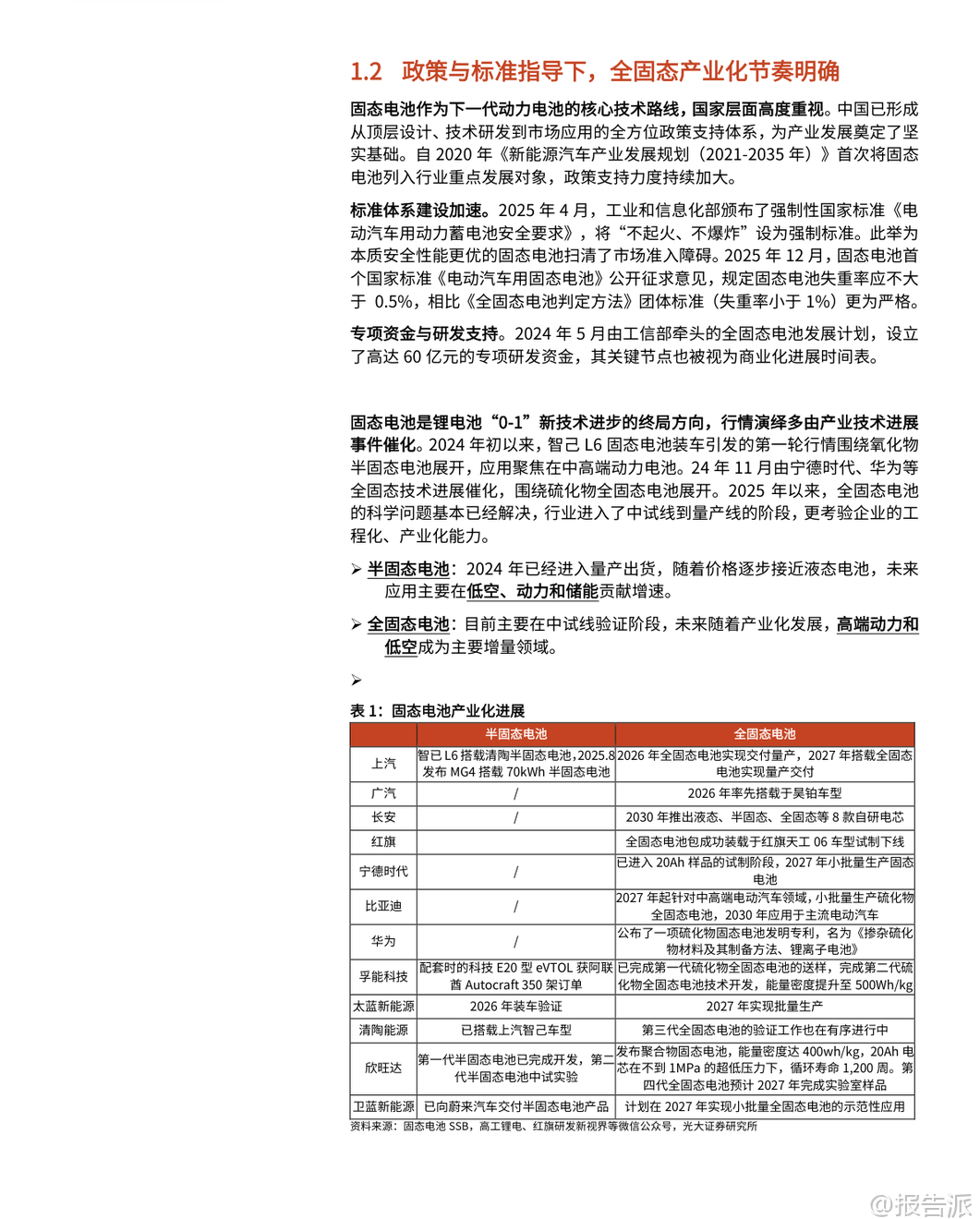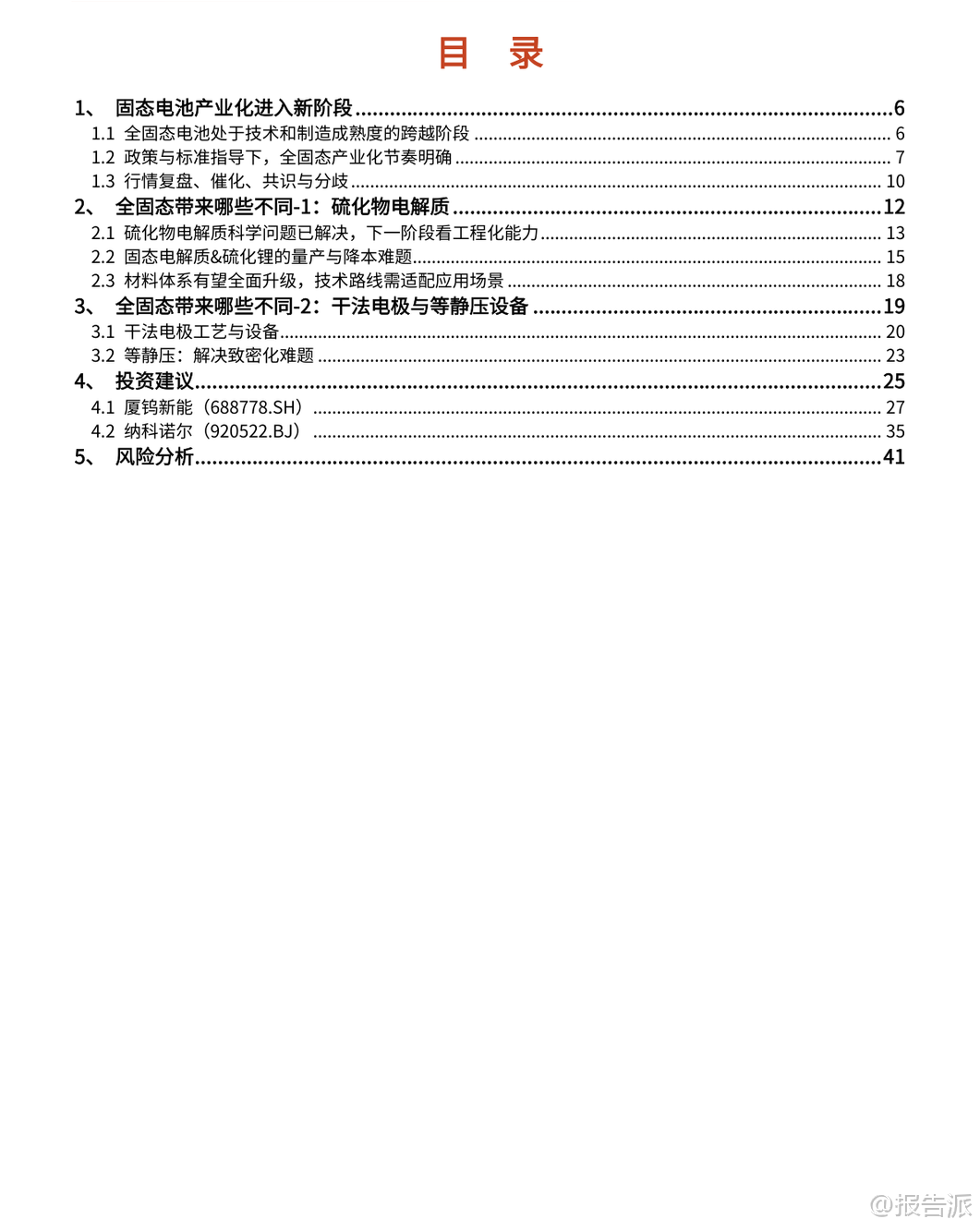 | 固态电池正站在从实验室走向量产的关键拐点,2026-2027年将成为产业化的关键窗口期。 根据光大证券发布的《固态电池产业化进入新阶段》报告,全固态电池的技术成熟度(TRL)和制造成熟度(MRL)正从5~6级向7~8级跨越,标志着行业已从“0→1”的技术验证迈入“1→N”的中试到量产阶段。 这一转变不仅意味着科学问题基本解决,更预示着工程化能力、良率优化与成本控制将成为下一阶段的核心竞争壁垒。 市场共识已形成:2026年将迎来车规级装车试验,2027年实现小规模量产。 宁德时代、比亚迪、丰田、三星SDI等头部企业均将2027年作为量产节点。 与此同时,半固态电池已率先落地应用——上汽智己L6搭载清陶能源的半固态电池实现超1000公里续航,而名爵MG4则将半固态电池车型价格拉低至10万元级别,极大加速了商业化进程。 此外,孚能科技的半固态电池已配套eVTOL获得阿联酋70亿元订单,显示其在低空经济领域的巨大潜力。 从技术路线看,硫化物电解质被视为全固态电池的主流方向。 其离子电导率可媲美液态电解液,具备高能量密度和快充性能优势,尤其适合高端动力与飞行汽车场景。 然而,核心瓶颈在于“硫化锂”材料的成本与纯度控制。 目前硫化锂占硫化物电解质成本高达77%~80%,市场价格达300万-400万元/吨。 降本路径主要依赖规模化生产与工艺创新,如碳热还原法、硫化氢中和法、水合肼还原法等。 其中,上海洗霸采用与丰田合作的硫化氢中和法,厦钨新能则开发出新型气相法,在降本与提纯方面具备先发优势。 设备端迎来结构性变革,干法电极、激光加工与等静压设备成为增量核心。 干法工艺省去涂布、烘干、溶剂回收环节,适用于硫化物体系并兼容未来锂金属负极,对辊压机压力要求大幅提升(可达3500吨)。 纳科诺尔、宏工科技等企业在干法混料与辊压设备领域已实现头部客户交付。 激光设备用于厚极片切割、界面处理与电解质成型,联赢激光、海目星已获中试线订单。 等静压技术则解决固态电解质层致密化与界面接触难题,利元亨、荣旗科技、利通科技正加快验证测试。 长期来看,固态电池市场空间广阔。 亿欧智库预计2030年全固态电池市场规模将达千亿元,SMM预测全球需求量达122GWh,渗透率4%;2035年渗透率有望接近10%。 应用场景将从高端电动车扩展至低空飞行器、人形机器人、消费电子等领域。 随着锂金属负极的导入,能量密度有望突破500Wh/kg,推动电动航空与智能终端的革命性升级。 投资策略上,建议聚焦两条主线:一是全固态确定性方向,重点布局硫化物电解质与干法设备,推荐厦钨新能(硫化锂)、纳科诺尔(干法辊压)、联赢激光(激光设备);二是半固态业绩兑现链,关注氧化物/聚合物电解质、凝胶层、添加剂等材料供应商,如三祥新材、冠盛股份。 风险方面需警惕技术迭代不及预期、工艺路线变更及产业化节奏延迟。 综上,固态电池正处于“政策+技术+资本”多重催化共振的前夜。 2026-2027年将是验证装车、产线招标、补贴验收的关键时期,具备核心技术壁垒与产业链卡位优势的企业有望在新一轮技术浪潮中脱颖而出,开启千亿级市场的成长新篇章。 本文由【报告派】研读,输出观点仅作为行业分析! 原文标题:原文标题:2026-01-09-光大证券-光大证券-电力设备新能源行业锂电新技术展望系列报告十一:固态电池产业化进入新阶段 发布时间:2026年 报告出品方:光大证券
