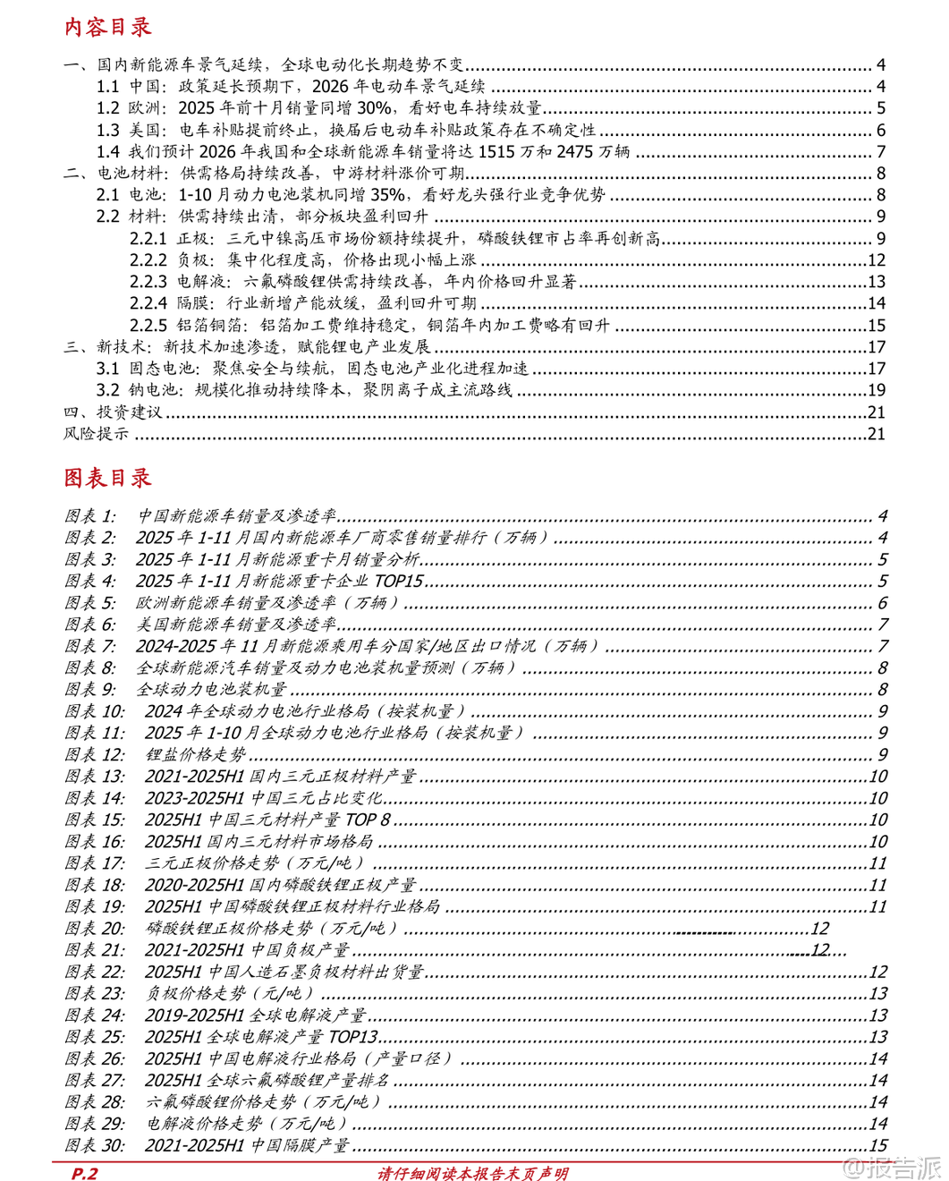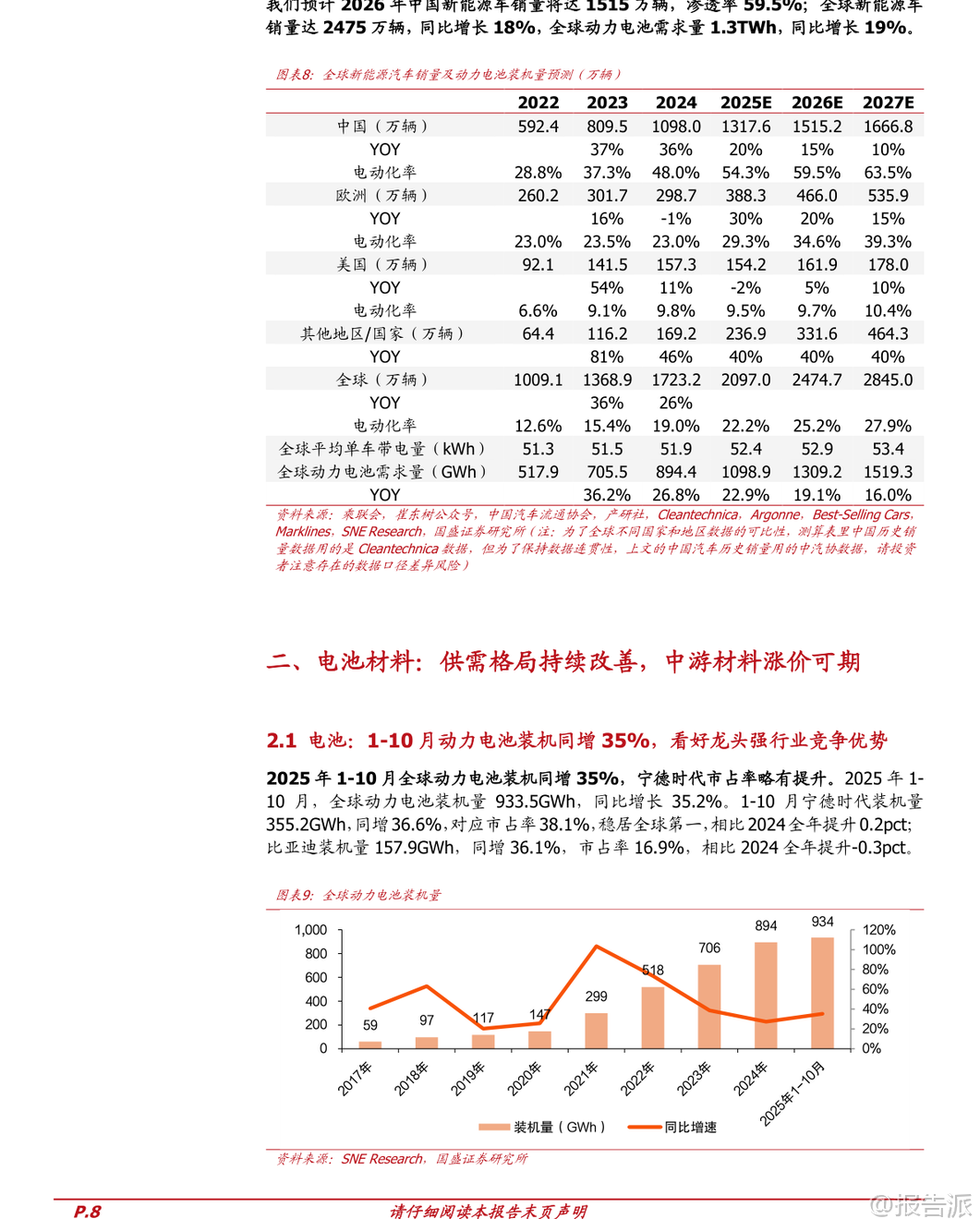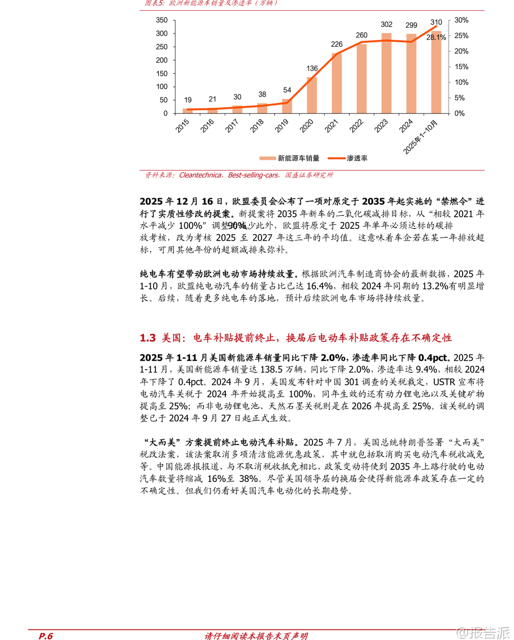 | 2026年新能源车行业迎来新一轮发展机遇,全球电动化长期趋势不变,产业链盈利逐步复苏,技术升级加速推进。 国盛证券发布的《电力设备行业2026年新能源车年度策略》全面分析了中国、欧洲、美国三大市场的销量表现与政策动向,并对动力电池、材料环节及固态电池、钠电池等新技术路径进行了深入研判。 从全球市场来看,2025年1-11月我国新能源车出口同比增长63%,主要面向欧洲和亚洲市场,美洲市场也逐步崛起。 预计2026年全球新能源车销量将达到2475万辆,同比增长18%;中国销量达1515万辆,同比增长15%,渗透率提升至59.5%;欧洲销量466万辆,同比增长20%;美国销量162万辆,同比增长5%。 全球动力电池需求量将突破1300GWh,同比增幅达19%。 中国市场方面,2025年1-11月新能源车销量达1478万辆,同比增长31.2%,渗透率达47.5%。 比亚迪以27.4%的市占率稳居第一,零跑、吉利等车企增速亮眼。 政策层面,财政部明确对2026年报废或置换新能源车分别给予车价12%(不超过2万元)和8%(不超过1.5万元)的补贴,有效衔接此前购置税减免退坡带来的需求担忧,有望推动2026年一季度“淡季不淡”。 此外,新能源重卡市场爆发式增长,2025年1-11月销量达18.7万辆,同比增长178%,徐工、三一、一汽解放位列前三。 运营成本优势显著,纯电动重卡年运营可比燃油车节省19.1万元,未来在港口、矿区等固定场景应用潜力巨大。 欧洲市场保持高景气度,2025年1-10月新能源车销量309.5万辆,同比增长30%,渗透率达28.1%。 欧盟对“禁燃令”做出调整,2035年新车碳排放目标由减排100%改为90%,并允许2025-2027年三年平均考核,缓解车企压力。 纯电动车占比提升至16.4%,中低端车型受碳排放标准驱动需求旺盛,后续电车放量趋势明确。 美国市场短期承压,2025年1-11月新能源车销量同比下降2%,渗透率下降0.4个百分点至9.4%。 特朗普政府签署法案取消电动汽车税收抵免,叠加对中国电动车加征100%关税,政策不确定性增强。 但当前电动化率不足10%,长期发展空间广阔。 电池及材料环节供需格局持续改善,龙头企业盈利能力回升。 2025年1-10月全球动力电池装机量达933.5GWh,同比增长35.2%。 宁德时代装机量355.2GWh,市占率38.1%,小幅提升;比亚迪市占率16.9%。 正极材料中,磷酸铁锂装车占比达81.4%,创历史新高,湖南裕能出货量居首;三元材料中,中镍高电压路线增长强劲,南通瑞翔产量登顶。 碳酸锂价格2025年下半年快速反弹,截至年底电池级碳酸锂均价达12.3万元/吨,同比上涨62%,带动磷酸铁锂正极价格上涨33.8%。 负极环节集中度高,杉杉科技领跑,价格小幅上涨。 电解液方面,六氟磷酸锂价格年内涨幅高达188%,达到18万元/吨,电解液价格同步回升。 隔膜产能扩张放缓,干法隔膜价格逆势上涨,湿法隔膜价格分化。 铜箔加工费略有回升,4.5μm极薄铜箔渗透率提升至30%-35%,助力电池能量密度提升。 新技术方面,固态电池产业化进程加速。 其具备高安全性和高能量密度优势,多家车企和电池企业密集布局。 清陶能源计划2026年Q4量产全固态电池,广汽、长安、奇瑞等车企均规划2026年实现装车验证或定向运营。 宁德时代、比亚迪、亿纬锂能等头部企业预计2027-2028年实现小批量生产或量产。 技术路线以高镍三元+硅基负极+硫化物电解质为主流方向。 钠电池进入规模化降本阶段。 2025年1-9月全球钠电池市场规模约6GWh,同比增长202%。 聚阴离子NFPP路线凭借成本优势市占率已达60%,价格较年初下降近30%。 宁德时代发布全球首款量产钠离子电池“钠新”,已应用于理想、问界等车型,混动纯电续航超200km,纯电续航突破500km。 储能领域已有多个钠电项目落地,宁德时代“钠锂混储”电站投入运营。 海外市场拓展顺利,宁德时代匈牙利工厂将生产钠电池,海四达斩获1GWh海外户储订单。 投资建议方面,推荐关注四大方向:一是电池龙头宁德时代、亿纬锂能、国轩高科等;二是中游材料优质企业如恩捷股份、天赐材料、多氟多、湖南裕能等;三是固态电池相关标的星云股份、当升科技、荣旗科技等;四是钠电池产业链公司容百科技、鼎胜新材、万润新能等。 整体来看,新能源车产业链经历三年磨底后迎来盈利修复,技术迭代持续赋能行业发展,2026年值得期待。 本文由【报告派】研读,输出观点仅作为行业分析! 原文标题:2026-01-11-国盛证券-国盛证券-电力设备行业2026年新能源车年度策略:产业盈利复苏,技术持续升级 发布时间:2026年 报告出品方:国盛证券