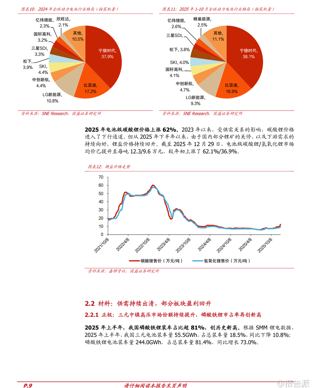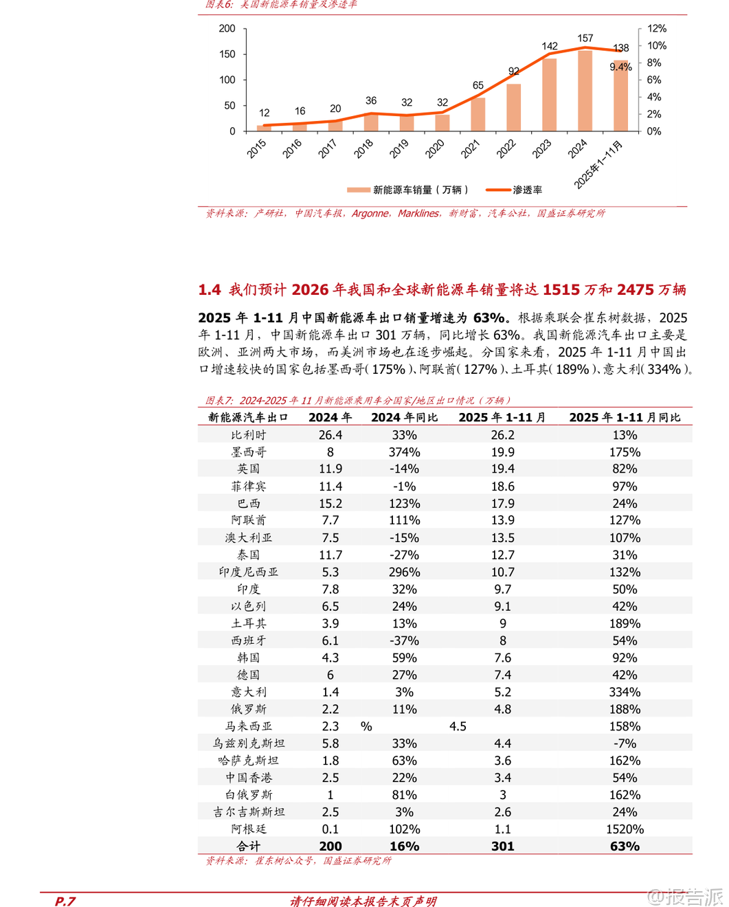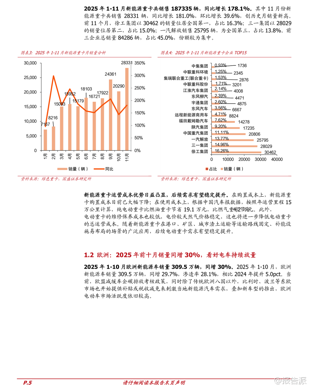 | 2026年新能源车行业迎来新一轮发展机遇,全球电动化长期趋势不变,产业链盈利逐步复苏,技术升级加速推进。 国盛证券发布的《电力设备行业2026年新能源车年度策略》全面分析了中国、欧洲、美国三大市场的销量表现与政策动向,并对动力电池、材料环节及固态电池、钠电池等新技术路径进行了深入研判。 从全球市场来看,2025年1-11月我国新能源车出口同比增长63%,主要面向欧洲和亚洲市场,美洲市场也逐步崛起。 预计2026年全球新能源车销量将达到2475万辆,同比增长18%;中国销量达1515万辆,同比增长15%,渗透率提升至59.5%;欧洲销量466万辆,同比增长20%;美国销量162万辆,同比增长5%。 全球动力电池需求量将突破1300GWh,同比增幅达19%。 中国市场方面,2025年1-11月新能源车销量达1478万辆,同比增长31.2%,渗透率达47.5%。 比亚迪以27.4%的市占率稳居第一,零跑、吉利等车企增速亮眼。 政策层面,财政部明确对2026年报废或置换新能源车分别给予车价12%(不超过2万元)和8%(不超过1.5万元)的补贴,有效衔接此前购置税减免退坡带来的需求担忧,有望推动2026年一季度“淡季不淡”。 此外,新能源重卡市场爆发式增长,2025年1-11月销量达18.7万辆,同比增长178%,徐工、三一、一汽解放位列前三。 运营成本优势显著,纯电动重卡年运营可比燃油车节省19.1万元,未来在港口、矿区等固定场景应用潜力巨大。 欧洲市场保持高景气度,2025年1-10月新能源车销量309.5万辆,同比增长30%,渗透率达28.1%。 欧盟对“禁燃令”做出调整,2035年新车碳排放目标由减排100%改为90%,并允许2025-2027年三年平均考核,缓解车企压力。 纯电动车占比提升至16.4%,中低端车型受碳排放标准驱动需求旺盛,后续电车放量趋势明确。 美国市场短期承压,2025年1-11月新能源车销量同比下降2%,渗透率下降0.4个百分点至9.4%。 特朗普政府签署法案取消电动汽车税收抵免,叠加对中国电动车加征100%关税,政策不确定性增强。 但当前电动化率不足10%,长期发展空间广阔。 电池及材料环节供需格局持续改善,龙头企业盈利能力回升。 2025年1-10月全球动力电池装机量达933.5GWh,同比增长35.2%。 宁德时代装机量355.2GWh,市占率38.1%,小幅提升;比亚迪市占率16.9%。 正极材料中,磷酸铁锂装车占比达81.4%,创历史新高,湖南裕能出货量居首;三元材料中,中镍高电压路线增长强劲,南通瑞翔产量登顶。 碳酸锂价格2025年下半年快速反弹,截至年底电池级碳酸锂均价达12.3万元/吨,同比上涨62%,带动磷酸铁锂正极价格上涨33.8%。 负极环节集中度高,杉杉科技领跑,价格小幅上涨。 电解液方面,六氟磷酸锂价格年内涨幅高达188%,达到18万元/吨,电解液价格同步回升。 隔膜产能扩张放缓,干法隔膜价格逆势上涨,湿法隔膜价格分化。 铜箔加工费略有回升,4.5μm极薄铜箔渗透率提升至30%-35%,助力电池能量密度提升。 新技术方面,固态电池产业化进程加速。 其具备高安全性和高能量密度优势,多家车企和电池企业密集布局。 清陶能源计划2026年Q4量产全固态电池,广汽、长安、奇瑞等车企均规划2026年实现装车验证或定向运营。 宁德时代、比亚迪、亿纬锂能等头部企业预计2027-2028年实现小批量生产或量产。 技术路线以高镍三元+硅基负极+硫化物电解质为主流方向。 钠电池进入规模化降本阶段。 2025年1-9月全球钠电池市场规模约6GWh,同比增长202%。 聚阴离子NFPP路线凭借成本优势市占率已达60%,价格较年初下降近30%。 宁德时代发布全球首款量产钠离子电池“钠新”,已应用于理想、问界等车型,混动纯电续航超200km,纯电续航突破500km。 储能领域已有多个钠电项目落地,宁德时代“钠锂混储”电站投入运营。 海外市场拓展顺利,宁德时代匈牙利工厂将生产钠电池,海四达斩获1GWh海外户储订单。 投资建议方面,推荐关注四大方向:一是电池龙头宁德时代、亿纬锂能、国轩高科等;二是中游材料优质企业如恩捷股份、天赐材料、多氟多、湖南裕能等;三是固态电池相关标的星云股份、当升科技、荣旗科技等;四是钠电池产业链公司容百科技、鼎胜新材、万润新能等。 整体来看,新能源车产业链经历三年磨底后迎来盈利修复,技术迭代持续赋能行业发展,2026年值得期待。 本文由【报告派】研读,输出观点仅作为行业分析! 原文标题:2026-01-11-国盛证券-国盛证券-电力设备行业2026年新能源车年度策略:产业盈利复苏,技术持续升级 发布时间:2026年 报告出品方:国盛证券