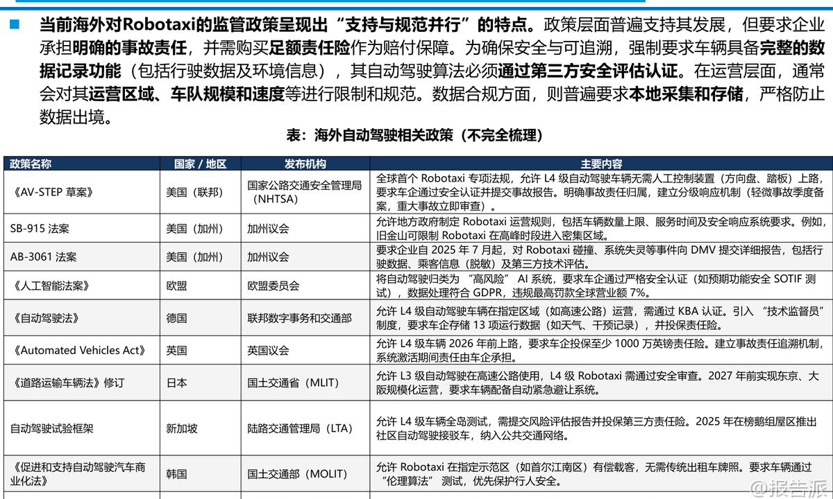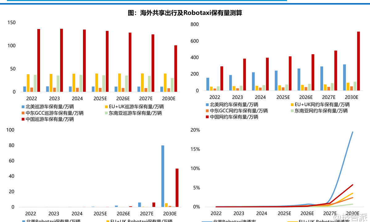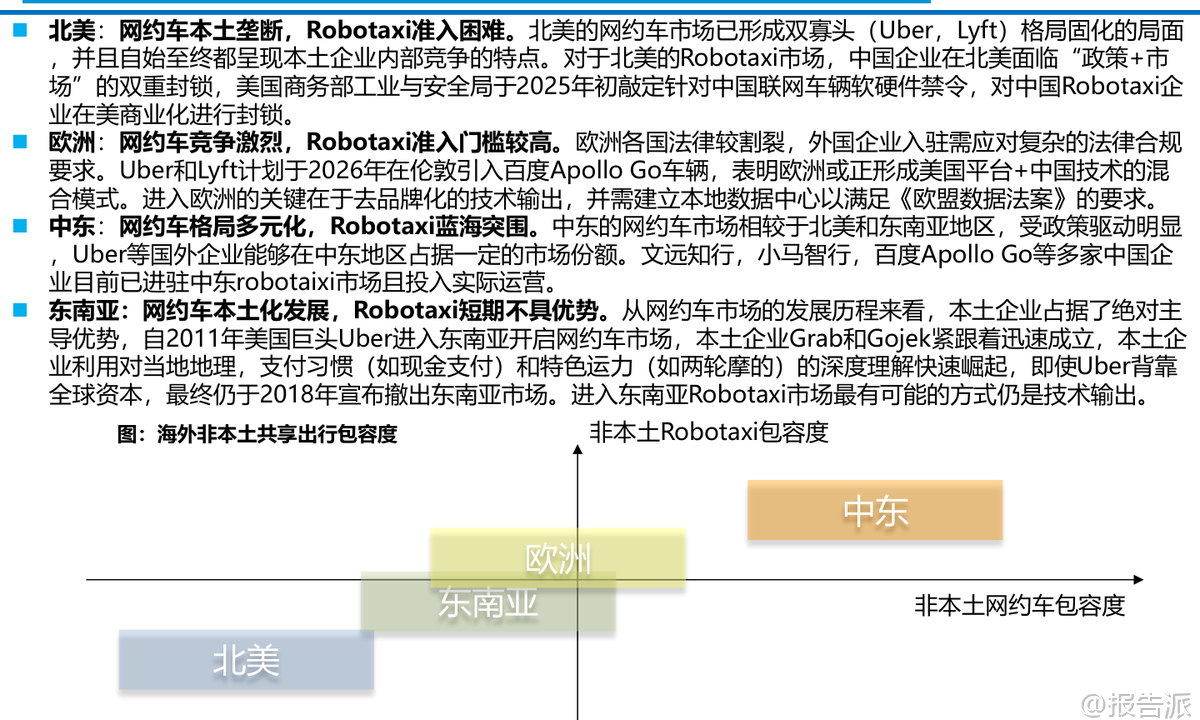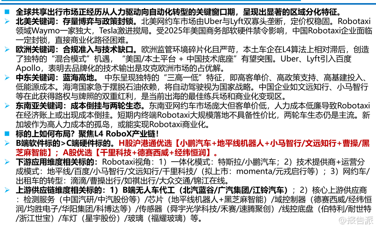| 全球Robotaxi商业化正迎来关键拐点,自动驾驶出行从技术验证迈向规模化落地的新阶段。 东吴证券最新研报指出,当前全球共享出行市场正处于从人力驱动向自动化转型的窗口期,不同区域呈现出显著分化的发展特征。 北美、欧洲、中东与东南亚四大市场在政策环境、竞争格局和商业化路径上各有特点,为中国L4级自动驾驶企业出海提供了差异化机遇。 在北美市场,网约车由Uber与Lyft双寡头垄断,定价权稳固,而Robotaxi领域则呈现“一超多强”格局。 Waymo凭借Alphabet的技术与资本支持,已实现全无人商业化运营,在旧金山等地占据约27%的网约车份额,并通过接入Uber平台快速获取用户流量。 特斯拉以Cybercab专用车型和FSD技术为依托,开启试点服务并积累百万级潜在用户,成为搅局者。 但通用汽车旗下Cruise因安全事故退出市场,凸显主机厂自研模式的困境。 与此同时,2025年美国商务部对中国联网车辆软硬件实施禁令,使得中国Robotaxi企业在北美直接商业化面临政策封锁,短期内难以突破。 欧洲市场则表现出高度碎片化与严苛监管的特点。 各国法律差异大,劳工权益保护严格,网约车司机被普遍视为雇员,平台需承担社保成本,导致整体出行价格偏高。 本土车企在L4算法上相对滞后,但这也催生了“混合模式”机遇——即美国或本土平台+中国技术底座的合作路径。 Uber、Lyft引入百度Apollo Go服务,标志着去品牌化的技术输出正成为进入欧洲市场的优选策略。 此外,Mobileye、Wayve等技术供应商正在构建底层操作系统生态,而大众、Rimac等主机厂也在探索定制化Robotaxi解决方案。 相比之下,中东成为中国企业出海的最佳练兵场。 该地区具备“三高一低”特征:高客单价、高政策支持、高基建投入以及低能源成本。 海湾国家如沙特、阿联酋将自动驾驶视为国家战略,积极推动交通智能化转型。 文远知行、小马智行、百度Apollo Go等已获得路权与运营牌照,在迪拜、阿布扎比、利雅得等地开展试运营甚至纯无人商业服务。 其中,文远知行已在阿联酋部署除中美外最大车队,并计划拓展至数百辆规模。 此前Cruise退出留下的市场真空,进一步为中国企业创造了蓝海突围机会。 东南亚市场则面临“成本倒挂”挑战。 尽管网约车市场规模庞大,但人力成本极低,司机月薪仅300–500美元,导致Robotaxi难以在经济账上实现盈利。 加之城市路况复杂、两轮车生态主导,短期内大规模落地不具备性价比。 目前Robotaxi主要停留在政府主导的小范围试点阶段,集中在新加坡、泰国等封闭园区或旅游区。 值得注意的是,新加坡作为例外,因其高达2500–4000美元的司机薪资水平,已具备Robotaxi商业闭环的基础条件。 文远知行、小马智行正与Grab、ComfortDelGro合作推进测试,政府目标在2026年底前建成百辆级自动驾驶车队。 从投资角度看,报告建议聚焦L4 RoboX产业链,优先布局B端软件标的而非C端硬件。 港股推荐小鹏汽车、地平线机器人、小马智行/文远知行、黑芝麻智能;A股关注千里科技、德赛西威、经纬恒润。 下游应用涵盖一体化模式(特斯拉/小鹏)、技术提供商+运营分成(百度/文远知行等)及传统出行平台转型(滴滴/曹操出行)。 上游供应链包括无人车代工(北汽蓝谷/广汽)、芯片(地平线/黑芝麻)、域控制器(德赛西威/经纬恒润)、传感器(禾赛/速腾聚创)等核心环节。 总体来看,全球Robotaxi商业化进程加速,但区域差异明显。 北美技术领先但门槛高,欧洲合规复杂但存在合作空间,中东政策友好且变现能力强,东南亚短期难盈利但长期潜力大。 中国L4企业应把握出海战略机遇,重点布局中东与新加坡,通过技术输出与本地化合作打开国际市场。 风险方面需警惕地缘政治壁垒、场景泛化不及预期及对海外流量平台的依赖。 本文由【报告派】研读,输出观点仅作为行业分析! 原文标题:原文标题:2026-01-10-东吴证券-东吴证券-共享出行行业:全球Robotaxi商业化拐点将现,看好国内L4公司出海再扬帆 发布时间:2026年 报告出品方:东吴证券