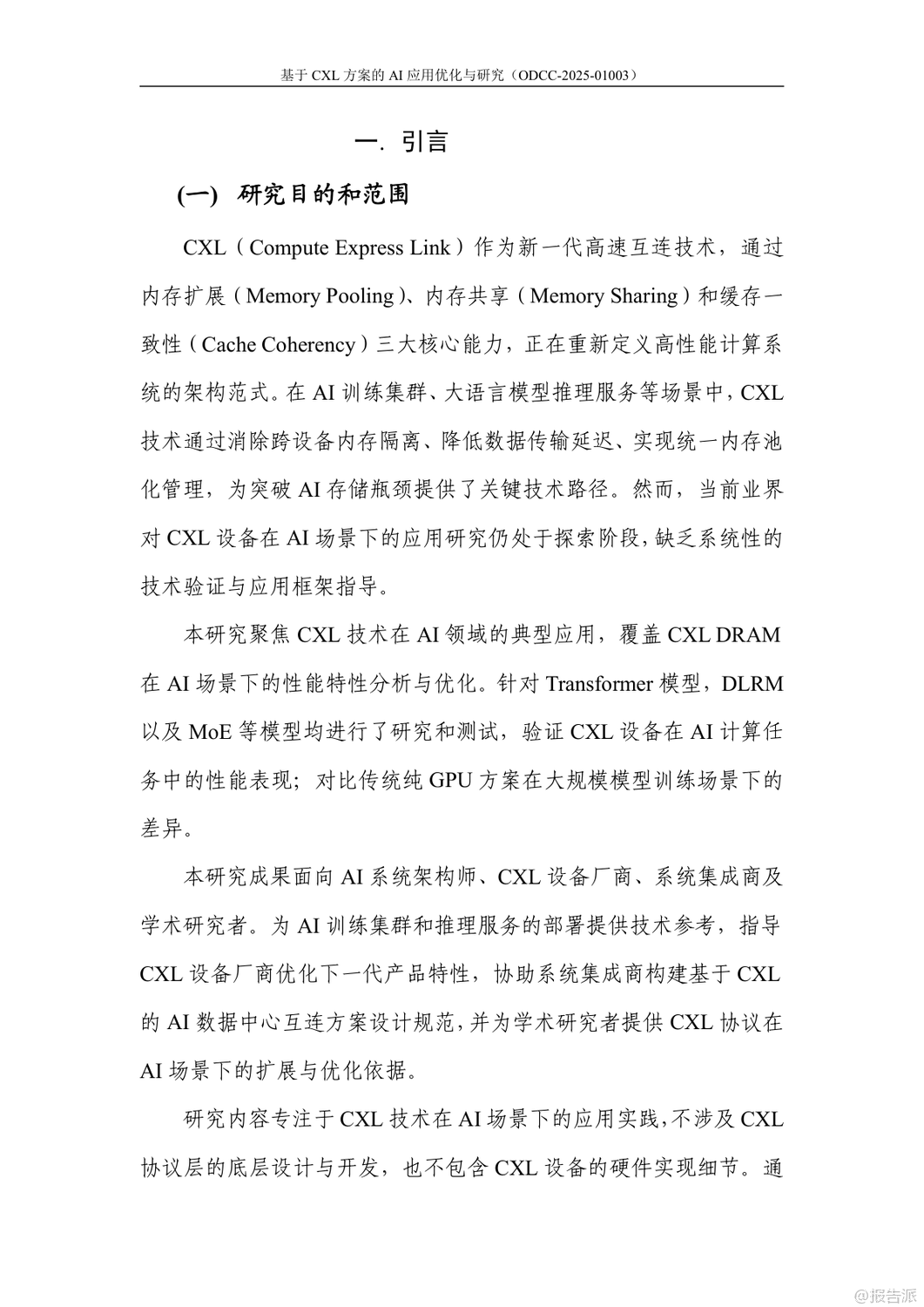 | CXL(Compute Express Link)作为一种基于PCIe 5.0的高速互连技术,正在成为破解AI算力与存储瓶颈的关键路径。 近日,开放数据中心委员会(ODCC)发布《2025年基于CXL方案的AI应用优化与研究》白皮书,系统探讨了CXL技术在MoE、LLM和GNN三大AI场景中的应用潜力与实测性能,为下一代AI数据中心的架构演进提供了权威指引。 CXL技术凭借内存扩展、内存共享和缓存一致性三大能力,打破了传统计算架构中CPU与GPU之间的内存孤岛。 尤其是在AI大模型训练和推理过程中,GPU显存容量有限的问题愈发突出,而CXL通过Type 3设备实现的内存池化,可将系统内存扩展至本地内存的10倍以上。 三星推出的CMM-D、SK海力士的CXL DRAM等产品已进入商用阶段,标志着CXL从实验室走向规模化部署。 在MoE(混合专家模型)场景中,模型参数庞大,推理时面临严重的“内存墙”问题。 白皮书提出首个基于CXL的MoE卸载框架——MoE Offload,利用CMM-D的大容量存储专家参数,并通过计算次序优化、I/O管理、流水线调度和预测性预取四项核心技术,显著降低GPU等待时间。 实测显示,该方案最高可节省82%的GPU内存占用,在内存减少55%的情况下性能损失仅为31%,展现出极高的性价比。 针对大语言模型(LLM)推理中的KV缓存膨胀问题,传统方案依赖SSD卸载,但存在高延迟瓶颈。 本研究构建了基于CXL的多层KV缓存系统,利用CXL内存作为锁页内存池,结合DMA实现低延迟传输。 通过预取优化、多进程并行和存储重叠技术,使数据传输与计算充分重叠。 实验表明,新方案相较旧DRAM方案提升7%,相较无CXL方案性能提升达21%,有效弥合了CXL与本地内存的性能差距。 在图神经网络(GNN)训练中,超大规模图数据常需从SSD加载特征,造成严重I/O瓶颈。 CMM-D GNN方案将图结构与特征数据迁移至CXL内存,并结合NVIDIA的UVA(统一虚拟寻址)技术,实现GPU对CXL内存的直接访问。 测试数据显示,CMM-D方案相较SSD方案训练效率提升8倍,相较传统DRAM方案提升2.5倍,大幅缩短了采样与聚合阶段的等待时间。 综合来看,CXL不仅是硬件层面的升级,更是AI系统架构的范式变革。 它通过统一内存池化,实现了计算资源与存储资源的弹性调度,显著提升了AI训练与推理的能效比。 随着CXL 3.0协议的推进,未来在跨节点内存池化、智能资源调度等方面还将释放更大潜力。 ODCC此次研究为AI基础设施的演进提供了扎实的技术路径,预示着2025年CXL将在AI数据中心迎来规模化落地的关键拐点。 出品方:ODCC 发布时间:2025年 文档页数:55页