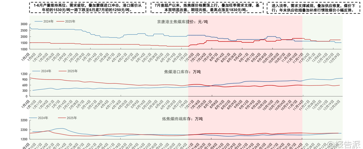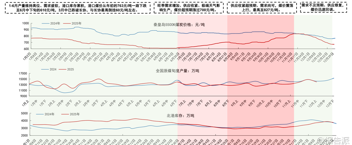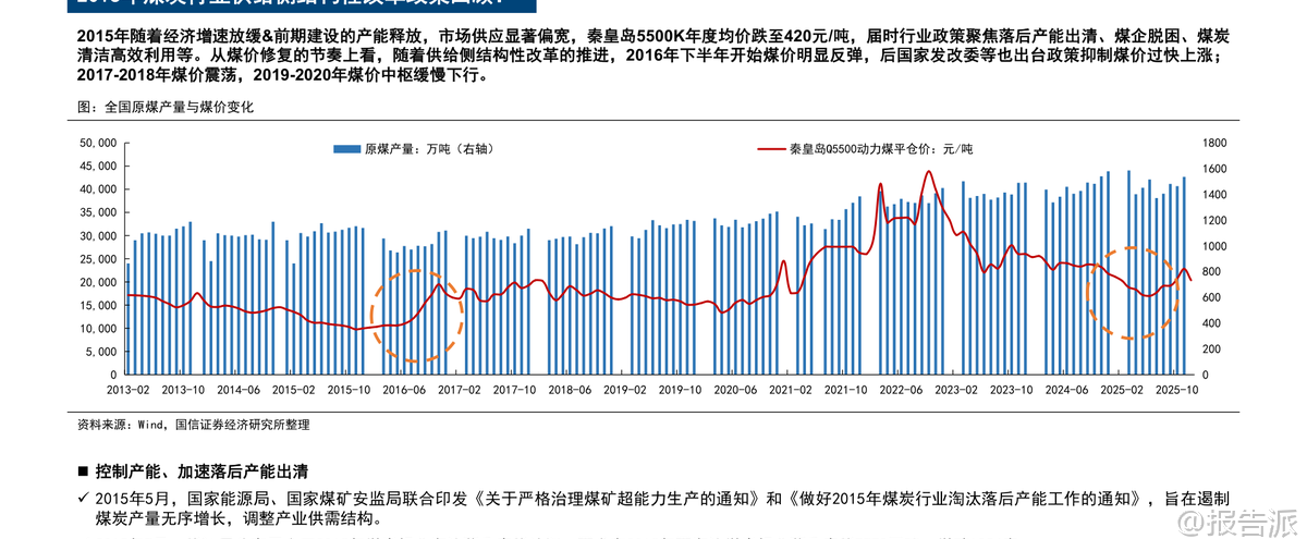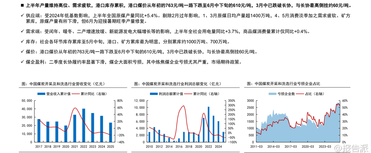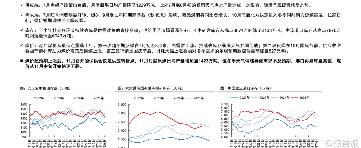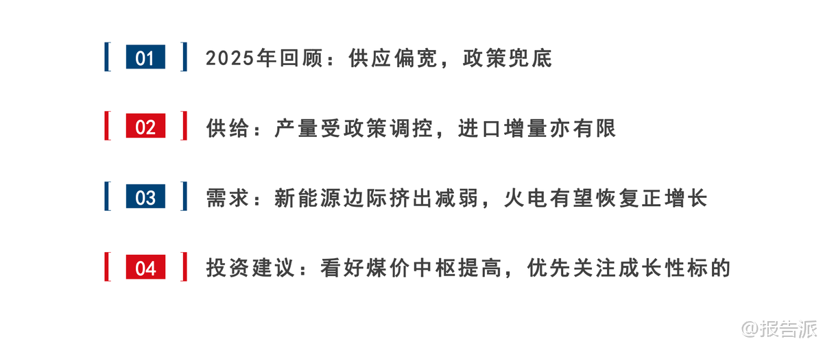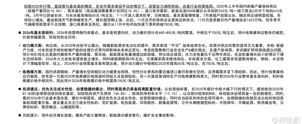 | 国信证券发布的《煤炭行业2026年度策略:改善可期,价值重塑》报告全面回顾了2025年煤炭行业的运行情况,并对2026年的供需格局、价格走势及投资机会进行了系统研判。 整体来看,2025年煤炭市场呈现“供应偏宽、政策兜底”的特征,在需求疲软的背景下,政策通过查超产、保供调控等方式主导市场节奏,煤价经历大幅波动后逐步企稳。 2025年行情回顾显示,上半年原煤产量同比增加5.4%,而商品煤消费量仅同比增长0.4%,导致港口库存持续累积,秦皇岛5500K动力煤价格从年初763元/吨一路下跌至6月中下旬的610元/吨,一度跌破长协价。 进入7月后,随着查超产政策出台和极端天气影响生产,供应明显收缩,叠加旺季用电需求回升,煤价震荡反弹,最高涨至827元/吨。 但11月保供会议后产量恢复,叠加冬季气温偏暖致需求不及预期,煤价再度快速回落并跌破700元/吨。 炼焦煤方面也呈现类似走势,全年价格在供需博弈中宽幅震荡。 展望2026年,行业基本面有望改善。 动力煤方面,预计供应端受安全生产政策、老旧煤矿退出及核增产能手续限制等因素影响,国内年产量峰值或在48亿吨左右,增长空间有限。 需求端,新能源发电增速边际放缓,水电增长空间受限,火电有望恢复正增长,同时化工用煤维持增长,钢铁、水泥耗煤下滑幅度收窄,支撑煤炭需求维持高位。 综合判断,2026年动力煤价格中枢预计提升至750元/吨左右,在650-850元/吨区间震荡。 炼焦煤方面,国内资源稀缺且增量有限,虽蒙古进口煤性价比高带来一定供给压力,但在2025年价格探底、政策调控加强及行业整体向好背景下,价格中枢有望回升约100元/吨,阶段性机会值得关注。 政策层面仍是影响煤炭行业的重要变量。 2025年“查超产”政策显著抑制了供应释放,未来安检力度的持续性、未完成核增手续产能的处理方式等将直接影响供给弹性。 此外,煤炭产能储备制度建设、智能化发展推进以及清洁高效利用政策也将长期塑造行业格局。 进口方面,印尼、澳大利亚煤炭出口受限,俄罗斯煤面临物流与地缘挑战,而蒙古煤因通关能力提升和长协落地有望保持增长,成为进口结构性亮点。 投资建议方面,报告指出尽管2025年煤价中枢下行,但煤炭板块仍展现出优异的财务稳健性,Q1-Q3资产负债率仅为46.8%,净利率达12.1%,ROE相对较高。 看好2026年行业基本面改善带来的估值修复机会,建议优先关注成长性强、经营稳健的龙头企业。 重点推荐三类标的:一是具备产能扩张潜力的成长性企业,如兖矿能源、电投能源、华阳股份、新集能源;二是资产优质、分红稳定的中长期稳健型标的,包括中国神华、中煤能源、陕西煤业;三是业绩弹性较大的标的,如晋控煤业、山煤国际。 在当前低利率环境下,高股息龙头仍具较高配置价值。 风险提示包括海外经济放缓拖累需求、煤炭产能超预期释放、新能源加速替代以及煤矿安全事故等潜在冲击。 总体而言,2026年煤炭行业或将迎来供需再平衡下的价值重塑阶段,政策调控与结构性机会并存,具备核心竞争力的优质煤企有望持续受益。 本文由【报告派】研读,输出观点仅作为行业分析! 原文标题:原文标题:2026-01-12-国信证券-国信证券-煤炭行业2026年度策略:改善可期,价值重塑 发布时间:2026年 报告出品方:国信证券 文档页数:41页