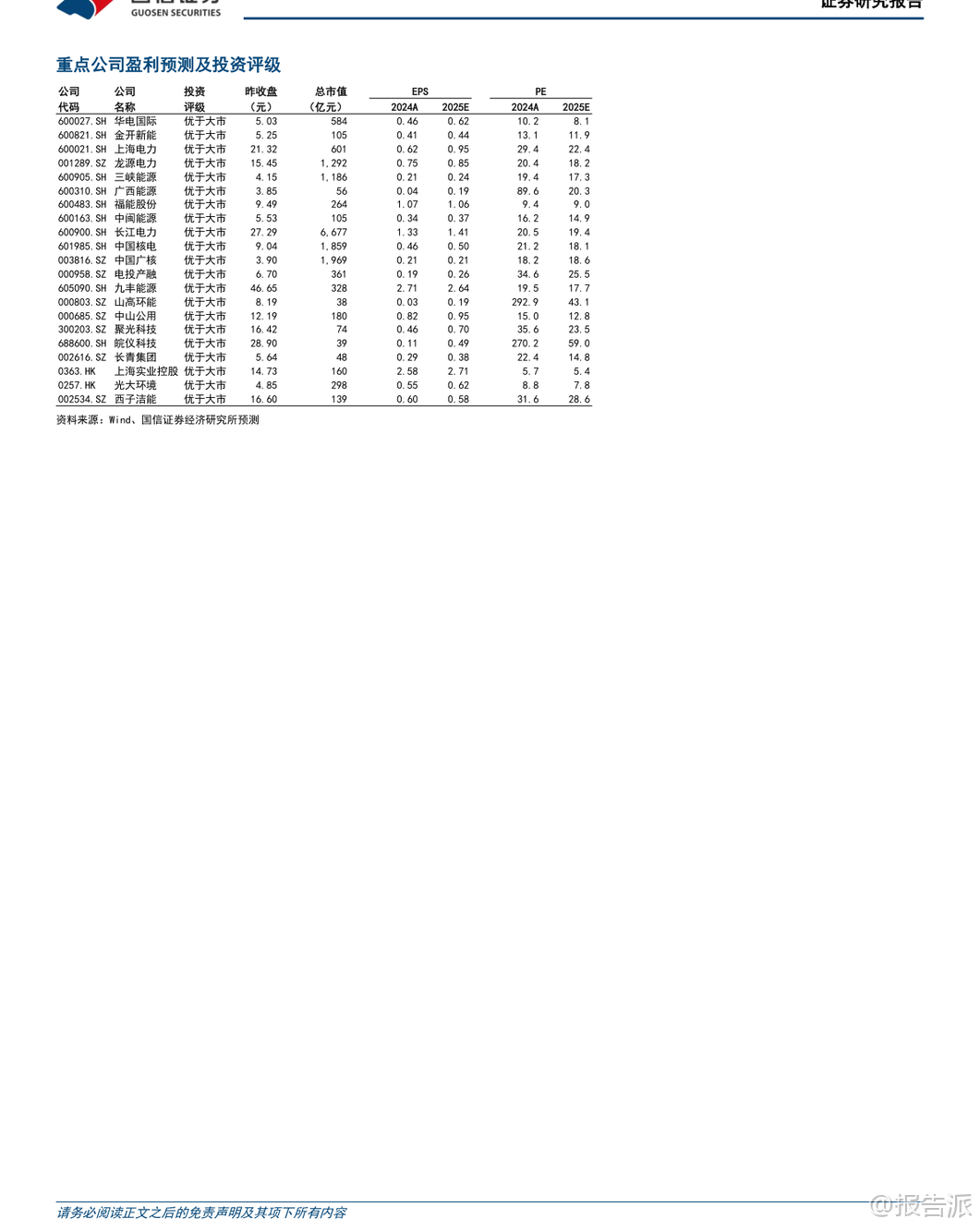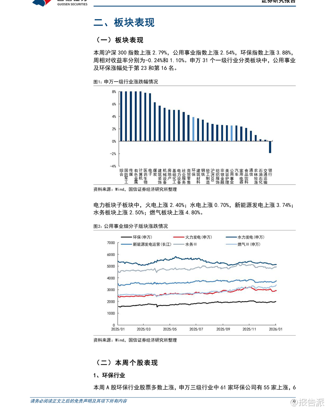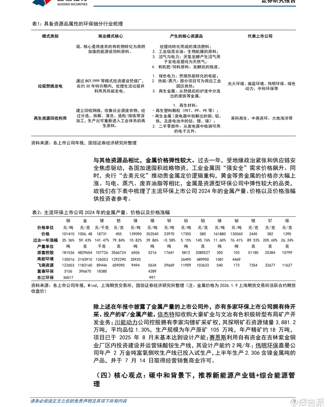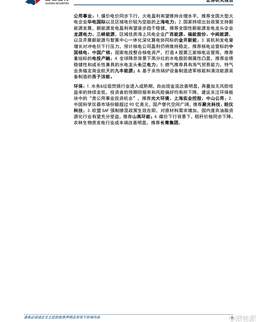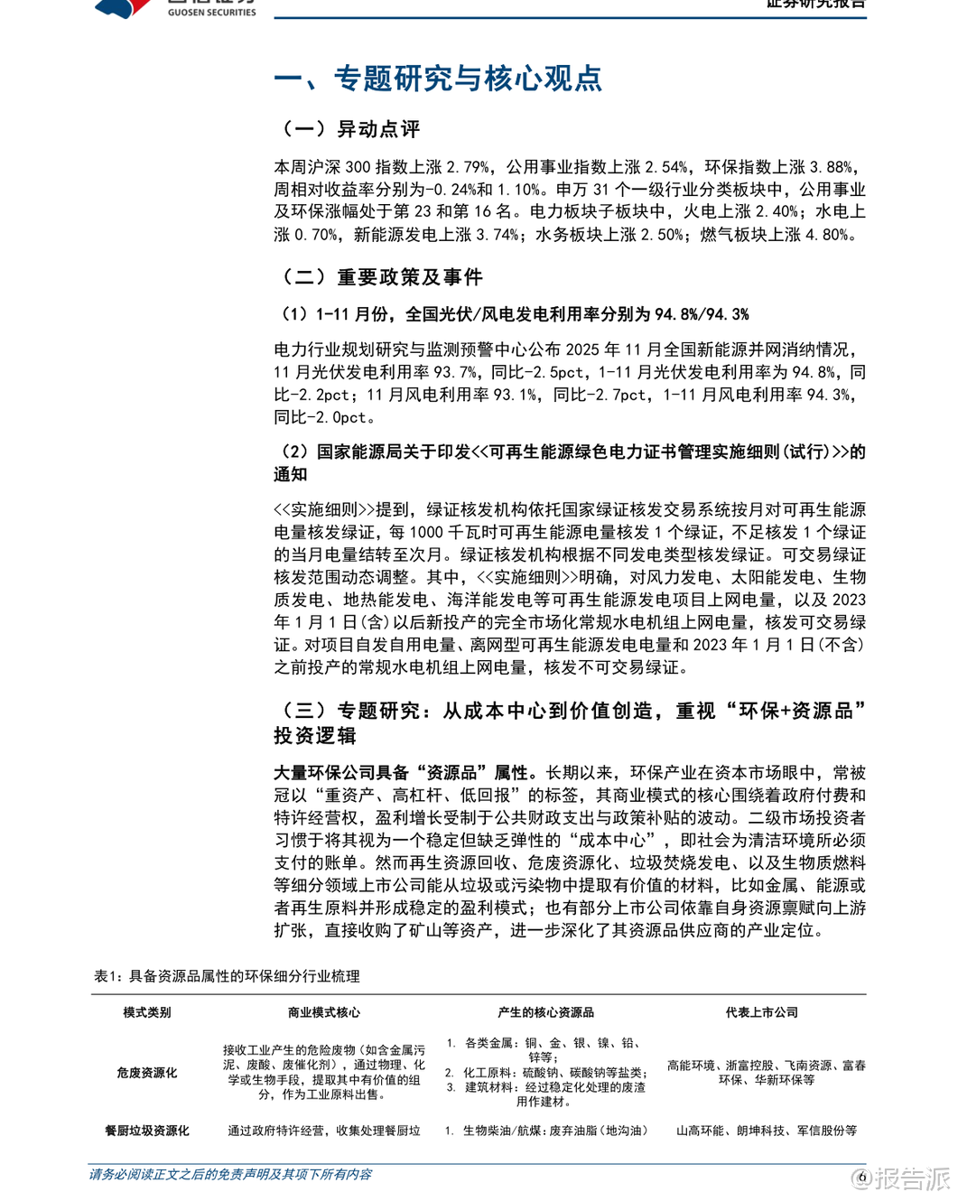| 近日,国信证券发布《公用环保行业202601第2期》研究报告,围绕2025年1-11月电力与环保行业运行数据、政策动态及投资策略进行了系统梳理。 报告指出,在碳中和背景下,新能源发展持续推进,但光伏与风电的发电利用率出现同比下滑,凸显消纳压力加大;与此同时,“环保+资源品”投资逻辑正逐步从成本中心向价值创造转型,成为行业新亮点。 在电力生产方面,2025年1-11月全国规模以上工业发电量达8.86万亿千瓦时,同比增长2.4%。 其中,火电由前期增长转为下降,水电、核电、太阳能和风电均实现不同程度增长。 特别值得关注的是,尽管风光装机容量快速扩张——截至11月底,太阳能发电装机达11.6亿千瓦(同比+41.9%),风电达6.0亿千瓦(同比+22.4%),但其发电利用率却双双下滑。 数据显示,2025年1-11月光伏发电利用率为94.8%,同比下降2.2个百分点;风电利用率为94.3%,同比下降2.0个百分点。 这一趋势反映出随着新能源渗透率提升,电网调峰能力、跨区输送和储能配套等消纳机制面临更大挑战。 用电端数据显示,全社会用电量保持稳健增长。 2025年1-11月累计用电量达9.46万亿千瓦时,同比增长5.2%。 第三产业尤其是信息传输、软件和信息技术服务业以及充换电服务业用电增速显著,分别同比增长16.8%和48.3%,体现数字经济与新能源汽车的快速发展对电力需求的强劲拉动。 此外,电力市场化交易持续扩大,前11个月市场交易电量占全社会用电量比重达63.7%,同比提升1.3个百分点,表明电力体制改革正稳步推进。 在环保领域,报告提出应重视“环保+资源品”的投资新逻辑。 传统上,环保企业被视为依赖政府付费的“成本中心”,但越来越多企业通过危废资源化、再生资源回收、垃圾焚烧发电等方式,将废弃物转化为金属、能源、再生材料等高价值资源,具备了资源品属性。 特别是金属品类,受地缘政治与供应链安全影响,铜、金、银、镍等价格在过去一年大幅上涨,部分环保公司因此获得显著业绩弹性。 例如,浙富控股、高能环境、飞南资源等企业在年报中披露了可观的金属产量,且多个公司正积极布局矿山资产或建设金属提纯产线,进一步强化资源供给能力。 政策层面,多项重要文件陆续出台。 国家能源局印发《可再生能源绿色电力证书管理实施细则(试行)》,明确风、光、生物质等项目上网电量可核发可交易绿证,为绿电环境价值变现提供制度保障。 财政部则宣布自2026年4月起取消光伏产品出口退税,并逐步下调电池产品退税率,可能对相关出口企业造成短期压力,但也意在引导产业高质量发展。 工信部召开动力与储能电池座谈会,强调规范产能建设、遏制低价竞争,有助于行业长期健康发展。 基于上述分析,国信证券提出六大公用事业投资方向:一是煤价电价同步下行背景下关注火电盈利稳定性,推荐华电国际、上海电力;二是看好新能源发电龙头企业及区域海上风电标的,如龙源电力、三峡能源、福能股份、金开新能;三是核电装机增长对冲电价波动,推荐中国核电、中国广核及重组中的电投产融;四是高分红水电股具备防御属性,重点推荐长江电力;五是燃气领域关注具备海气贸易与特气业务优势的九丰能源;六是装备制造转型方向,推荐西子洁能。 环保方面则建议关注现金流改善的“类公用事业”标的如光大环境、中山公用,科学仪器国产替代的聚光科技、皖仪科技,受益欧盟可持续航空燃料(SAF)政策的山高环能,以及秸秆成本下降利好下的农林生物质发电企业长青集团。 总体来看,2025年公用环保行业在结构性变化中孕育新机遇。 一方面,新能源消纳问题日益突出,倒逼电网升级与灵活性资源配置;另一方面,环保产业正从末端治理向资源循环延伸,部分企业已具备资源品供应商特征,估值逻辑有望重塑。 未来,在政策支持、技术进步与市场需求多重驱动下,兼具稳定现金流与资源价值弹性的标的或将受到资本市场更多青睐。 本文由【报告派】研读,输出观点仅作为行业分析! 原文标题:原文标题:2026-01-13-国信证券-国信证券-公用环保行业202601第2期:2025年1-11月光伏/风电发电利用率同比下滑,重视“环保+资源品”投资逻辑 发布时间:2026年 报告出品方:国信证券