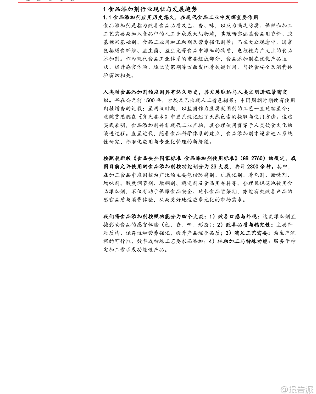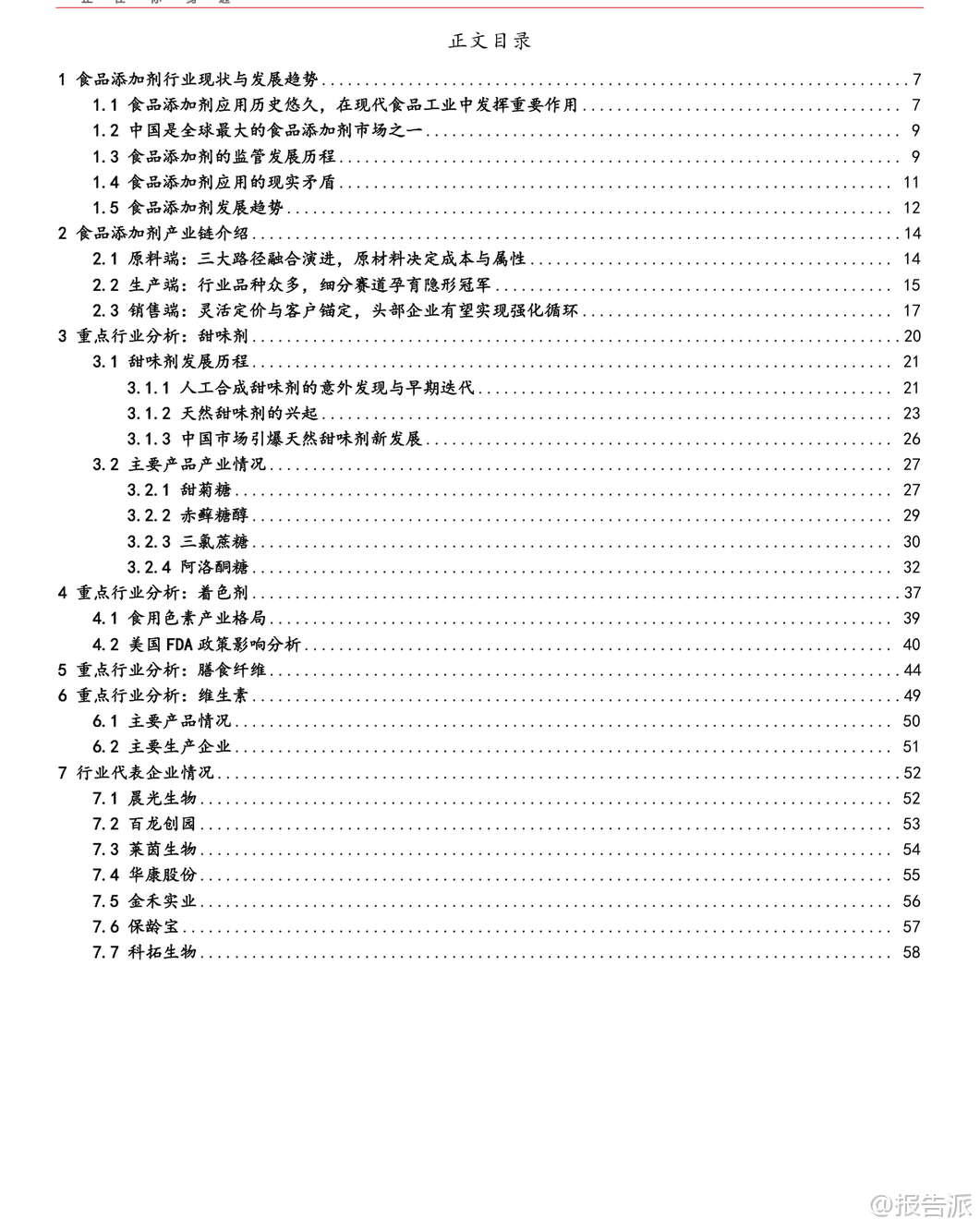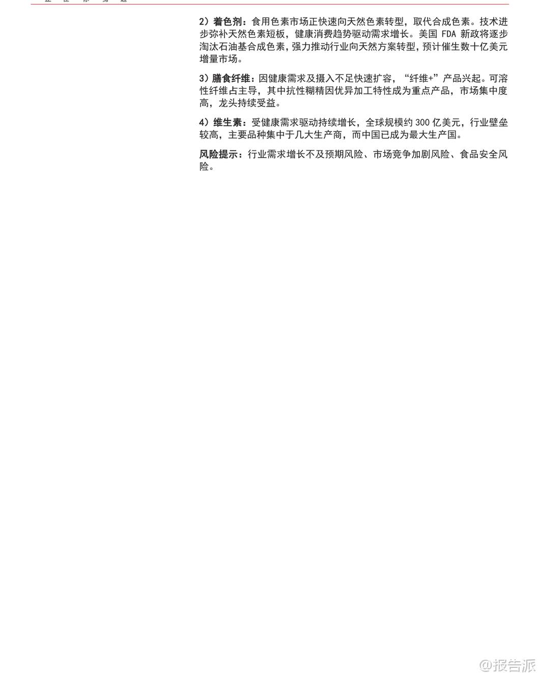 | 食品添加剂作为现代食品工业的核心技术支撑,在保障食品安全、提升生产效率、改善产品品质及推动创新方面发挥着不可替代的作用。 我国已建立起以《食品安全法》为根本、以GB 2760《食品添加剂使用标准》为核心的科学监管体系,并通过动态修订机制不断完善,为行业健康发展提供了坚实基础。 从产业链角度看,原料端呈现化学合成、生物发酵与天然提取三大路径融合发展的格局。 化学合成依托石化产业链,具备显著规模成本优势,但在环保和消费偏好转型压力下发展受限;天然提取虽契合“清洁标签”趋势,但受限于原料供应与高昂成本,多用于高价值细分领域;生物发酵则成为最具变革潜力的技术路径,借助合成生物学可高效生产复杂天然产物,降低对稀缺资源的依赖,推动绿色制造与产品创新。 生产端呈现出“大行业、小公司”的总体分散与“细分品类、寡头垄断”的局部集中并存局面。 行业整体参与者众多,尤其在复配、提取等低门槛领域竞争激烈。 然而,在部分高壁垒赛道,已形成由少数龙头企业主导的寡头格局。 这些“隐形冠军”凭借核心技术、规模效应与持续研发投入构筑护城河,新进入者难以撼动其地位。 销售端具有两大核心特征:一是食品添加剂在终端产品中成本占比通常不足10%,赋予上游企业较强的成本传导能力;二是下游大型食品饮料厂商对供应商实行极其严格且漫长的认证流程,涵盖品质、安全、稳定性及技术服务等多维度,一旦建立合作关系便形成高转换成本的深度绑定。 这种高客户粘性叠加法规、环保与资金门槛提升,推动市场份额持续向龙头集中,形成“份额扩大→成本优势增强→研发服务能力提升→客户关系更稳固”的正向强化循环,行业集中化趋势日益明确。 当前行业面临规范应用与公众认知之间的矛盾。 一方面,生产端仍存在超范围、超限量使用添加剂的隐患,尤其在中小作坊式企业中监管执行难度较大;另一方面,消费端受“零添加”营销影响,普遍存在对合法合规添加剂的误解与恐慌,将非食用物质与国家批准使用的食品添加剂混为一谈,制约了行业的健康发展。 未来行业将聚焦三大发展趋势:一是天然化,顺应消费者对“清洁标签”的追求,天然色素、甜味剂等将迎来快速增长;二是功能化,消费者对健康诉求提升,推动益生元、膳食纤维等功能性成分需求上升;三是智能化,合成生物学与人工智能技术正在重塑生产模式,实现精准发酵与智能控制,提升产率与质量稳定性。 报告重点分析了四个细分市场:1)甜味剂:健康意识崛起推动人工甜味剂向更安全的新一代产品过渡,同时天然甜味剂份额持续提升。 中国在元气森林带动下爆发,阿洛酮糖等新型功能性产品值得关注。 2)着色剂:全球正快速向天然色素转型,美国FDA新政拟逐步淘汰石油基合成色素,将强力推动行业变革,预计催生数十亿美元增量市场。 3)膳食纤维:因健康需求及摄入不足而快速扩容,“纤维+”产品兴起。 抗性糊精因其优异加工特性成为重点产品,市场集中度高,龙头企业将持续受益。 4)维生素:受健康需求驱动保持增长,全球市场规模约300亿美元,行业壁垒较高,主要品种集中于几大生产商,中国已成为全球最大生产国。 代表企业方面,晨光生物在辣椒红、叶黄素等领域全球领先;百龙创园是国内首家掌握抗性糊精量产技术的企业,并率先实现阿洛酮糖工业化;莱茵生物依托合成生物学布局高端甜菊糖苷;金禾实业是全球三氯蔗糖领导者;保龄宝为国内赤藓糖醇开创者;科拓生物拥有亚洲最大乳酸菌菌种库,居益生菌行业领先地位。 总体来看,食品添加剂行业兼具刚需与升级属性,虽体量不大但技术含量高、成长性强。 在政策引导、技术进步与消费升级多重驱动下,行业正迈向更安全、高效与可持续的发展阶段,龙头企业有望持续受益于集中度提升与结构性机遇。 本文由【报告派】研读,输出观点仅作为行业分析! 原文标题:2026-01-13-方正证券-方正证券-食品添加剂行业深度报告:兼具刚需与升级属性的小而美产业 发布时间:2026年 报告出品方:方正证券 文档页数:59页