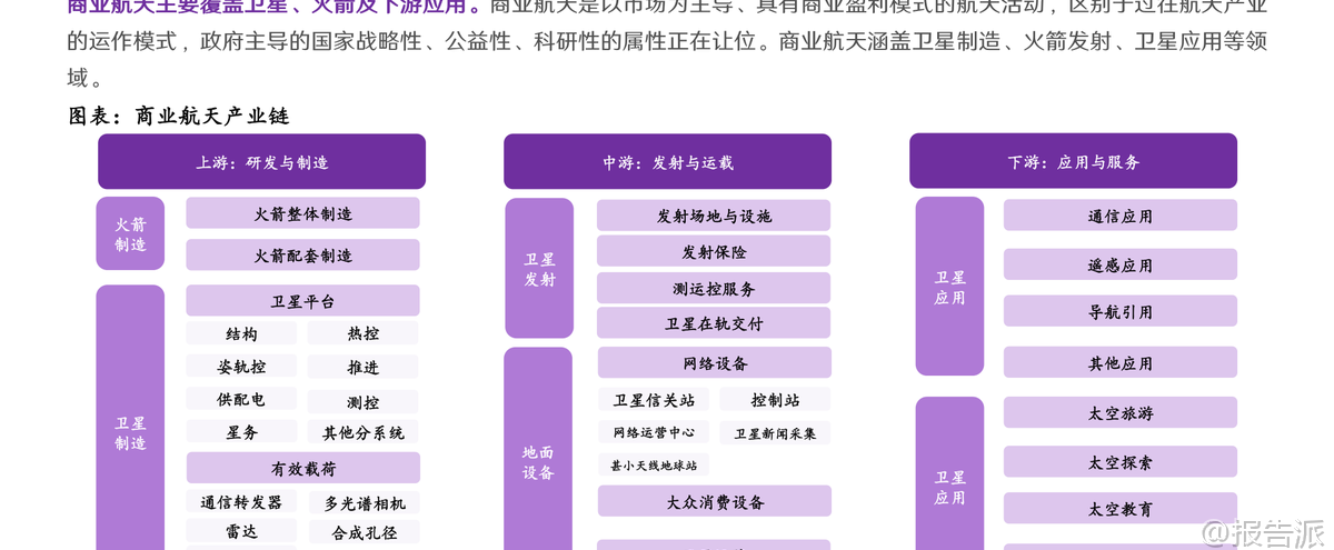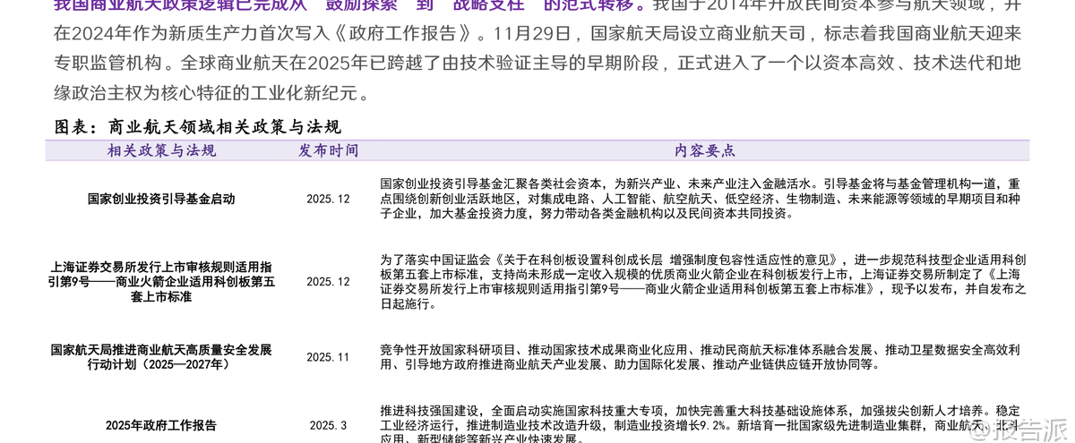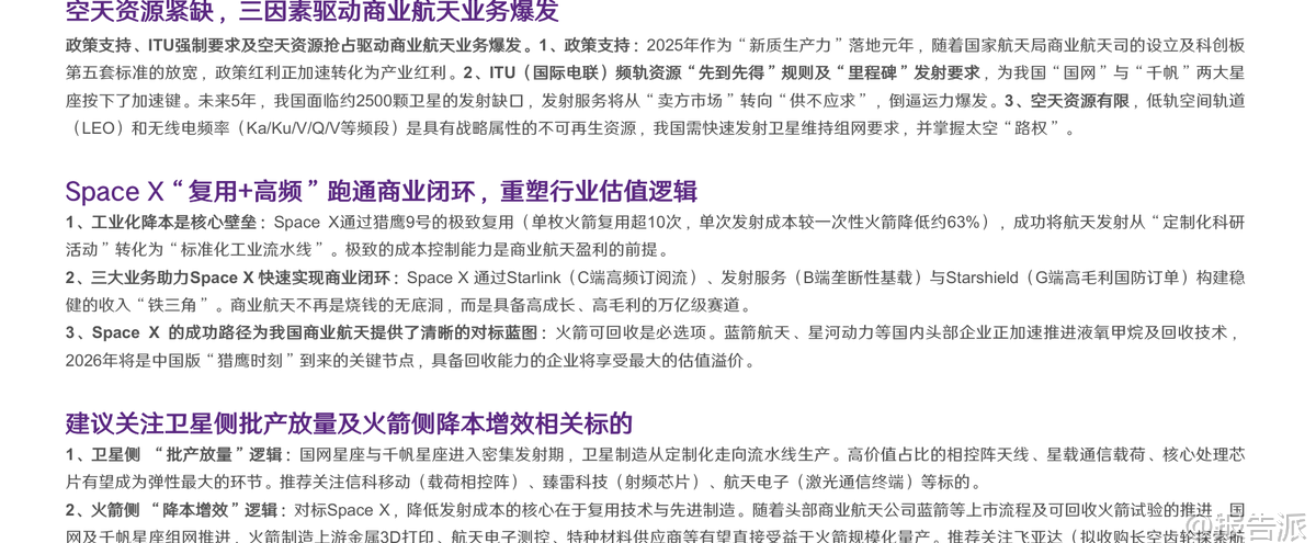 | 空天资源正成为全球科技竞争的新高地。 随着低轨卫星轨道和无线电频率等战略资源日益紧张,商业航天已从“探索性产业”迈入“工业化爆发期”。 华鑫证券最新发布的《2026年商业航天深度报告》指出,我国商业航天将在政策支持、国际规则倒逼与资源抢占三大因素驱动下迎来历史性发展机遇。 报告首先强调,空天资源具有不可再生性和“先到先得”的属性。 国际电信联盟(ITU)规定,申报的卫星星座必须在14年内完成全部发射任务,否则将面临频轨资源被削减的风险。 目前,我国已申报包括“国网星座”(星网)和“千帆星座”在内的多个大型低轨互联网星座计划,总规模超20万颗卫星。 以国网星座为例,其需在2034年前完成近1.3万颗卫星的部署,时间紧、任务重。 未来五年,我国面临约2500颗卫星的发射缺口,运力瓶颈凸显,推动火箭发射服务从“卖方市场”转向“供不应求”,倒逼国内运载能力加速提升。 与此同时,SpaceX的成功为全球商业航天提供了清晰的发展范式。 其通过猎鹰9号火箭的极致复用(单枚火箭可重复使用超10次),将单次发射成本降低63%,实现了从“科研活动”向“工业流水线”的转变。 更关键的是,SpaceX构建了Starlink(C端订阅)、发射服务(B端基载)与Starshield(G端国防)三大业务闭环,使商业航天不再只是“烧钱游戏”,而是具备高成长、高毛利的万亿级赛道。 这一模式重塑了行业估值逻辑,也为中国企业指明方向——火箭可回收技术是必选项。 在此背景下,2026年被视为中国版“猎鹰时刻”的关键节点。 蓝箭航天、星河动力、中科宇航、东方空间、天兵科技等一批民营航天企业正加速推进液氧甲烷发动机与垂直回收技术的研发与试验。 例如,蓝箭航天的朱雀三号已完成入轨验证,设计复用次数不低于20次;中科宇航的力箭系列瞄准高频发射与可重复使用;星河动力则凭借谷神星一号实现常态化发射,在全球民营火箭中名列前茅。 海南商业航天发射场已于2025年投入运营,显著提升了发射效率,为高频次组网提供基础设施保障。 投资层面,报告提出两大核心逻辑:一是卫星侧的“批产放量”,二是火箭侧的“降本增效”。 随着国网与千帆星座进入密集发射阶段,卫星制造将从定制化走向流水线生产,相控阵天线、星载通信载荷、核心处理芯片等高价值环节最具弹性。 推荐关注信科移动、臻镭科技、航天电子等标的。 二是火箭制造上游供应链将迎来爆发机遇。 对标SpaceX的工业化路径,金属3D打印、特种材料、航天电机、测控系统等先进制造领域将成为降本关键。 推荐关注铂力特(金属3D打印)、超捷股份(箭体结构)、昊志机电(航天电机)、飞亚达(拟收购航天齿轮企业)以及天汽模(参股多家商业航天公司)等产业链企业。 值得注意的是,尽管前景广阔,但行业仍面临技术研发不及预期、星座建设进度滞后、政策与地缘政治风险等挑战。 尤其是火箭回收技术的突破难度大、周期长,短期内盈利模式尚不成熟,市场竞争也在加剧。 然而,面对ITU的时间红线和国家“新质生产力”的战略定位,商业航天已上升为国家战略的一部分。 2026年至2032年,将是我国卫星互联网建设的爆发窗口期,谁能率先实现可回收火箭的技术突破并形成规模化发射能力,谁就有望在中国版“星链”竞赛中占据主导地位。 总体来看,该报告系统梳理了商业航天的全球格局、技术路径与中国机遇,认为中国商业航天正站在爆发前夜。 在政策红利、规则压力与市场需求的多重驱动下,具备核心技术与工程化能力的企业将迎来前所未有的发展空间。 这不仅是一场科技竞赛,更是一次关乎未来信息主权与太空经济主导权的战略布局。 本文由【报告派】研读,输出观点仅作为行业分析! 原文标题:2026-01-12-华鑫证券-华鑫证券-汽车行业深度报告:空天资源紧缺,商业航天业务有望爆发 发布时间:2026年 出品方:华鑫证券 文档页数:35页