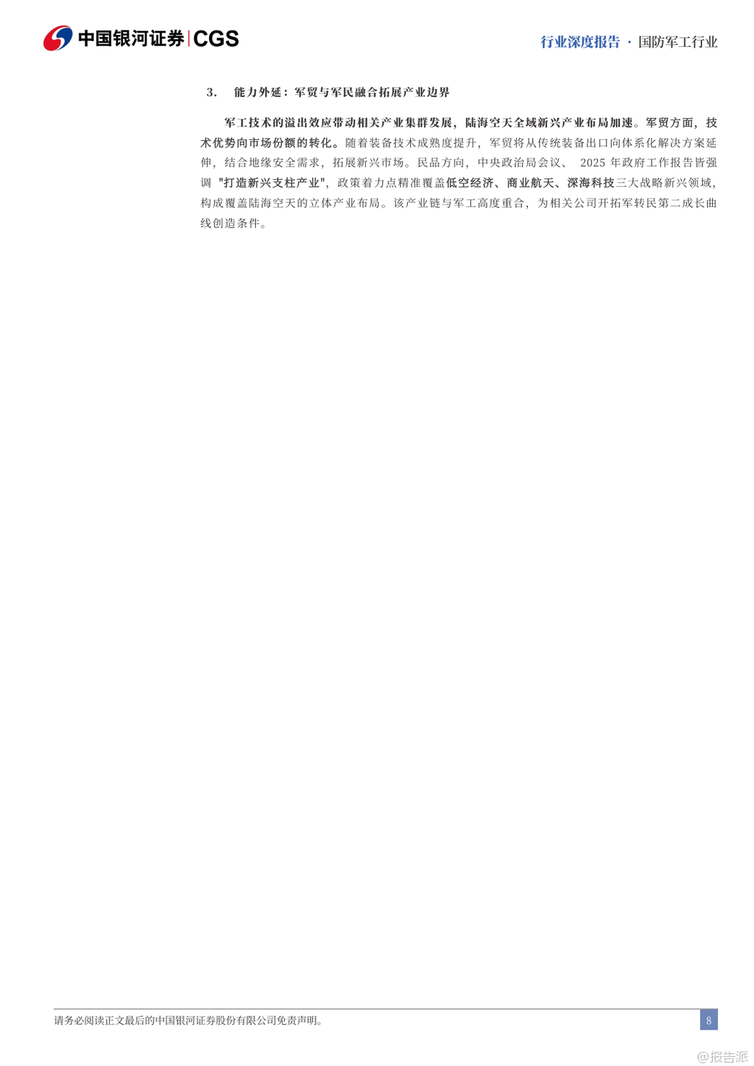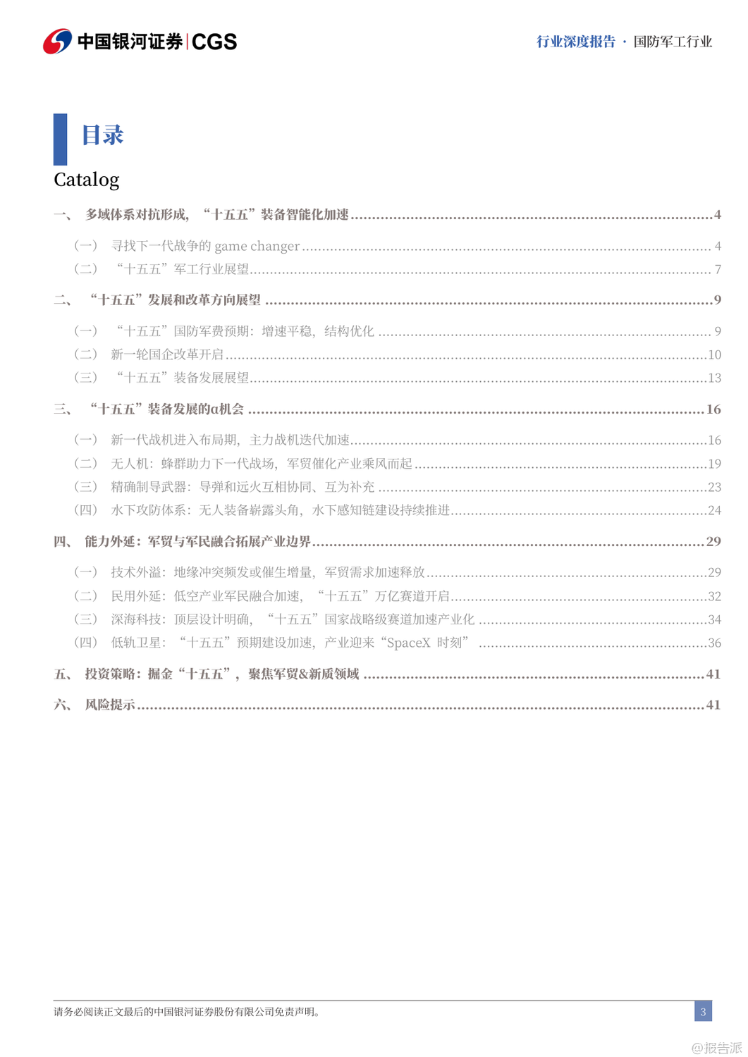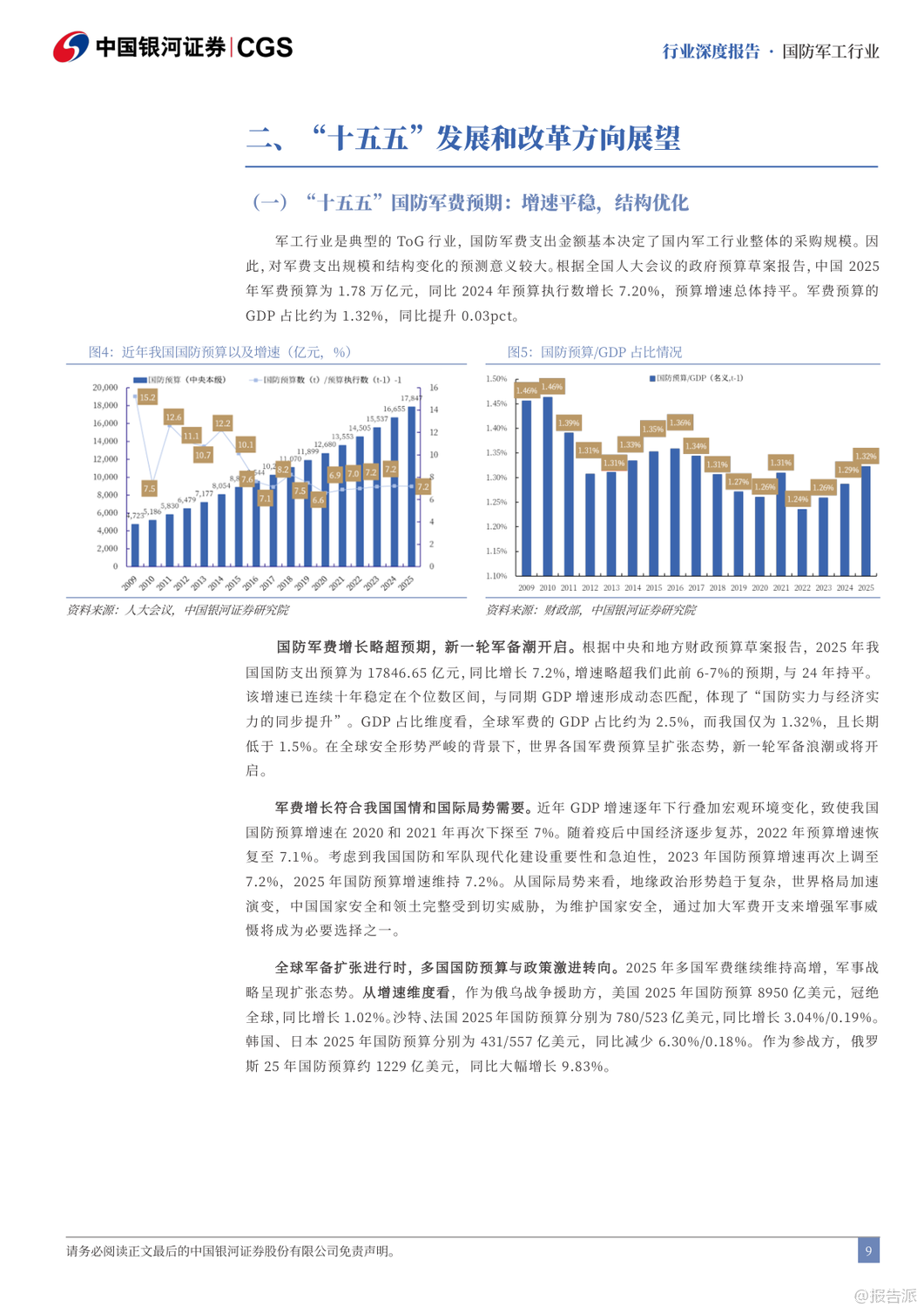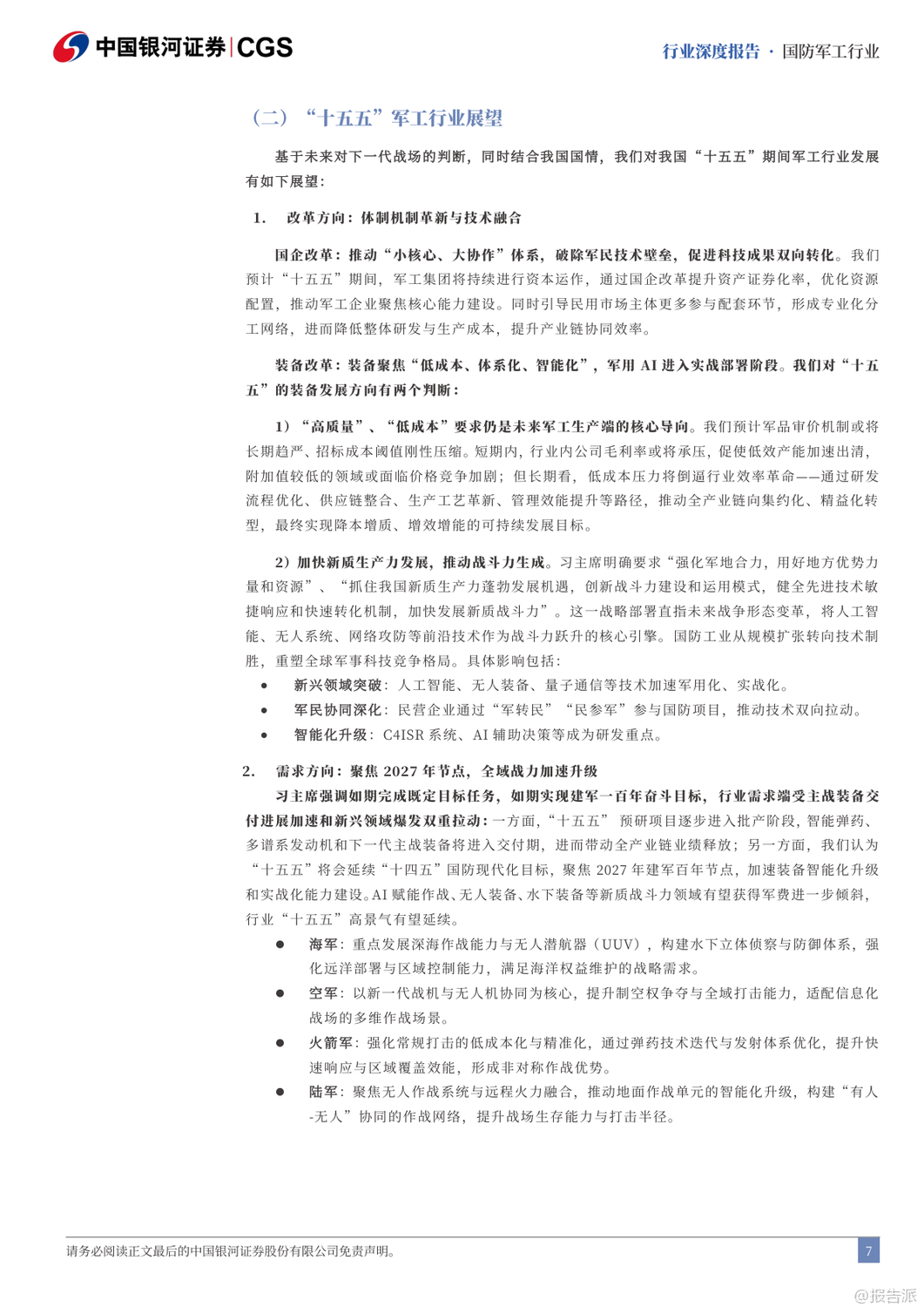 | “十五五”期间,我国国防军工产业将迎来全面升级与战略转型的关键阶段。 随着2027年建军百年目标的临近,装备现代化、智能化、体系化发展成为核心主线。 报告指出,未来战争已从“单一武器对抗”演变为“体系与体系的较量”,军用人工智能(MAI)将成为破局关键,贯穿透明战场、首次打击、蜂群作战、全域指挥等九大破局要素,推动下一代武器系统实现“系统快速重构、功能按需定义、飞行灵活变形、战力智能进化、技术持续升级”五大特征。 在发展路径上,“高质量”与“低成本”成为军工生产的双重要求。 军品审价机制趋严,成本压缩倒逼行业效率革命,推动全产业链向集约化、精益化转型。 短期虽有毛利率承压压力,但长期将加速低效产能出清,提升整体产业效能。 与此同时,预研项目进入批产阶段,智能弹药、多谱系发动机、新一代主战装备将集中交付,带动全产业链业绩释放。 改革层面,“小核心、大协作”体系加速推进,军工集团将通过资产证券化、资本运作等方式聚焦核心能力建设,提升资源配置效率。 当前中航工业、中国电子等集团资产证券化率已超60%,而航天科技、航天科工仍有较大注入空间,未来并购重组值得期待。 同时,民用市场主体将更多参与配套环节,推动军民协同与技术双向转化。 能力外延方面,军贸与军民融合成为新增长极。 军贸市场迎来“Deepseek”时刻,随着装备技术成熟,出口正从单品向体系化解决方案升级。 当前中国军贸全球份额仅2.9%,远低于美国的37.9%,主机厂国际业务占比普遍低于5%,对比洛克希德·马丁26%的军贸收入占比,存在3-4倍增长空间。 巴基斯坦等传统客户实战验证了中式装备体系优势,沙特等新兴市场合作意愿上升,军贸潜力巨大。 民用领域聚焦“低空经济、商业航天、深海科技”三大战略方向。 低空经济已纳入政府工作报告,eVTOL、无人机物流、应急救援等场景加速落地,2035年市场规模有望达3.5万亿元。 商业航天方面,中国星网与“千帆星座”低轨卫星建设提速,ITU频率申报倒计时推动组网加速,2031-2032年行业增量市场或达1400亿元/年。 深海科技首次写入国家战略,UUV、深海探测、海底数据中心等产业化进程加快。 投资策略上,建议聚焦五大方向:军贸弹性标的如中航沈飞、航天彩虹;低空+航天+深海科技政策催化标的如航天电子、中科海讯;导弹产业链β品种如航天电器、长盈通;军机航发α赛道如智明达、航宇科技;以及AI+赋能的中科星图、邦彦技术。 风险方面需关注改革不及预期、军审定价压力、订单波动及竞争加剧等挑战。 总体来看,“十五五”将是军工产业从规模扩张迈向技术引领、从国内供给走向全球竞争的关键十年。 出品方:银河证券 发布时间:2025年 文档页数:49页