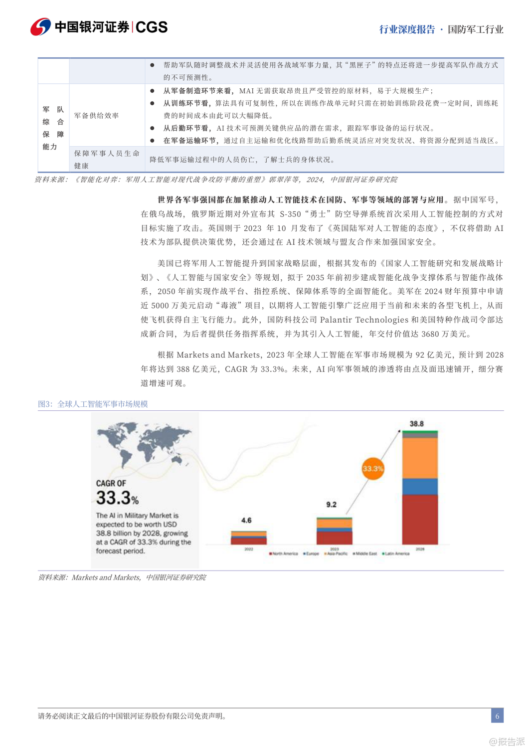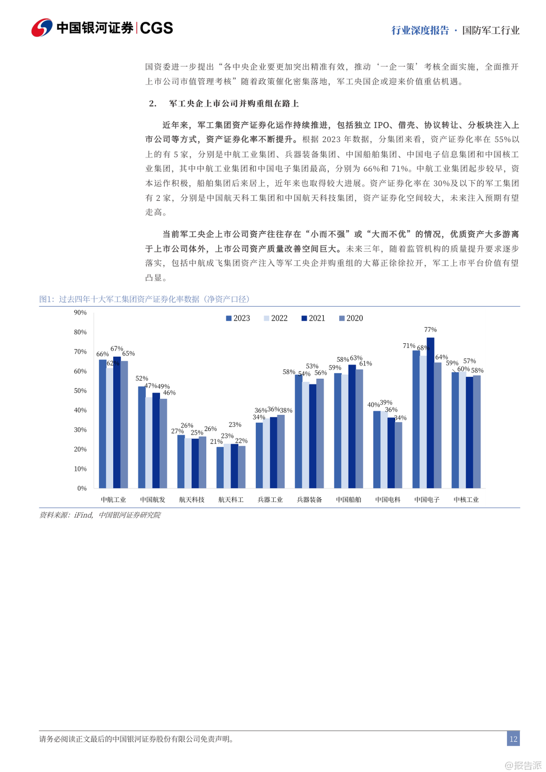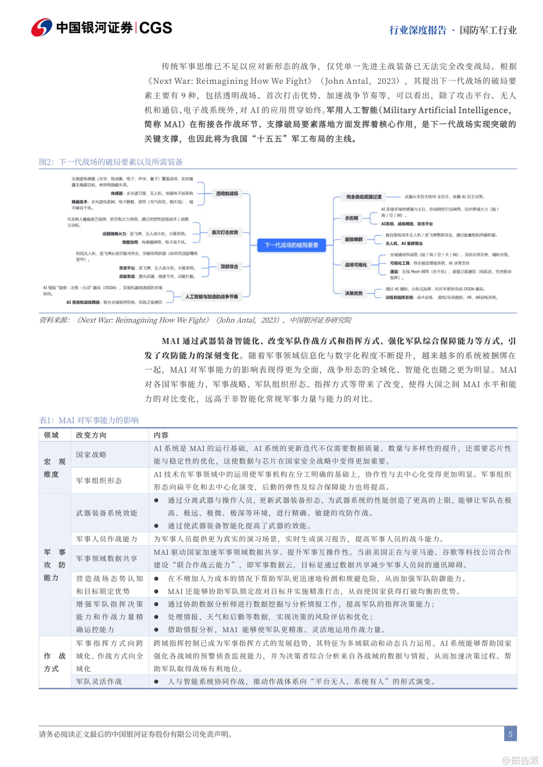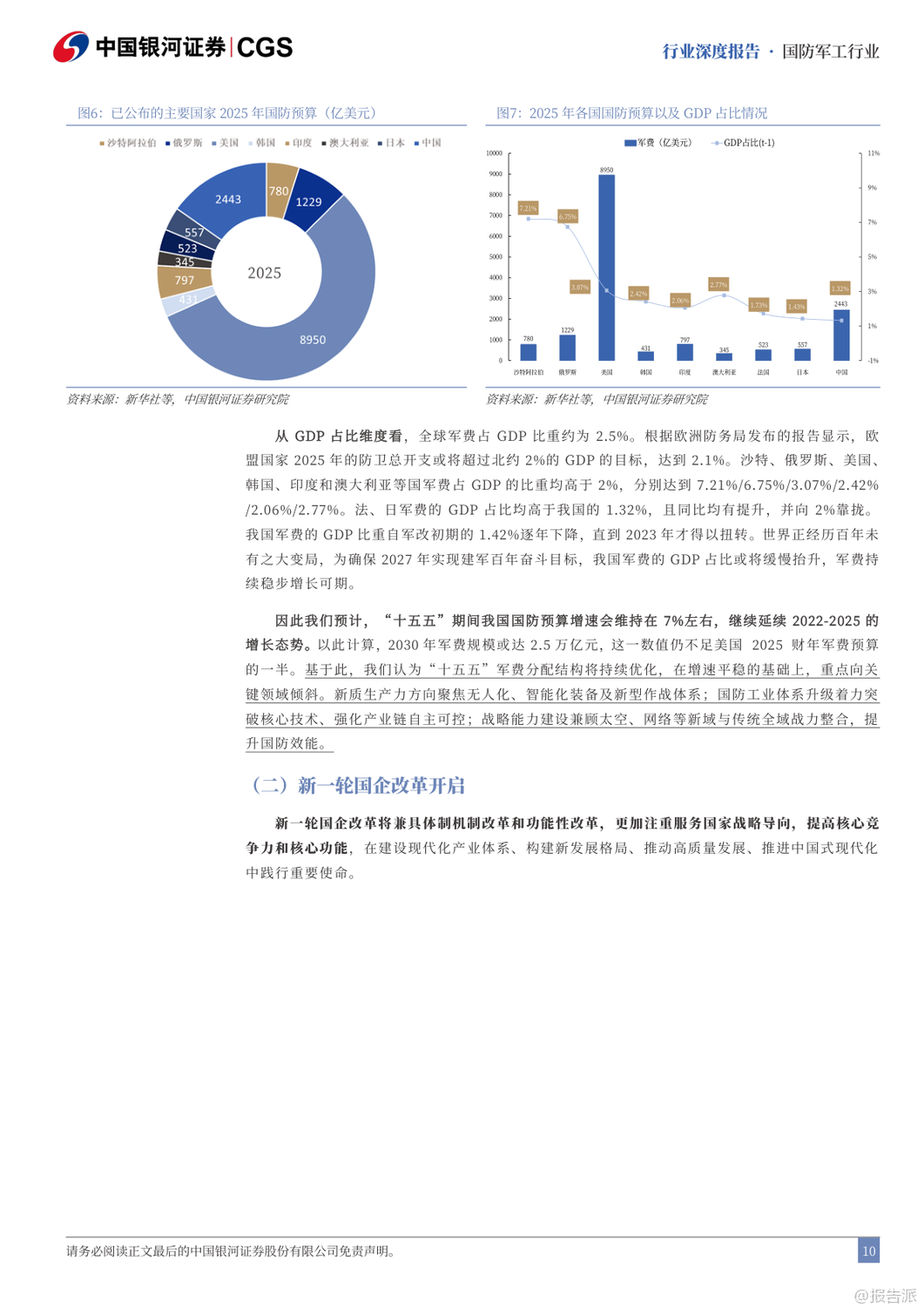 | “十五五”期间,我国国防军工产业将迎来全面升级与战略转型的关键阶段。 随着2027年建军百年目标的临近,装备现代化、智能化、体系化发展成为核心主线。 报告指出,未来战争已从“单一武器对抗”演变为“体系与体系的较量”,军用人工智能(MAI)将成为破局关键,贯穿透明战场、首次打击、蜂群作战、全域指挥等九大破局要素,推动下一代武器系统实现“系统快速重构、功能按需定义、飞行灵活变形、战力智能进化、技术持续升级”五大特征。 在发展路径上,“高质量”与“低成本”成为军工生产的双重要求。 军品审价机制趋严,成本压缩倒逼行业效率革命,推动全产业链向集约化、精益化转型。 短期虽有毛利率承压压力,但长期将加速低效产能出清,提升整体产业效能。 与此同时,预研项目进入批产阶段,智能弹药、多谱系发动机、新一代主战装备将集中交付,带动全产业链业绩释放。 改革层面,“小核心、大协作”体系加速推进,军工集团将通过资产证券化、资本运作等方式聚焦核心能力建设,提升资源配置效率。 当前中航工业、中国电子等集团资产证券化率已超60%,而航天科技、航天科工仍有较大注入空间,未来并购重组值得期待。 同时,民用市场主体将更多参与配套环节,推动军民协同与技术双向转化。 能力外延方面,军贸与军民融合成为新增长极。 军贸市场迎来“Deepseek”时刻,随着装备技术成熟,出口正从单品向体系化解决方案升级。 当前中国军贸全球份额仅2.9%,远低于美国的37.9%,主机厂国际业务占比普遍低于5%,对比洛克希德·马丁26%的军贸收入占比,存在3-4倍增长空间。 巴基斯坦等传统客户实战验证了中式装备体系优势,沙特等新兴市场合作意愿上升,军贸潜力巨大。 民用领域聚焦“低空经济、商业航天、深海科技”三大战略方向。 低空经济已纳入政府工作报告,eVTOL、无人机物流、应急救援等场景加速落地,2035年市场规模有望达3.5万亿元。 商业航天方面,中国星网与“千帆星座”低轨卫星建设提速,ITU频率申报倒计时推动组网加速,2031-2032年行业增量市场或达1400亿元/年。 深海科技首次写入国家战略,UUV、深海探测、海底数据中心等产业化进程加快。 投资策略上,建议聚焦五大方向:军贸弹性标的如中航沈飞、航天彩虹;低空+航天+深海科技政策催化标的如航天电子、中科海讯;导弹产业链β品种如航天电器、长盈通;军机航发α赛道如智明达、航宇科技;以及AI+赋能的中科星图、邦彦技术。 风险方面需关注改革不及预期、军审定价压力、订单波动及竞争加剧等挑战。 总体来看,“十五五”将是军工产业从规模扩张迈向技术引领、从国内供给走向全球竞争的关键十年。 出品方:银河证券 发布时间:2025年 文档页数:49页