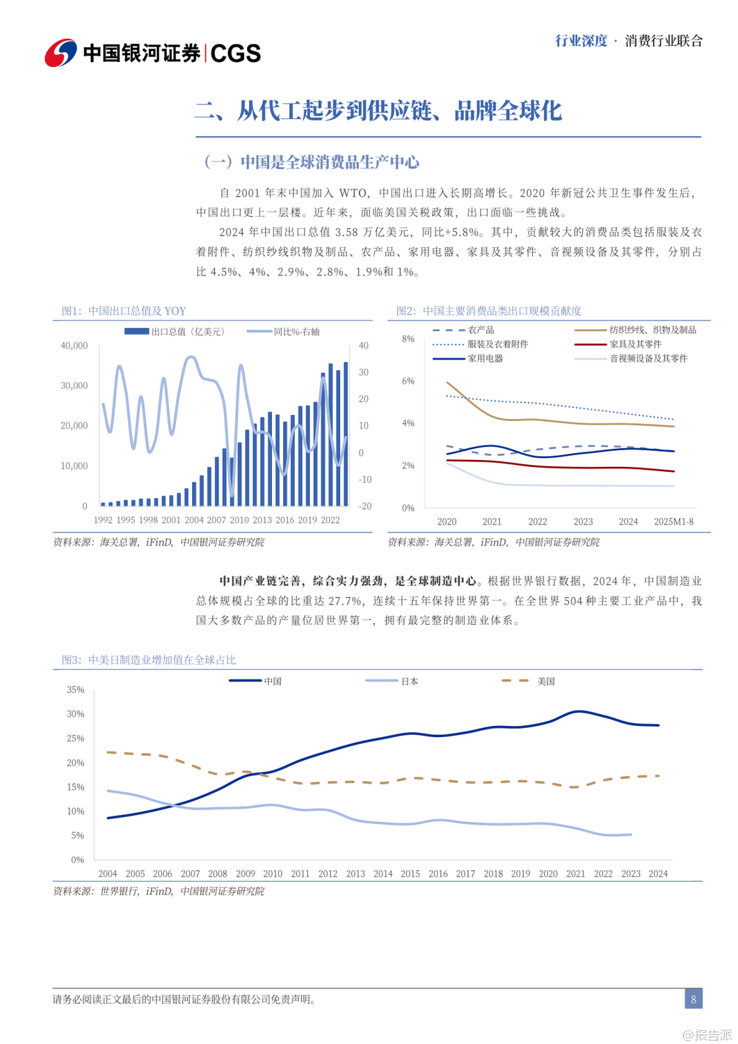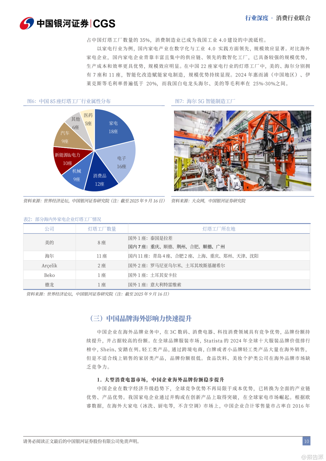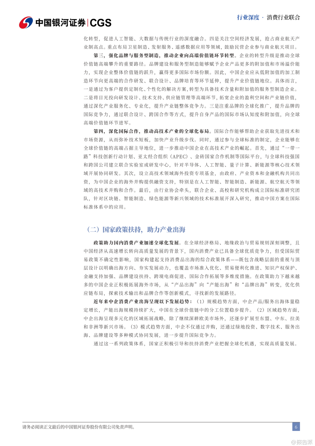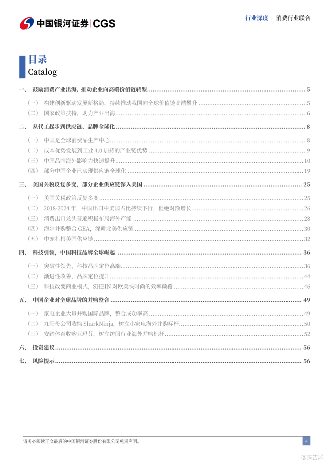 | 中国消费产业正迈向全球化发展的关键阶段,尤其是在“十五五”规划即将开启(2026-2030年)的背景下,政策导向正从以往侧重生产转向生产与消费并重。 面对国内“有效需求不足”的挑战,推动消费产业出海已成为增强中国经济韧性的重要路径。 报告指出,中国消费产业不仅具备强大的内销能力,更在多个领域展现出显著的全球竞争优势,尤其在制造型“硬消费”和新兴“软消费”两个维度上实现双轮驱动。 “硬消费”领域,以家电、3C数码、汽车、纺织服装、电动工具等为代表的中国制造,已从早期的成本优势,全面升级为依托工业4.0和数字化的产业链效率优势。 中国家电产业智能制造能力全球领先,美的、海尔拥有多座“灯塔工厂”,其生产效率和成本控制远超欧美同行。 面对美国关税政策的反复无常,龙头企业如美的、海尔、TCL、三花智控等早已实现全球供应链布局,通过在东南亚、墨西哥等地建厂,有效规避贸易风险。 更值得关注的是,中国企业正通过技术领先实现品牌高端化。 大疆的消费级无人机、石头科技和科沃斯的扫地机器人、影石的全景相机、九号的智能割草机等,凭借突破性技术创新,在欧美市场成功树立了高端品牌形象,价格和市场份额均反超传统欧美品牌。 与此同时,“软消费”领域也迎来了历史性突破。 过去被认为缺乏国际影响力的互联网、电子游戏、潮玩文创、现制饮品、长视频/短视频等内容形态,正通过TikTok、SHEIN、米哈游等平台和品牌实现全球级传播。 SHEIN更是通过数字化重构的“小单快返”柔性供应链,颠覆了欧美传统快时尚巨头的运营模式,成为全球领先的时尚在线零售商。 中国企业全球化的另一大特点是娴熟的国际并购整合能力。 家电领域的海尔并购GE家电、美的并购东芝家电,成功将海外品牌与本土运营相结合,实现了在美国和日本市场的领先地位。 安踏体育收购亚玛芬体育(旗下拥有始祖鸟、萨洛蒙等),则标志着中国消费品牌从“借力海外品牌拓展中国市场”转向“整合全球资源,推动被收购品牌实现全球性增长”的新阶段,展现了中国企业的全球治理能力和品牌运营经验。 报告最后给出了明确的投资建议,推荐关注具备全球竞争力的龙头企业,如家电领域的美的集团、海尔智家、石头科技;宠物食品领域的中宠股份、佩蒂股份;以及潮玩领域的泡泡玛特等。 总体来看,中国消费产业的全球化已从“产品出海”走向“品牌出海”和“资本出海”,正以制造优势、技术创新和资本力量,奋楫争先于全球市场。 出品方:银河证券 发布时间:2025年 文档页数:56页
