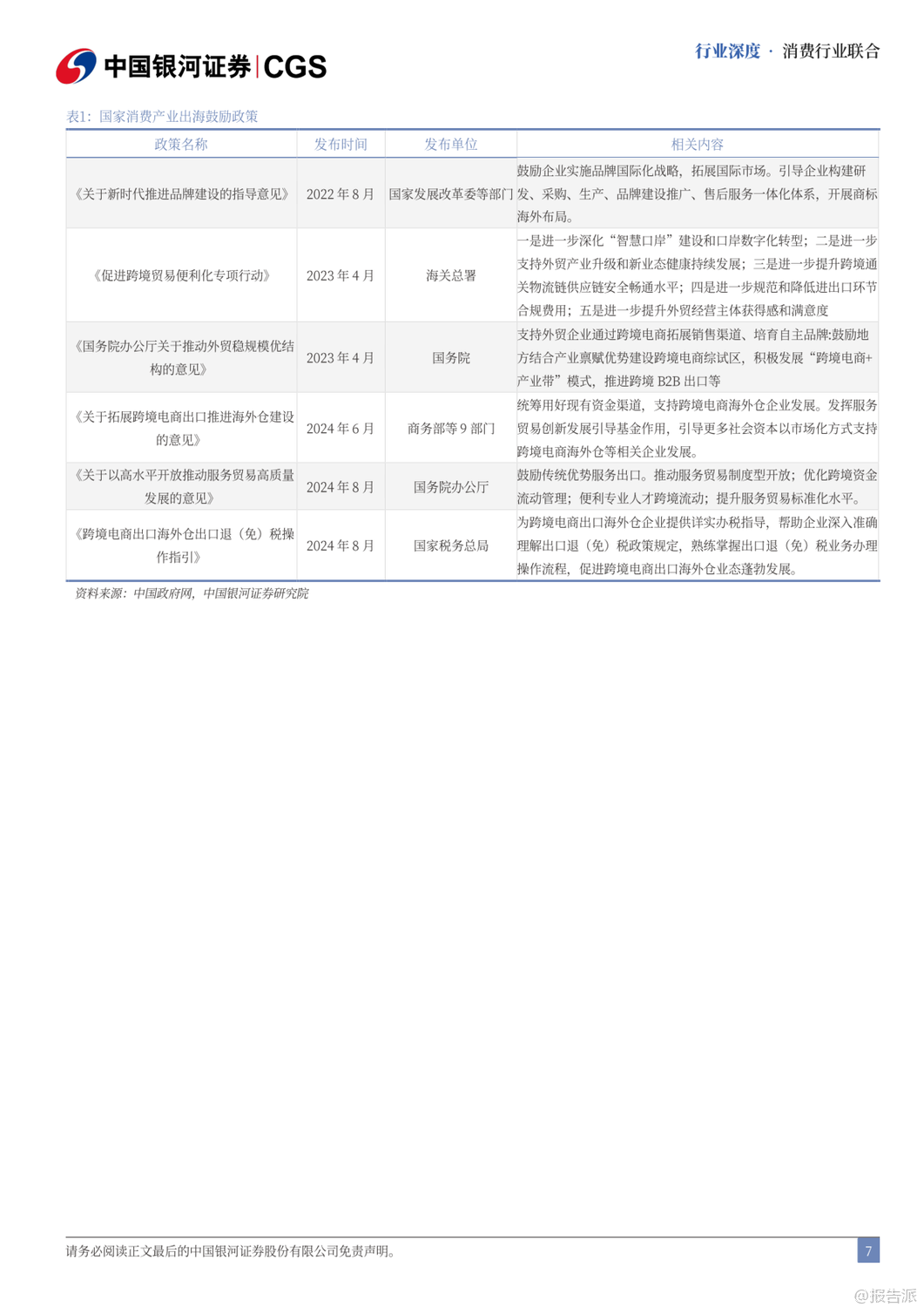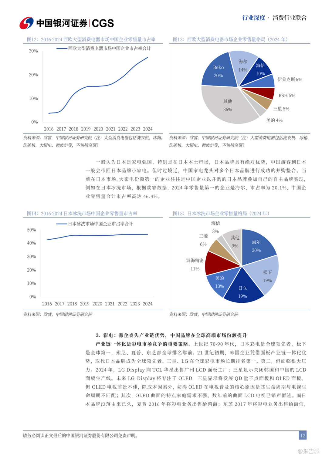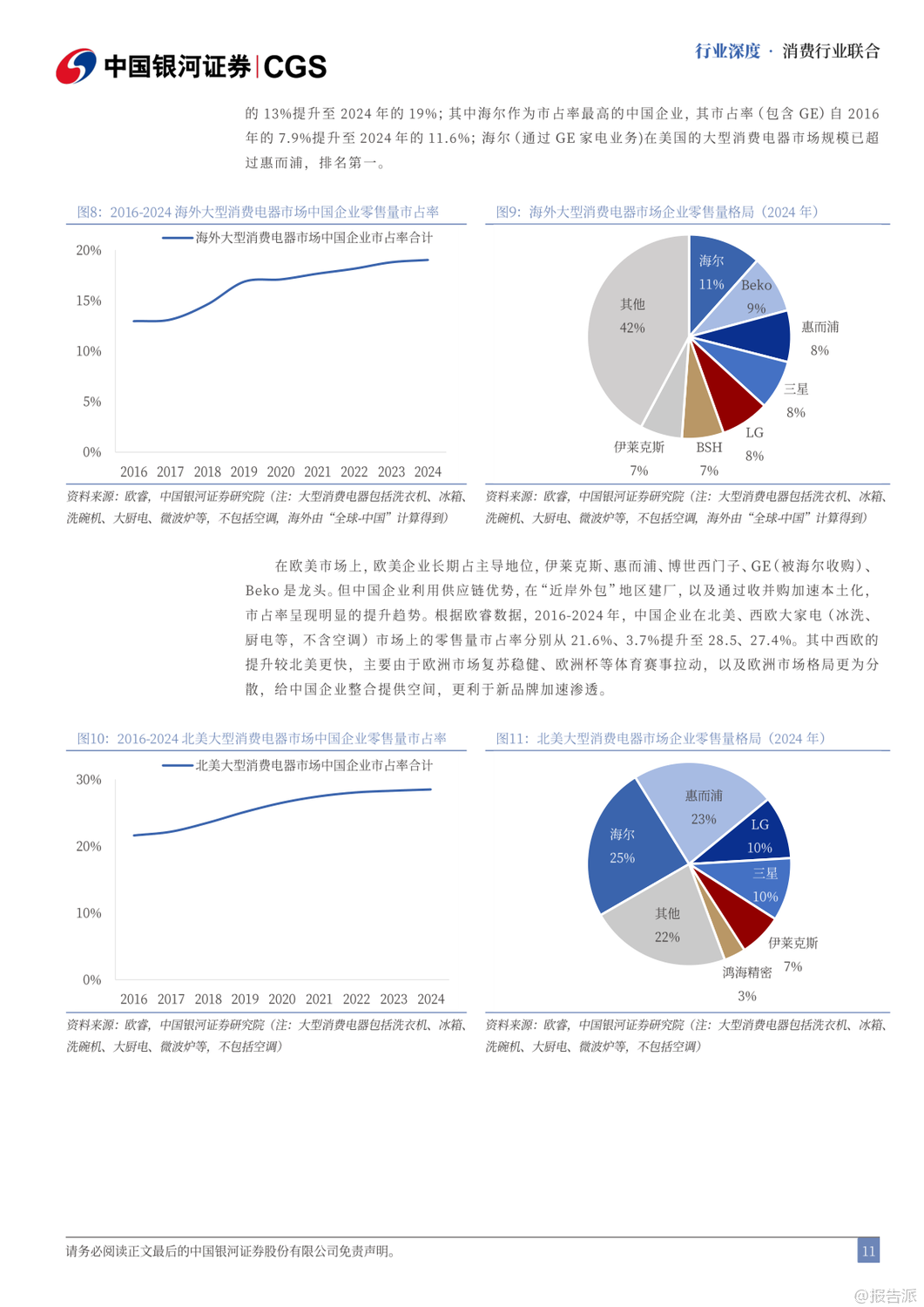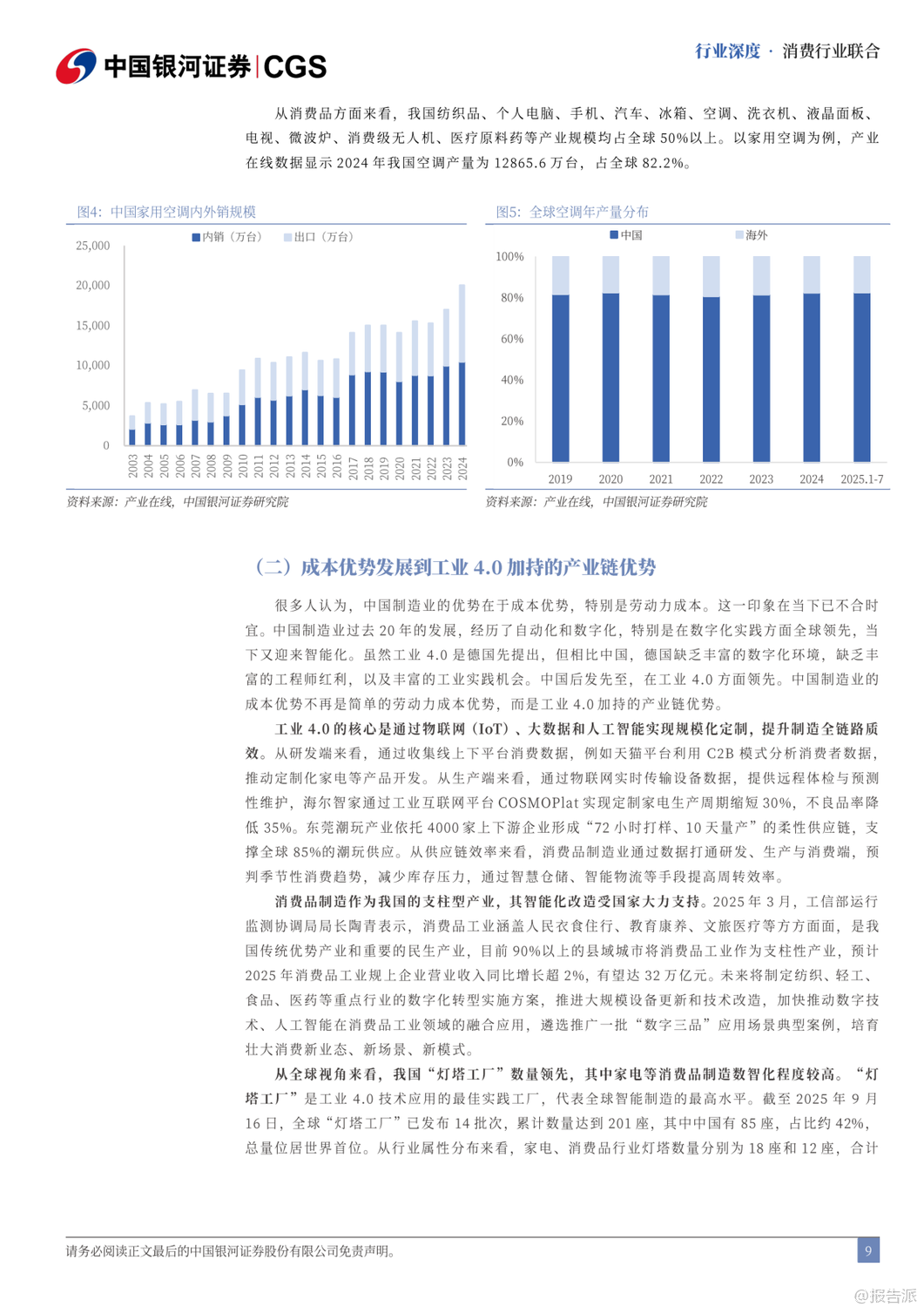| 中国消费产业正迈向全球化发展的关键阶段,尤其是在“十五五”规划即将开启(2026-2030年)的背景下,政策导向正从以往侧重生产转向生产与消费并重。 面对国内“有效需求不足”的挑战,推动消费产业出海已成为增强中国经济韧性的重要路径。 报告指出,中国消费产业不仅具备强大的内销能力,更在多个领域展现出显著的全球竞争优势,尤其在制造型“硬消费”和新兴“软消费”两个维度上实现双轮驱动。 “硬消费”领域,以家电、3C数码、汽车、纺织服装、电动工具等为代表的中国制造,已从早期的成本优势,全面升级为依托工业4.0和数字化的产业链效率优势。 中国家电产业智能制造能力全球领先,美的、海尔拥有多座“灯塔工厂”,其生产效率和成本控制远超欧美同行。 面对美国关税政策的反复无常,龙头企业如美的、海尔、TCL、三花智控等早已实现全球供应链布局,通过在东南亚、墨西哥等地建厂,有效规避贸易风险。 更值得关注的是,中国企业正通过技术领先实现品牌高端化。 大疆的消费级无人机、石头科技和科沃斯的扫地机器人、影石的全景相机、九号的智能割草机等,凭借突破性技术创新,在欧美市场成功树立了高端品牌形象,价格和市场份额均反超传统欧美品牌。 与此同时,“软消费”领域也迎来了历史性突破。 过去被认为缺乏国际影响力的互联网、电子游戏、潮玩文创、现制饮品、长视频/短视频等内容形态,正通过TikTok、SHEIN、米哈游等平台和品牌实现全球级传播。 SHEIN更是通过数字化重构的“小单快返”柔性供应链,颠覆了欧美传统快时尚巨头的运营模式,成为全球领先的时尚在线零售商。 中国企业全球化的另一大特点是娴熟的国际并购整合能力。 家电领域的海尔并购GE家电、美的并购东芝家电,成功将海外品牌与本土运营相结合,实现了在美国和日本市场的领先地位。 安踏体育收购亚玛芬体育(旗下拥有始祖鸟、萨洛蒙等),则标志着中国消费品牌从“借力海外品牌拓展中国市场”转向“整合全球资源,推动被收购品牌实现全球性增长”的新阶段,展现了中国企业的全球治理能力和品牌运营经验。 报告最后给出了明确的投资建议,推荐关注具备全球竞争力的龙头企业,如家电领域的美的集团、海尔智家、石头科技;宠物食品领域的中宠股份、佩蒂股份;以及潮玩领域的泡泡玛特等。 总体来看,中国消费产业的全球化已从“产品出海”走向“品牌出海”和“资本出海”,正以制造优势、技术创新和资本力量,奋楫争先于全球市场。 出品方:银河证券 发布时间:2025年 文档页数:56页