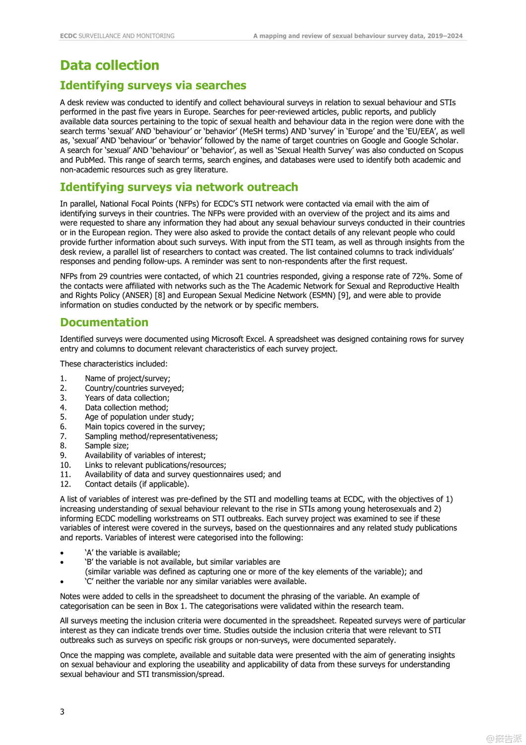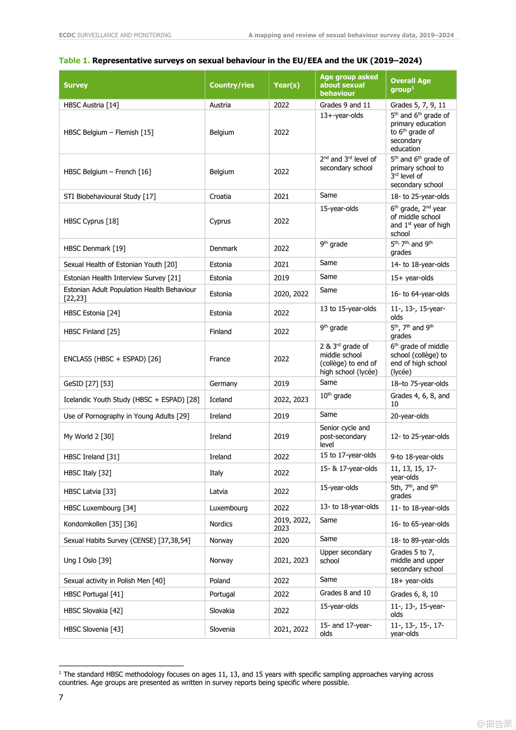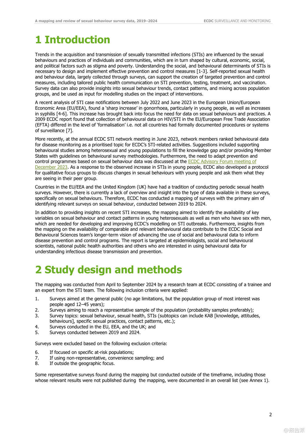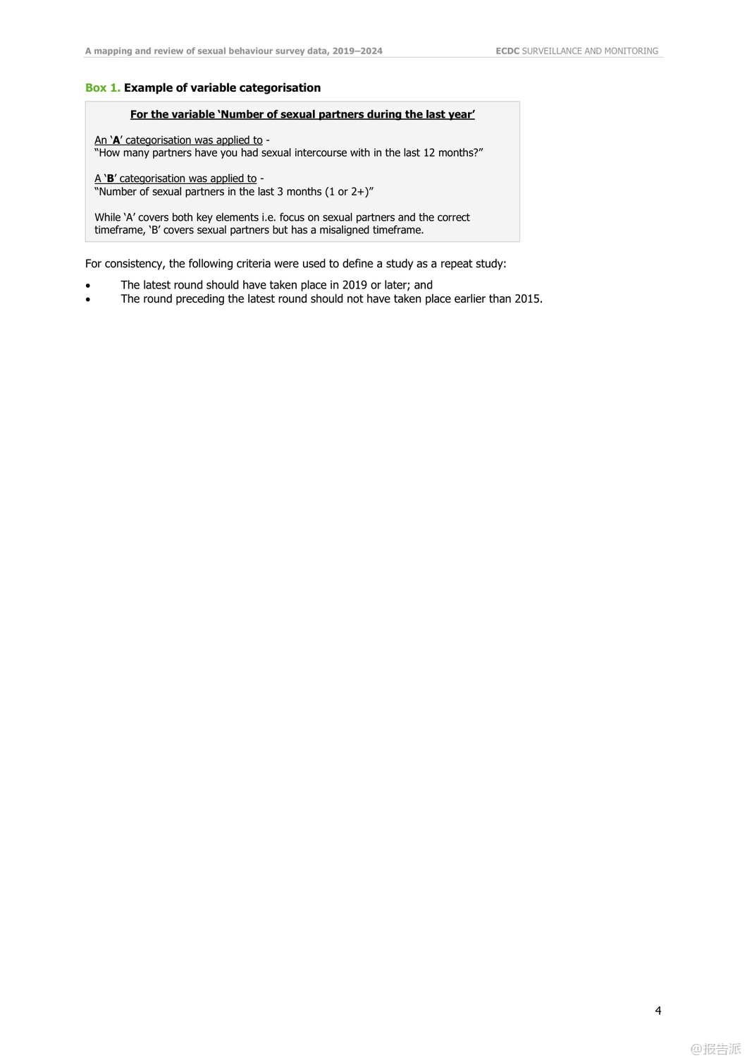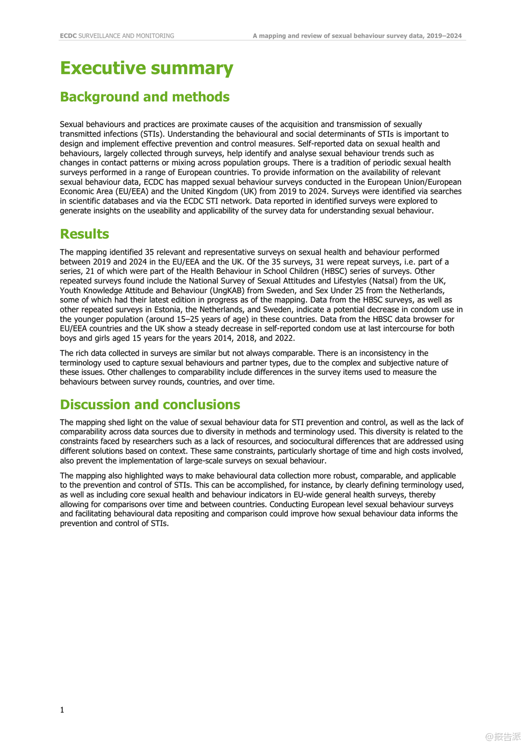 | 近期,欧洲疾病预防控制中心(ECDC)发布了一份题为《利用性行为调查数据预防性传播感染:2019–2024年欧盟/欧洲经济区绘图与审查》的深度报告。 该研究系统梳理了过去五年间欧盟、欧洲经济区及英国开展的35项具有代表性的性行为健康调查,揭示了青年群体中安全性行为趋势的变化及其对公共卫生政策的深远影响。 报告指出,尽管欧洲多国长期开展周期性性健康调查,但数据的可比性面临严峻挑战。 术语使用不一致、问卷设计差异以及抽样方法不同,导致跨国家、跨时间的趋势分析困难重重。 例如,对于“随意性关系”的定义,各国采用“临时伴侣”“非承诺关系”“偶发性伴侣”等不同表述,缺乏统一标准,极大削弱了数据整合的价值。 此外,仅有3%的调查包含生物行为检测成分,意味着大多数数据依赖自我报告,可能存在偏差。 值得关注的是,多项重复性调查显示,15至25岁年轻人群体中的安全套使用率呈现下降趋势。 来自奥地利、丹麦、爱尔兰等国的“学校儿童健康行为调查(HBSC)”数据显示,15岁青少年在最近一次性行为中使用安全套的比例从2014年的较高水平持续下滑至2022年。 荷兰的“25岁以下性行为调查”也发现,2017年至2023年间,报告“从不使用安全套”的青少年比例显著上升。 瑞典的“Kondomkollen”调查同样显示,16至20岁群体中“始终使用”安全套的比例从2022年的28%骤降至2023年的13%。 这一趋势背后的原因复杂。 报告分析认为,年轻人在“随意关系”中可能因建立信任与亲密感而降低防护意识。 部分受访者表示,双方确认健康状态后便不再使用安全套。 同时,避孕药具等其他避孕方式的普及也可能间接降低了安全套的使用频率。 然而,这种行为增加了性传播感染(STI)的风险,尤其是在淋病和梅毒病例近年急剧上升的背景下,更凸显了问题的紧迫性。 报告强调,现有二元化的关系分类(如“稳定”vs“随意”)已难以捕捉当代年轻人复杂的亲密关系形态,如“朋友以上恋人未满”等模糊关系。 这要求研究者采用更精细的谱系化分类方法,并结合定性研究深入理解行为背后的动机。 为此,ECDC建议推动在欧洲层面的综合健康调查中纳入核心性健康指标,建立行为数据共享平台,并加强各国在调查方法上的协调,以提升数据的可比性和应用价值,从而更有效地指导性传播感染的预防与控制工作。 出品方:欧洲疾控中心 发布时间:2025年