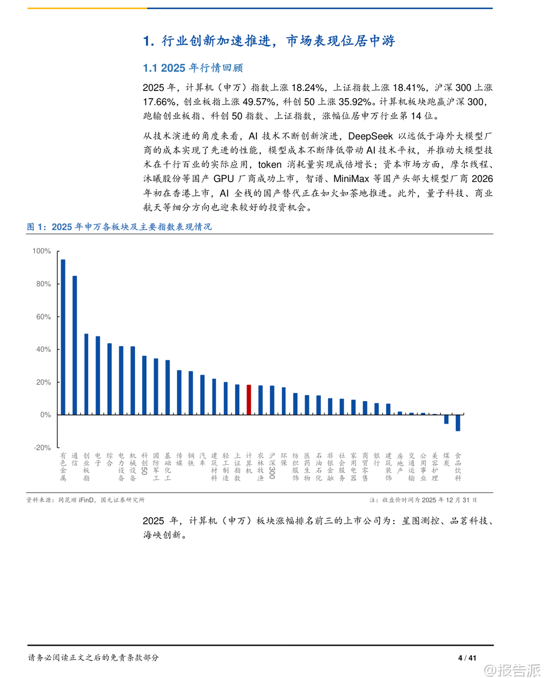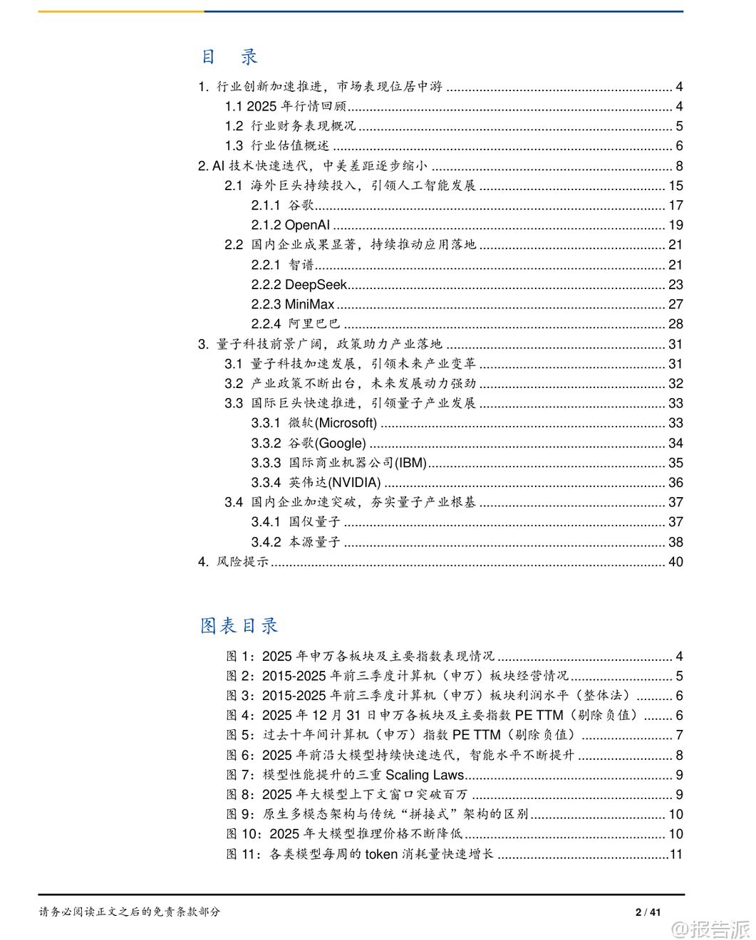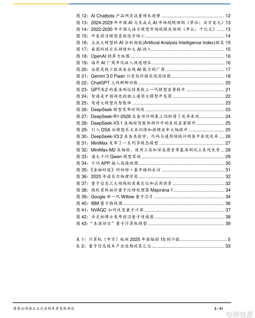 | 在2025年,计算机(申万)指数上涨18.24%,跑赢沪深300但落后于创业板指和科创50,位居申万行业涨幅第14位。 行业创新持续加速,AI技术快速迭代,模型性能不断提升的同时推理成本显著下降,推动大模型在千行百业的广泛应用。 token消耗量实现成倍增长,AI应用访问流量迅猛攀升,ChatGPT、Gemini及中国的DeepSeek等产品用户规模不断扩大,其中DeepSeek以3.55亿次访问量位列全球第三,显示出国产模型的强劲竞争力。 从技术演进来看,生成式AI正经历从“拼接式多模态”向“原生多模态”的根本性转变,Google Gemini、OpenAI GPT-5以及阿里通义千问Qwen系列已采用统一Transformer架构处理文本、图像、音频等多种模态数据,实现端到端深度融合。 同时,Scaling Laws不仅适用于预训练阶段,也延伸至后训练与推理阶段,通过强化学习提升模型主动求解复杂问题的能力。 顶尖模型上下文窗口突破百万token,为长文本理解与信息检索增强提供了强大支持。 中美AI差距正在迅速缩小。 得益于DeepSeek-R1、Qwen3、Kimi K2等国产先进模型的发布,中国在前沿大模型能力上已接近美国同期水平。 根据Artificial Analysis Intelligence Index排名,Gemini 3 Pro与GPT-5.2并列第一,而Kimi K2 Thinking排名第五,DeepSeek-V3.2、MiniMax-M2等也进入前列,标志着国产模型在全球竞争中占据重要位置。 商业化进程全面提速。 海外方面,OpenAI年化收入逼近200亿美元,Anthropic达80亿美元,xAI快速增长;国内智谱、MiniMax、阿里巴巴等企业也在加速商业化落地。 智谱2024年营收3.12亿元,在独立通用大模型开发商中居首;阿里通义大模型开源超300个模型,全球下载量破6亿次,衍生模型达17万个,服务超百万客户,市场占有率领先。 IDC预测,2029年中国AI总投资将达1114亿美元,五年复合增长率25.7%,生成式AI占比将从2024年的18.2%升至41.1%,成为核心驱动力。 资本市场积极响应。 摩尔线程、沐曦股份等国产GPU厂商成功上市,智谱、MiniMax计划2026年初登陆港股,AI全栈国产替代趋势明确。 政策层面,《中共中央关于制定国民经济和社会发展第十五个五年规划的建议》明确将量子科技纳入未来产业布局,国家对前沿科技的战略支持力度持续加大。 量子科技迎来历史性发展机遇。 英特尔前CEO帕特·基辛格预言量子计算将在两年内进入主流市场,与经典计算、AI构成“三位一体”的计算革命。 当前量子信息技术分为三大方向:量子计算解决经典算力瓶颈,量子通信保障信息安全,量子测量实现超高精度感知。 国际巨头如微软发布拓扑量子比特处理器Majorana 1,谷歌Willow芯片实现可验证量子优势,IBM规划2029年前实现容错量子计算,英伟达推出NVQLink连接量子与经典超级计算机。 国内企业同步突破。 国仪量子发布钻石单自旋传感器、量子磁力仪等高精度测量设备,应用于芯片检测、心脑血管疾病早期诊断等领域;本源量子推出支持500+量子比特的测控系统“本源天机4.0”,其第三代超导量子计算机“本源悟空”已为163个国家和地区提供服务,完成超71万项任务,并在药物分子性质预测等场景实现真机验证,商业化路径逐步开启。 风险方面需关注:AI大模型在软件和服务领域落地节奏不及预期;量子技术开发路径未收敛,存在不确定性;市场开拓与商业化进展缓慢;行业竞争加剧导致价格战;宏观经济波动影响下游需求;国际贸易与技术管制可能制约高端环节发展。 总体而言,2025年计算机行业在AI商业化与量子科技双轮驱动下展现出强劲增长动能。 AI正从技术探索迈向规模化应用,国产模型性能与生态齐头并进;量子科技从实验室走向产业化,政策、资本与技术形成共振。 尽管面临多重挑战,但长期成长空间广阔,具备战略性投资价值。 本文由【报告派】研读,输出观点仅作为行业分析! 原文标题:2026-01-16-国元证券-国元证券-2026年计算机行业策略报告:AI商业化加速推进,量子科技前景广阔 发布时间:2026年 出品方:国元证券 文档页数:41页