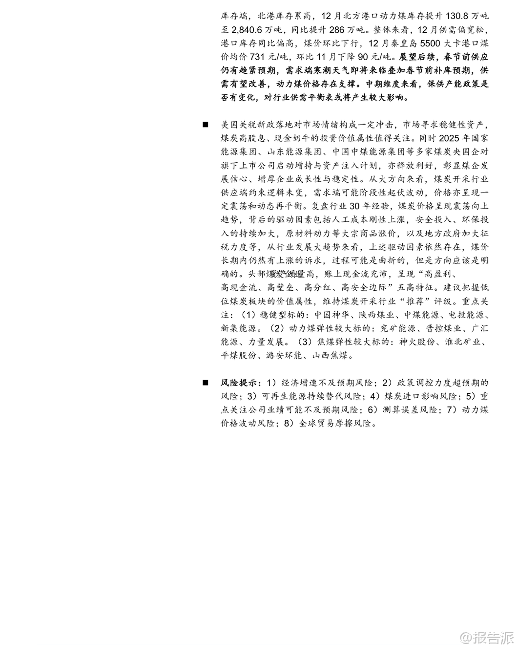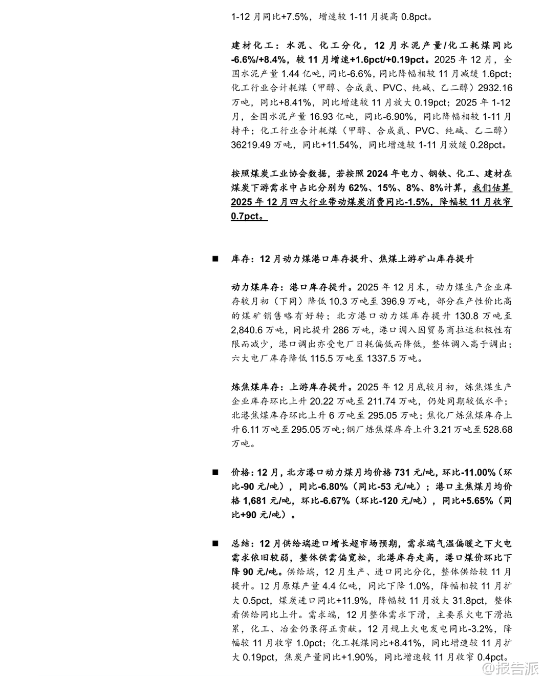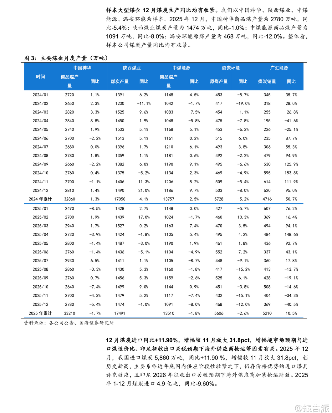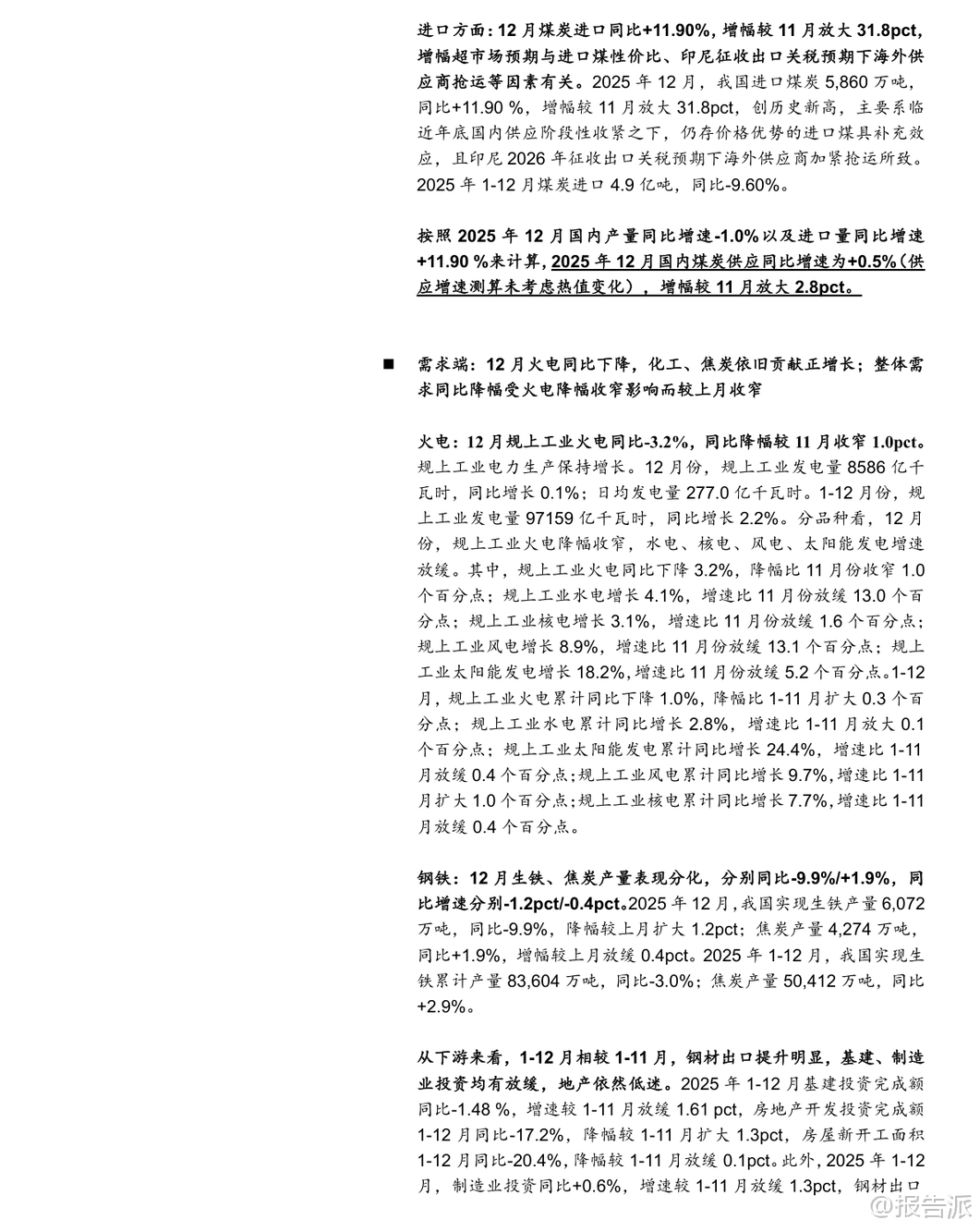 | 2025年12月,中国煤炭行业呈现出“生产下降、进口上升、火电需求疲弱”的运行特征。 根据国家统计局发布的最新数据,当月规模以上工业原煤产量为4.4亿吨,同比下降1.0%,日均产量1410万吨,环比减少12.9万吨/天,同比减少5.9万吨/天。 全年累计原煤产量达48.3亿吨,同比增长1.2%,增速较前11个月回落0.2个百分点。 产量下滑主要受年底煤矿完成年度任务后集中停减产影响,样本企业如中国神华、陕西煤业、中煤能源和潞安环能等均出现不同程度的产量同比收缩。 与此同时,煤炭进口量显著增长。 2025年12月我国进口煤炭5860万吨,同比增长11.9%,增幅较11月扩大31.8个百分点,创下历史新高。 这一方面得益于进口煤仍具价格优势,在国内供应阶段性收紧背景下发挥补充作用;另一方面,受印尼计划于2026年征收煤炭出口关税预期推动,海外供应商加快抢运节奏。 尽管12月进口大幅增长,但2025年全年煤炭进口总量为4.9亿吨,同比下降9.6%。 综合来看,若以产量-1.0%和进口+11.9%测算,12月国内煤炭总供应量同比小幅提升0.5%,供需格局整体趋于宽松。 从需求端看,电力领域表现依然偏弱。 12月规模以上工业发电量8586亿千瓦时,同比增长0.1%,其中火电同比下降3.2%,降幅虽较11月收窄1.0个百分点,但累计全年火电发电量同比下降1.0%,趋势尚未根本扭转。 水电、核电、风电、太阳能发电增速普遍放缓,反映出非化石能源出力波动与季节性因素交织的影响。 气温偏暖导致用电负荷不高,电厂日耗偏低,六大电厂库存环比下降115.5万吨至1337.5万吨,但仍处于相对高位。 钢铁与化工行业呈现分化态势。 12月生铁产量6072万吨,同比下降9.9%,降幅扩大1.2个百分点,反映地产持续低迷对钢铁需求的压制;而焦炭产量达4274万吨,同比增长1.9%,维持正增长,显示焦化产业链仍有韧性。 建材方面,水泥产量同比下降6.6%,降幅较上月收窄1.6个百分点;化工行业耗煤量同比增长8.41%,增速环比微升0.19个百分点,甲醇、合成氨、PVC等领域需求保持景气。 基于电力(62%)、钢铁(15%)、化工(8%)、建材(8%)的下游权重估算,2025年12月四大行业合计带动煤炭消费同比下降1.5%,降幅较11月收窄0.7个百分点。 库存方面,港口动力煤库存明显累积。 截至12月底,北方港口动力煤库存达2840.6万吨,环比增加130.8万吨,同比高出286万吨。 尽管生产企业库存略有下降,但港口调入量高于调出量,主因贸易商拉运积极性不足叠加电厂低日耗。 炼焦煤方面,上游生产企业库存回升20.22万吨至211.74万吨,北港及焦化厂、钢厂库存也均有小幅上升,整体处于同期偏低水平。 价格层面,12月秦皇岛5500大卡动力煤均价为731元/吨,环比下跌90元/吨,同比下降53元/吨;主焦煤港口均价1681元/吨,环比下降120元/吨,同比上涨90元/吨,显示动力煤承压而焦煤仍有支撑。 展望未来,短期来看,春节前寒潮天气来临叠加节前补库需求,或将提振煤炭采购意愿,供应趋紧预期下动力煤价格具备支撑。 中期而言,保供政策是否调整将深刻影响行业供需平衡。 尽管面临可再生能源替代、经济增速放缓等风险,但煤炭行业长期仍具基本面支撑——人工、安全、环保成本刚性上升,地方政府税收加强,推动煤价中枢震荡上行。 头部煤企普遍具备“高盈利、高现金流、高分红、高壁垒、高安全边际”特征,投资价值凸显。 国海证券维持行业“推荐”评级,建议关注三类标的:稳健型(中国神华、陕西煤业、中煤能源等)、动力煤弹性型(兖矿能源、晋控煤业等)、焦煤弹性型(神火股份、潞安环能等)。 本文由【报告派】研读,输出观点仅作为行业分析! 原文标题:2026-01-19-国海证券-国海证券-煤炭开采行业12月数据全面解读:生产降、进口升,火电依旧疲弱 发布时间:2026年 出品方:国海证券