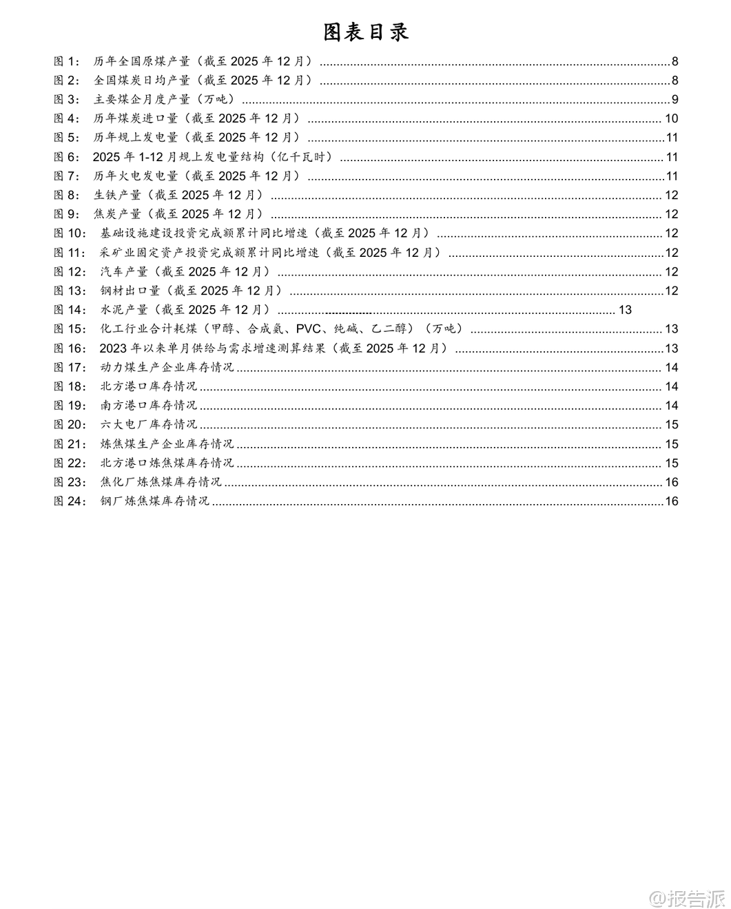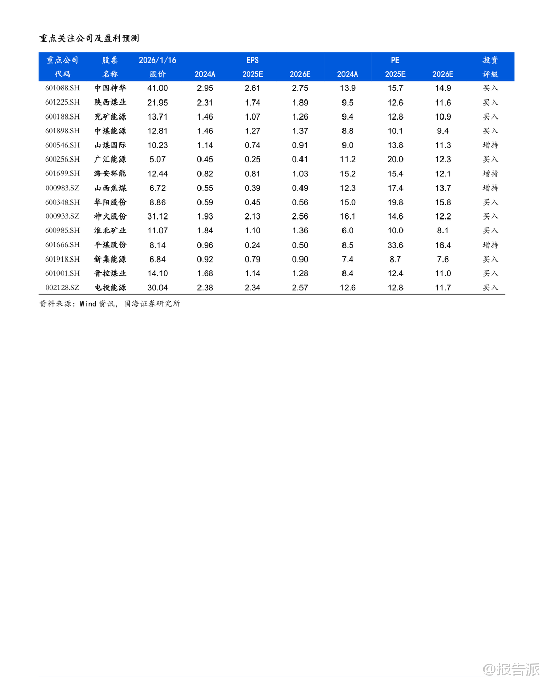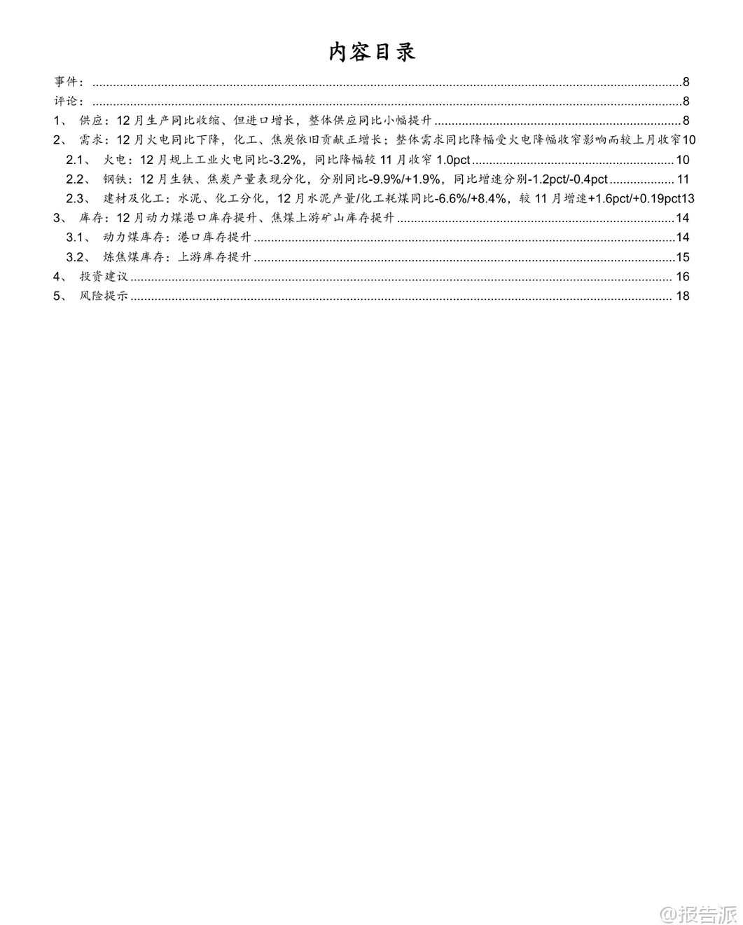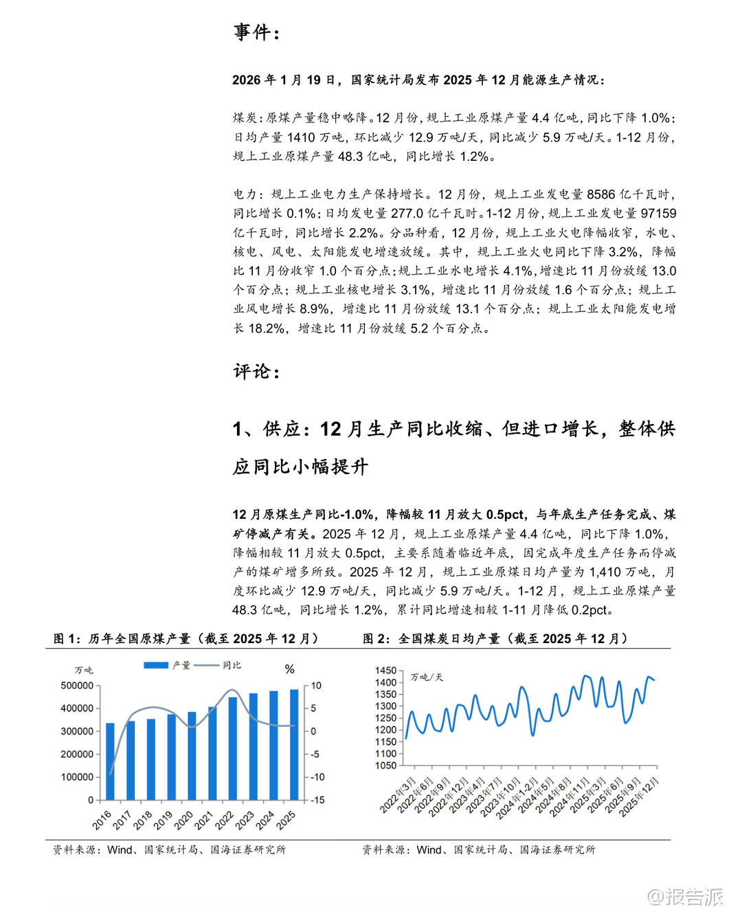 | 2025年12月,中国煤炭行业呈现出“生产下降、进口上升、火电需求疲弱”的运行特征。 根据国家统计局发布的最新数据,当月规模以上工业原煤产量为4.4亿吨,同比下降1.0%,日均产量1410万吨,环比减少12.9万吨/天,同比减少5.9万吨/天。 全年累计原煤产量达48.3亿吨,同比增长1.2%,增速较前11个月回落0.2个百分点。 产量下滑主要受年底煤矿完成年度任务后集中停减产影响,样本企业如中国神华、陕西煤业、中煤能源和潞安环能等均出现不同程度的产量同比收缩。 与此同时,煤炭进口量显著增长。 2025年12月我国进口煤炭5860万吨,同比增长11.9%,增幅较11月扩大31.8个百分点,创下历史新高。 这一方面得益于进口煤仍具价格优势,在国内供应阶段性收紧背景下发挥补充作用;另一方面,受印尼计划于2026年征收煤炭出口关税预期推动,海外供应商加快抢运节奏。 尽管12月进口大幅增长,但2025年全年煤炭进口总量为4.9亿吨,同比下降9.6%。 综合来看,若以产量-1.0%和进口+11.9%测算,12月国内煤炭总供应量同比小幅提升0.5%,供需格局整体趋于宽松。 从需求端看,电力领域表现依然偏弱。 12月规模以上工业发电量8586亿千瓦时,同比增长0.1%,其中火电同比下降3.2%,降幅虽较11月收窄1.0个百分点,但累计全年火电发电量同比下降1.0%,趋势尚未根本扭转。 水电、核电、风电、太阳能发电增速普遍放缓,反映出非化石能源出力波动与季节性因素交织的影响。 气温偏暖导致用电负荷不高,电厂日耗偏低,六大电厂库存环比下降115.5万吨至1337.5万吨,但仍处于相对高位。 钢铁与化工行业呈现分化态势。 12月生铁产量6072万吨,同比下降9.9%,降幅扩大1.2个百分点,反映地产持续低迷对钢铁需求的压制;而焦炭产量达4274万吨,同比增长1.9%,维持正增长,显示焦化产业链仍有韧性。 建材方面,水泥产量同比下降6.6%,降幅较上月收窄1.6个百分点;化工行业耗煤量同比增长8.41%,增速环比微升0.19个百分点,甲醇、合成氨、PVC等领域需求保持景气。 基于电力(62%)、钢铁(15%)、化工(8%)、建材(8%)的下游权重估算,2025年12月四大行业合计带动煤炭消费同比下降1.5%,降幅较11月收窄0.7个百分点。 库存方面,港口动力煤库存明显累积。 截至12月底,北方港口动力煤库存达2840.6万吨,环比增加130.8万吨,同比高出286万吨。 尽管生产企业库存略有下降,但港口调入量高于调出量,主因贸易商拉运积极性不足叠加电厂低日耗。 炼焦煤方面,上游生产企业库存回升20.22万吨至211.74万吨,北港及焦化厂、钢厂库存也均有小幅上升,整体处于同期偏低水平。 价格层面,12月秦皇岛5500大卡动力煤均价为731元/吨,环比下跌90元/吨,同比下降53元/吨;主焦煤港口均价1681元/吨,环比下降120元/吨,同比上涨90元/吨,显示动力煤承压而焦煤仍有支撑。 展望未来,短期来看,春节前寒潮天气来临叠加节前补库需求,或将提振煤炭采购意愿,供应趋紧预期下动力煤价格具备支撑。 中期而言,保供政策是否调整将深刻影响行业供需平衡。 尽管面临可再生能源替代、经济增速放缓等风险,但煤炭行业长期仍具基本面支撑——人工、安全、环保成本刚性上升,地方政府税收加强,推动煤价中枢震荡上行。 头部煤企普遍具备“高盈利、高现金流、高分红、高壁垒、高安全边际”特征,投资价值凸显。 国海证券维持行业“推荐”评级,建议关注三类标的:稳健型(中国神华、陕西煤业、中煤能源等)、动力煤弹性型(兖矿能源、晋控煤业等)、焦煤弹性型(神火股份、潞安环能等)。 本文由【报告派】研读,输出观点仅作为行业分析! 原文标题:2026-01-19-国海证券-国海证券-煤炭开采行业12月数据全面解读:生产降、进口升,火电依旧疲弱 发布时间:2026年 出品方:国海证券