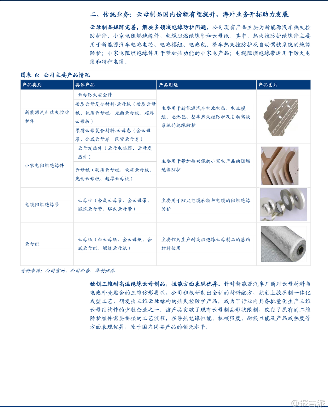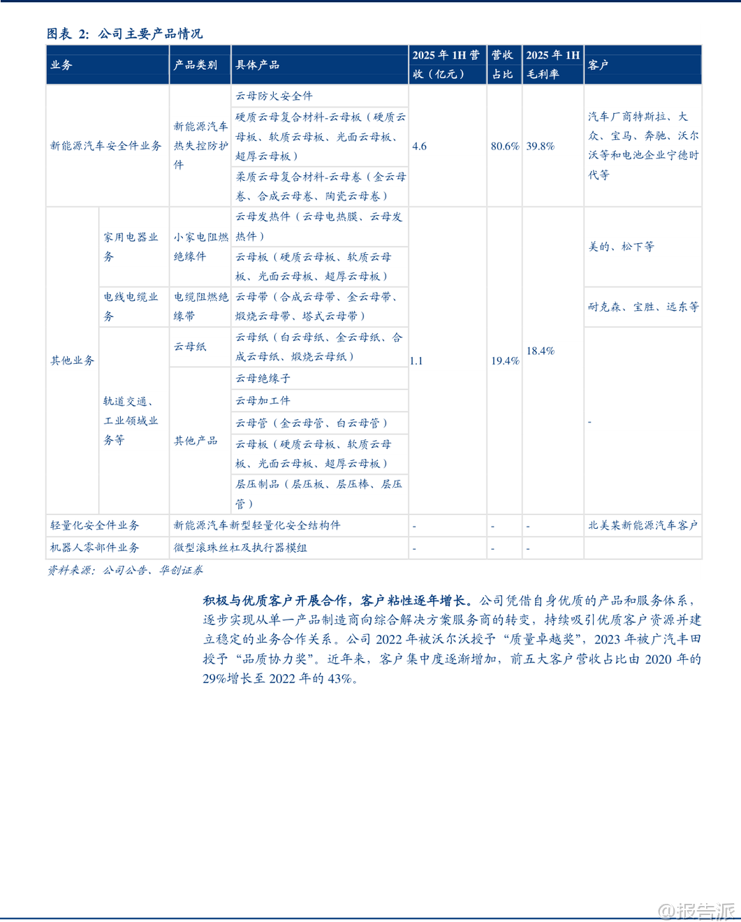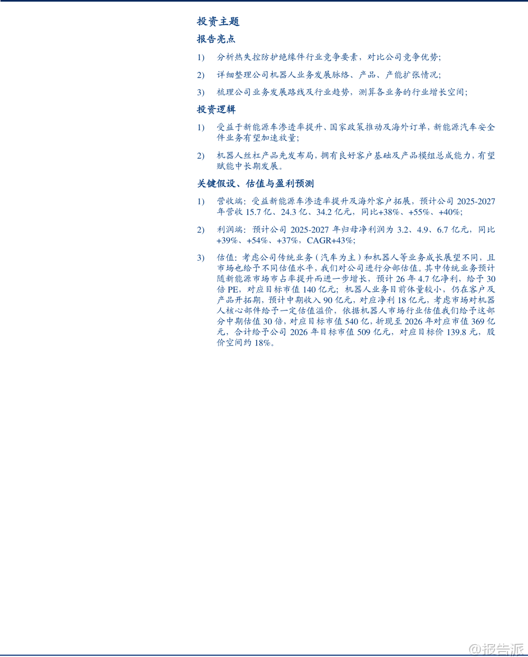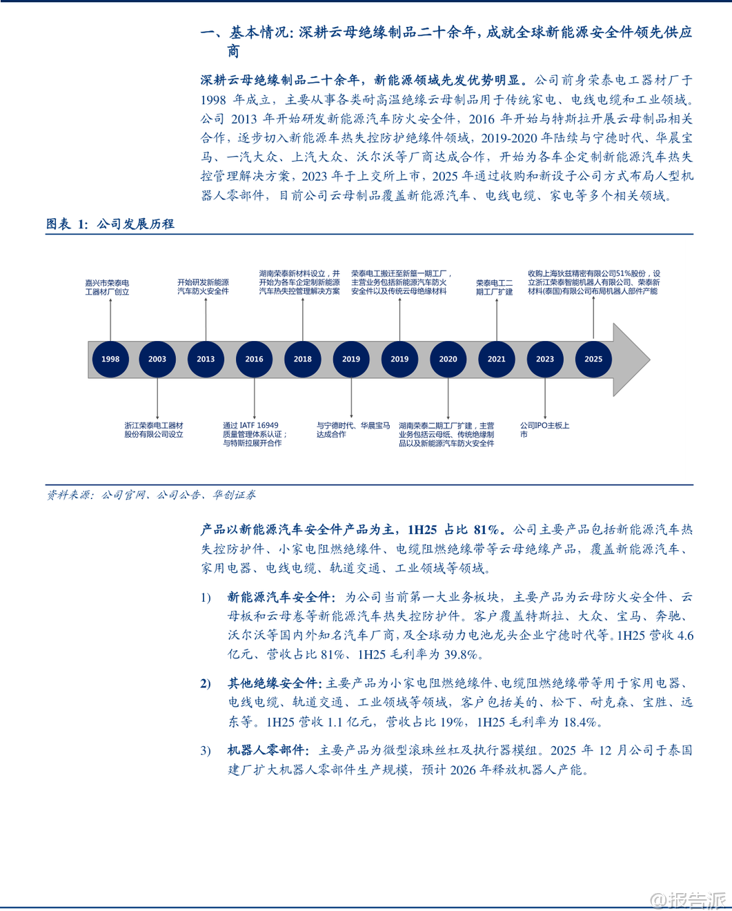 | 浙江荣泰(603119)作为全球云母绝缘制品的领军企业,正迎来传统业务稳健增长与新兴机器人业务爆发的双重驱动期。 公司自1998年成立以来深耕耐高温绝缘材料领域,2013年起切入新能源汽车防火安全件赛道,逐步构建起以新能源汽车热失控防护为核心的云母绝缘产品体系。 凭借技术先发优势和客户深度绑定,公司已成功进入特斯拉、宁德时代、宝马、大众、沃尔沃等全球头部车企及电池厂商供应链,并于2023年在上交所上市。 从财务表现看,浙江荣泰展现出强劲的成长性。 2019年至2024年,公司营收由3.0亿元增长至11.3亿元,复合增速达30%;归母净利润从0.2亿元跃升至2.3亿元,CAGR高达61%,盈利能力持续增强。 目前公司主营业务分为三大板块:新能源汽车安全件、其他绝缘安全件以及机器人零部件。 其中,新能源汽车安全件为绝对核心,2025年上半年营收占比达81%,毛利率高达39.8%,显著高于小家电、电缆等其他应用领域的18.4%。 公司在传统云母制品领域的竞争优势突出。 其独创的三维耐高温绝缘云母结构件突破了传统二维平面材料的局限,具备拔模角度更小、尺寸更大、电气强度更高、导热系数更低等性能优势,在贴合度、集成度和热失控防护效果方面处于国内领先水平。 随着新能源汽车动力电池向CTB/CTC无模组化发展,电芯与电池盖之间的热管理要求日益严苛,云母材料因优异的耐高温、绝缘性和机械强度成为主流选择。 据测算,2022年云母材料在动力电池上盖板的使用比例已达83%,预计到2025年仍将维持80%的高份额。 政策层面,国家强制标准GB 38031-2025将于2026年实施,明确要求电池系统“不起火、不爆炸”,将进一步推动高性能绝缘材料需求扩容。 海外市场布局是公司另一大亮点。 公司已在墨西哥和泰国建立生产基地,不仅规避地缘政治风险,更贴近北美及东南亚客户,提升交付效率与本地化服务能力。 2024年以来,公司接连获得多家海外新能源客户定点项目,合计生命周期订单金额达61.5亿–68.8亿元,充分验证其全球化竞争力。 更具想象空间的是公司在人形机器人领域的战略布局。 2025年,公司通过收购狄兹精密51%股权,快速切入微型滚珠丝杠赛道,掌握Φ1.4mm量产能力,满足灵巧手对高精度传动部件的需求。 随后参股金力传动,补足微型电机与齿轮箱环节;并与力星股份合作开发G5级陶瓷球滚动体,布局轻量化、低噪音的微型陶瓷丝杠技术路径。 此外,公司宣布与伟创电气在泰国合资建设机电一体化组件产能,构建从核心部件到模组总成的一体化供应能力。 这一系列动作表明,浙江荣泰正从单一材料供应商向机器人核心执行器解决方案提供商转型。 基于此,华创证券对公司进行分部估值:传统汽车业务预计2026年净利4.7亿元,给予30倍PE,对应市值140亿元;机器人业务中期目标收入90亿元、净利18亿元,给予30倍估值,折现至2026年市值369亿元。 合计目标市值509亿元,对应目标价139.8元,较当前股价有约18%上涨空间,首次覆盖给予“推荐”评级。 未来增长动能主要来自两方面:一是新能源车渗透率提升带动云母绝缘件量价齐升;二是机器人产业化加速推动丝杠等核心部件放量。 尽管面临宏观经济波动、行业竞争加剧及原材料价格变动等风险,但公司在技术积累、客户资源与战略卡位上的综合优势,使其有望在双轮驱动下打开长期成长天花板。 本文由【报告派】研读,输出观点仅作为行业分析! 原文标题:浙江荣泰(603119)深度研究报告:全球云母绝缘制品领先者,机器人业务打开新成长空间 发布时间:2026年 出品方:华创证券
