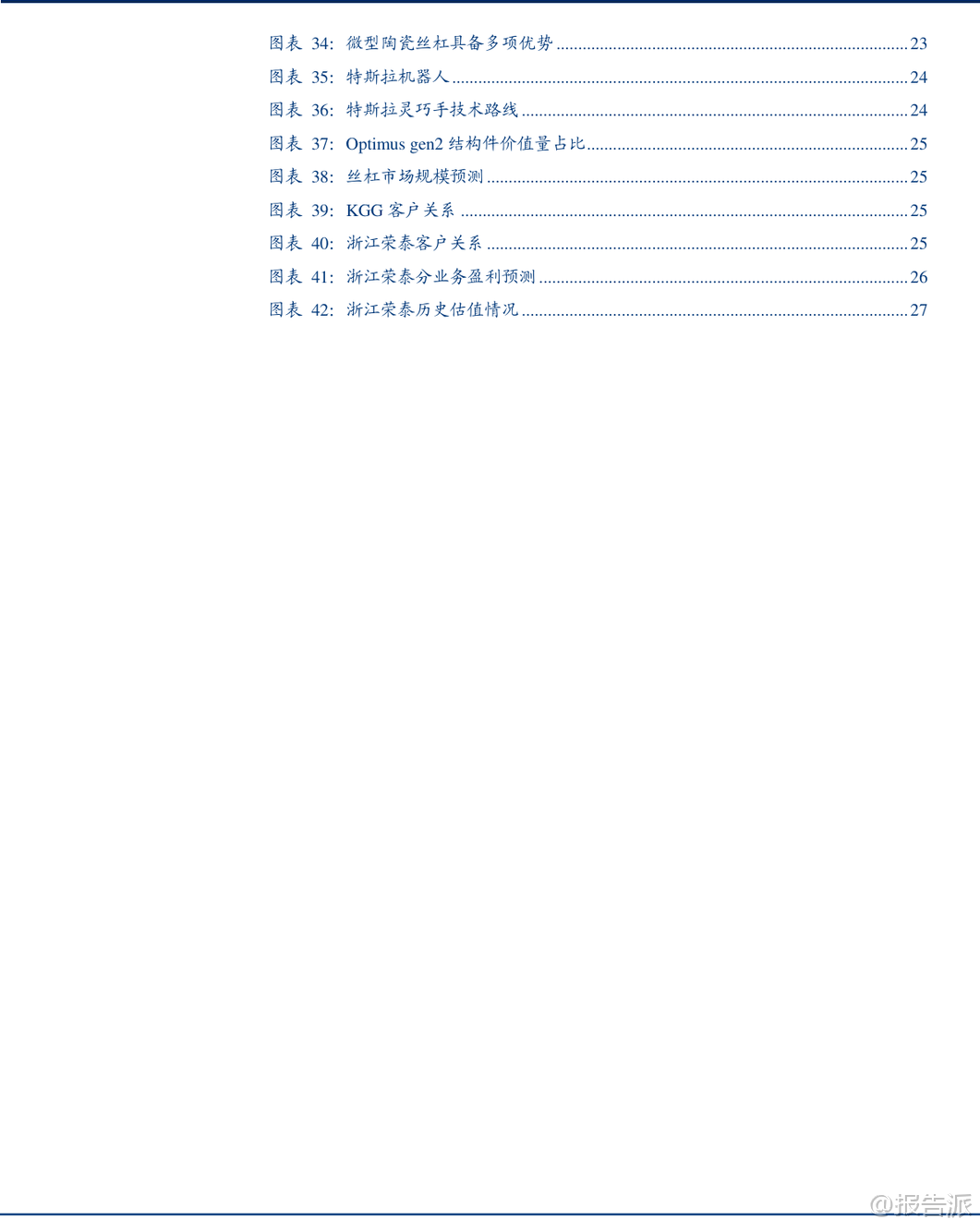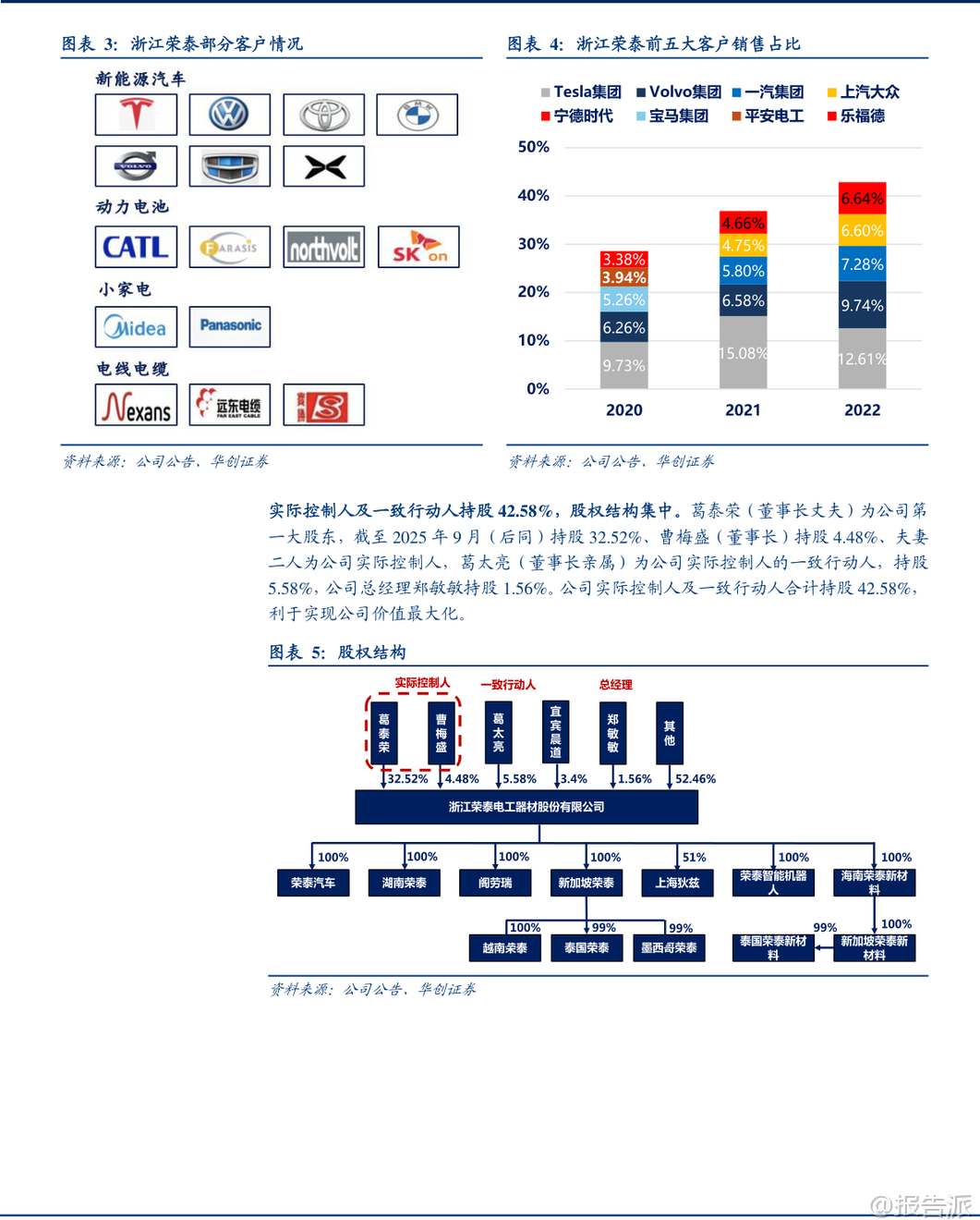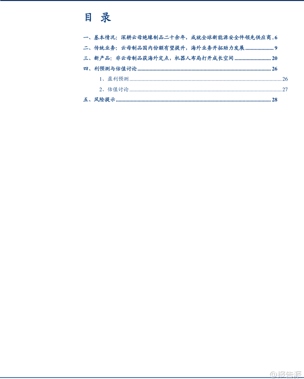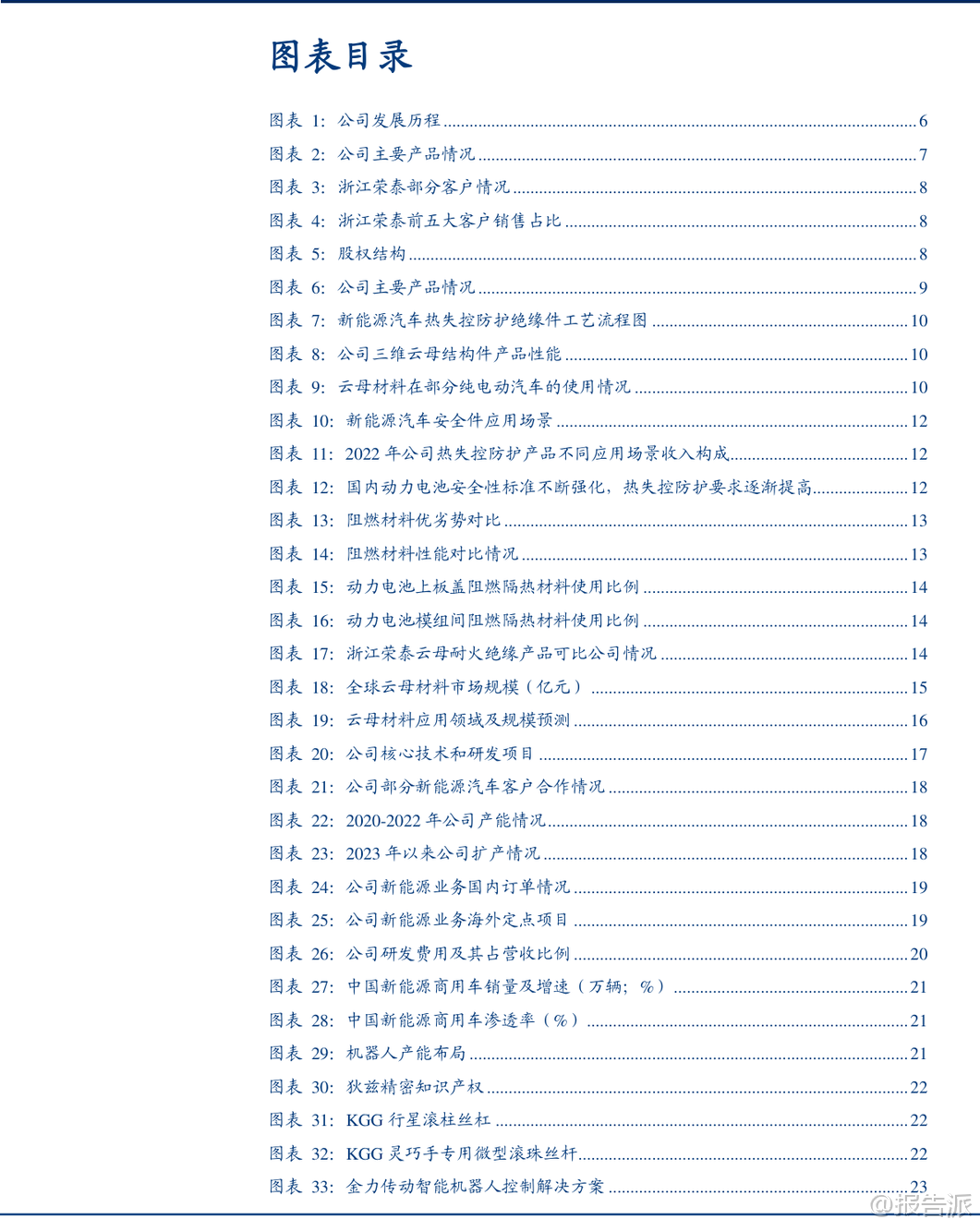 | 浙江荣泰(603119)作为全球云母绝缘制品的领军企业,正迎来传统业务稳健增长与新兴机器人业务爆发的双重驱动期。 公司自1998年成立以来深耕耐高温绝缘材料领域,2013年起切入新能源汽车防火安全件赛道,逐步构建起以新能源汽车热失控防护为核心的云母绝缘产品体系。 凭借技术先发优势和客户深度绑定,公司已成功进入特斯拉、宁德时代、宝马、大众、沃尔沃等全球头部车企及电池厂商供应链,并于2023年在上交所上市。 从财务表现看,浙江荣泰展现出强劲的成长性。 2019年至2024年,公司营收由3.0亿元增长至11.3亿元,复合增速达30%;归母净利润从0.2亿元跃升至2.3亿元,CAGR高达61%,盈利能力持续增强。 目前公司主营业务分为三大板块:新能源汽车安全件、其他绝缘安全件以及机器人零部件。 其中,新能源汽车安全件为绝对核心,2025年上半年营收占比达81%,毛利率高达39.8%,显著高于小家电、电缆等其他应用领域的18.4%。 公司在传统云母制品领域的竞争优势突出。 其独创的三维耐高温绝缘云母结构件突破了传统二维平面材料的局限,具备拔模角度更小、尺寸更大、电气强度更高、导热系数更低等性能优势,在贴合度、集成度和热失控防护效果方面处于国内领先水平。 随着新能源汽车动力电池向CTB/CTC无模组化发展,电芯与电池盖之间的热管理要求日益严苛,云母材料因优异的耐高温、绝缘性和机械强度成为主流选择。 据测算,2022年云母材料在动力电池上盖板的使用比例已达83%,预计到2025年仍将维持80%的高份额。 政策层面,国家强制标准GB 38031-2025将于2026年实施,明确要求电池系统“不起火、不爆炸”,将进一步推动高性能绝缘材料需求扩容。 海外市场布局是公司另一大亮点。 公司已在墨西哥和泰国建立生产基地,不仅规避地缘政治风险,更贴近北美及东南亚客户,提升交付效率与本地化服务能力。 2024年以来,公司接连获得多家海外新能源客户定点项目,合计生命周期订单金额达61.5亿–68.8亿元,充分验证其全球化竞争力。 更具想象空间的是公司在人形机器人领域的战略布局。 2025年,公司通过收购狄兹精密51%股权,快速切入微型滚珠丝杠赛道,掌握Φ1.4mm量产能力,满足灵巧手对高精度传动部件的需求。 随后参股金力传动,补足微型电机与齿轮箱环节;并与力星股份合作开发G5级陶瓷球滚动体,布局轻量化、低噪音的微型陶瓷丝杠技术路径。 此外,公司宣布与伟创电气在泰国合资建设机电一体化组件产能,构建从核心部件到模组总成的一体化供应能力。 这一系列动作表明,浙江荣泰正从单一材料供应商向机器人核心执行器解决方案提供商转型。 基于此,华创证券对公司进行分部估值:传统汽车业务预计2026年净利4.7亿元,给予30倍PE,对应市值140亿元;机器人业务中期目标收入90亿元、净利18亿元,给予30倍估值,折现至2026年市值369亿元。 合计目标市值509亿元,对应目标价139.8元,较当前股价有约18%上涨空间,首次覆盖给予“推荐”评级。 未来增长动能主要来自两方面:一是新能源车渗透率提升带动云母绝缘件量价齐升;二是机器人产业化加速推动丝杠等核心部件放量。 尽管面临宏观经济波动、行业竞争加剧及原材料价格变动等风险,但公司在技术积累、客户资源与战略卡位上的综合优势,使其有望在双轮驱动下打开长期成长天花板。 本文由【报告派】研读,输出观点仅作为行业分析! 原文标题:浙江荣泰(603119)深度研究报告:全球云母绝缘制品领先者,机器人业务打开新成长空间 发布时间:2026年 出品方:华创证券