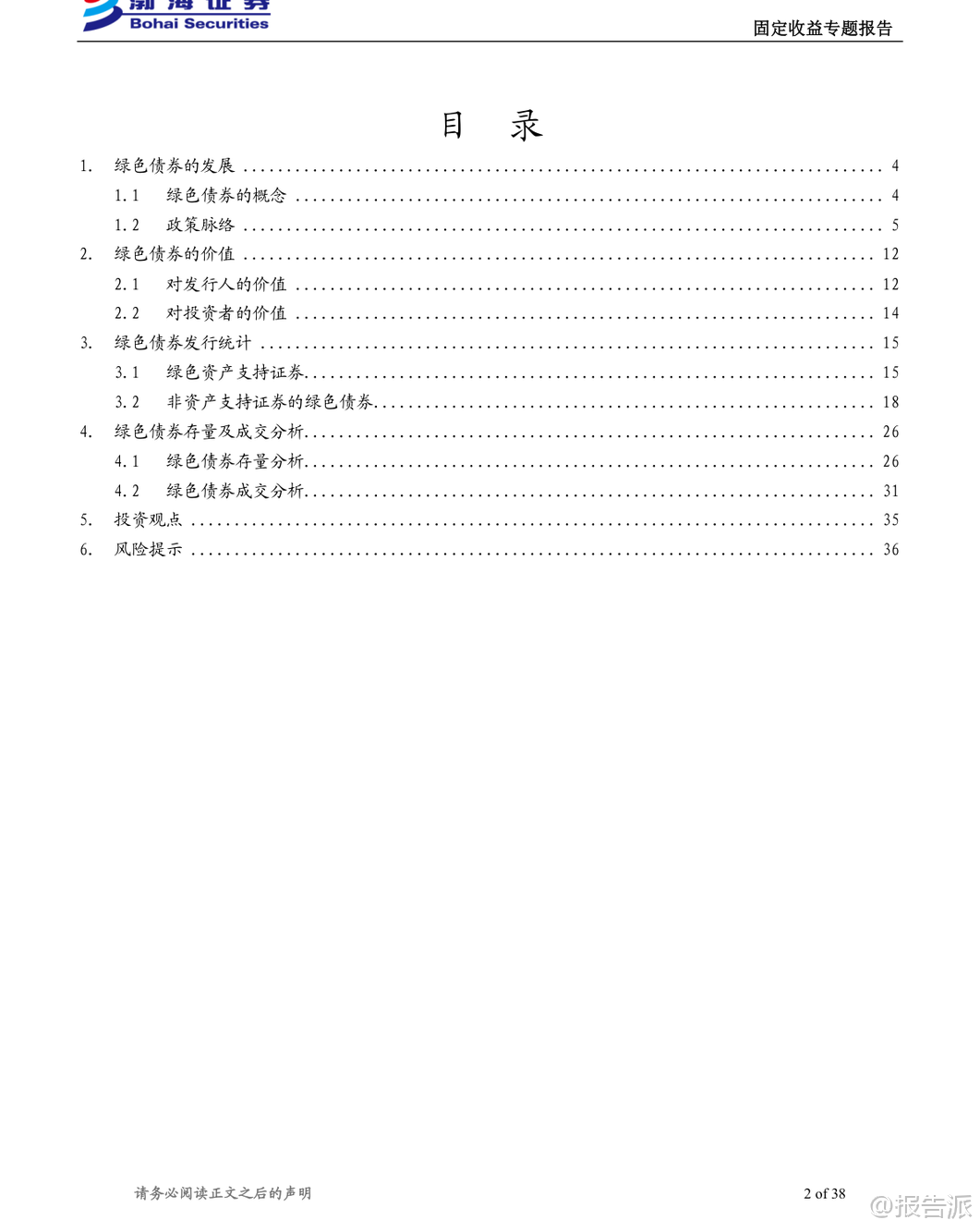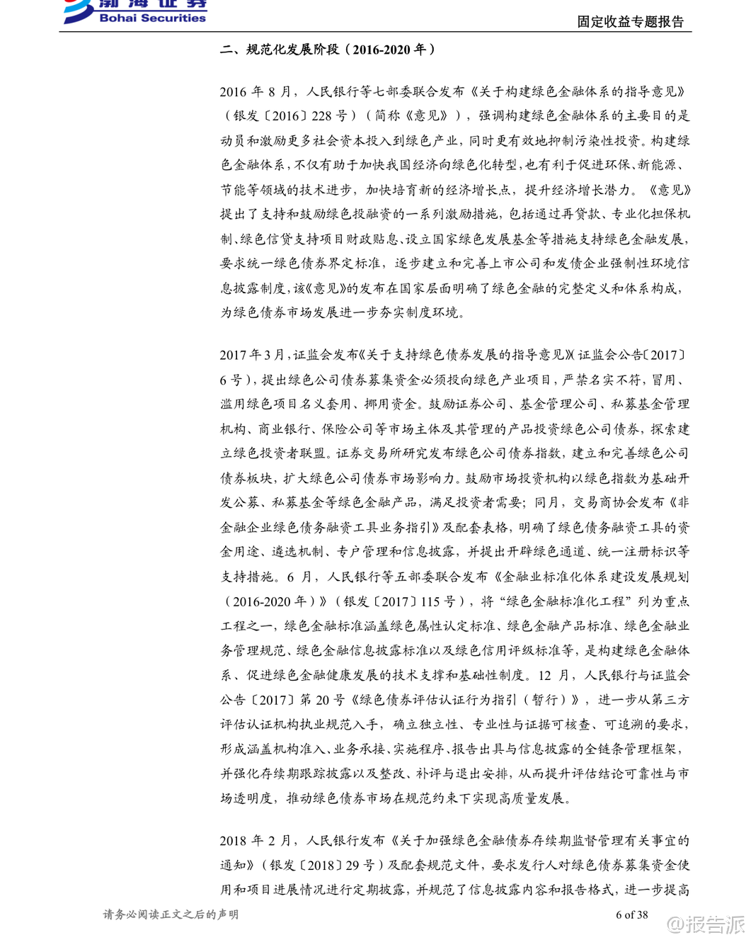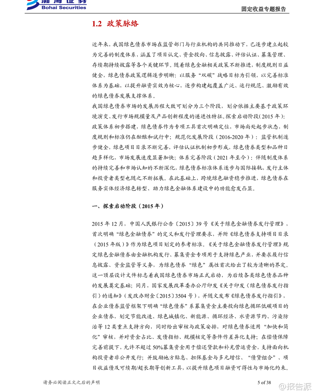 | 绿色债券作为推动经济绿色转型和实现“双碳”目标的重要金融工具,近年来在我国快速发展。 根据《绿色金融术语》定义,绿色债券是指募集资金专门用于支持符合规定条件的绿色产业、绿色项目或绿色经济活动,并按约定还本付息的有价证券。 截至2025年末,我国绿色债券累计发行规模已达5.32万亿元,年度发行规模从2016年的2072.31亿元增长至10792.83亿元,发行数量由89只增至834只,市场供给端扩张动能显著增强。 我国绿色债券市场的发展历程可分为三个阶段:探索启动阶段(2015年)、规范化发展阶段(2016-2020年)和体系完善阶段(2021年至今)。 2015年是中国绿色债券市场的元年,央行与国家发改委相继出台政策文件,首次明确绿色金融债与绿色企业债的定义及支持目录,标志着制度框架初步建立。 进入2016年后,《关于构建绿色金融体系的指导意见》等顶层设计陆续发布,推动绿色项目标准统一、信息披露强化以及第三方评估认证机制形成,市场进入快速发展期。 2021年以来,随着《绿色债券支持项目目录(2021年版)》发布,剔除煤炭等高碳项目,新增绿色建筑、碳捕集利用与封存(CCUS)等内容,标准逐步与国际接轨,绿色债券进入高质量发展新阶段。 从发行结构来看,绿色债券可分为资产支持证券和其他非资产支持类债券两大类别。 截至2025年末,存量绿色债券共2014只,总规模达2.46万亿元。 其中,非资产支持证券占主导地位,金融债、中期票据和公司债是主要品种。 金融债以政策性银行和商业银行为主力,发行总额占比超过50%;中期票据在数量上最多;而绿色公司债则多由中央企业和地方国企发行。 企业性质方面,中央企业和地方国有企业合计贡献近九成发行额,显示出国有主体在绿色融资中的核心地位。 绿色债券在成本端表现出一定的“绿色溢价”。 历史数据显示,在多数年份中,绿色债券的发行利率普遍低于同类型非绿色债券,体现出投资者对绿色属性的认可所带来的融资优势。 尽管近三年来因整体利率中枢下移,该利差有所收窄,但仍对定价具有支撑作用。 尤其在绿色企业债、绿色公司债、绿色PPN和绿色中票等品种中,“绿色利差”更为明显。 对于投资者而言,绿色债券并非高收益追逐工具,而是适合作为组合中的稳健底仓配置。 其信用风险仍主要取决于发行人资质与增信安排,绿色标签更多体现在利差补偿层面。 但由于具备明确的资金用途、严格的项目遴选机制、持续的信息披露要求及第三方认证,绿色债券能有效缓解信息不对称问题,提升投后管理效率,契合机构投资者在ESG投资、绿色资产配置方面的战略需求。 此外,随着绿色债券指数体系不断完善,被动型资金配置意愿增强,二级市场流动性也逐步改善。 成交数据显示,绿色债券换手率整体偏低,2024年月均约5.45%,2025年进一步降至4.68%,远低于信用债和金融债水平,反映出其以持有到期为主的配置属性。 但成交金额呈现阶段性放量特征,在政策利好或市场关注度上升时期(如2024年3月、2025年6月和11月),交易活跃度明显提升,体现一定弹性。 估值方面,绿色债券市场存在清晰的分层结构。 低收益率端集中于高信用等级主体,如中国进出口银行、国家开发银行等,中债估价收益率低至1.36%-1.65%;而高收益率端则对应部分弱资质或已发生违约的发行人,例如启迪环境科技发展股份有限公司的估价收益率高达189.96%,反映极端风险定价。 展望未来,绿色债券将继续在服务实体经济绿色转型中发挥关键作用。 政策层面将持续推进标准统一、强化信息披露、鼓励跨境绿色融资,并通过货币政策工具、财政贴息等方式加大支持力度。 同时,随着碳市场建设提速、碳质押融资试点推进,基于碳减排收益的创新绿色债券产品有望迎来发展机遇。 总体来看,绿色债券不仅是实现可持续发展目标的重要载体,也为资本市场提供了兼具安全性、合规性和长期价值的投资选择。 本文由【报告派】研读,输出观点仅作为行业分析! 原文标题:2026-01-19-渤海证券-渤海证券-固定收益专题报告:绿色债券浅析 发布时间:2026年 出品方:渤海证券 文档页数:38页