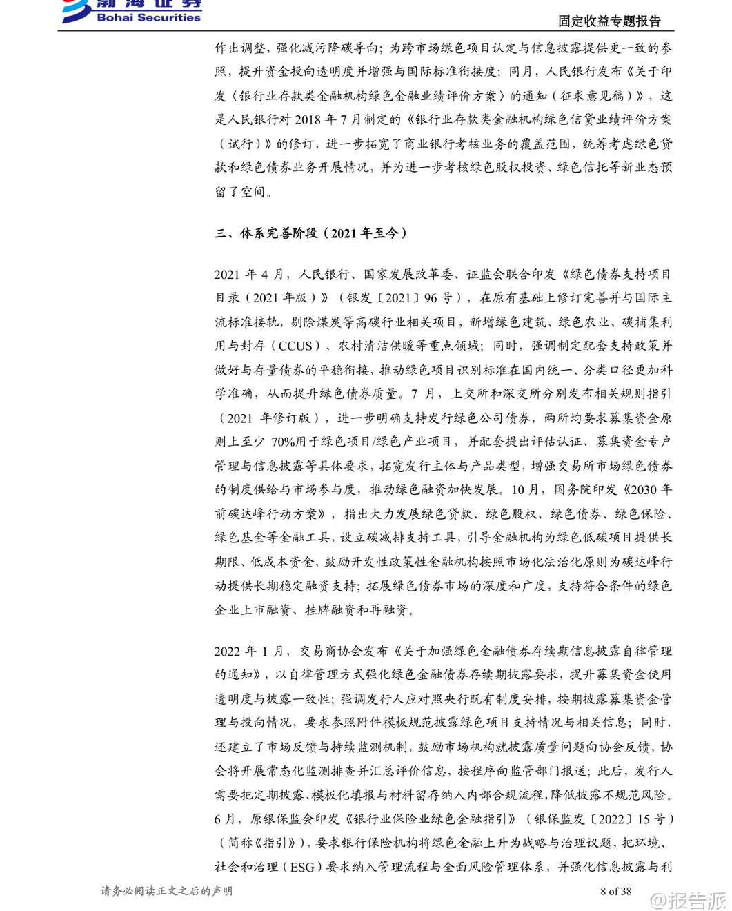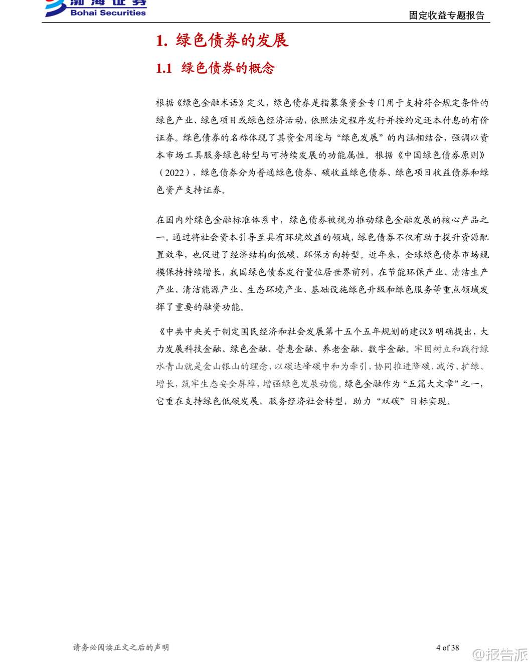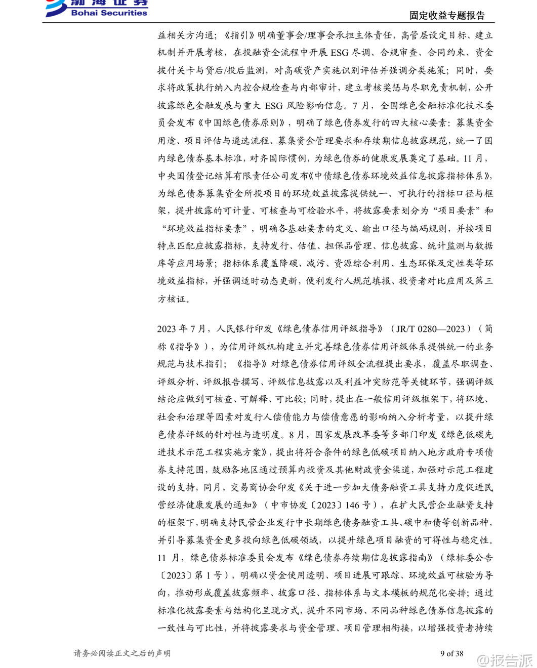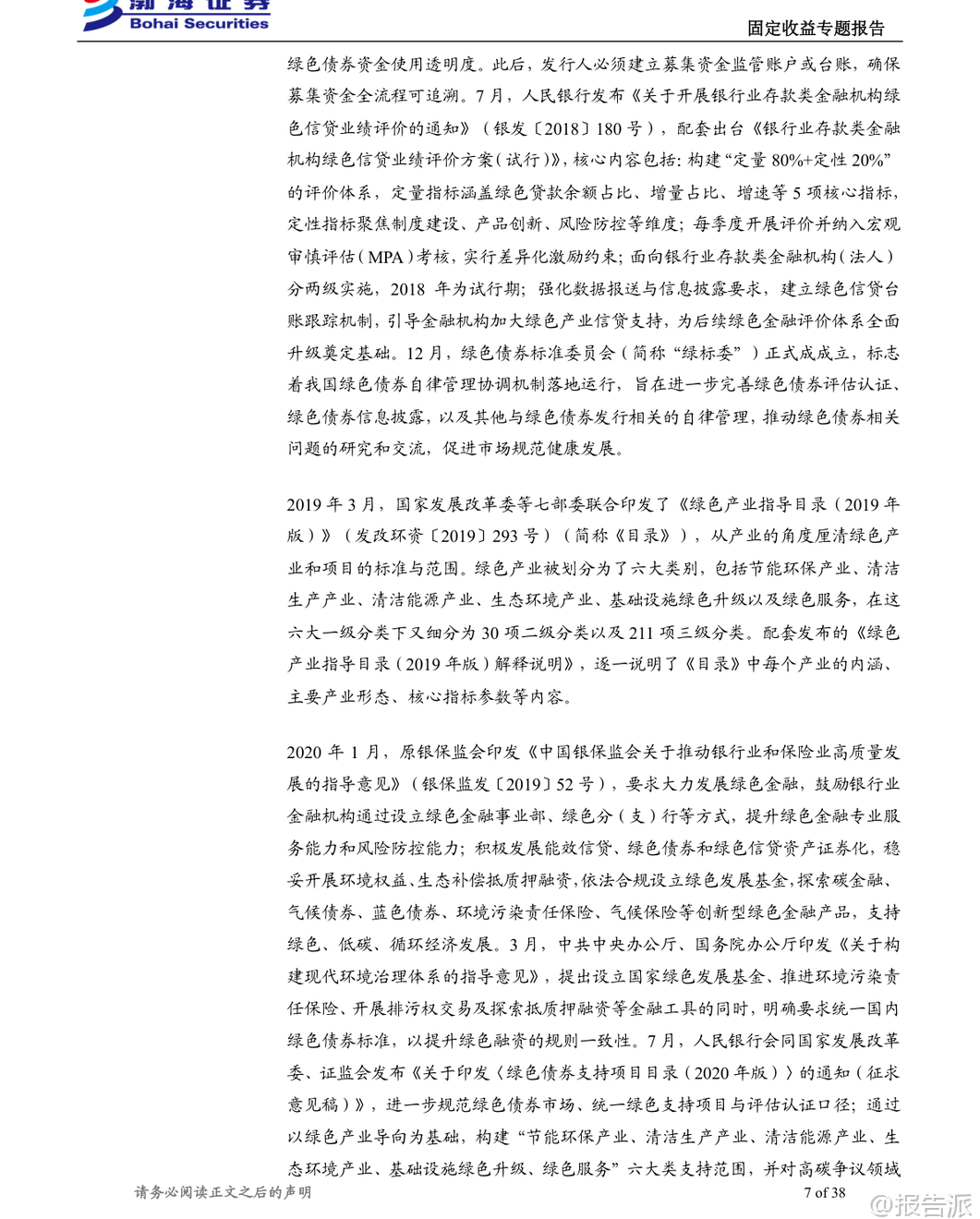 | 绿色债券作为推动经济绿色转型和实现“双碳”目标的重要金融工具,近年来在我国快速发展。 根据《绿色金融术语》定义,绿色债券是指募集资金专门用于支持符合规定条件的绿色产业、绿色项目或绿色经济活动,并按约定还本付息的有价证券。 截至2025年末,我国绿色债券累计发行规模已达5.32万亿元,年度发行规模从2016年的2072.31亿元增长至10792.83亿元,发行数量由89只增至834只,市场供给端扩张动能显著增强。 我国绿色债券市场的发展历程可分为三个阶段:探索启动阶段(2015年)、规范化发展阶段(2016-2020年)和体系完善阶段(2021年至今)。 2015年是中国绿色债券市场的元年,央行与国家发改委相继出台政策文件,首次明确绿色金融债与绿色企业债的定义及支持目录,标志着制度框架初步建立。 进入2016年后,《关于构建绿色金融体系的指导意见》等顶层设计陆续发布,推动绿色项目标准统一、信息披露强化以及第三方评估认证机制形成,市场进入快速发展期。 2021年以来,随着《绿色债券支持项目目录(2021年版)》发布,剔除煤炭等高碳项目,新增绿色建筑、碳捕集利用与封存(CCUS)等内容,标准逐步与国际接轨,绿色债券进入高质量发展新阶段。 从发行结构来看,绿色债券可分为资产支持证券和其他非资产支持类债券两大类别。 截至2025年末,存量绿色债券共2014只,总规模达2.46万亿元。 其中,非资产支持证券占主导地位,金融债、中期票据和公司债是主要品种。 金融债以政策性银行和商业银行为主力,发行总额占比超过50%;中期票据在数量上最多;而绿色公司债则多由中央企业和地方国企发行。 企业性质方面,中央企业和地方国有企业合计贡献近九成发行额,显示出国有主体在绿色融资中的核心地位。 绿色债券在成本端表现出一定的“绿色溢价”。 历史数据显示,在多数年份中,绿色债券的发行利率普遍低于同类型非绿色债券,体现出投资者对绿色属性的认可所带来的融资优势。 尽管近三年来因整体利率中枢下移,该利差有所收窄,但仍对定价具有支撑作用。 尤其在绿色企业债、绿色公司债、绿色PPN和绿色中票等品种中,“绿色利差”更为明显。 对于投资者而言,绿色债券并非高收益追逐工具,而是适合作为组合中的稳健底仓配置。 其信用风险仍主要取决于发行人资质与增信安排,绿色标签更多体现在利差补偿层面。 但由于具备明确的资金用途、严格的项目遴选机制、持续的信息披露要求及第三方认证,绿色债券能有效缓解信息不对称问题,提升投后管理效率,契合机构投资者在ESG投资、绿色资产配置方面的战略需求。 此外,随着绿色债券指数体系不断完善,被动型资金配置意愿增强,二级市场流动性也逐步改善。 成交数据显示,绿色债券换手率整体偏低,2024年月均约5.45%,2025年进一步降至4.68%,远低于信用债和金融债水平,反映出其以持有到期为主的配置属性。 但成交金额呈现阶段性放量特征,在政策利好或市场关注度上升时期(如2024年3月、2025年6月和11月),交易活跃度明显提升,体现一定弹性。 估值方面,绿色债券市场存在清晰的分层结构。 低收益率端集中于高信用等级主体,如中国进出口银行、国家开发银行等,中债估价收益率低至1.36%-1.65%;而高收益率端则对应部分弱资质或已发生违约的发行人,例如启迪环境科技发展股份有限公司的估价收益率高达189.96%,反映极端风险定价。 展望未来,绿色债券将继续在服务实体经济绿色转型中发挥关键作用。 政策层面将持续推进标准统一、强化信息披露、鼓励跨境绿色融资,并通过货币政策工具、财政贴息等方式加大支持力度。 同时,随着碳市场建设提速、碳质押融资试点推进,基于碳减排收益的创新绿色债券产品有望迎来发展机遇。 总体来看,绿色债券不仅是实现可持续发展目标的重要载体,也为资本市场提供了兼具安全性、合规性和长期价值的投资选择。 本文由【报告派】研读,输出观点仅作为行业分析! 原文标题:2026-01-19-渤海证券-渤海证券-固定收益专题报告:绿色债券浅析 发布时间:2026年 出品方:渤海证券 文档页数:38页