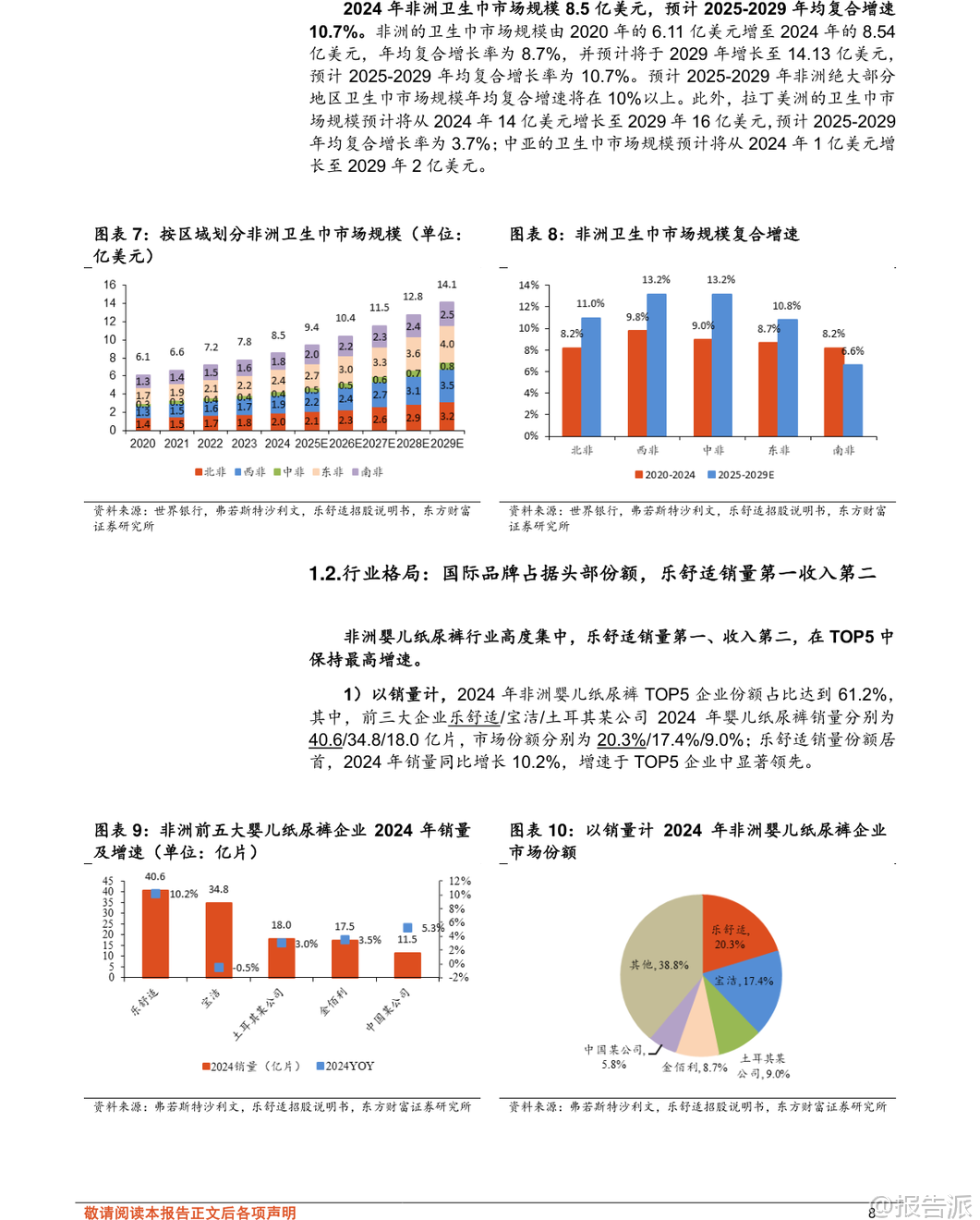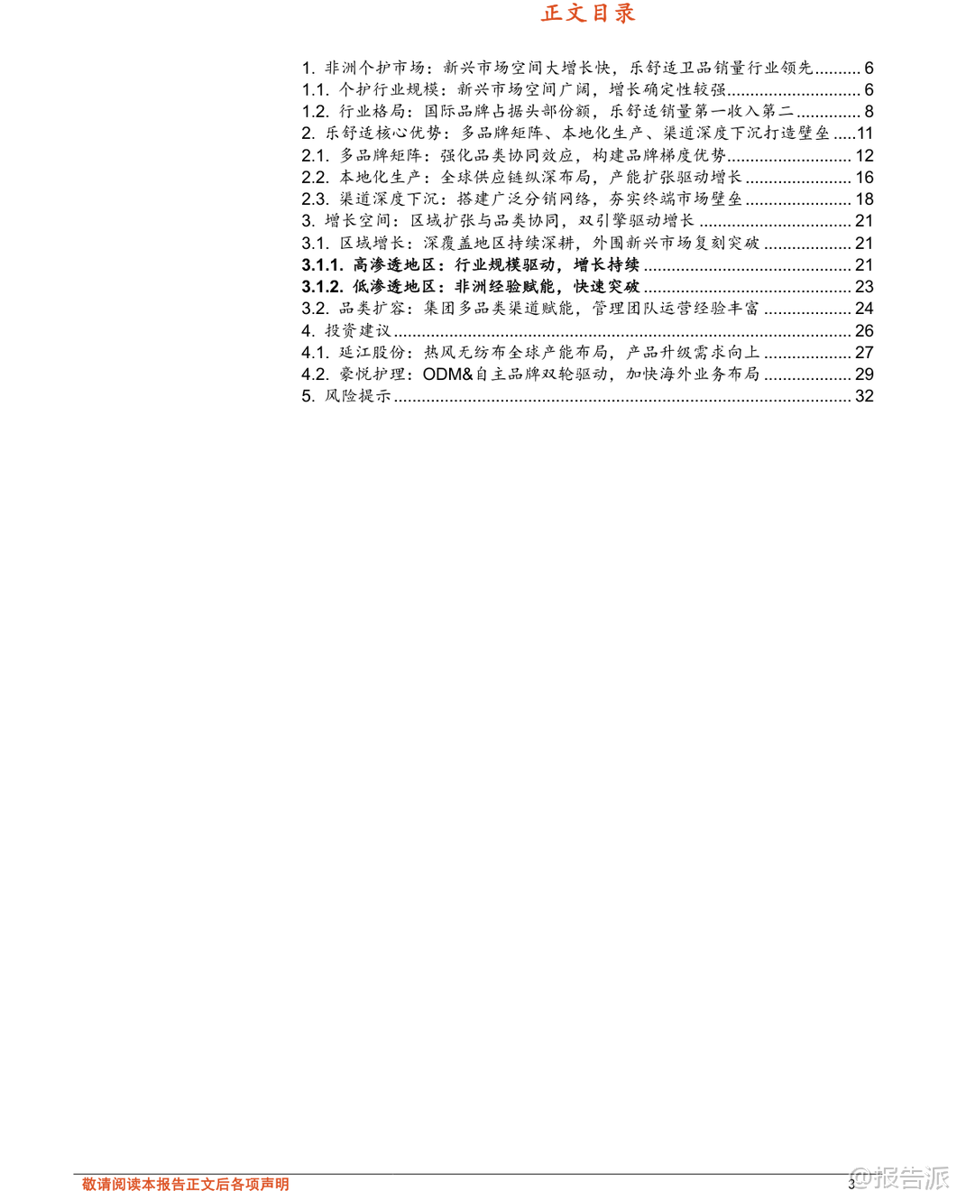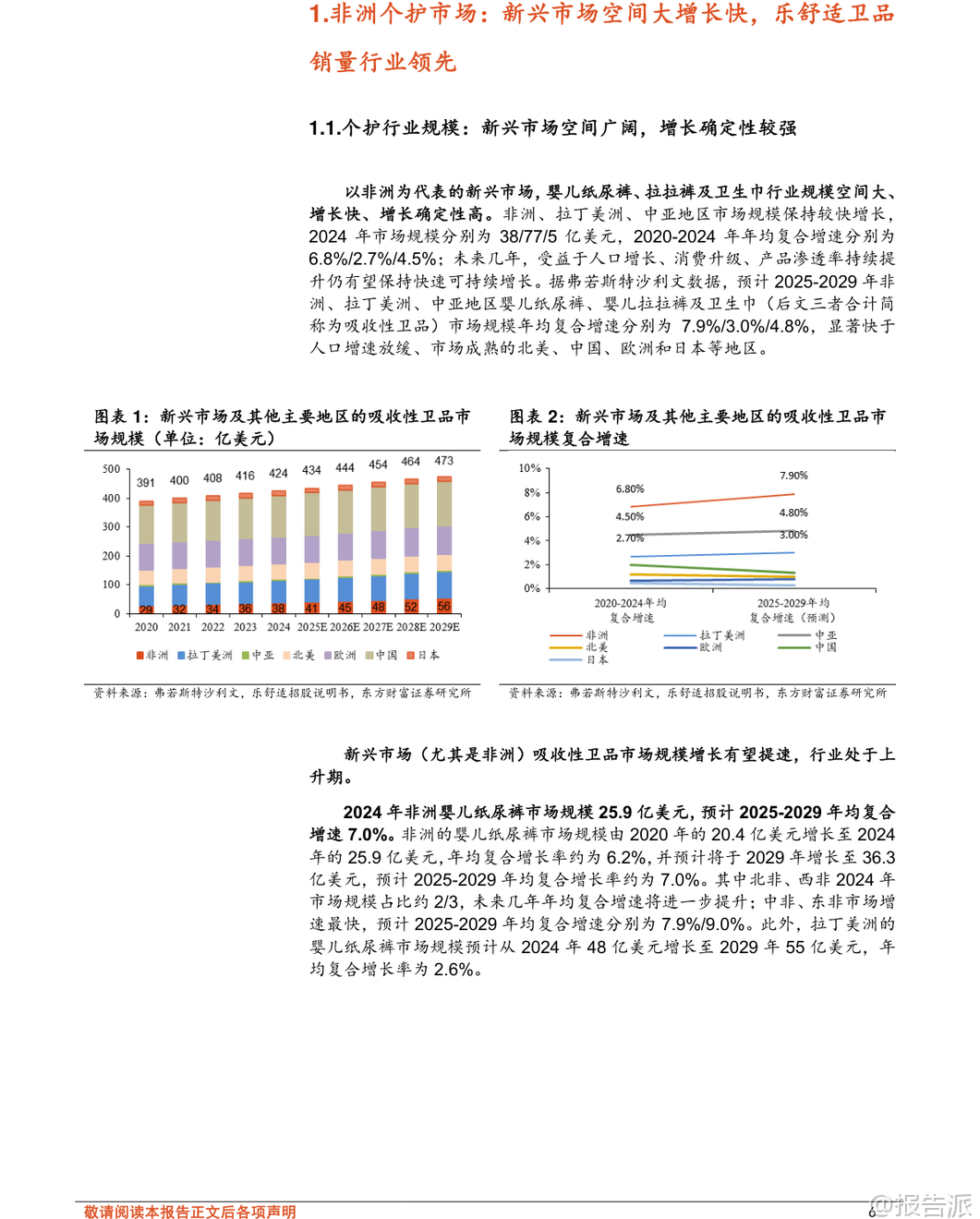 | 在2026年初,随着全球消费结构的持续演变,以非洲、拉丁美洲和中亚为代表的新兴市场正成为一次性卫生用品行业增长的新引擎。 根据东方财富证券发布的《轻工制造行业专题研究:以乐舒适看新兴市场卫品发展机遇》报告,这些地区的婴儿纸尿裤、拉拉裤及卫生巾市场规模广阔,增长确定性高,未来五年复合增速显著高于北美、欧洲、中国等成熟市场。 报告显示,2024年非洲吸收性卫品市场规模达38亿美元,预计2025-2029年均复合增速为7.9%;拉丁美洲市场规模为77亿美元,增速为3.0%;中亚地区则为5亿美元,增速为4.8%。 尤其值得注意的是,非洲婴儿纸尿裤与卫生巾的渗透率目前仅为20%和30%,远低于欧美市场的70%-90%,意味着巨大的市场潜力尚未释放。 人口红利、经济增长、消费升级以及渠道升级共同构成了驱动这一市场快速扩张的核心动力。 在众多参与者中,乐舒适(Softcare)作为深耕非洲多年的本土化品牌,已发展成为非洲销量第一的吸收性卫品企业。 其成功并非偶然,而是源于“多品牌矩阵+本地化生产+深度渠道下沉”三大核心壁垒的系统构建。 从产品端来看,乐舒适形成了以Softcare为主品牌的四大品类、五大品牌协同布局,覆盖婴儿纸尿裤、拉拉裤、卫生巾和湿巾,SKU总数超过340个,满足不同消费层级的需求。 其中,Softcare定位中高端,而Maya、Cuettie主打大众市场,Veesper则作为面向拉美市场的区域性高端品牌进行拓展。 生产方面,截至2025年4月,乐舒适已在非洲八国拥有八家工厂、51条生产线,实现本地化制造,有效规避了平均15%-20%的进口关税,并大幅降低物流与仓储成本。 其产品价格较宝洁、金佰利等国际品牌低30%-40%,性价比优势明显。 产能利用率稳定在合理区间,且上市募集资金中逾66%将用于扩产,预计未来2-3年内婴儿纸尿裤和卫生巾产能翻倍,拉拉裤产能增长超5倍,为持续增长奠定基础。 渠道是乐舒适的另一大护城河。 公司在12个国家设立18个销售分支机构,合作批发商超2800家、经销商418家,覆盖目标国家80%以上人口。 其渠道结构以批发商为主(收入占比超60%),同时经销商与商超渠道快速增长,体现渠道多元化趋势。 更关键的是,其广告营销费用占比极低(不足0.5%),依靠高效分销网络和产品力实现自然增长,展现出极强的成本控制与运营效率。 乐舒适的未来增长路径清晰:一是区域扩张,复制非洲成功模式至拉美与中亚。 公司已在秘鲁、萨尔瓦多、哈萨克斯坦等地布局,2024年拉美收入同比增长406%,显示出强劲势头;二是品类协同,依托森大集团跨行业、跨区域的运营管理经验,进一步拓展个护品类,提升自主品牌影响力。 背靠实控人沈延昌28年海外运营经验及资深管理团队,乐舒适具备强大的战略执行力。 报告还指出,国内供应链企业同样迎来机遇。 建议关注两类标的:一是技术领先、拥有海外产能布局的核心材料供应商如延江股份,其热风无纺布技术契合全球面层升级趋势,并已在埃及、美国设厂,服务宝洁、金佰利等国际客户;二是ODM与自主品牌双轮驱动、加快出海的制造龙头豪悦护理,其无木浆复合芯体技术领先,并计划在秘鲁、坦桑尼亚建厂,加速全球化布局。 当然,投资也需警惕多重风险:包括跨国运营中的地缘政治与文化管理难题、SAP、绒毛浆等原材料价格波动、国际与本地品牌的激烈竞争、消费者需求变化以及全球供应链中断等潜在挑战。 总体而言,新兴市场个护行业正处于“高增长、低渗透、强刚需”的黄金发展阶段。 乐舒适的崛起不仅是一个企业的成功案例,更是中国企业出海模式进化的缩影——从贸易输出转向本地化制造与品牌建设。 这一趋势或将重塑全球个护产业格局,也为国内相关产业链带来长期成长机会。 本文由【报告派】研读,输出观点仅作为行业分析! 原文标题:2026-01-20-东方财富证券-东方财富证券-轻工制造行业专题研究:以乐舒适看新兴市场卫品发展机遇 发布时间:2026年 出品方:东方财富证券
