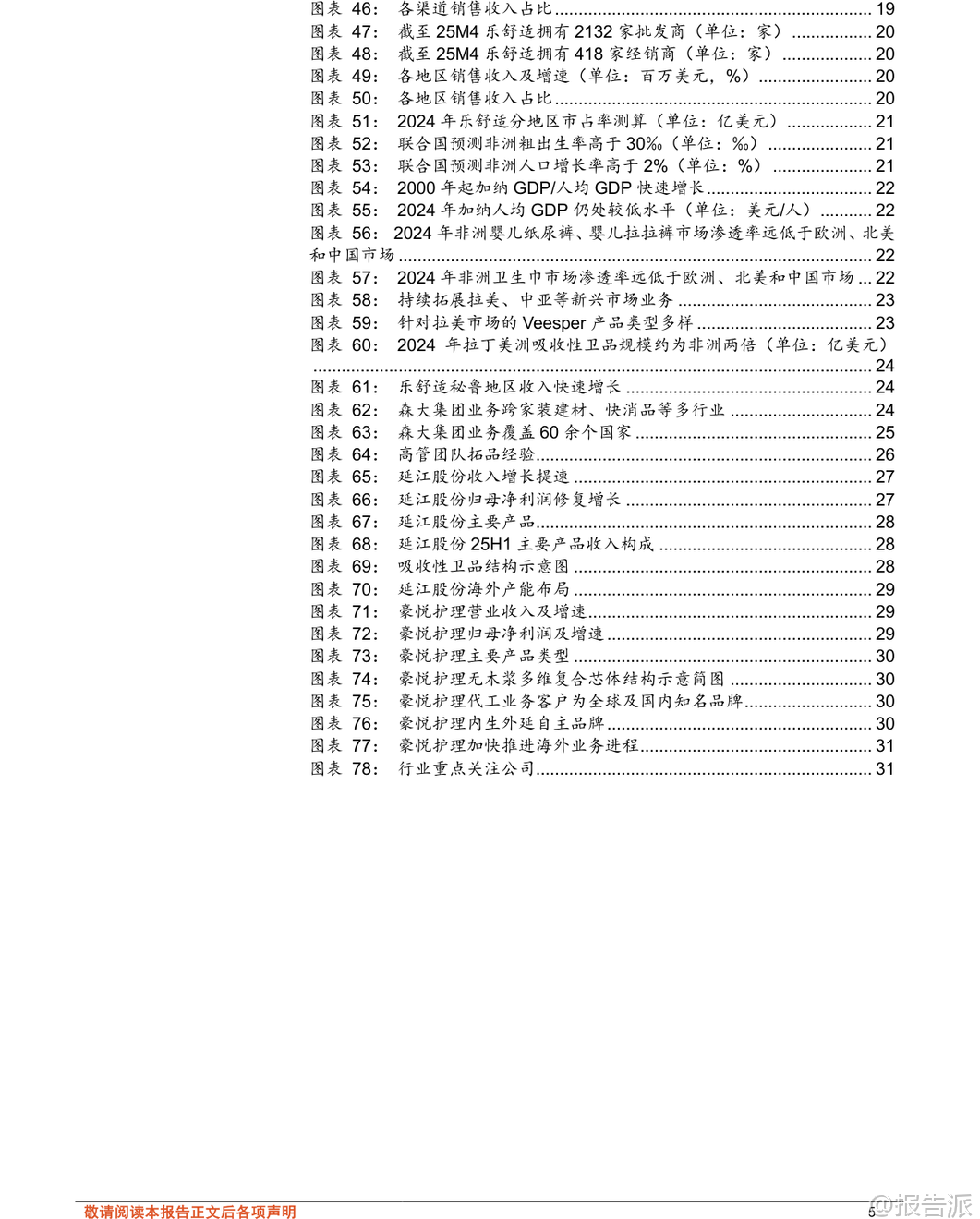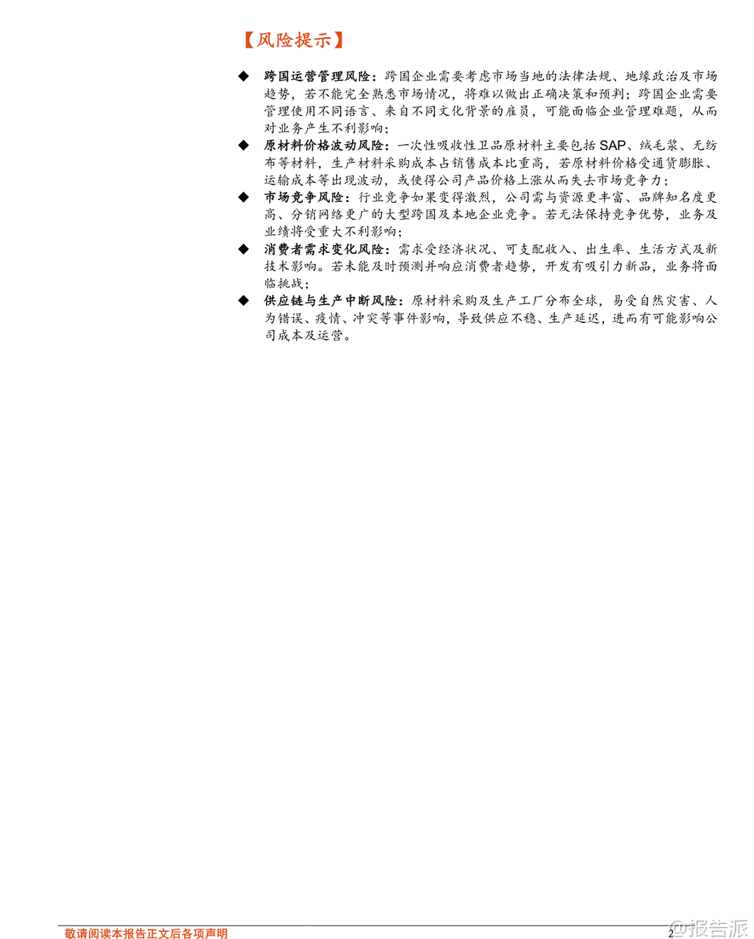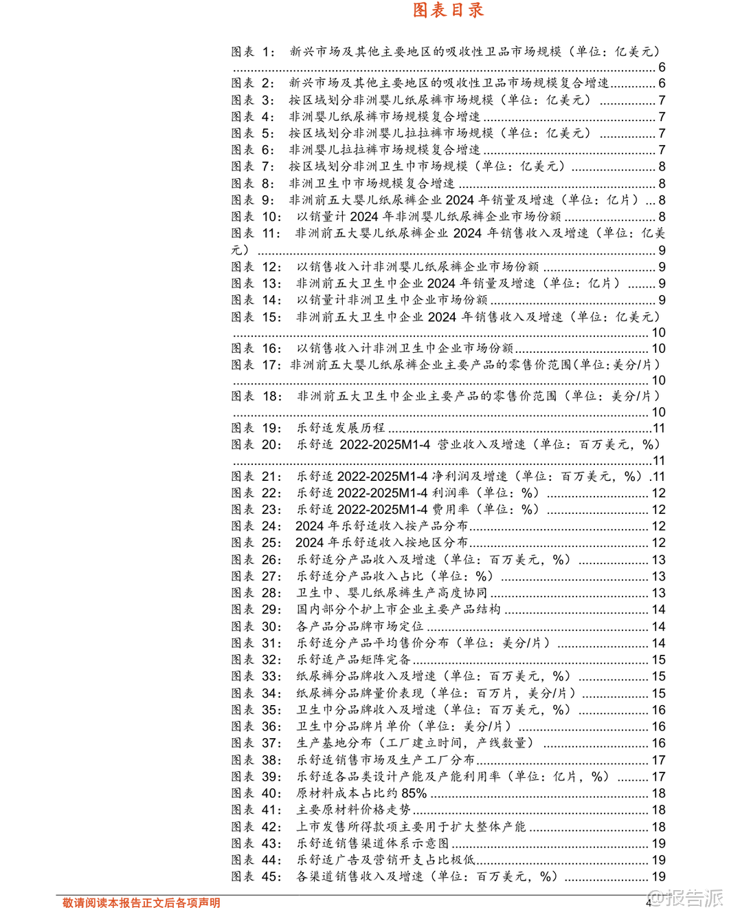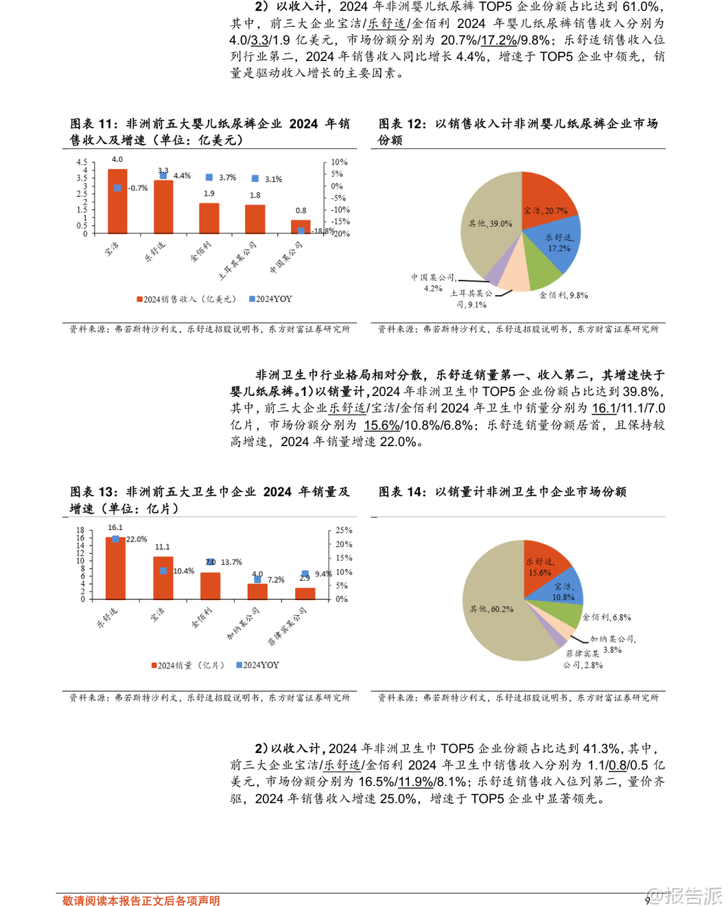 | 在2026年初,随着全球消费结构的持续演变,以非洲、拉丁美洲和中亚为代表的新兴市场正成为一次性卫生用品行业增长的新引擎。 根据东方财富证券发布的《轻工制造行业专题研究:以乐舒适看新兴市场卫品发展机遇》报告,这些地区的婴儿纸尿裤、拉拉裤及卫生巾市场规模广阔,增长确定性高,未来五年复合增速显著高于北美、欧洲、中国等成熟市场。 报告显示,2024年非洲吸收性卫品市场规模达38亿美元,预计2025-2029年均复合增速为7.9%;拉丁美洲市场规模为77亿美元,增速为3.0%;中亚地区则为5亿美元,增速为4.8%。 尤其值得注意的是,非洲婴儿纸尿裤与卫生巾的渗透率目前仅为20%和30%,远低于欧美市场的70%-90%,意味着巨大的市场潜力尚未释放。 人口红利、经济增长、消费升级以及渠道升级共同构成了驱动这一市场快速扩张的核心动力。 在众多参与者中,乐舒适(Softcare)作为深耕非洲多年的本土化品牌,已发展成为非洲销量第一的吸收性卫品企业。 其成功并非偶然,而是源于“多品牌矩阵+本地化生产+深度渠道下沉”三大核心壁垒的系统构建。 从产品端来看,乐舒适形成了以Softcare为主品牌的四大品类、五大品牌协同布局,覆盖婴儿纸尿裤、拉拉裤、卫生巾和湿巾,SKU总数超过340个,满足不同消费层级的需求。 其中,Softcare定位中高端,而Maya、Cuettie主打大众市场,Veesper则作为面向拉美市场的区域性高端品牌进行拓展。 生产方面,截至2025年4月,乐舒适已在非洲八国拥有八家工厂、51条生产线,实现本地化制造,有效规避了平均15%-20%的进口关税,并大幅降低物流与仓储成本。 其产品价格较宝洁、金佰利等国际品牌低30%-40%,性价比优势明显。 产能利用率稳定在合理区间,且上市募集资金中逾66%将用于扩产,预计未来2-3年内婴儿纸尿裤和卫生巾产能翻倍,拉拉裤产能增长超5倍,为持续增长奠定基础。 渠道是乐舒适的另一大护城河。 公司在12个国家设立18个销售分支机构,合作批发商超2800家、经销商418家,覆盖目标国家80%以上人口。 其渠道结构以批发商为主(收入占比超60%),同时经销商与商超渠道快速增长,体现渠道多元化趋势。 更关键的是,其广告营销费用占比极低(不足0.5%),依靠高效分销网络和产品力实现自然增长,展现出极强的成本控制与运营效率。 乐舒适的未来增长路径清晰:一是区域扩张,复制非洲成功模式至拉美与中亚。 公司已在秘鲁、萨尔瓦多、哈萨克斯坦等地布局,2024年拉美收入同比增长406%,显示出强劲势头;二是品类协同,依托森大集团跨行业、跨区域的运营管理经验,进一步拓展个护品类,提升自主品牌影响力。 背靠实控人沈延昌28年海外运营经验及资深管理团队,乐舒适具备强大的战略执行力。 报告还指出,国内供应链企业同样迎来机遇。 建议关注两类标的:一是技术领先、拥有海外产能布局的核心材料供应商如延江股份,其热风无纺布技术契合全球面层升级趋势,并已在埃及、美国设厂,服务宝洁、金佰利等国际客户;二是ODM与自主品牌双轮驱动、加快出海的制造龙头豪悦护理,其无木浆复合芯体技术领先,并计划在秘鲁、坦桑尼亚建厂,加速全球化布局。 当然,投资也需警惕多重风险:包括跨国运营中的地缘政治与文化管理难题、SAP、绒毛浆等原材料价格波动、国际与本地品牌的激烈竞争、消费者需求变化以及全球供应链中断等潜在挑战。 总体而言,新兴市场个护行业正处于“高增长、低渗透、强刚需”的黄金发展阶段。 乐舒适的崛起不仅是一个企业的成功案例,更是中国企业出海模式进化的缩影——从贸易输出转向本地化制造与品牌建设。 这一趋势或将重塑全球个护产业格局,也为国内相关产业链带来长期成长机会。 本文由【报告派】研读,输出观点仅作为行业分析! 原文标题:2026-01-20-东方财富证券-东方财富证券-轻工制造行业专题研究:以乐舒适看新兴市场卫品发展机遇 发布时间:2026年 出品方:东方财富证券