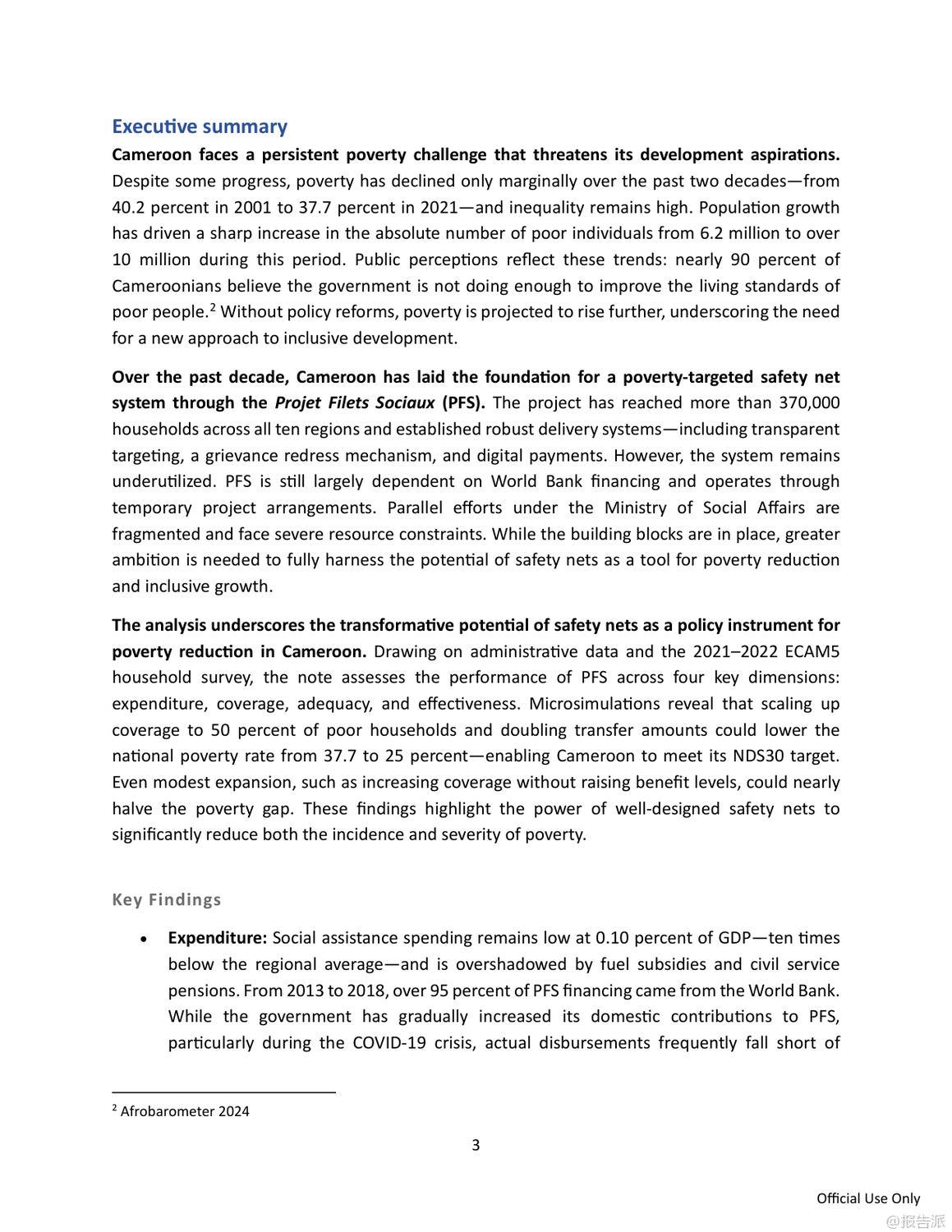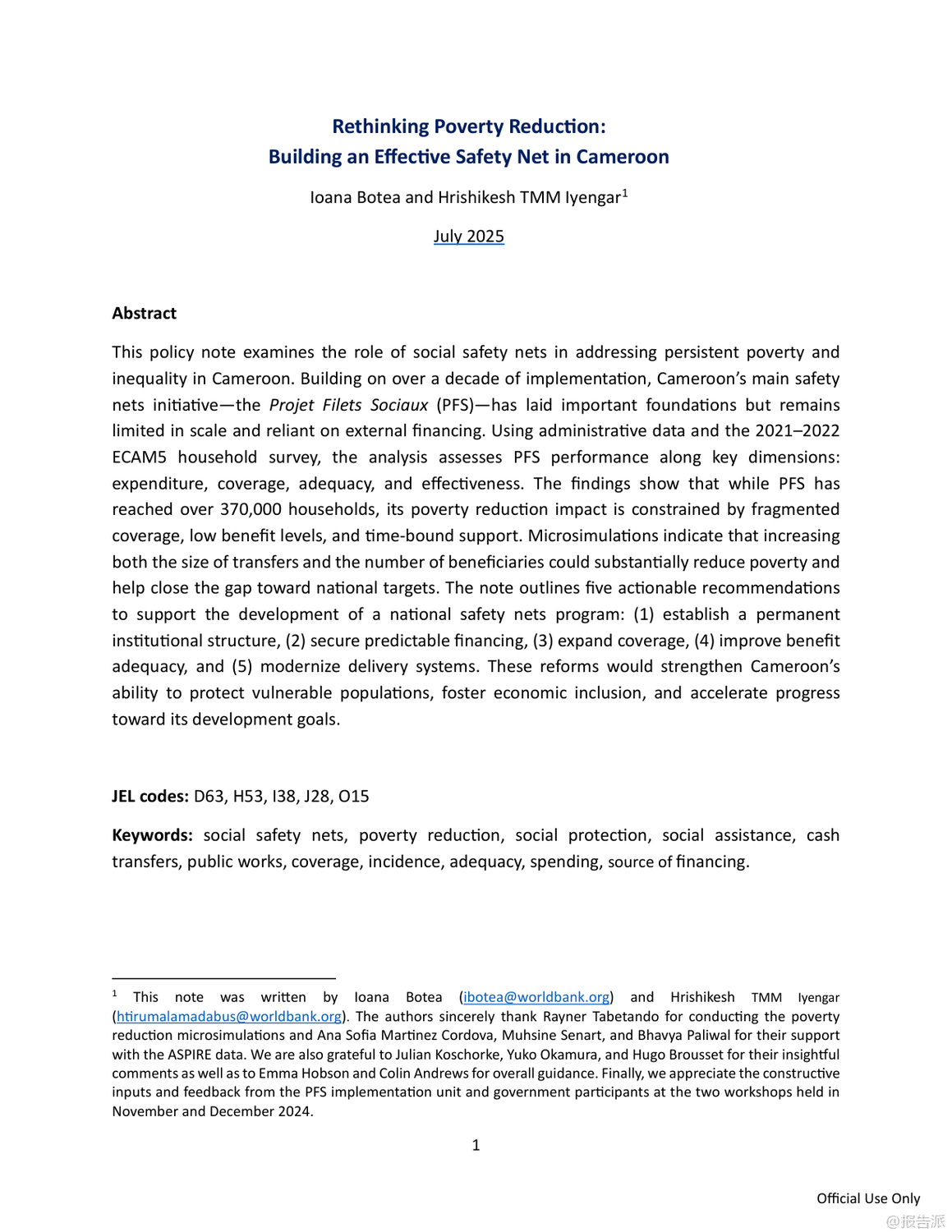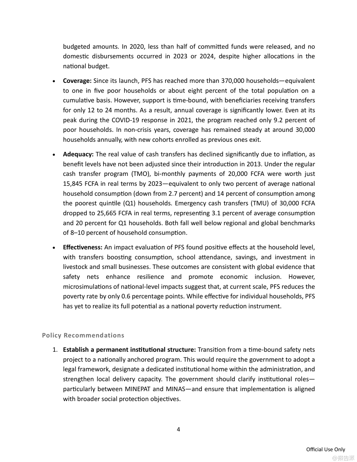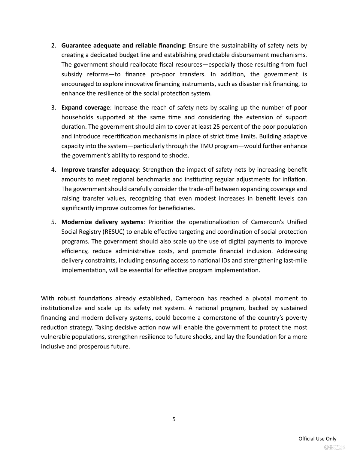 | 喀麦隆正面临严峻而持久的贫困挑战,尽管过去二十年间贫困率从2001年的40.2%微降至2021年的37.7%,但由于人口快速增长,贫困人口总数已从620万飙升至超过1000万人。 与此同时,民众对政府减贫成效普遍不满,近九成受访者认为政府在改善穷人生活方面作为不足。 在此背景下,世界银行发布《反思减贫:在喀麦隆建立有效的安全网》报告,系统评估了该国主要社会救助项目——社会安全网项目(Projet Filets Sociaux, PFS)的实施成效,并提出推动国家级安全网体系建设的战略建议。 PFS自2013年启动以来,已在十年间覆盖全国10个大区超过37万户家庭,建立了包括目标识别、申诉机制和数字化支付在内的成熟运作体系,成为喀麦隆最大的社会援助项目。 然而,该项目仍高度依赖世界银行等外部资金支持,国内财政拨款承诺虽逐年上升,但实际拨付严重滞后,2023年和2024年甚至未执行任何国内支出,严重制约项目可持续性。 目前社会援助支出仅占GDP的0.1%,远低于撒哈拉以南非洲地区平均水平的十分之一。 在覆盖面上,PFS累计惠及约五分之一的贫困家庭,但因支持具有时间限制(通常为12至24个月),年度活跃覆盖率极低。 即便在新冠疫情应对高峰的2021年,也仅覆盖了9.2%的贫困人口。 更关键的是,现金转移的实际购买力因十年未调整而大幅缩水。 常规现金转移(TMO)每两个月2万中非法郎的金额,到2023年实际价值已降至1.58万,仅相当于最贫困家庭消费水平的14%;紧急转移(TMU)也降至2.57万,均显著低于国际通行的8%-10%基准线。 尽管微观评估显示PFS能有效提升受助家庭的消费、教育投入和生产性投资,但宏观模拟表明,当前规模的项目对全国贫困率的影响仅为降低0.6个百分点,效果有限。 模型预测若将覆盖范围扩大至一半贫困人口并加倍转移金额,贫困率可从37.7%降至25%,实现国家发展战略(NDS30)目标。 为此,报告提出五大核心建议:一是设立常设机构,将临时项目升级为国家级制度化计划;二是确保稳定融资,通过改革燃油补贴和公务员工资养老金释放财政空间;三是扩大覆盖面,目标覆盖至少25%的贫困人口并引入定期复核机制;四是提高补助充足性,定期按通胀调整金额;五是加快统一社会登记系统(RESUC)建设和数字支付普及。 报告强调,喀麦隆已具备坚实基础,亟需政治决心与资源投入,将安全网打造为包容性增长的核心支柱。 出品方:世界银行 发布时间:2025年