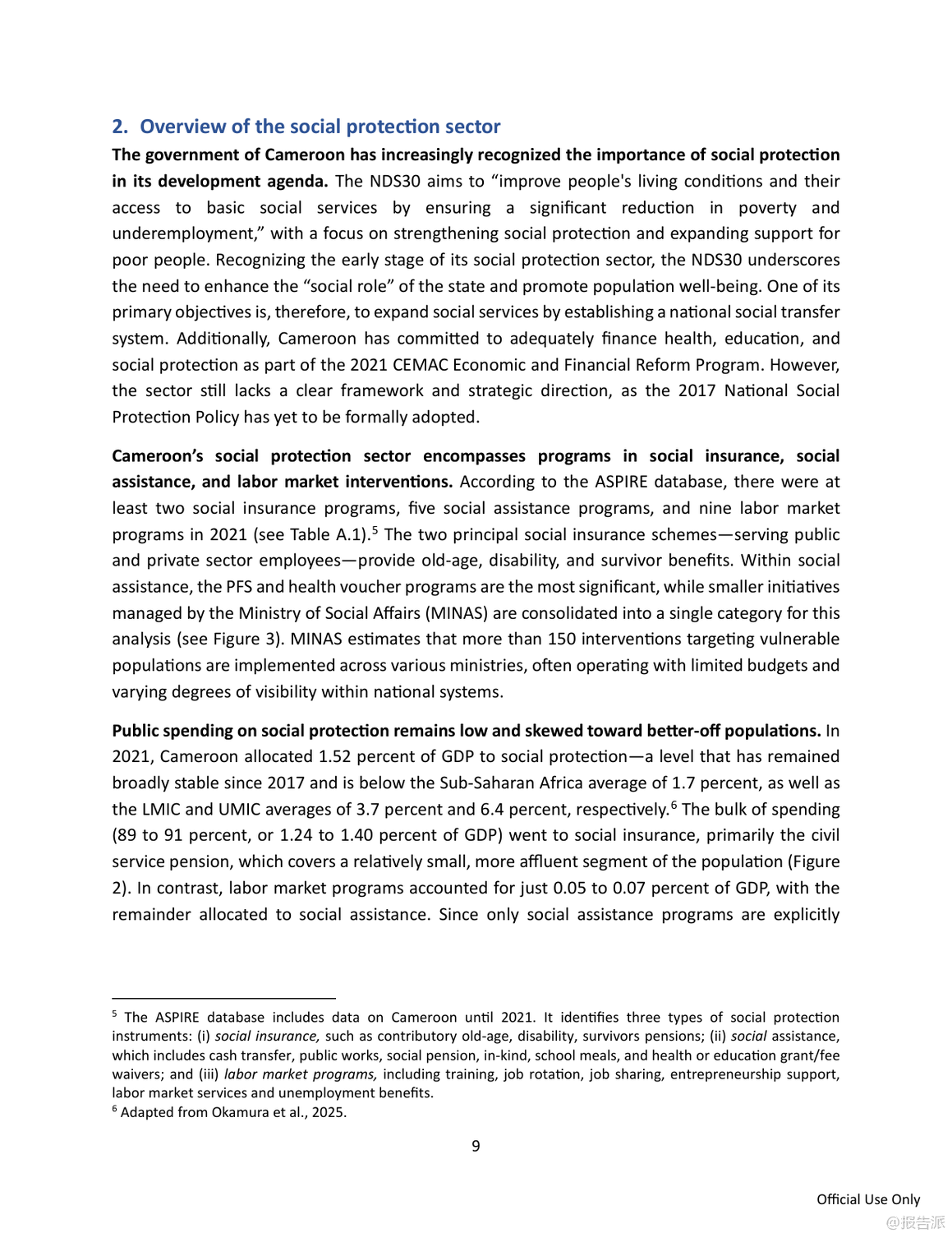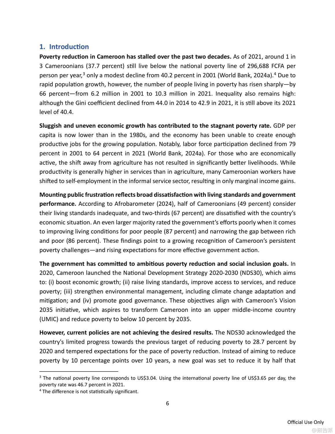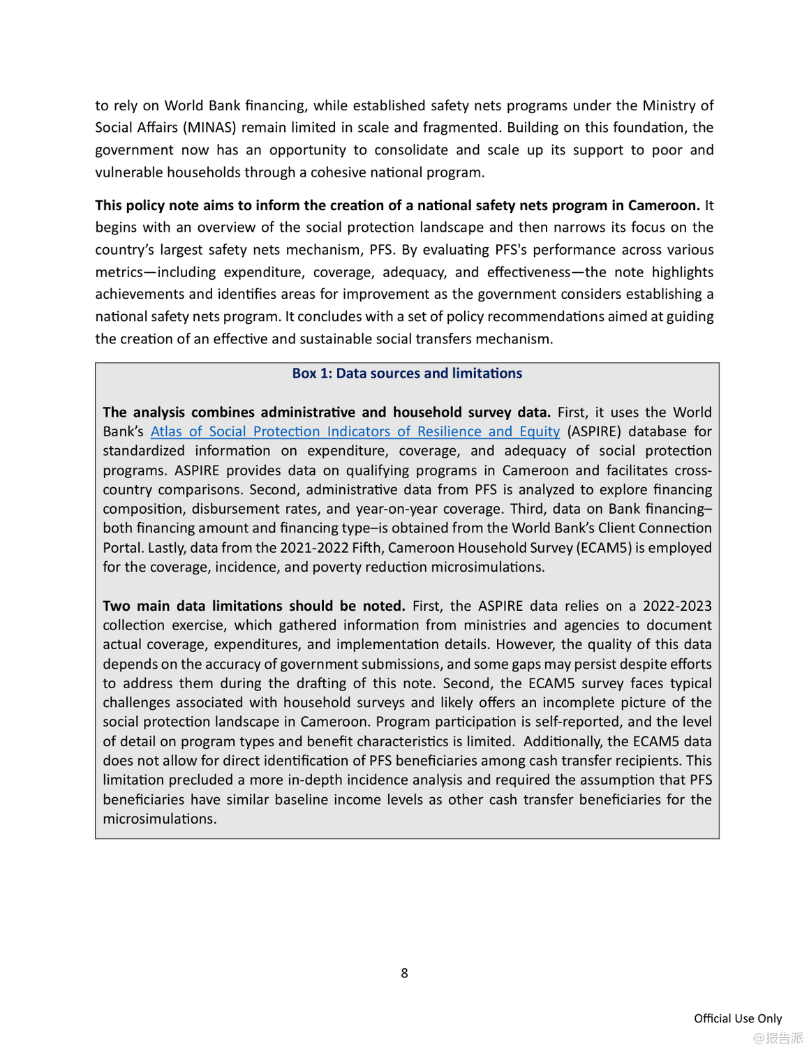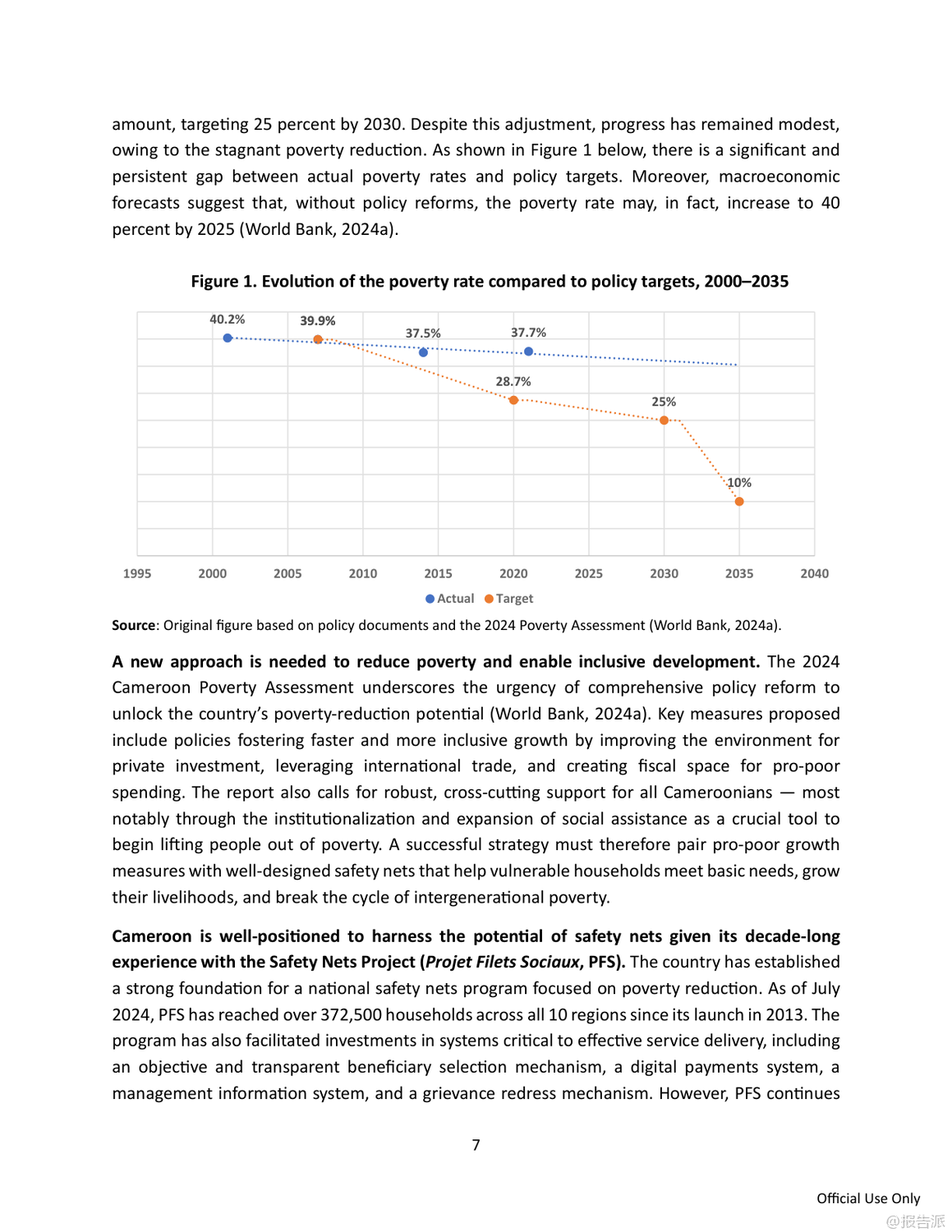 | 喀麦隆正面临严峻而持久的贫困挑战,尽管过去二十年间贫困率从2001年的40.2%微降至2021年的37.7%,但由于人口快速增长,贫困人口总数已从620万飙升至超过1000万人。 与此同时,民众对政府减贫成效普遍不满,近九成受访者认为政府在改善穷人生活方面作为不足。 在此背景下,世界银行发布《反思减贫:在喀麦隆建立有效的安全网》报告,系统评估了该国主要社会救助项目——社会安全网项目(Projet Filets Sociaux, PFS)的实施成效,并提出推动国家级安全网体系建设的战略建议。 PFS自2013年启动以来,已在十年间覆盖全国10个大区超过37万户家庭,建立了包括目标识别、申诉机制和数字化支付在内的成熟运作体系,成为喀麦隆最大的社会援助项目。 然而,该项目仍高度依赖世界银行等外部资金支持,国内财政拨款承诺虽逐年上升,但实际拨付严重滞后,2023年和2024年甚至未执行任何国内支出,严重制约项目可持续性。 目前社会援助支出仅占GDP的0.1%,远低于撒哈拉以南非洲地区平均水平的十分之一。 在覆盖面上,PFS累计惠及约五分之一的贫困家庭,但因支持具有时间限制(通常为12至24个月),年度活跃覆盖率极低。 即便在新冠疫情应对高峰的2021年,也仅覆盖了9.2%的贫困人口。 更关键的是,现金转移的实际购买力因十年未调整而大幅缩水。 常规现金转移(TMO)每两个月2万中非法郎的金额,到2023年实际价值已降至1.58万,仅相当于最贫困家庭消费水平的14%;紧急转移(TMU)也降至2.57万,均显著低于国际通行的8%-10%基准线。 尽管微观评估显示PFS能有效提升受助家庭的消费、教育投入和生产性投资,但宏观模拟表明,当前规模的项目对全国贫困率的影响仅为降低0.6个百分点,效果有限。 模型预测若将覆盖范围扩大至一半贫困人口并加倍转移金额,贫困率可从37.7%降至25%,实现国家发展战略(NDS30)目标。 为此,报告提出五大核心建议:一是设立常设机构,将临时项目升级为国家级制度化计划;二是确保稳定融资,通过改革燃油补贴和公务员工资养老金释放财政空间;三是扩大覆盖面,目标覆盖至少25%的贫困人口并引入定期复核机制;四是提高补助充足性,定期按通胀调整金额;五是加快统一社会登记系统(RESUC)建设和数字支付普及。 报告强调,喀麦隆已具备坚实基础,亟需政治决心与资源投入,将安全网打造为包容性增长的核心支柱。 出品方:世界银行 发布时间:2025年